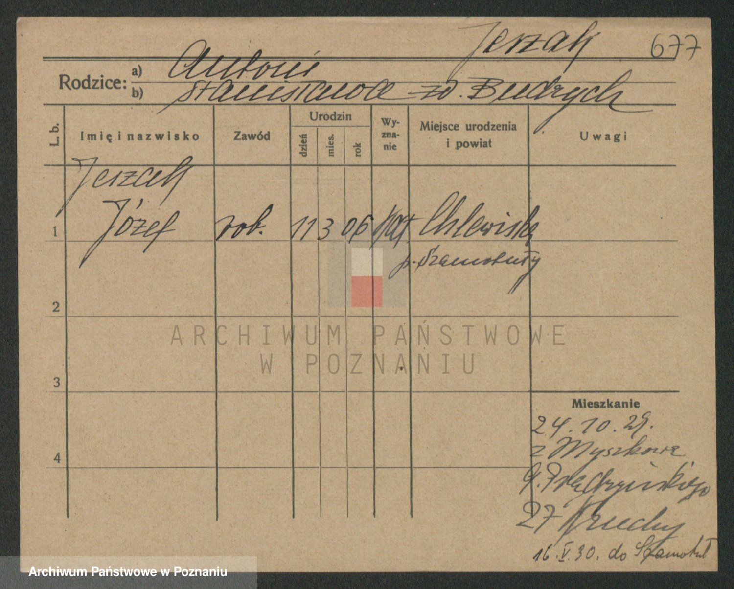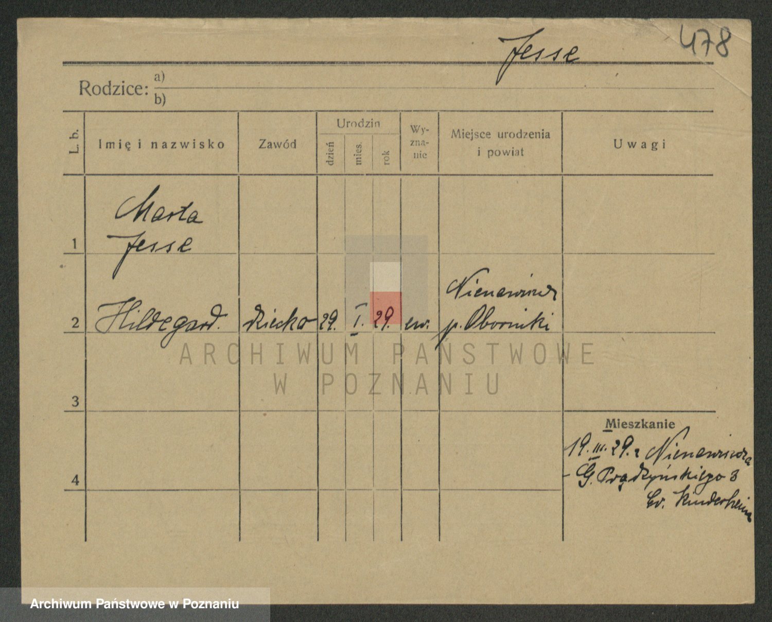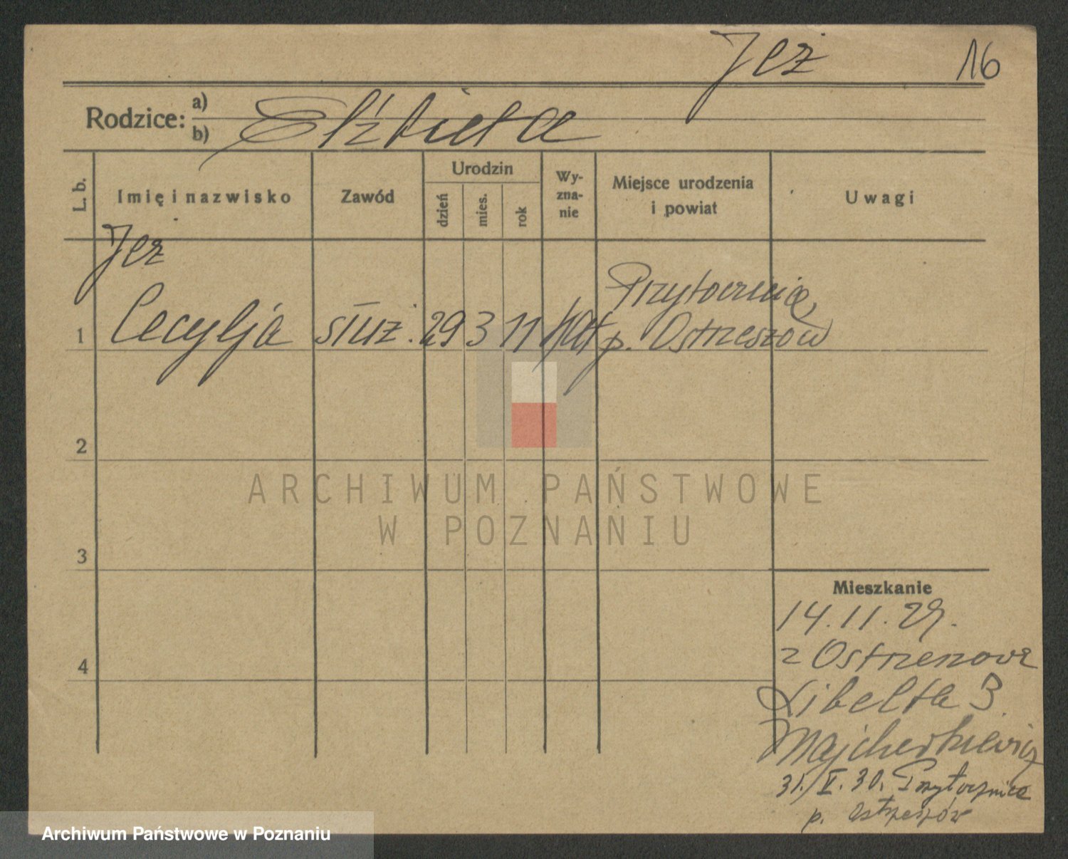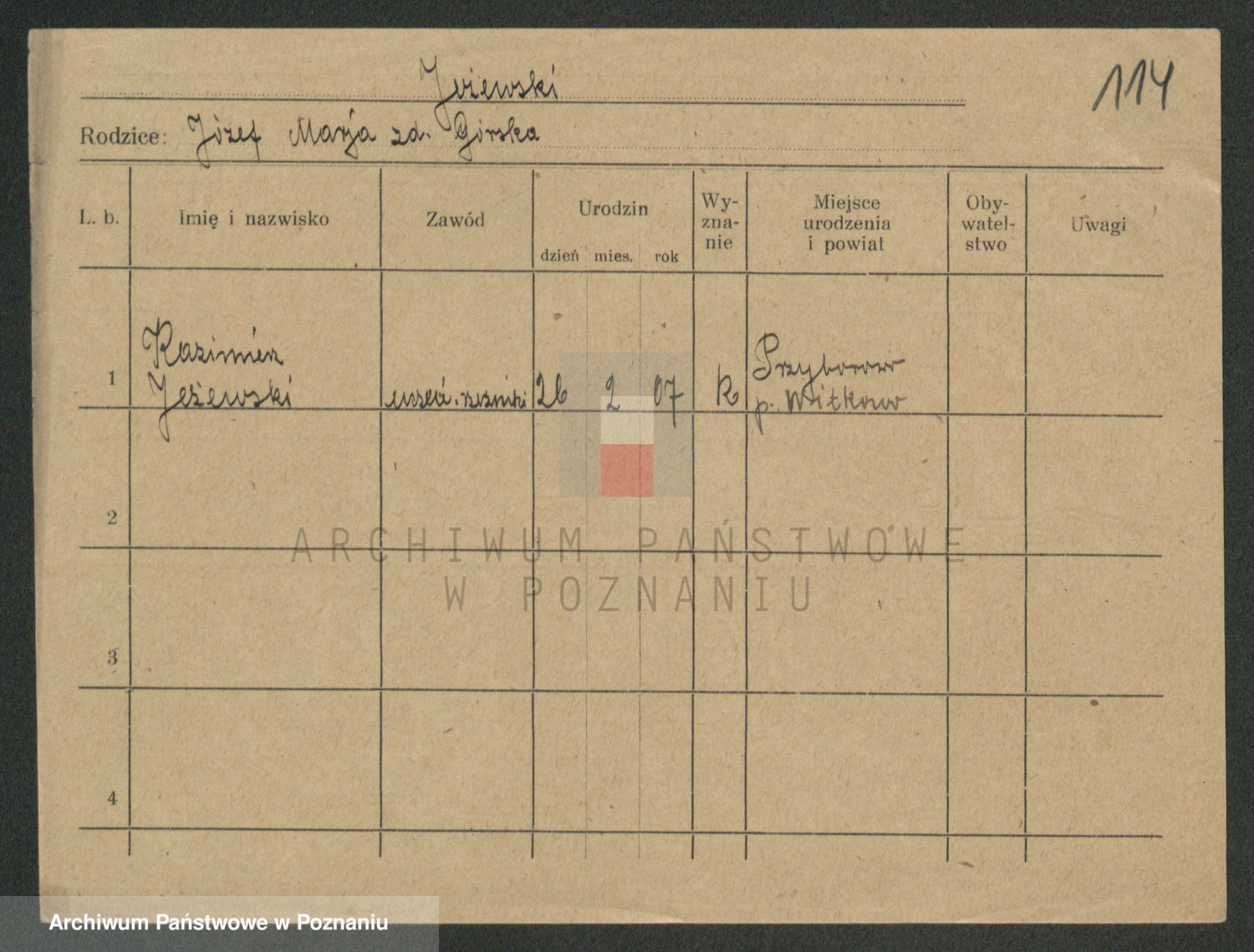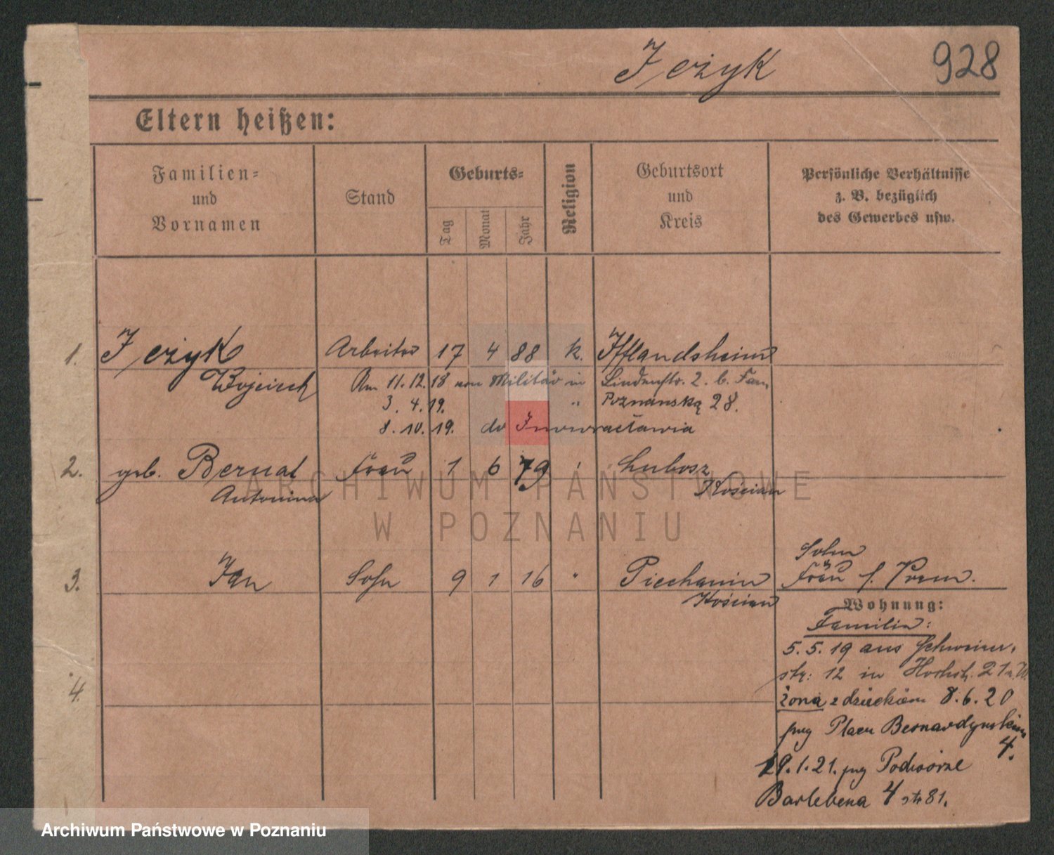 Podgląd karty osobowej dostępny jest po kliknięciu na nazwisko lub ikonkę karty. Można dokonywać powiększenia (ikony na górze) lub przechodzić między kolejnymi skanami (strzałki po bokach).