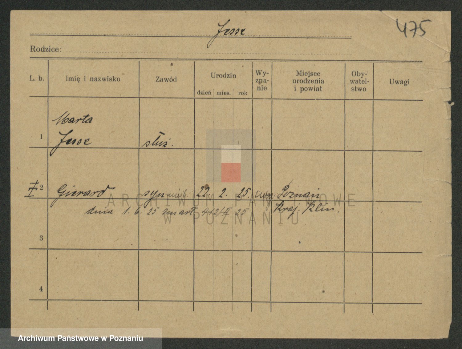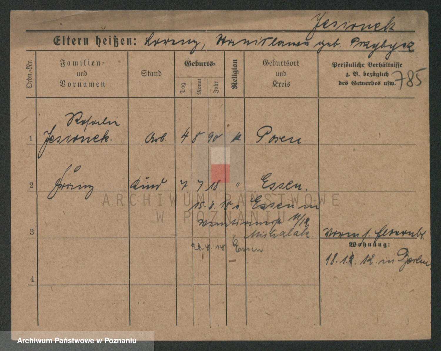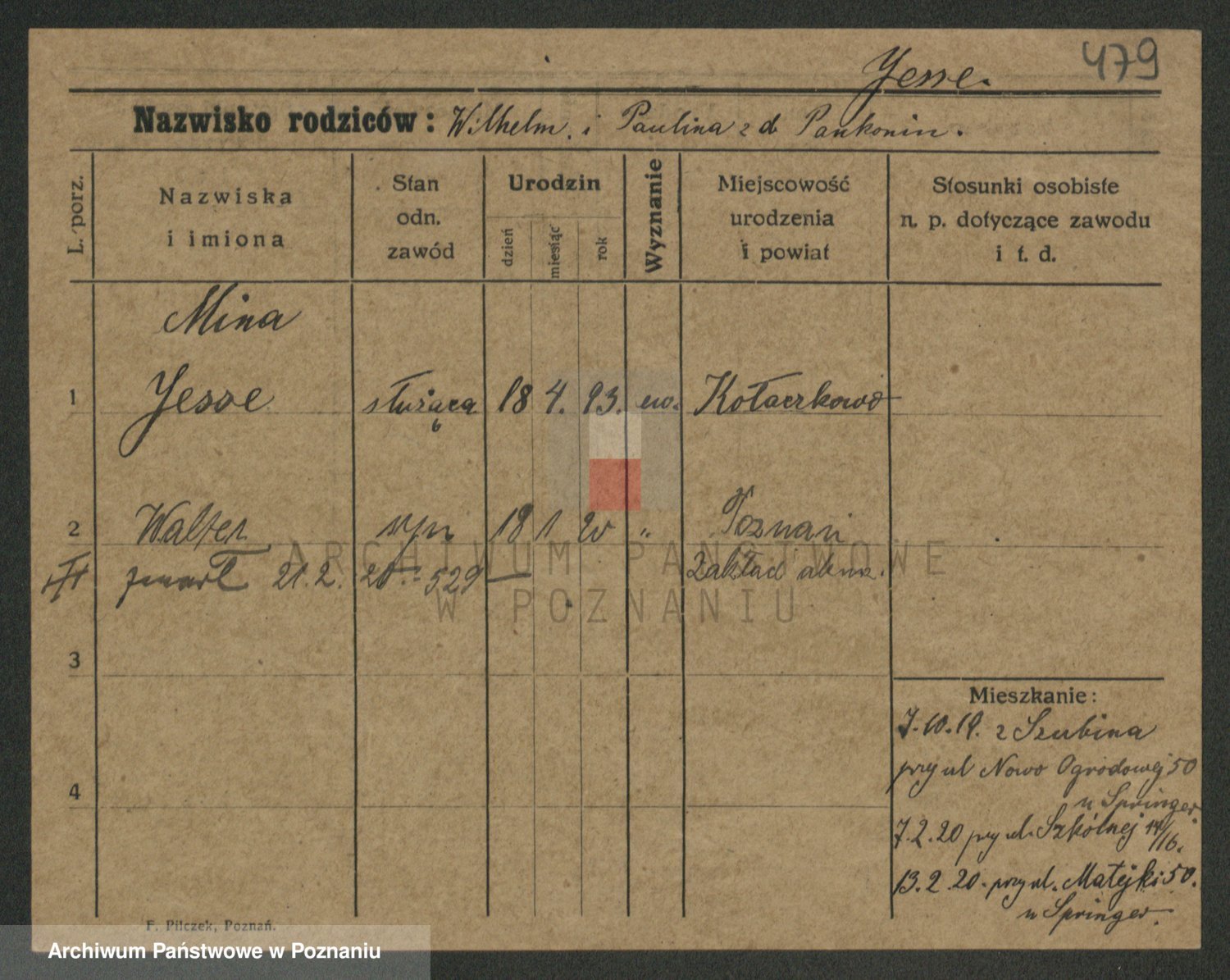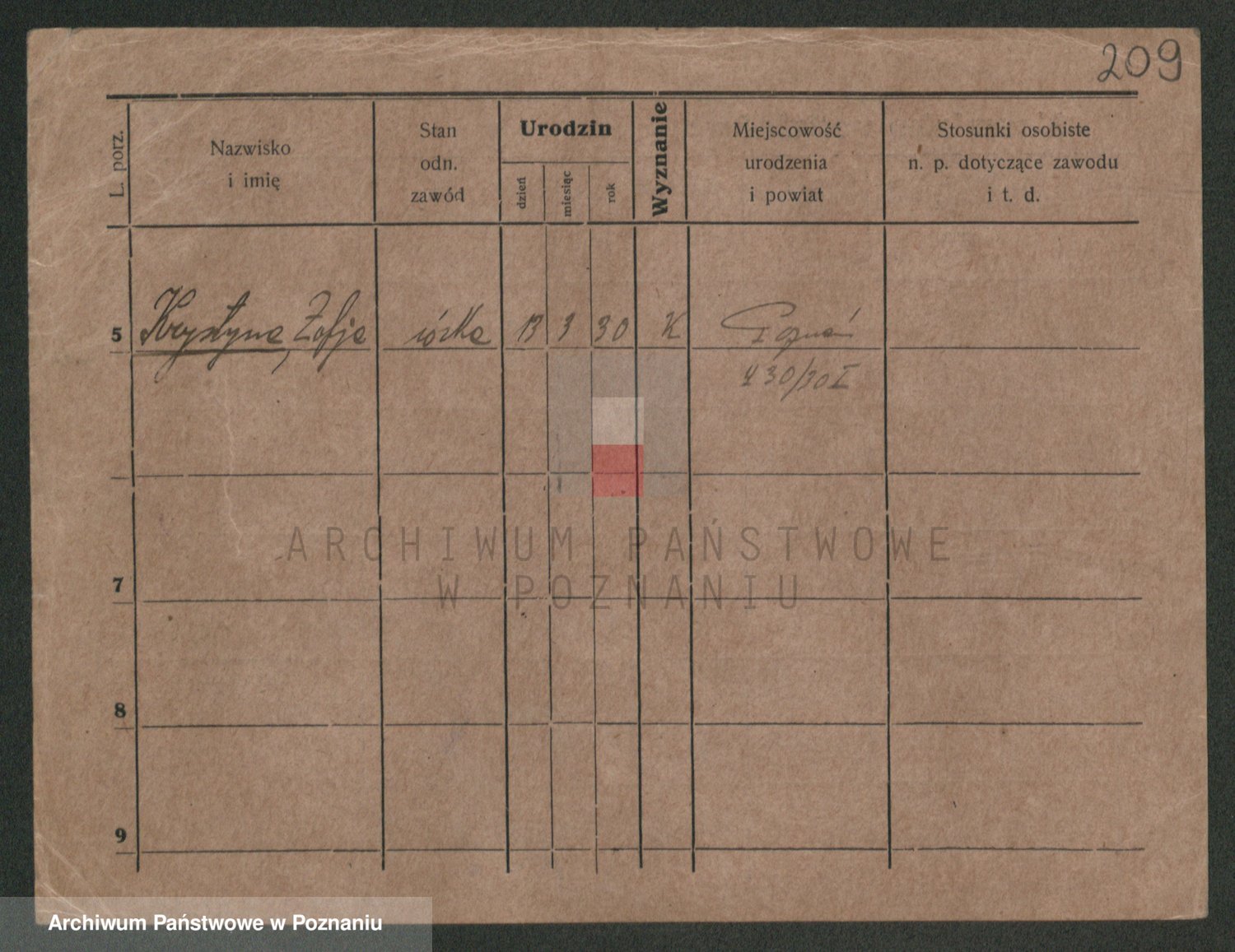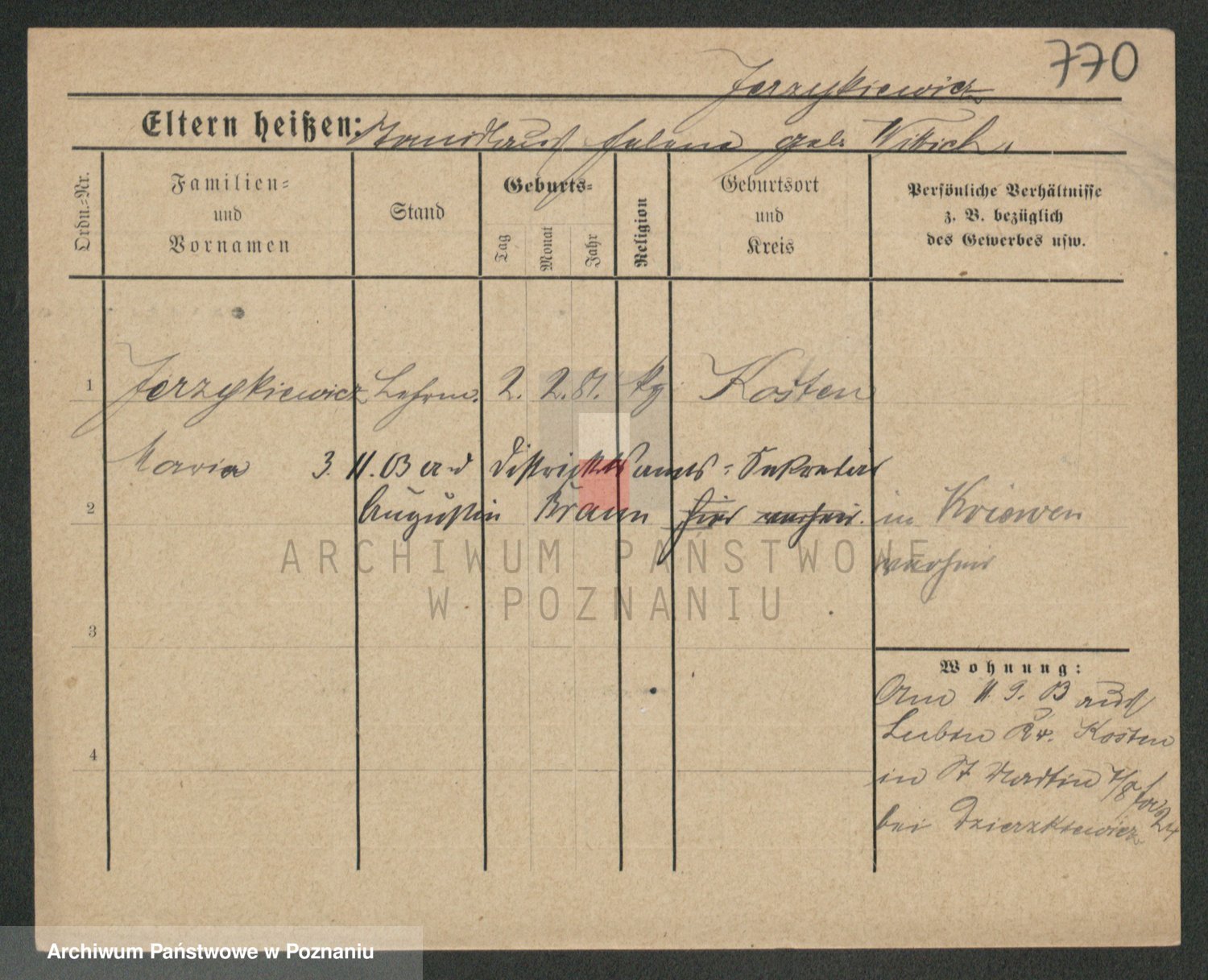 Podgląd karty osobowej dostępny jest po kliknięciu na nazwisko lub ikonkę karty. Można dokonywać powiększenia (ikony na górze) lub przechodzić między kolejnymi skanami (strzałki po bokach).