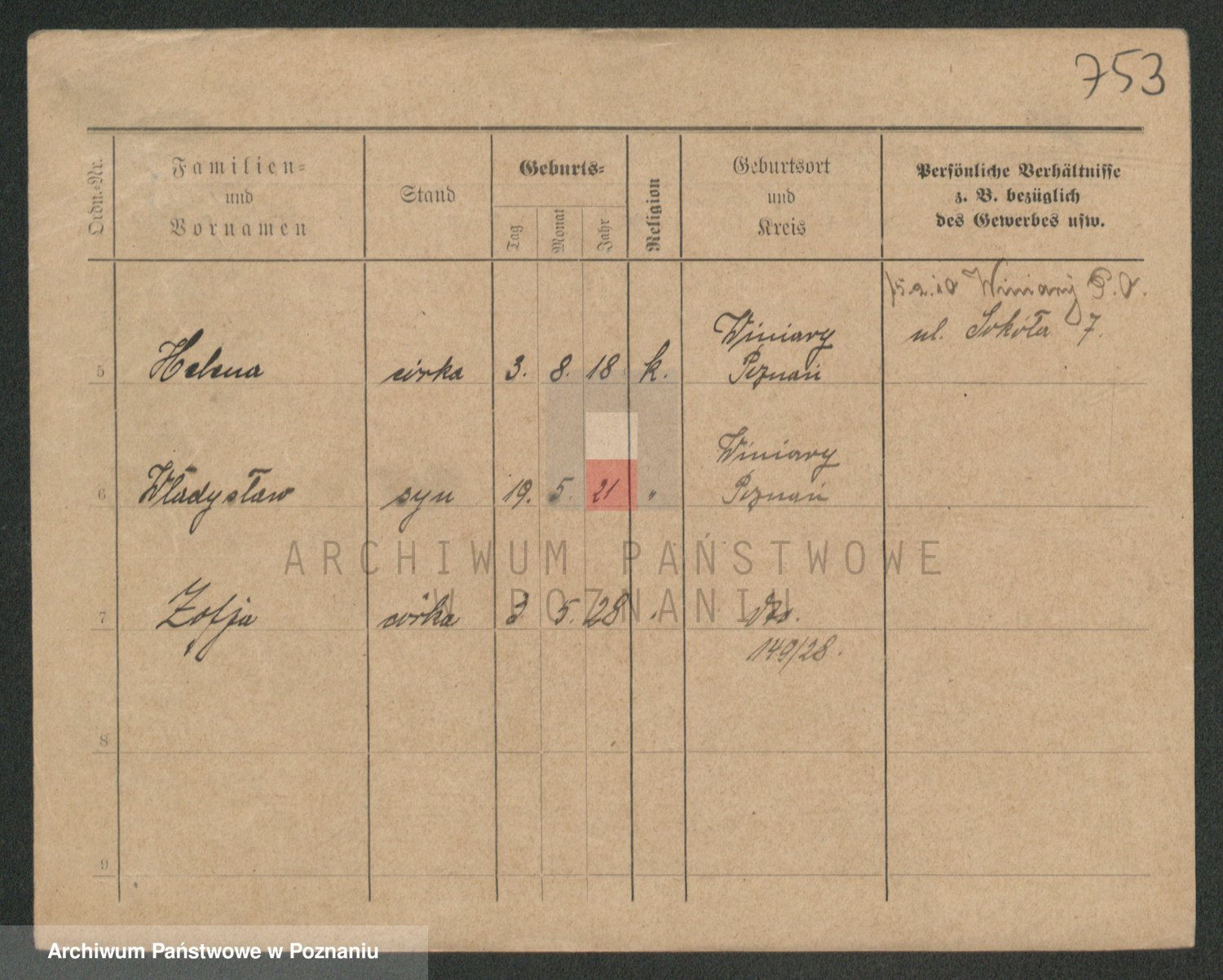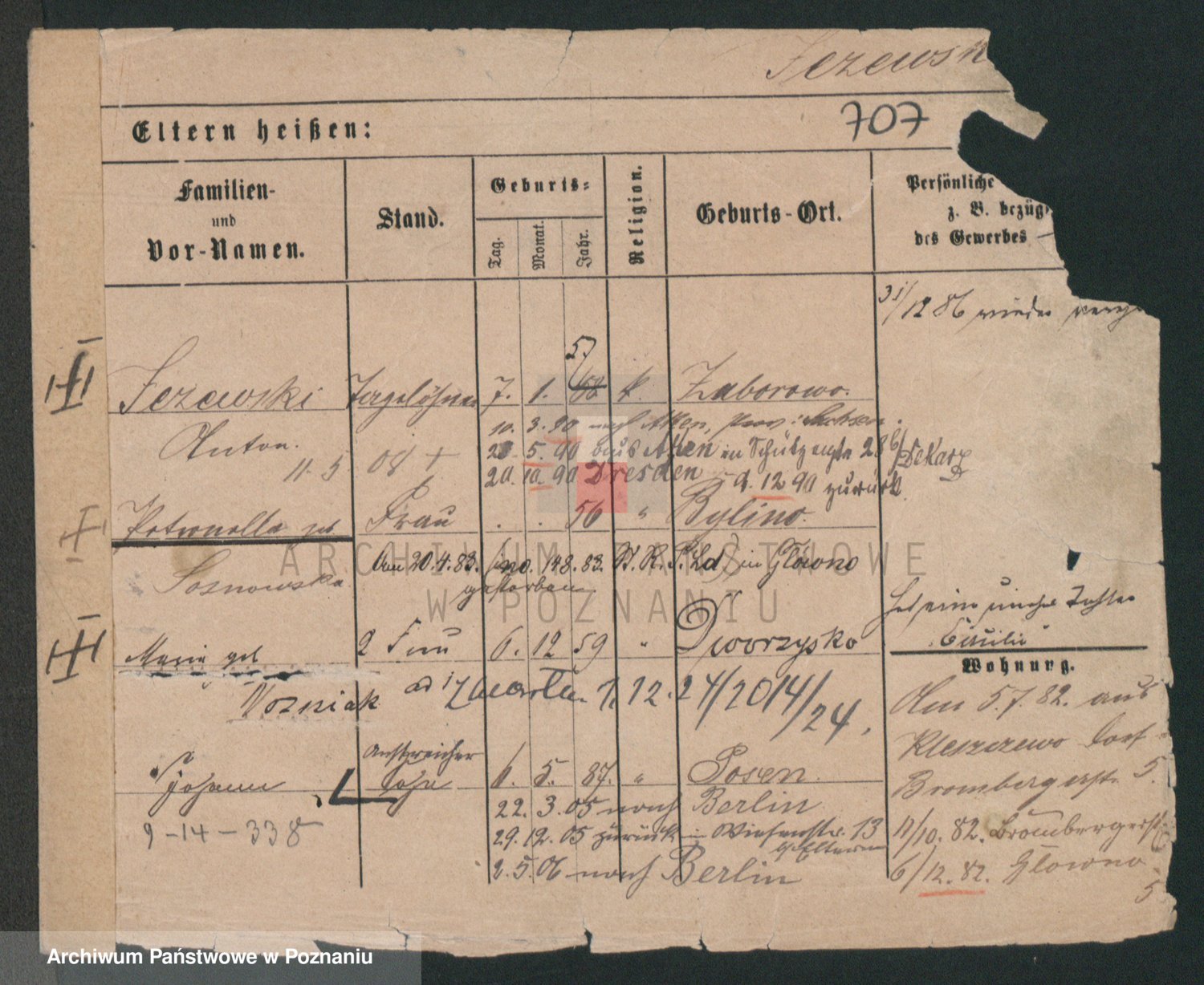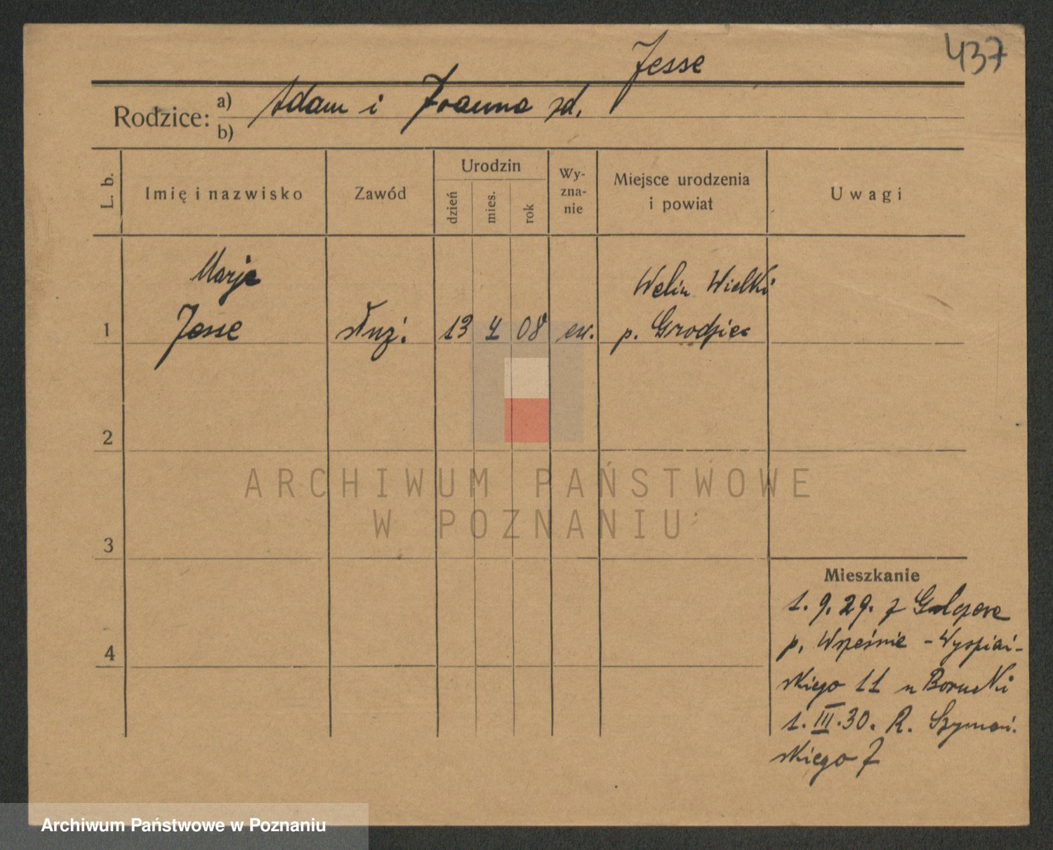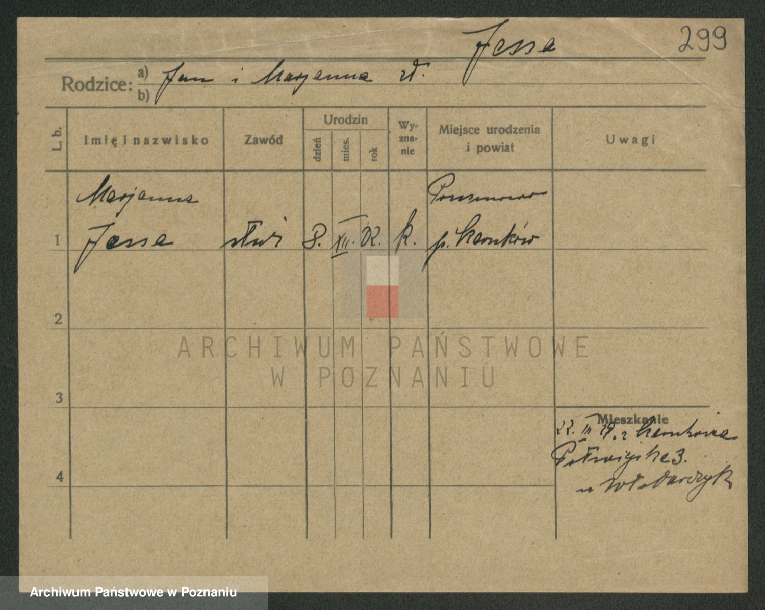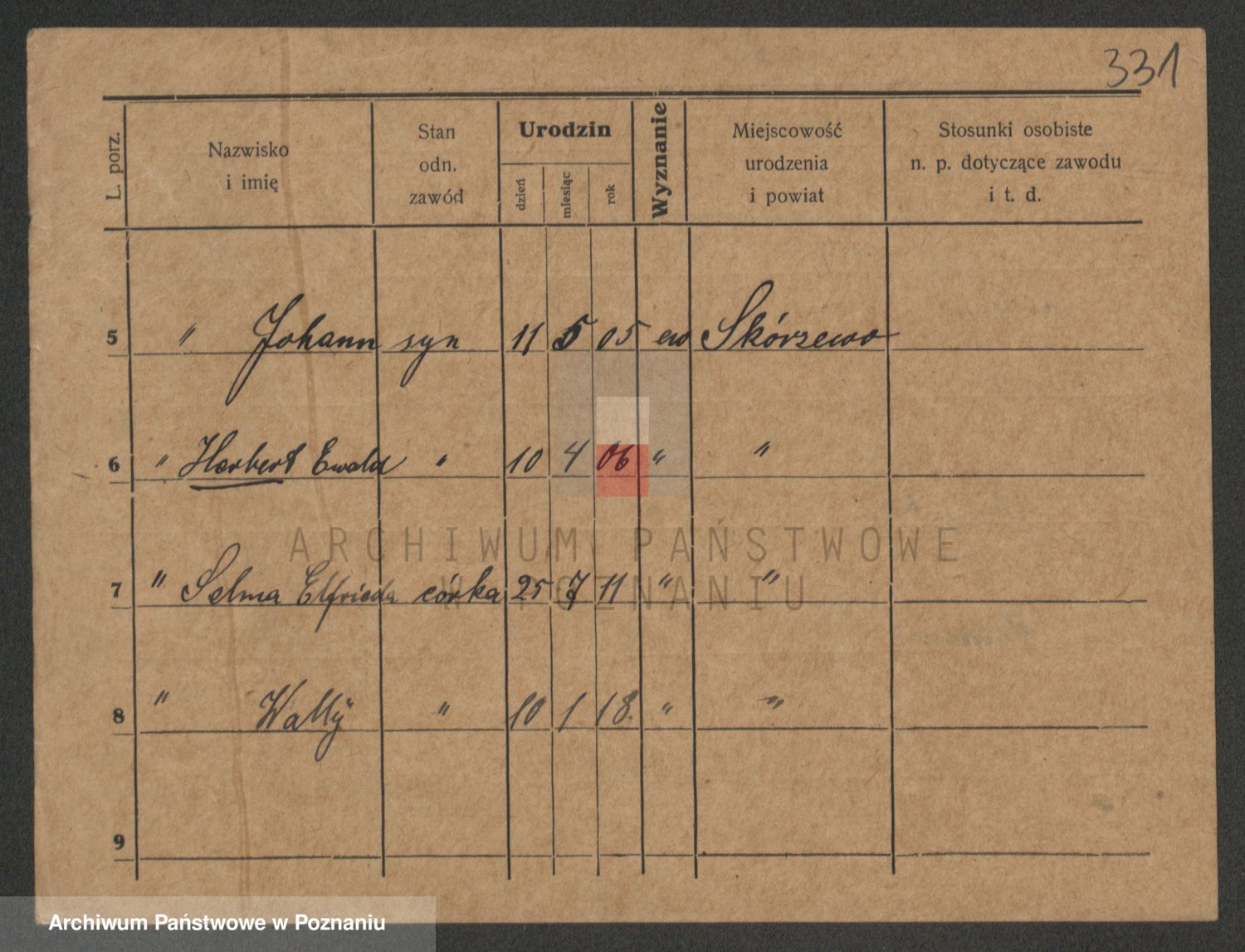 Podgląd karty osobowej dostępny jest po kliknięciu na nazwisko lub ikonkę karty. Można dokonywać powiększenia (ikony na górze) lub przechodzić między kolejnymi skanami (strzałki po bokach).