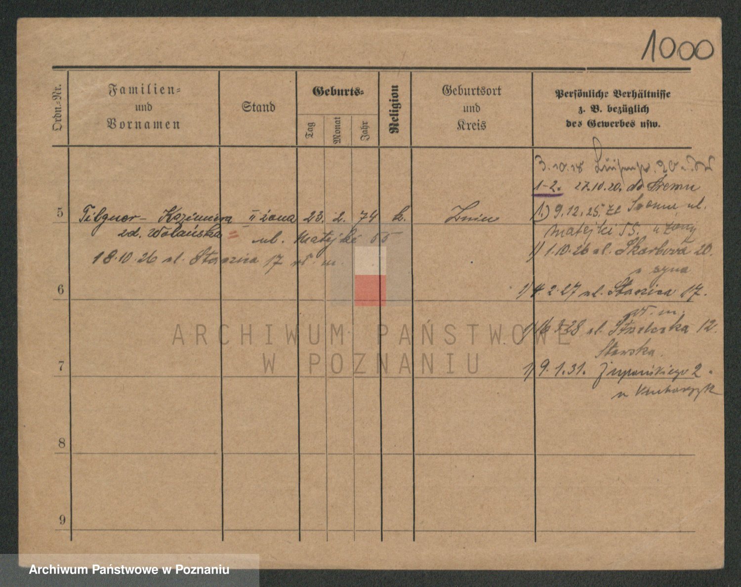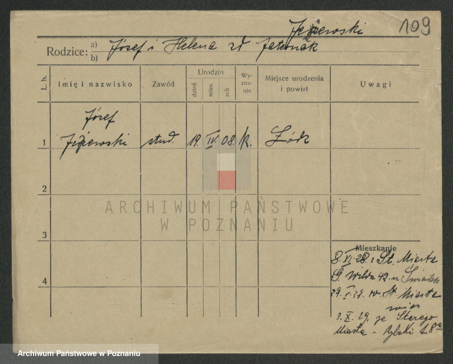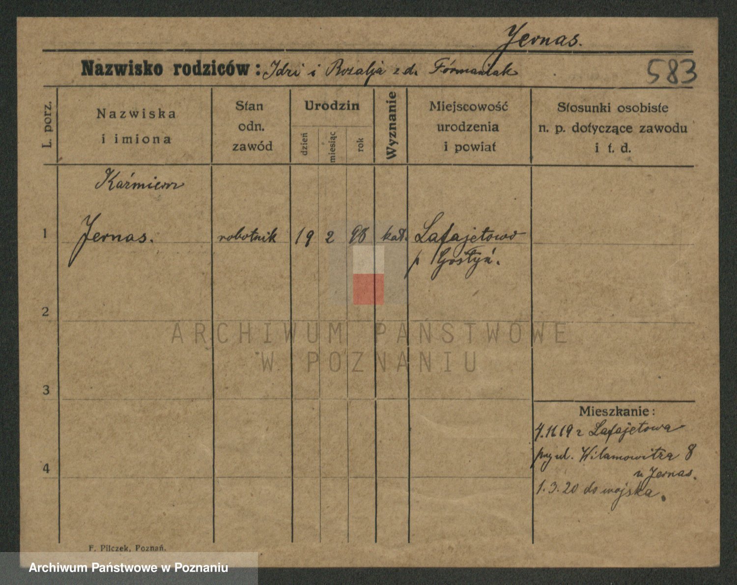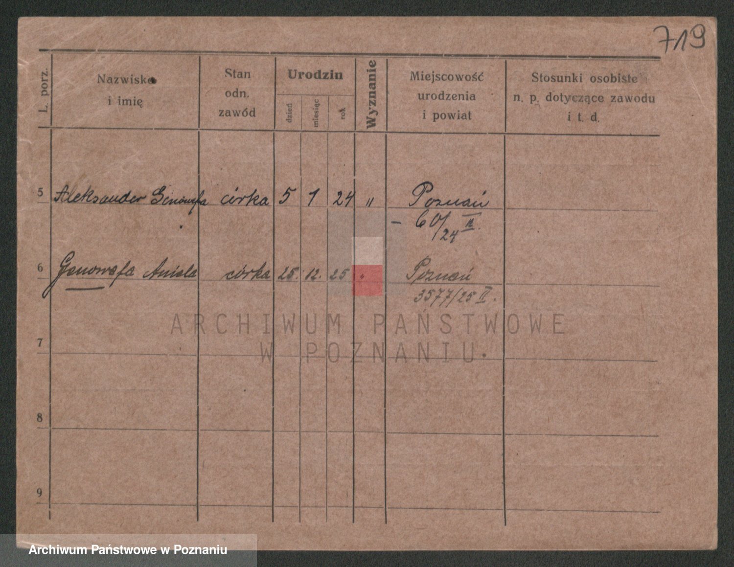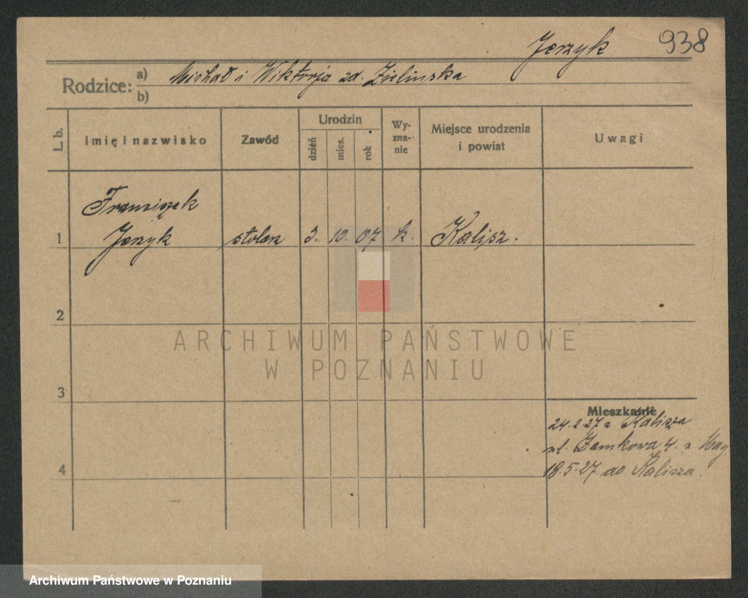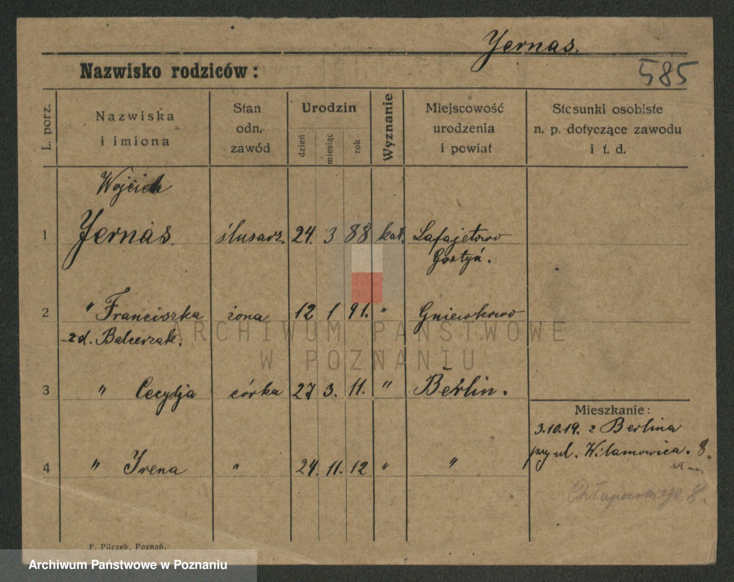 Podgląd karty osobowej dostępny jest po kliknięciu na nazwisko lub ikonkę karty. Można dokonywać powiększenia (ikony na górze) lub przechodzić między kolejnymi skanami (strzałki po bokach).