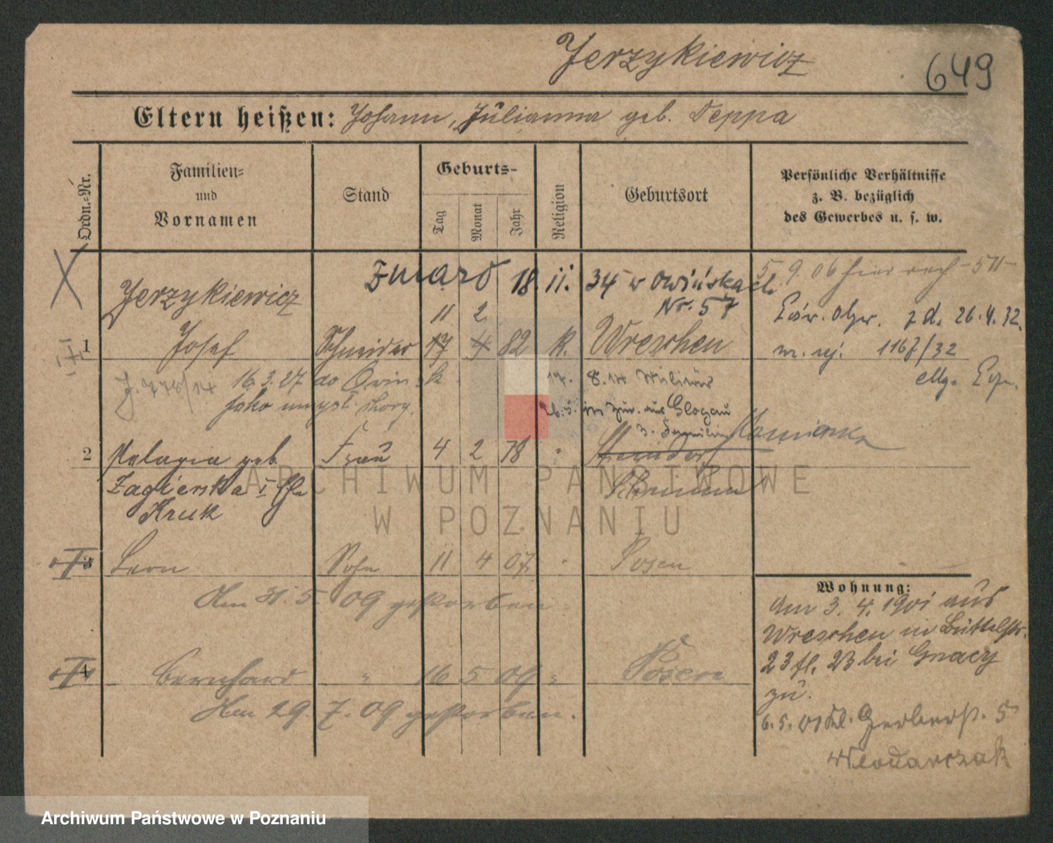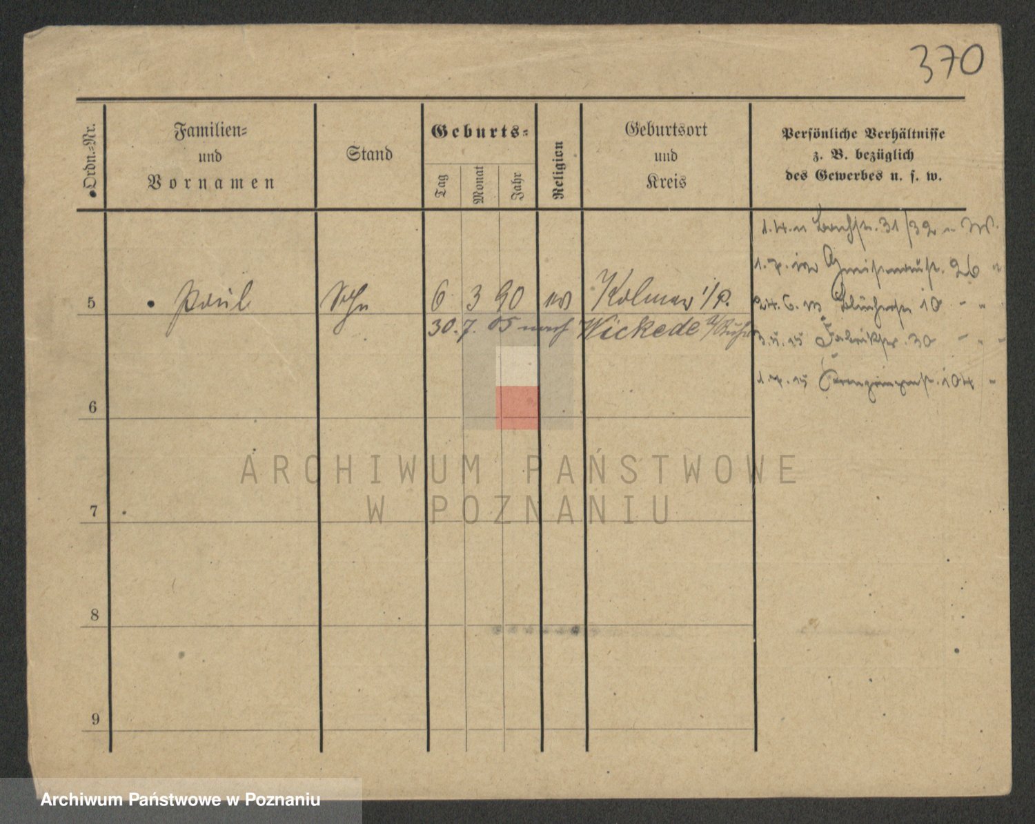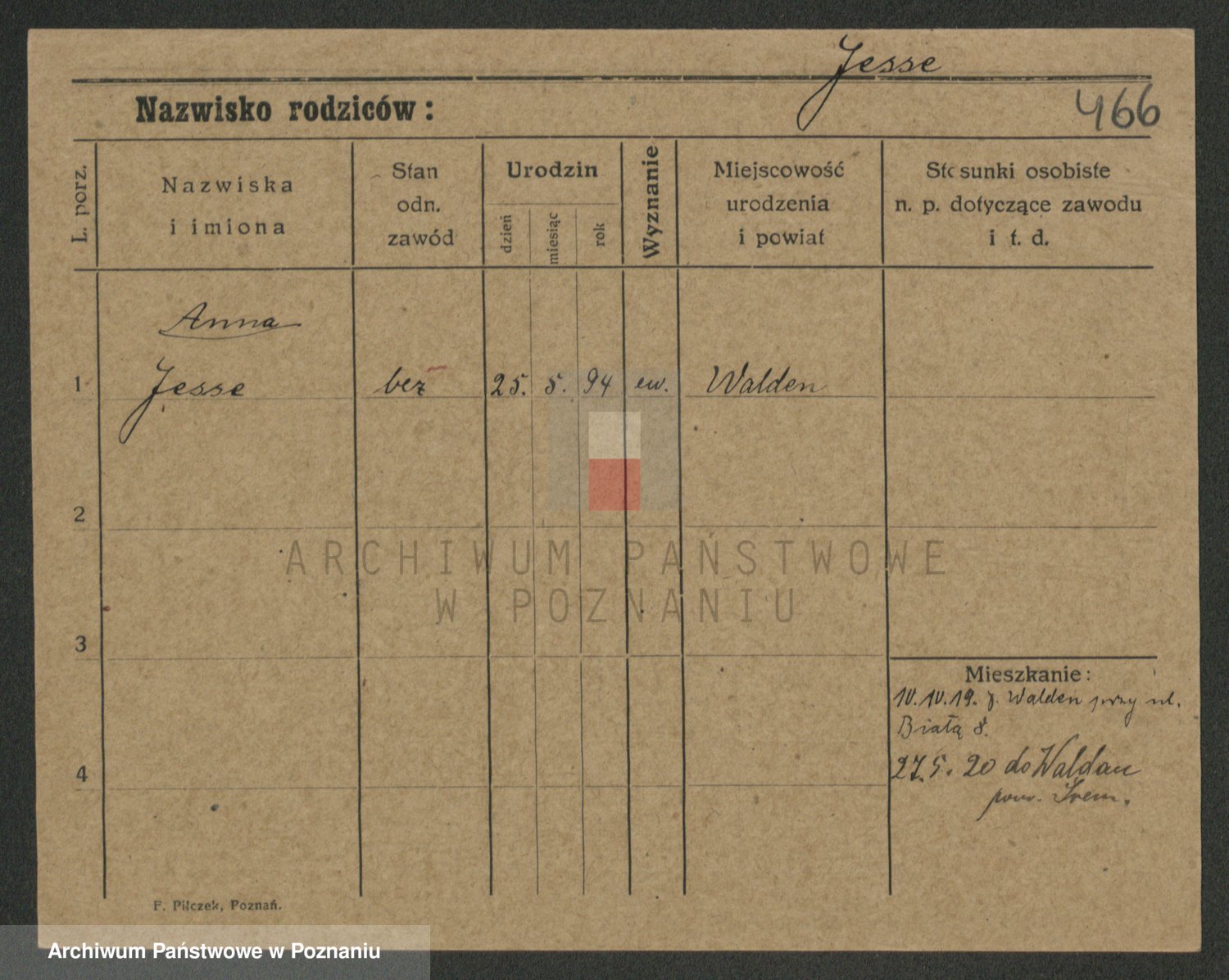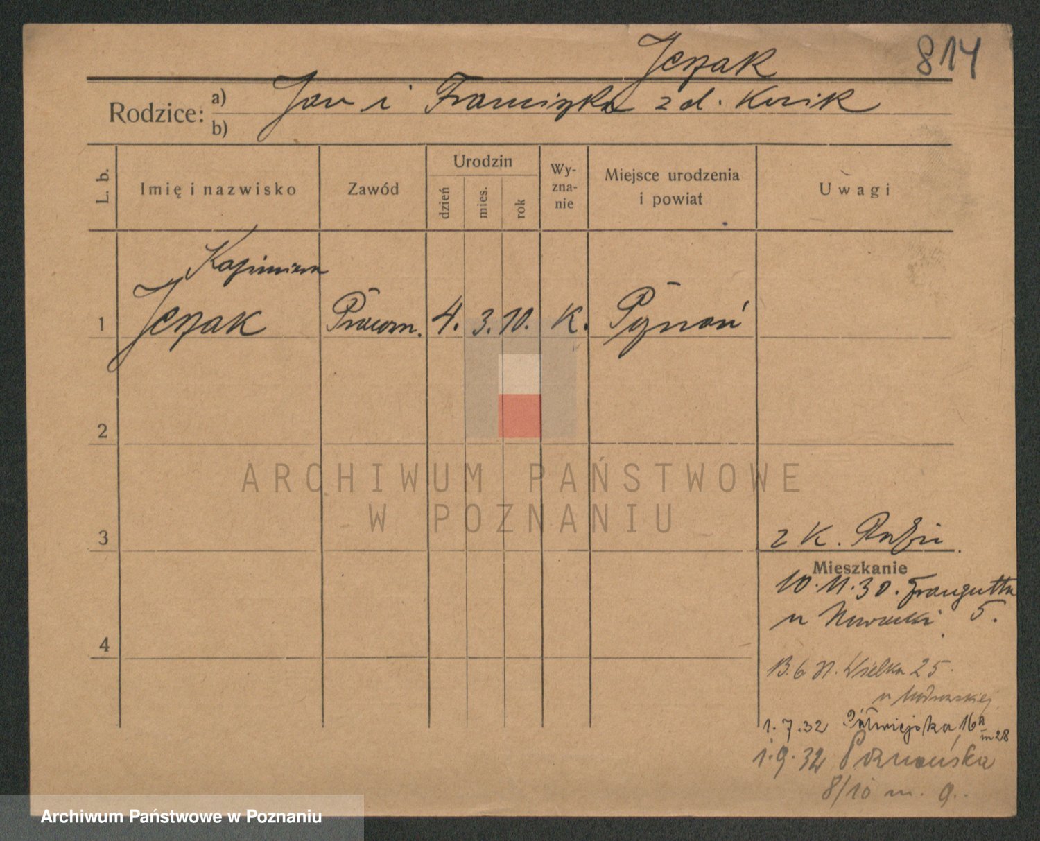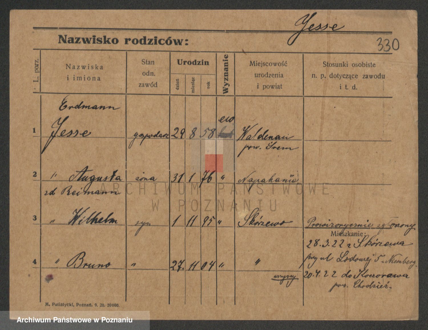 Podgląd karty osobowej dostępny jest po kliknięciu na nazwisko lub ikonkę karty. Można dokonywać powiększenia (ikony na górze) lub przechodzić między kolejnymi skanami (strzałki po bokach).