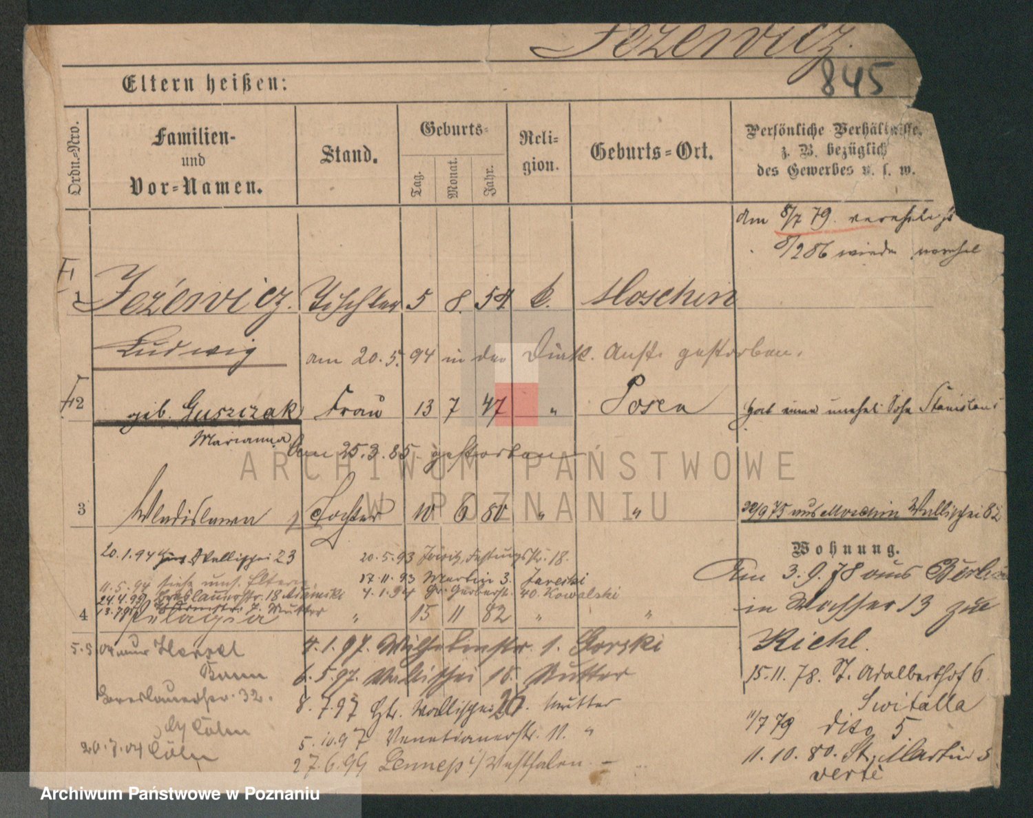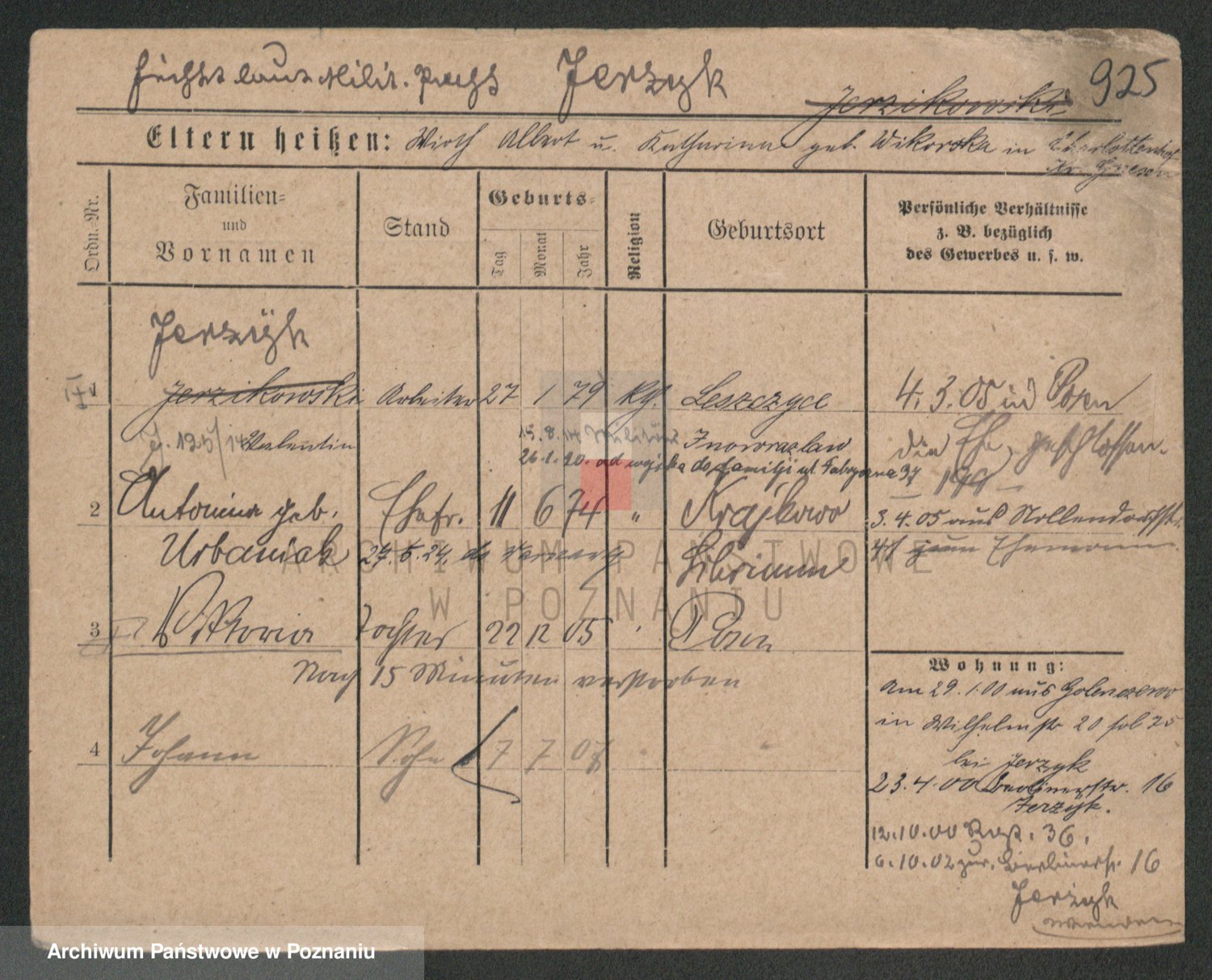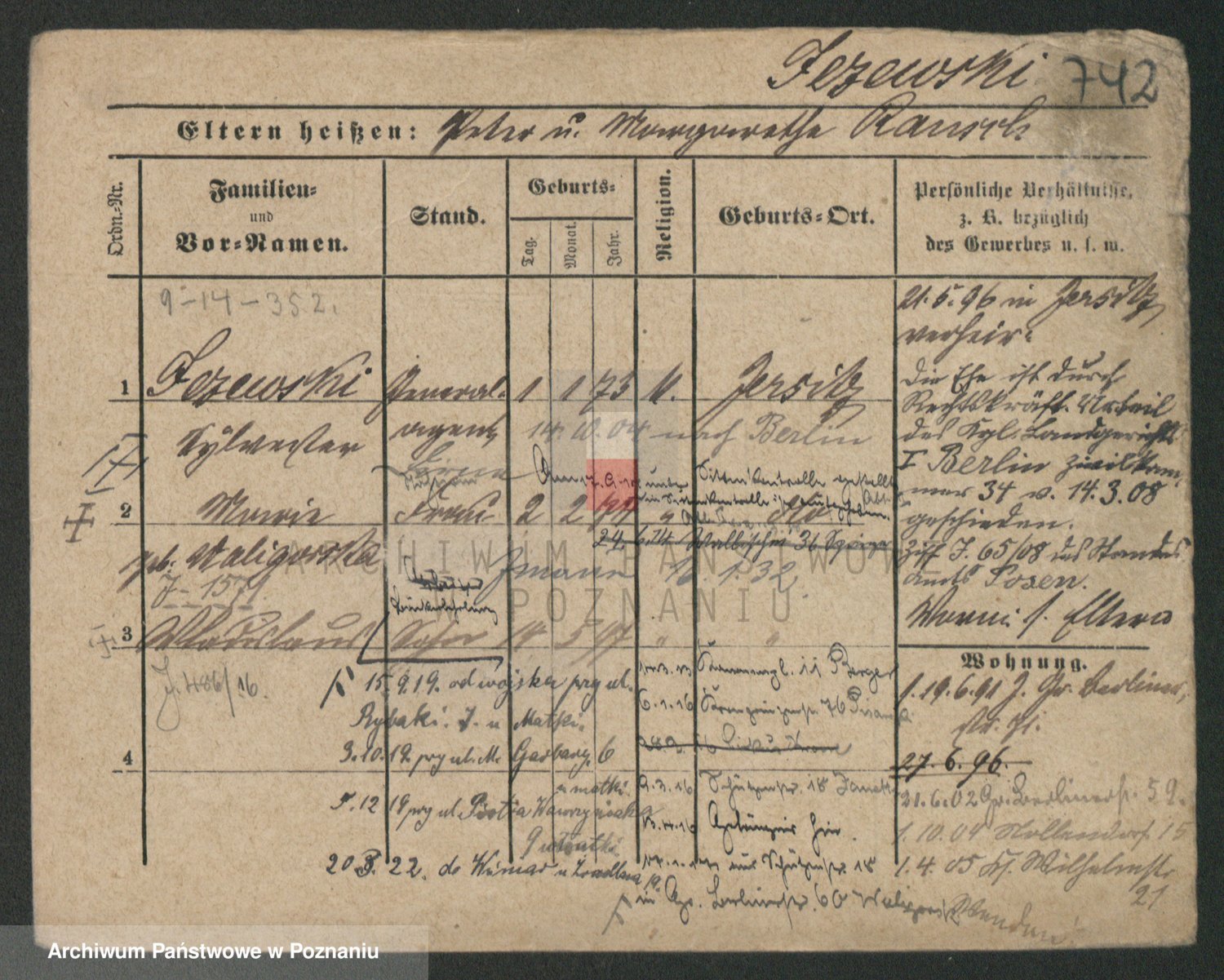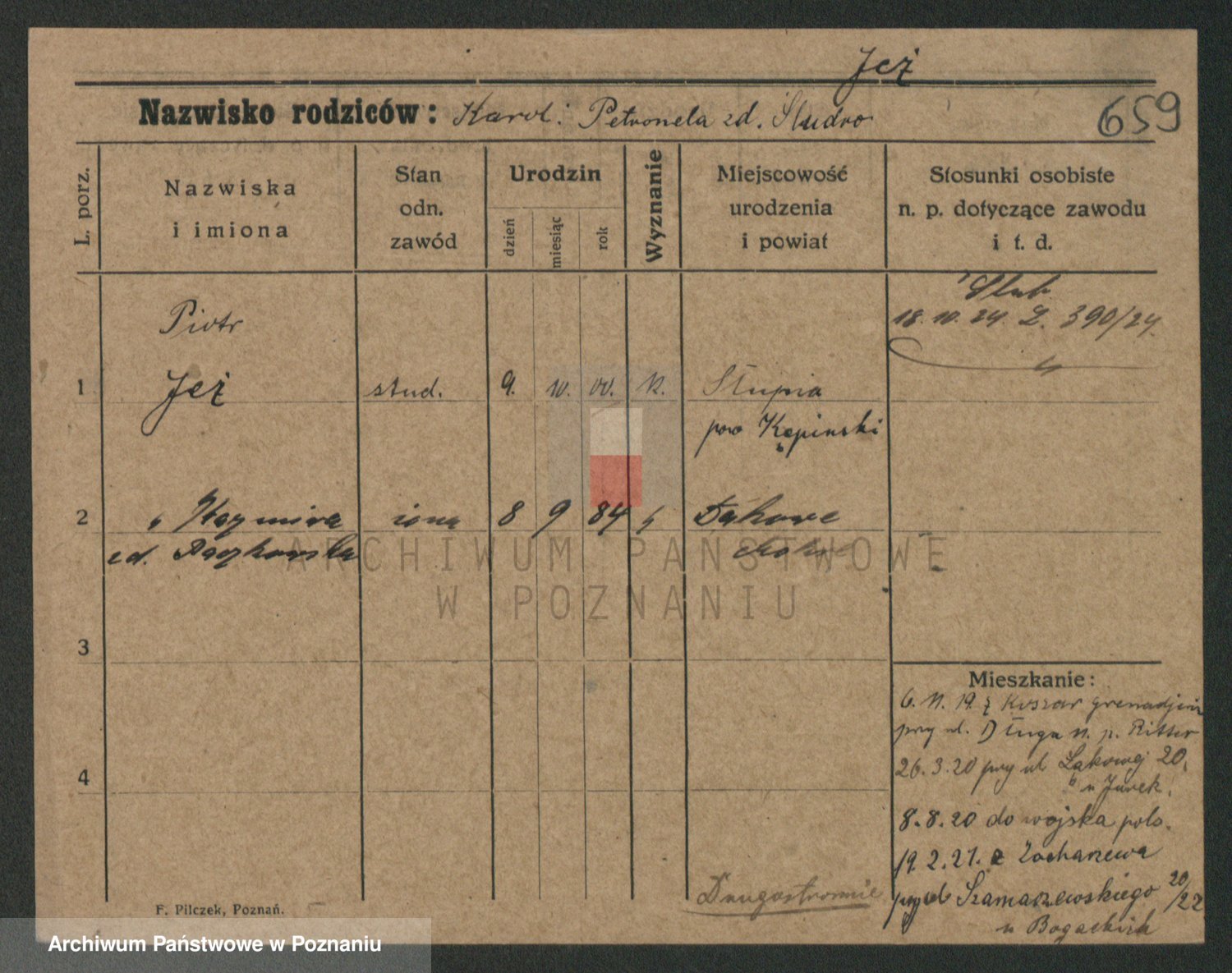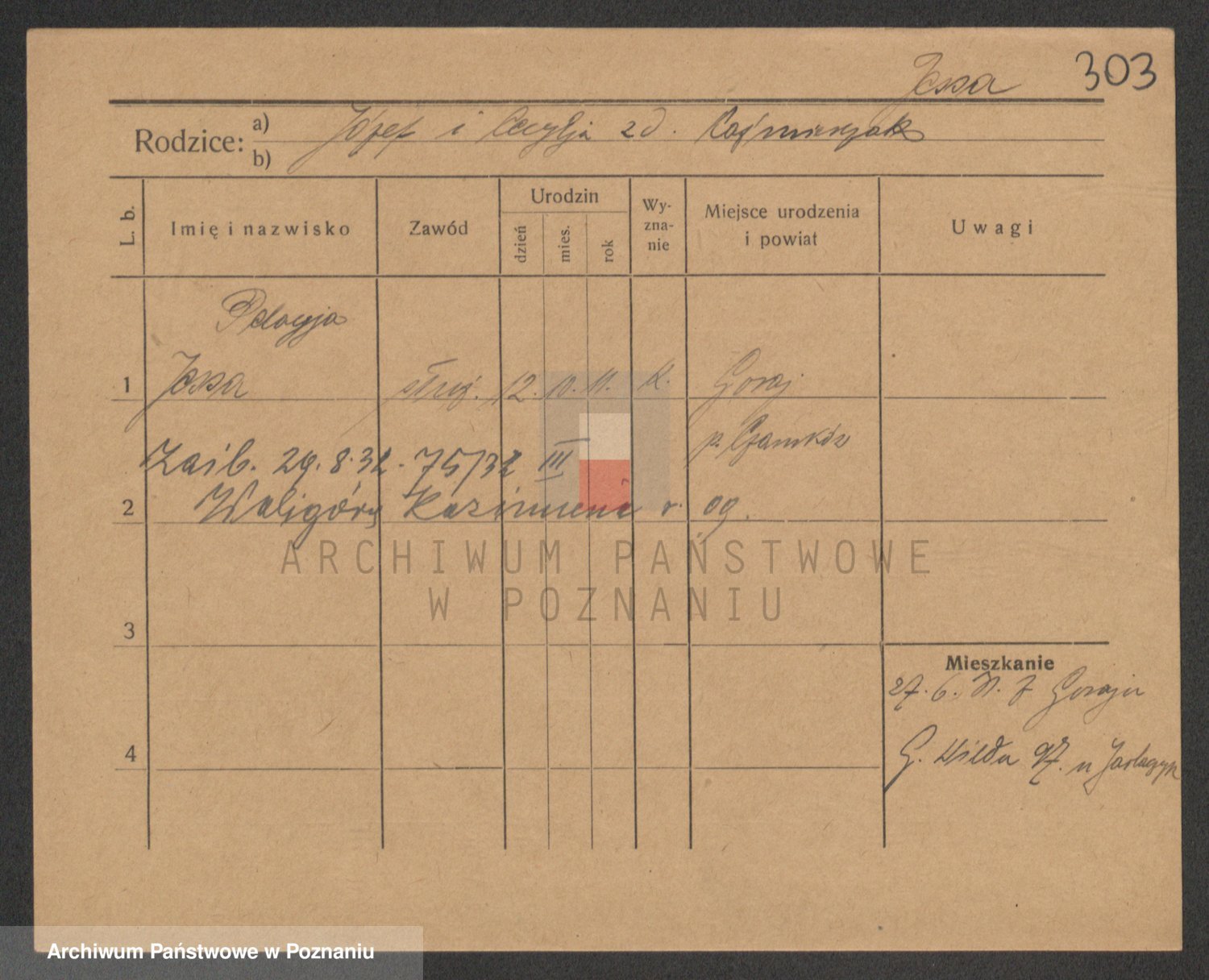 Podgląd karty osobowej dostępny jest po kliknięciu na nazwisko lub ikonkę karty. Można dokonywać powiększenia (ikony na górze) lub przechodzić między kolejnymi skanami (strzałki po bokach).