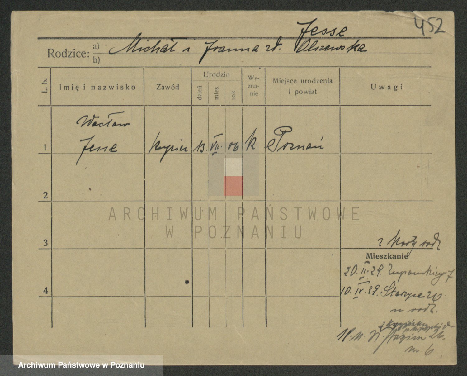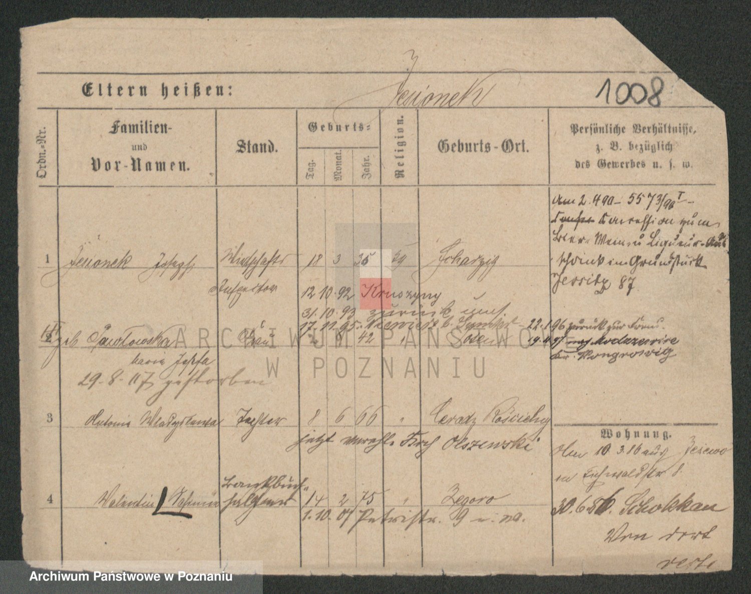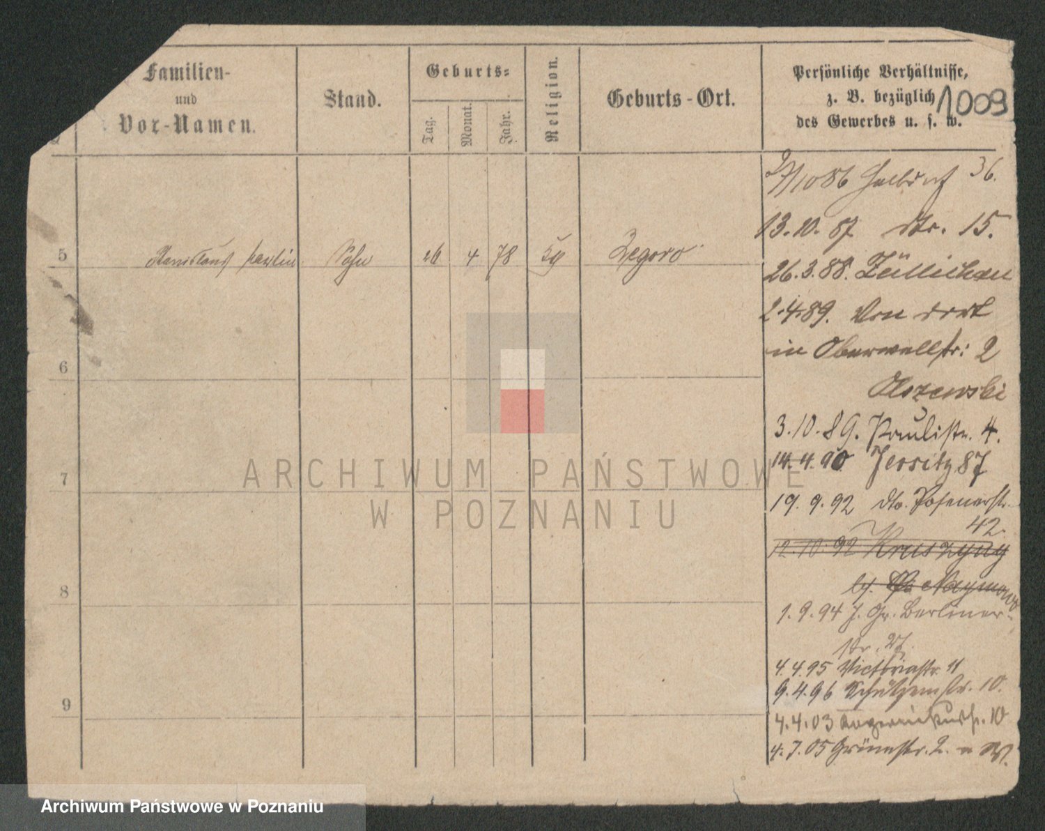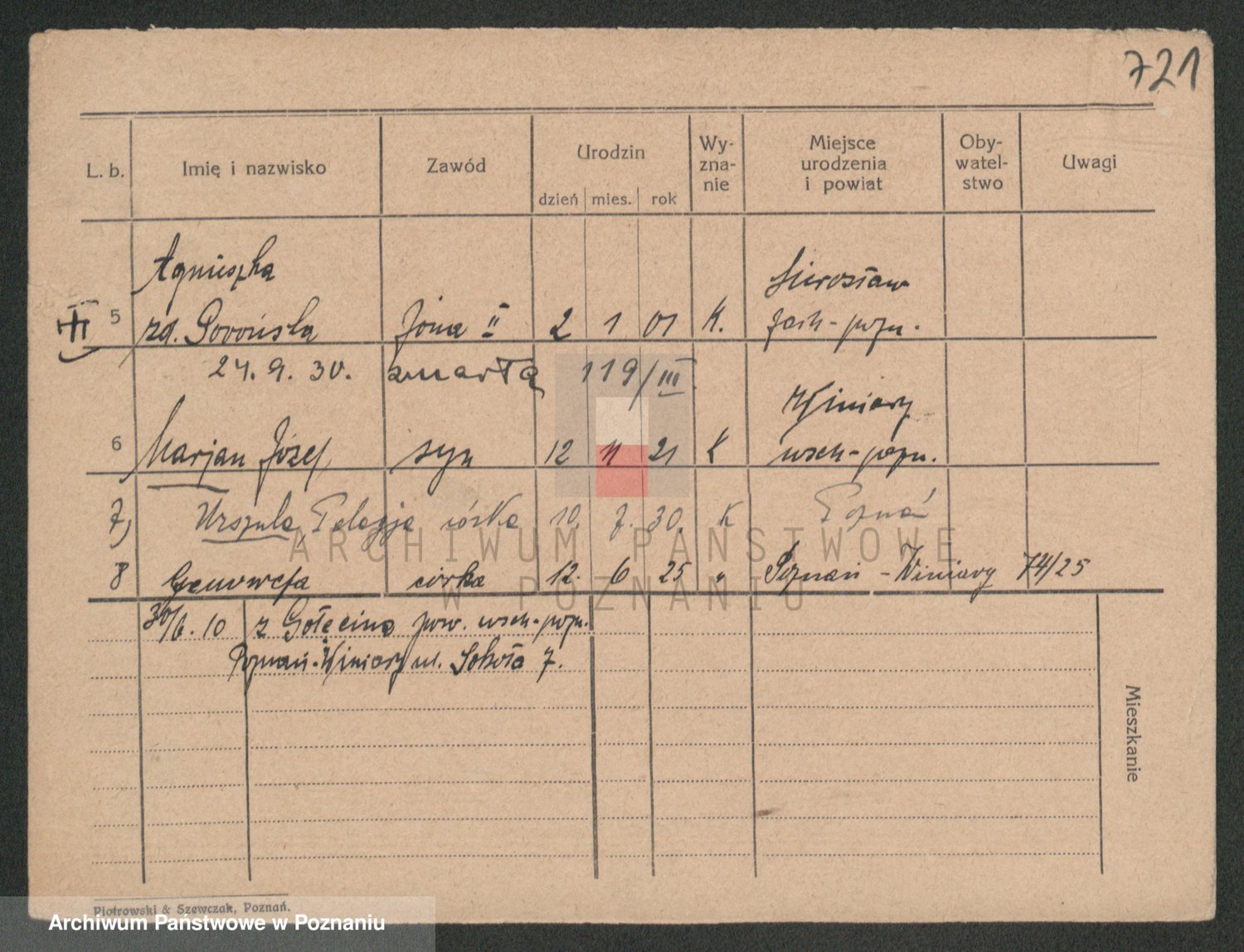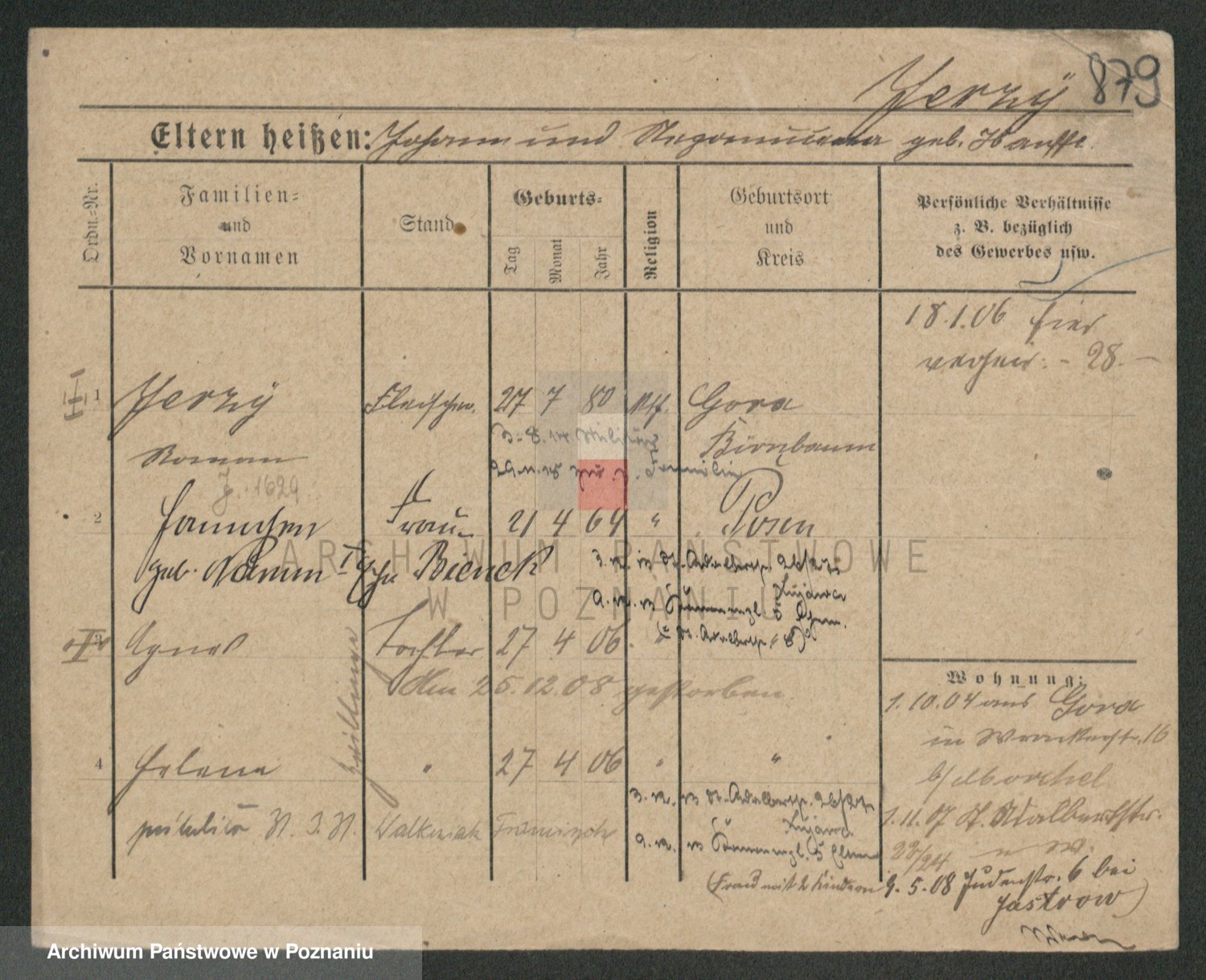 Podgląd karty osobowej dostępny jest po kliknięciu na nazwisko lub ikonkę karty. Można dokonywać powiększenia (ikony na górze) lub przechodzić między kolejnymi skanami (strzałki po bokach).