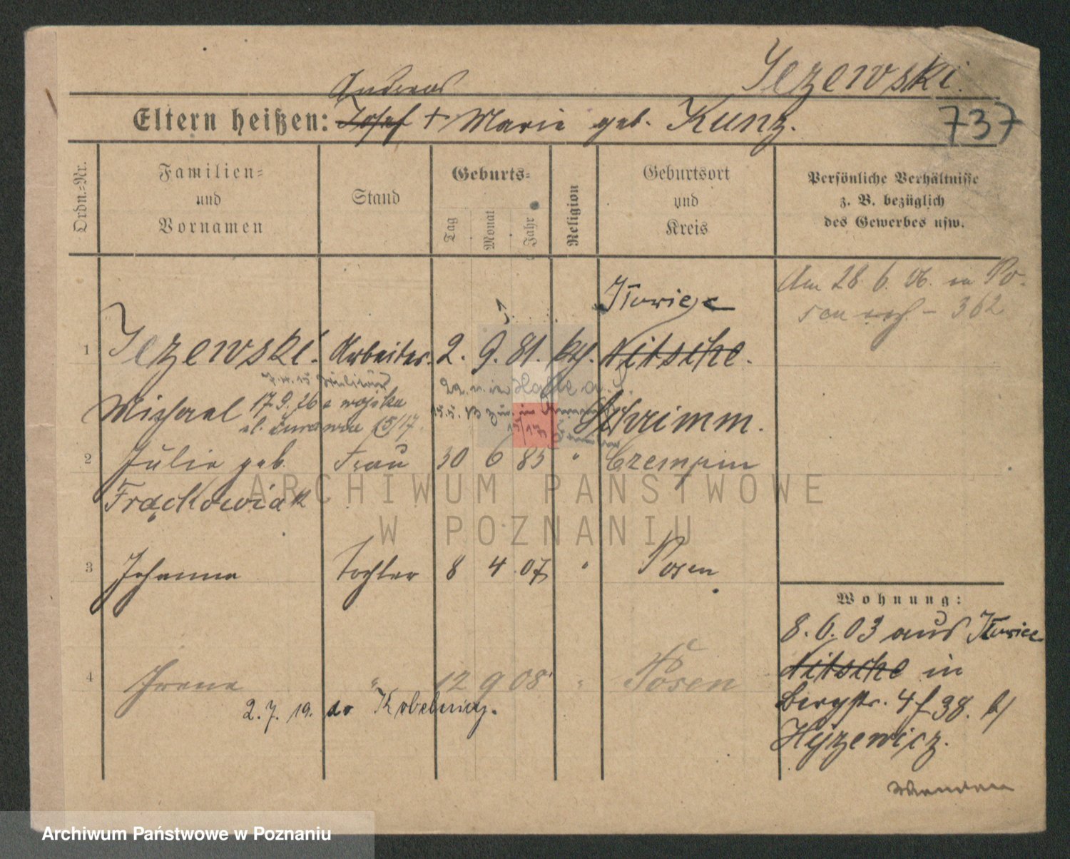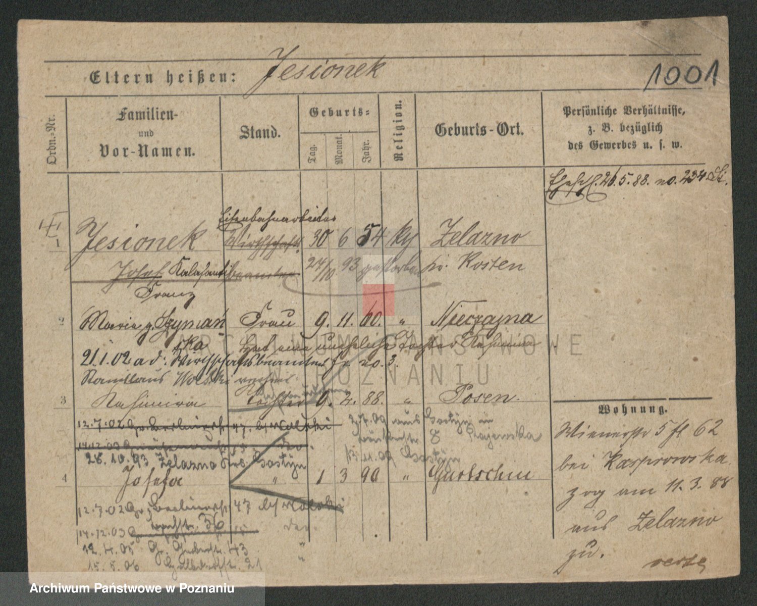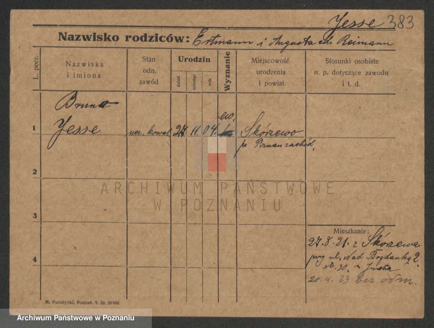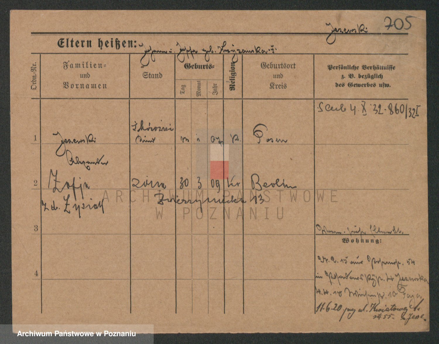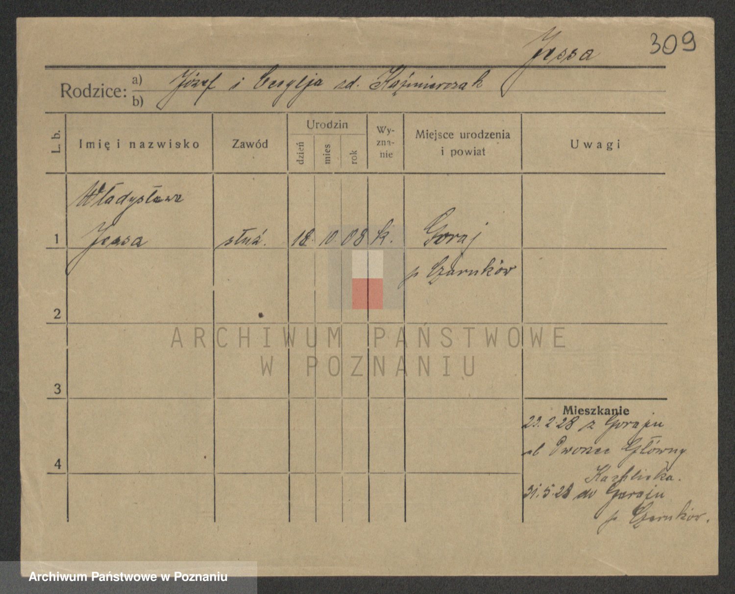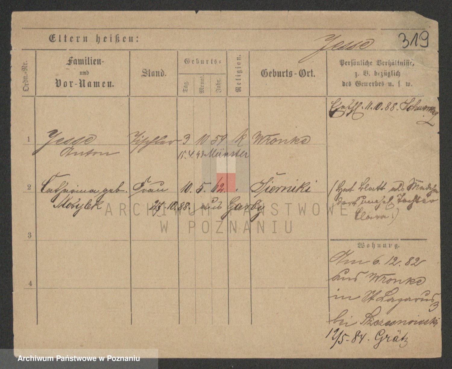 Podgląd karty osobowej dostępny jest po kliknięciu na nazwisko lub ikonkę karty. Można dokonywać powiększenia (ikony na górze) lub przechodzić między kolejnymi skanami (strzałki po bokach).