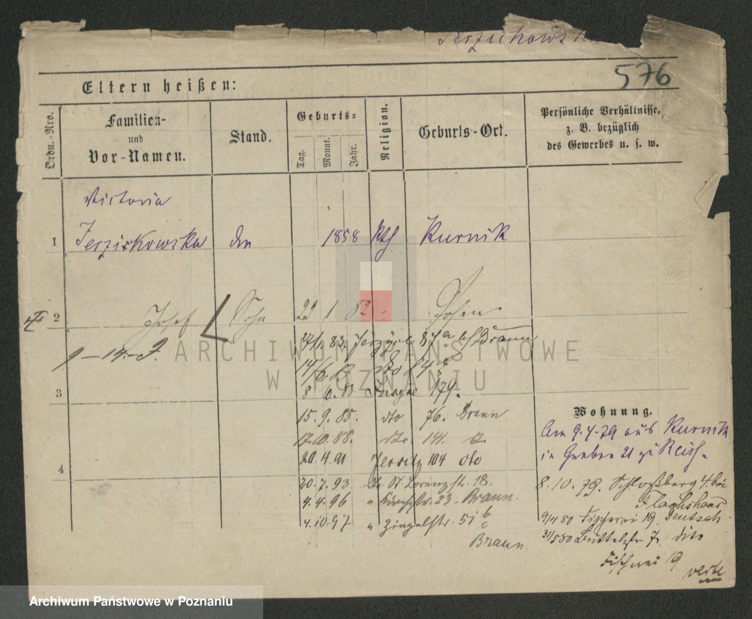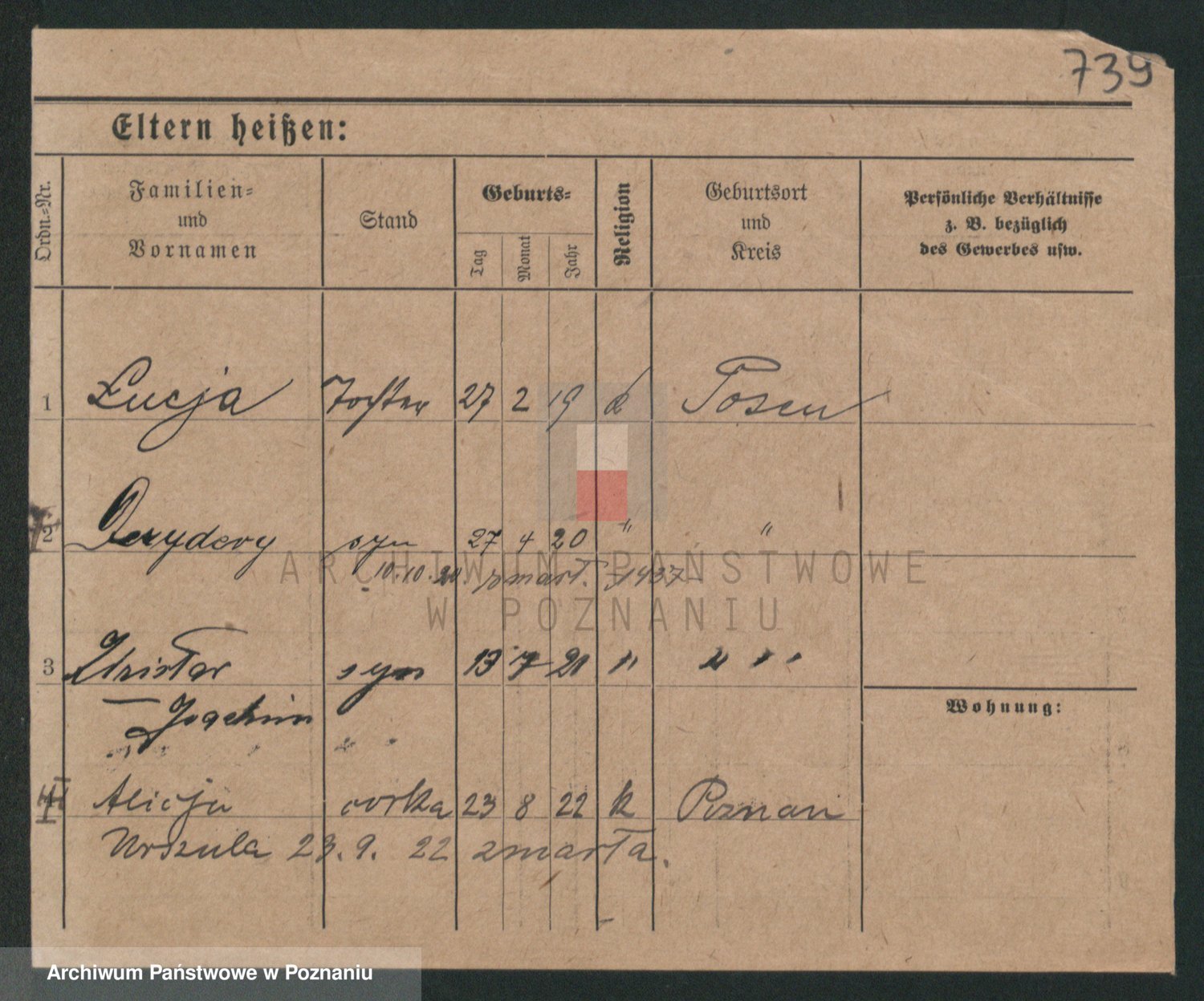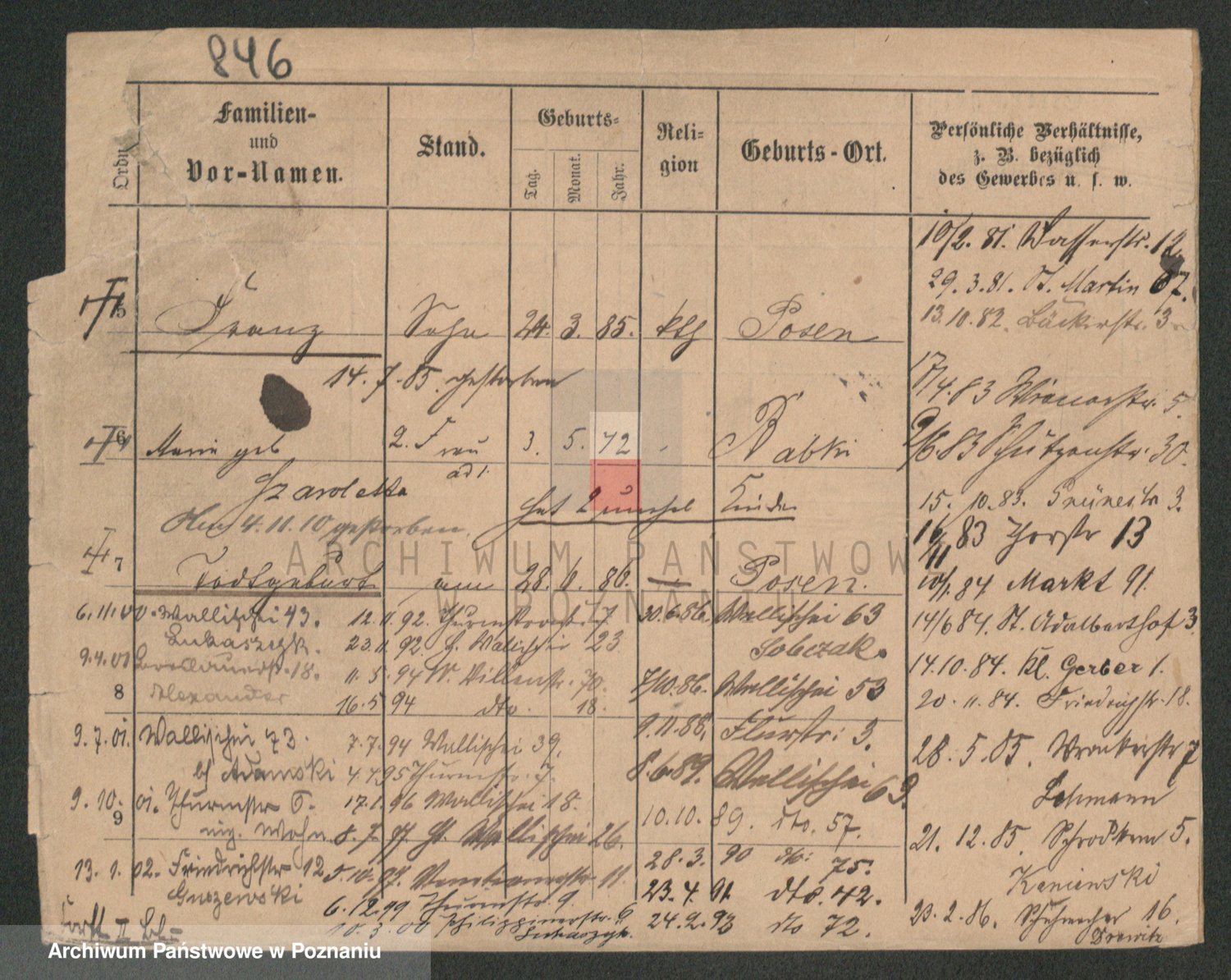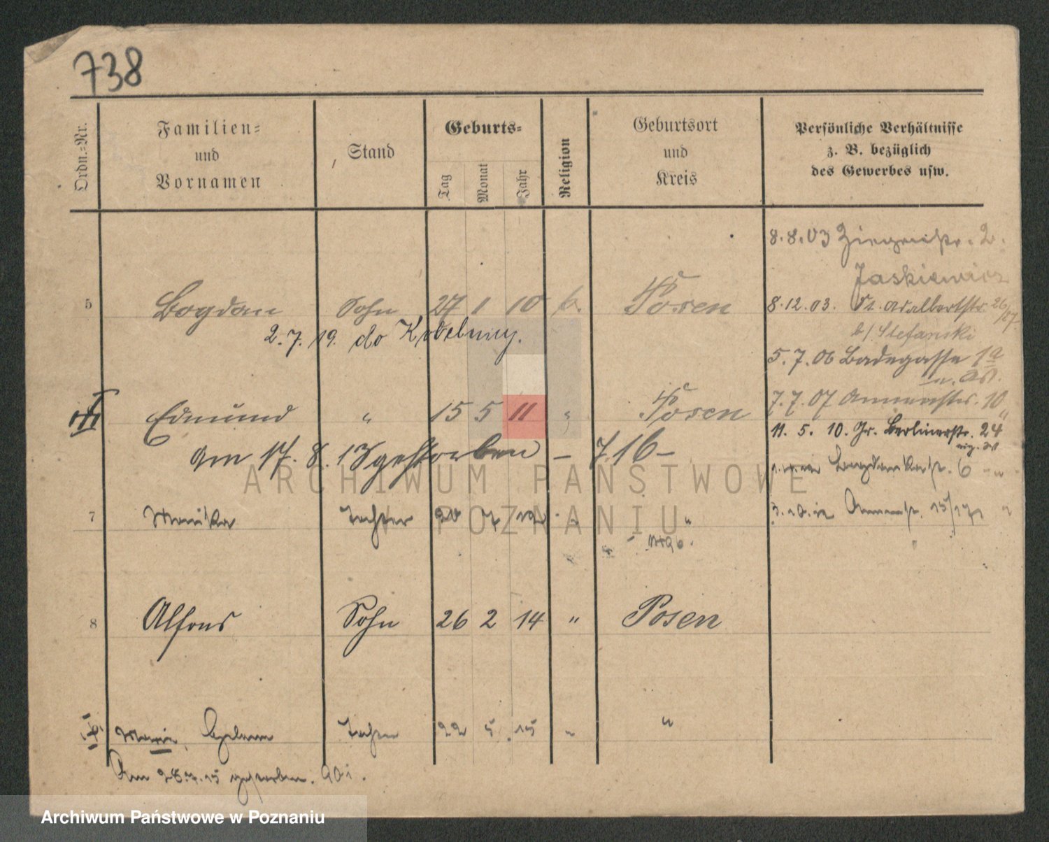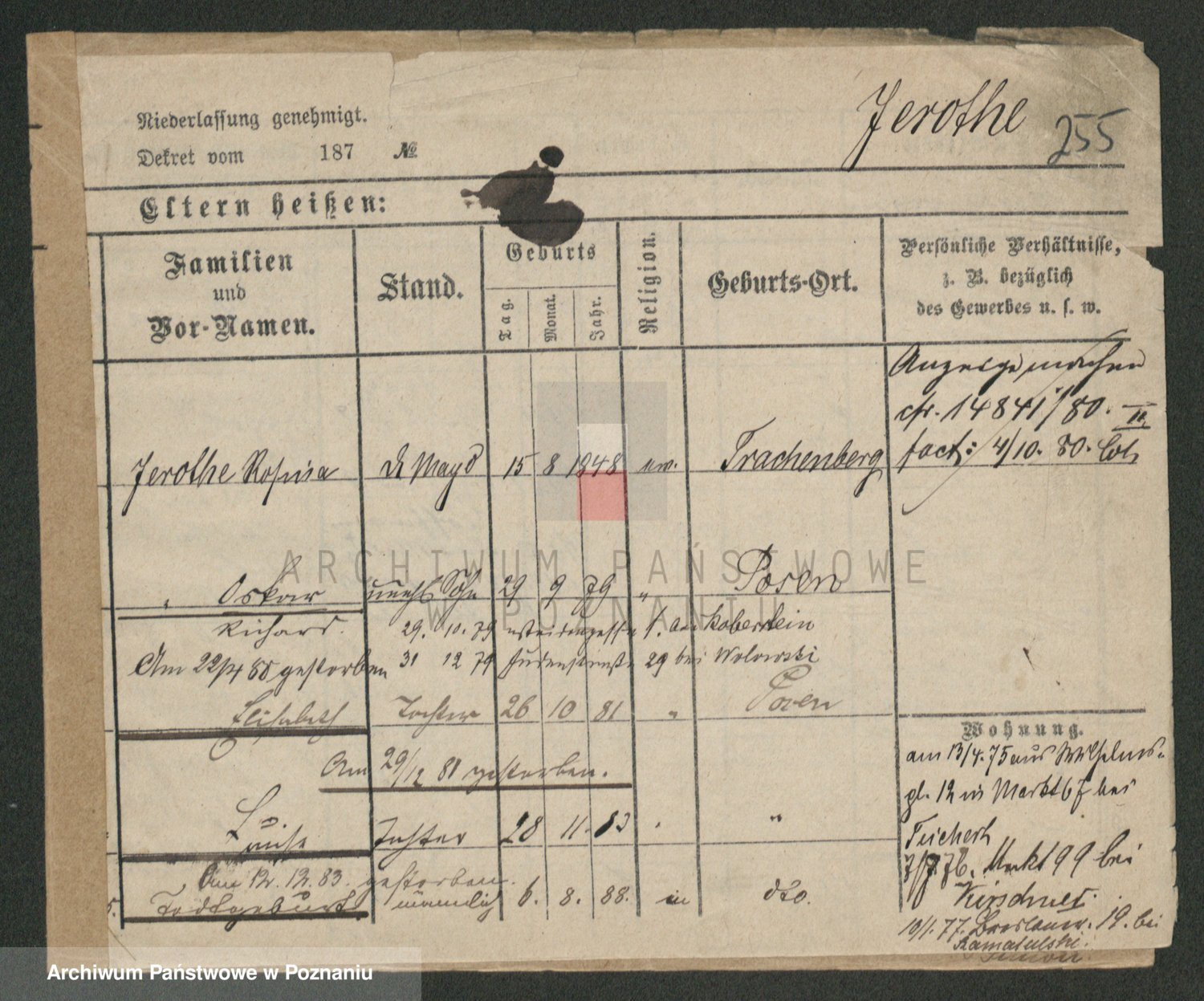Podgląd karty osobowej dostępny jest po kliknięciu na nazwisko lub ikonkę karty. Można dokonywać powiększenia (ikony na górze) lub przechodzić między kolejnymi skanami (strzałki po bokach).