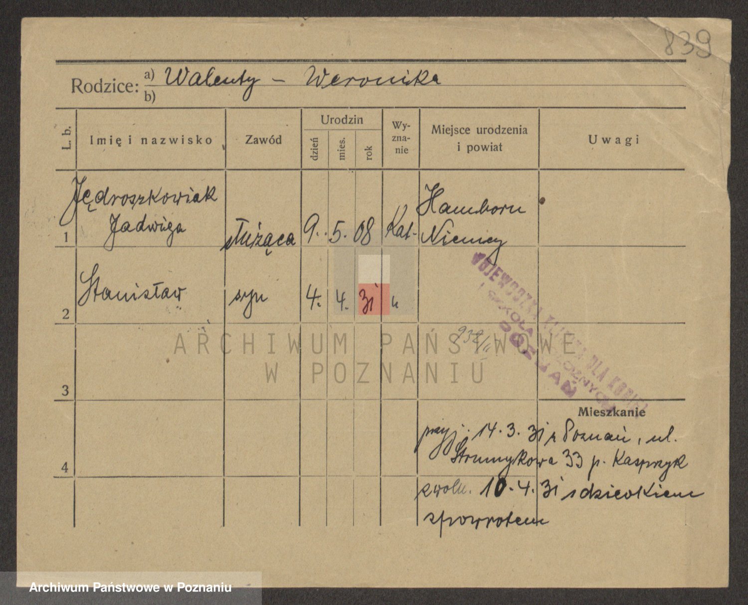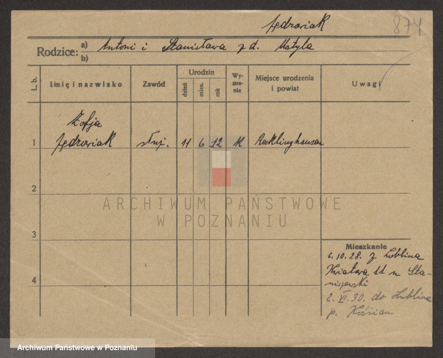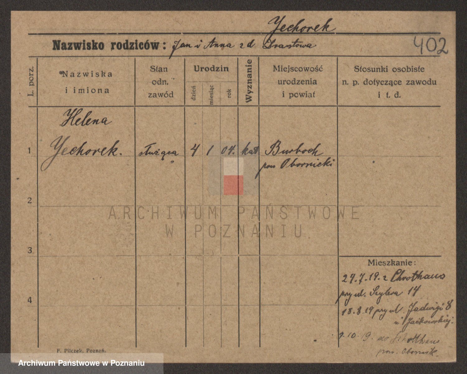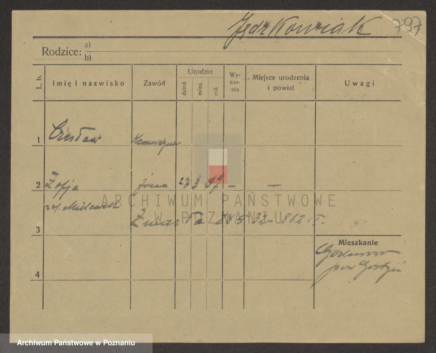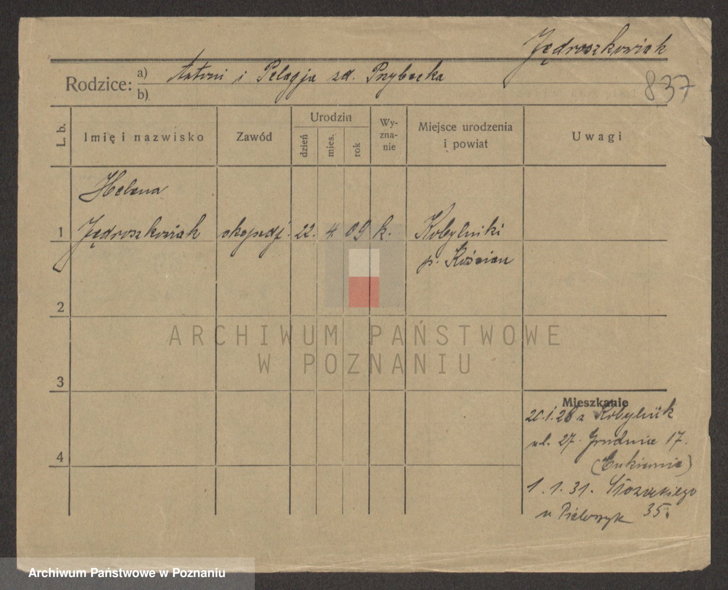Podgląd karty osobowej dostępny jest po kliknięciu na nazwisko lub ikonkę karty. Można dokonywać powiększenia (ikony na górze) lub przechodzić między kolejnymi skanami (strzałki po bokach).