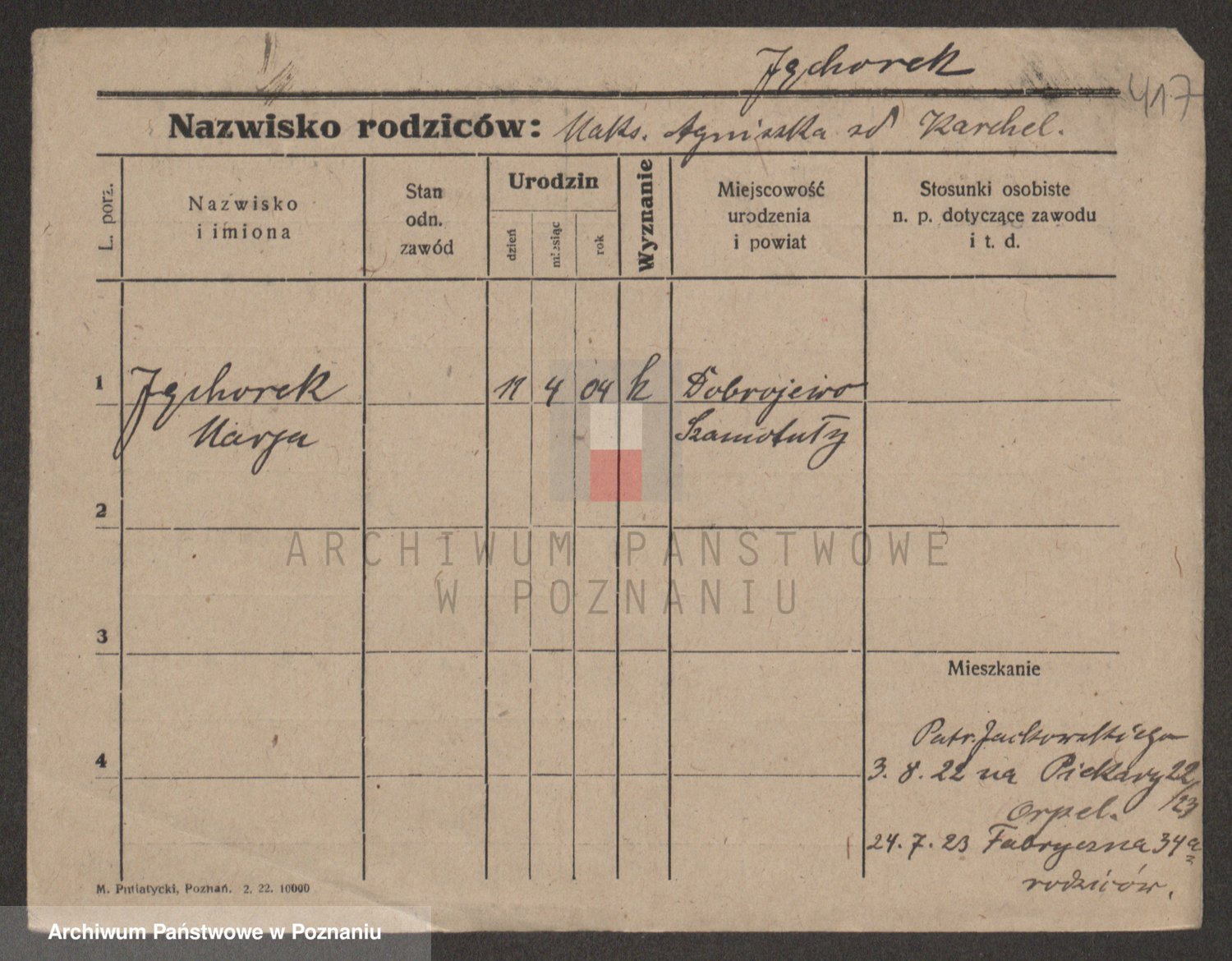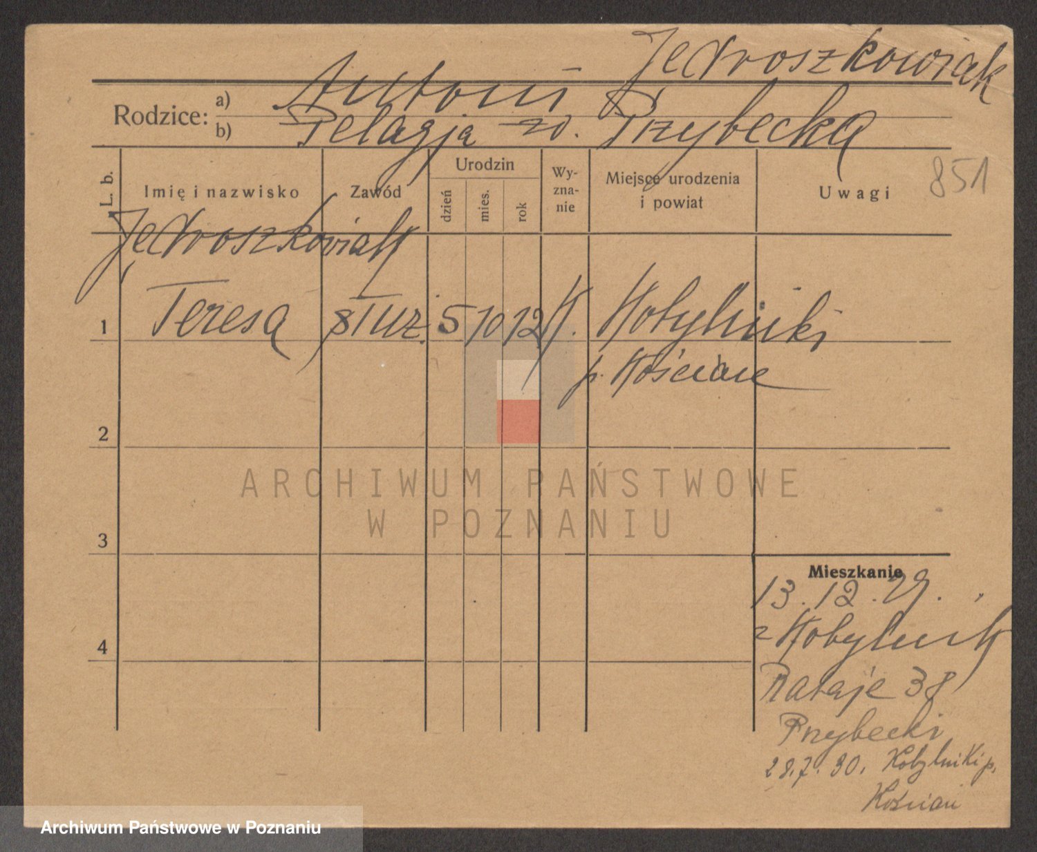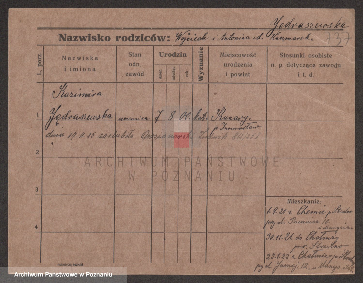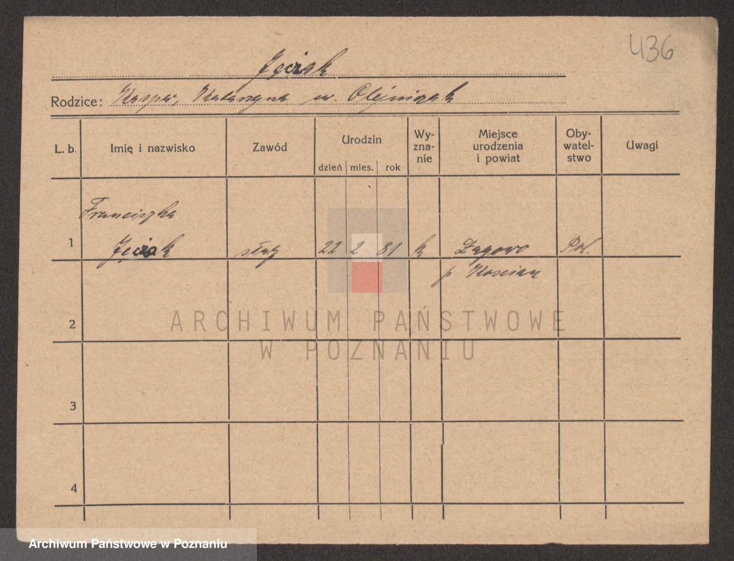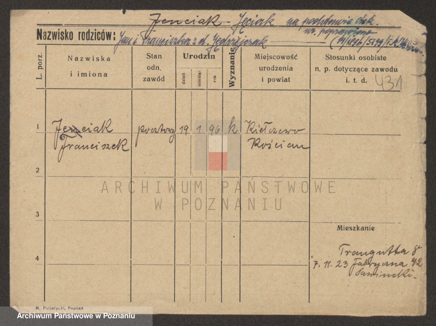 Podgląd karty osobowej dostępny jest po kliknięciu na nazwisko lub ikonkę karty. Można dokonywać powiększenia (ikony na górze) lub przechodzić między kolejnymi skanami (strzałki po bokach).