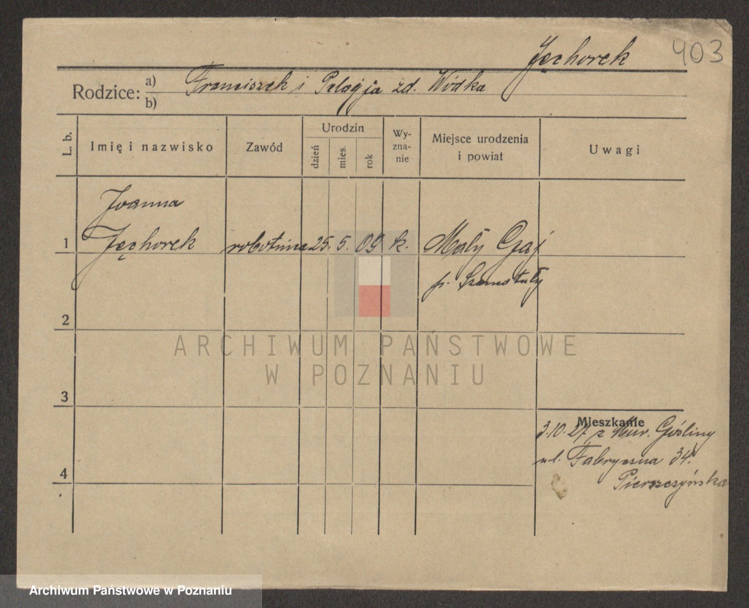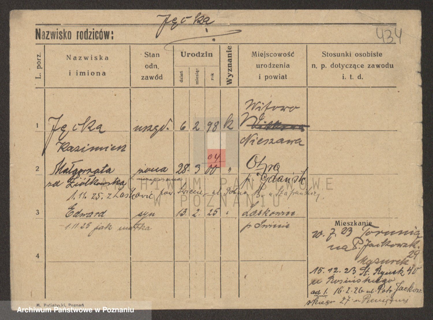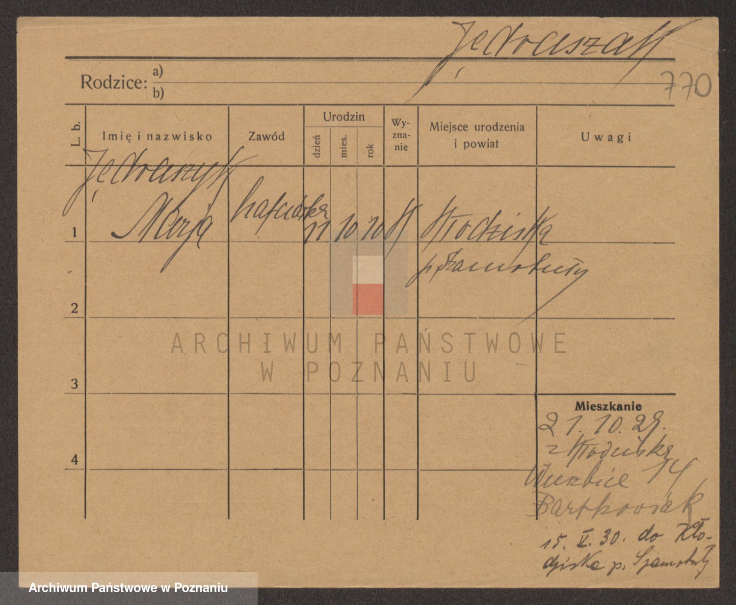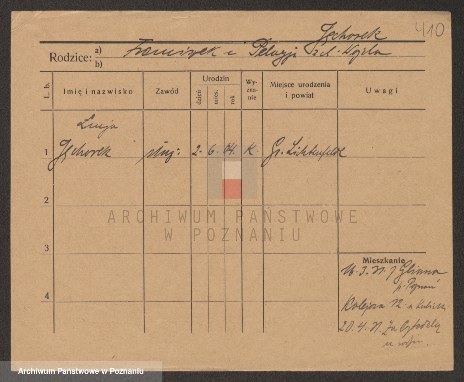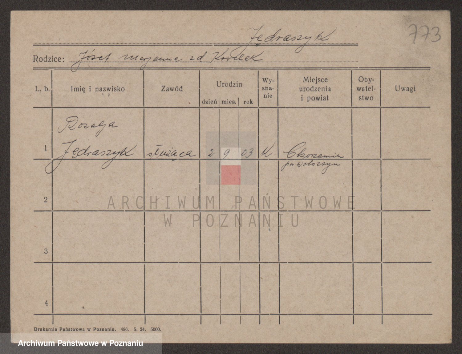 Podgląd karty osobowej dostępny jest po kliknięciu na nazwisko lub ikonkę karty. Można dokonywać powiększenia (ikony na górze) lub przechodzić między kolejnymi skanami (strzałki po bokach).