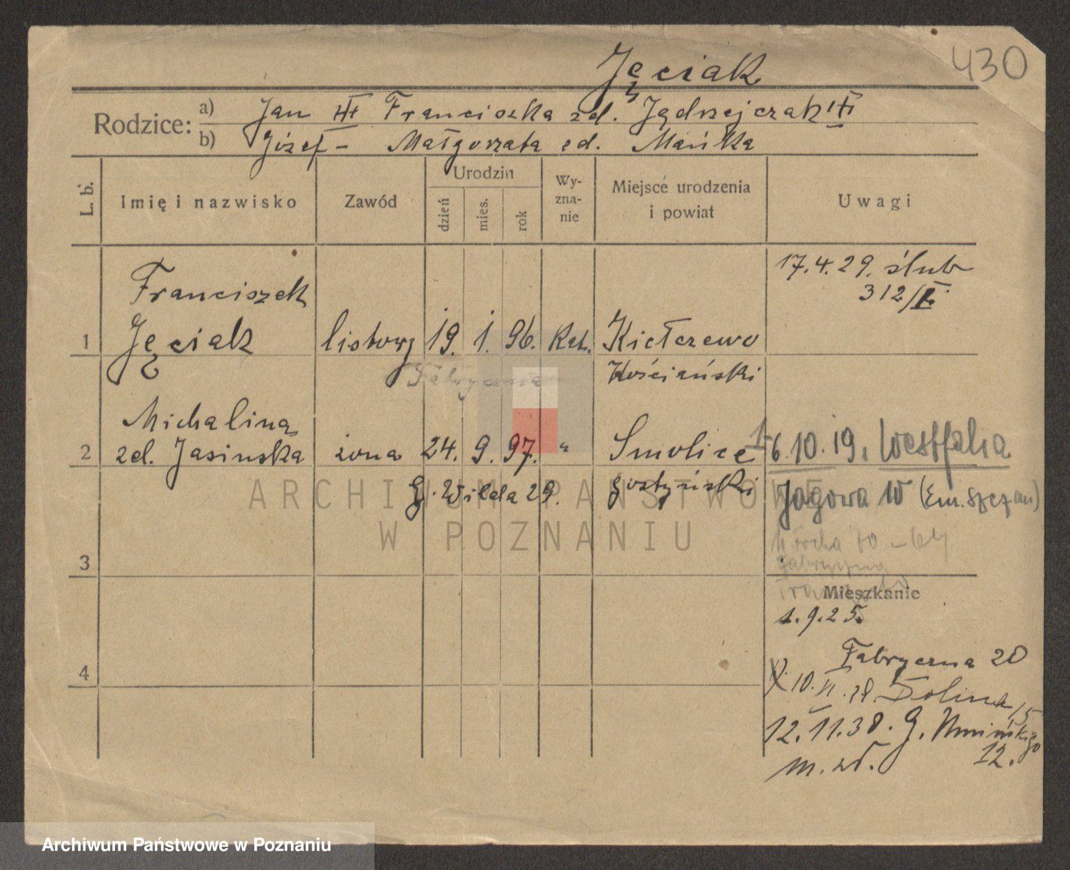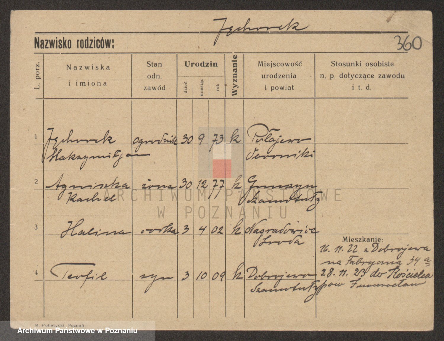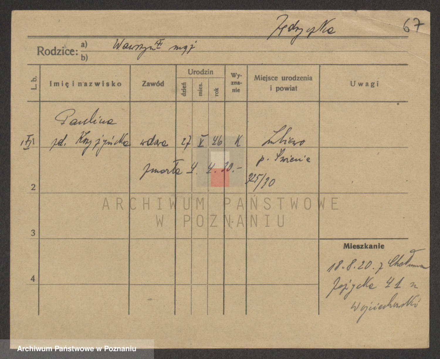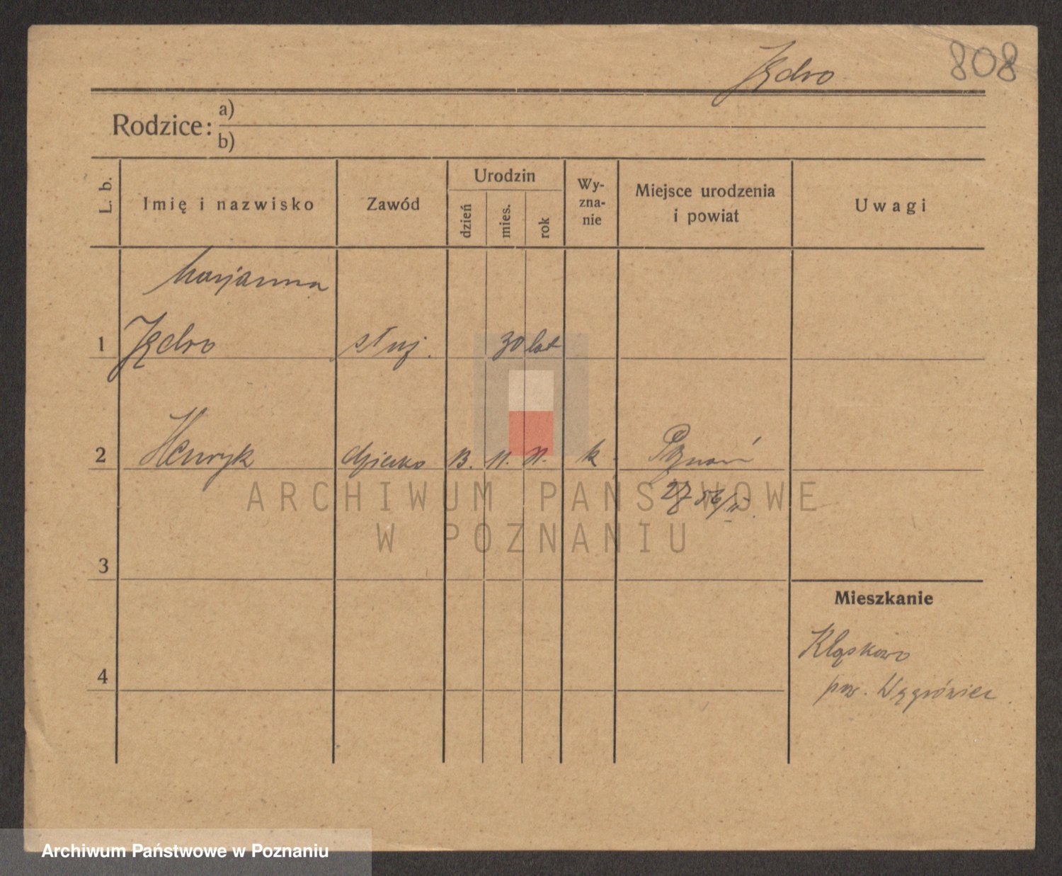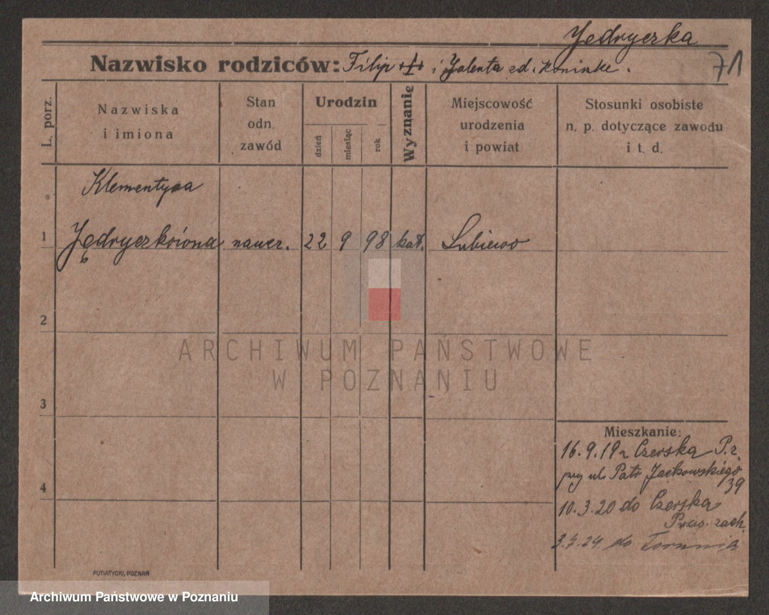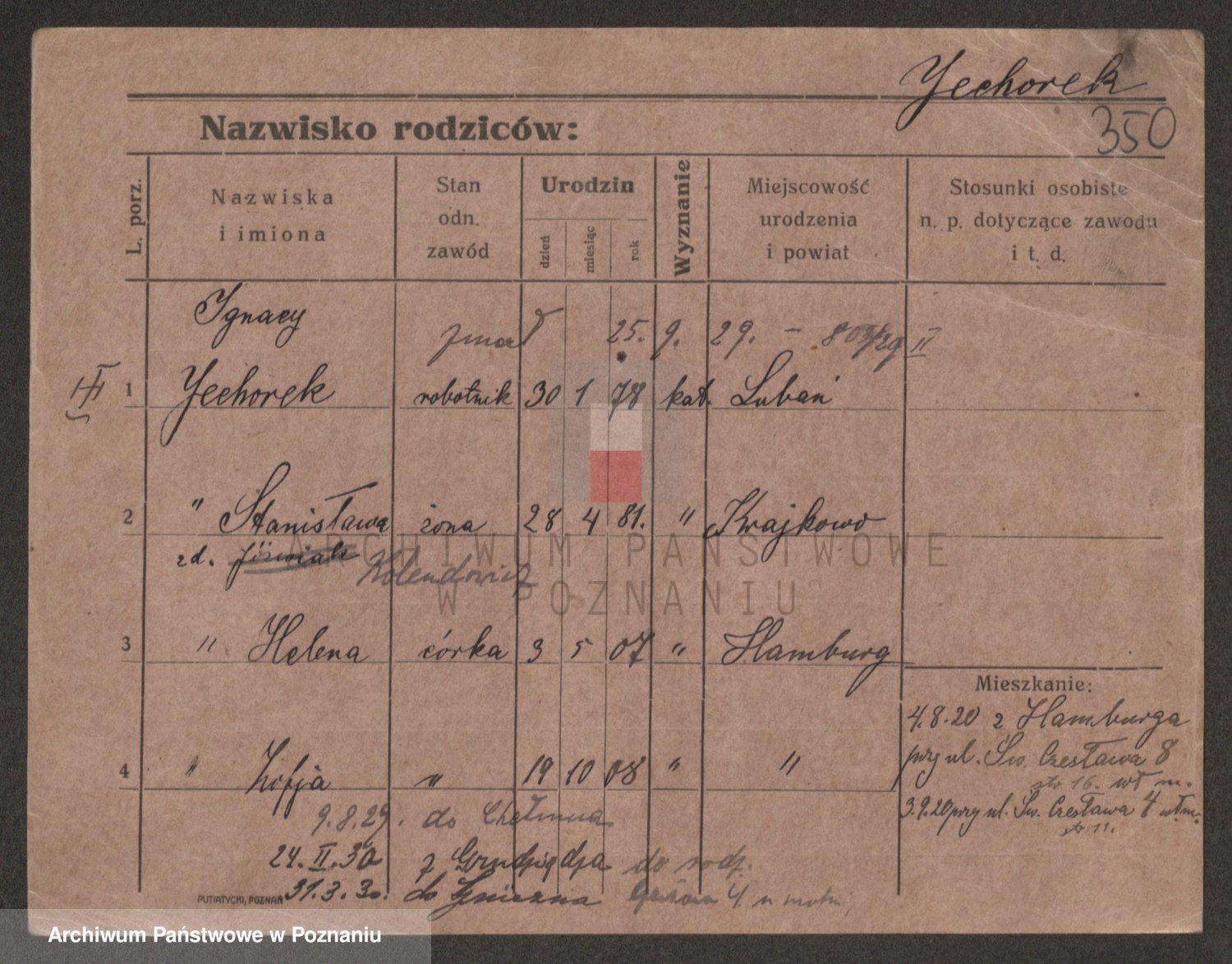 Podgląd karty osobowej dostępny jest po kliknięciu na nazwisko lub ikonkę karty. Można dokonywać powiększenia (ikony na górze) lub przechodzić między kolejnymi skanami (strzałki po bokach).
