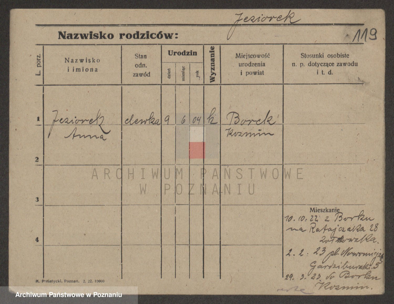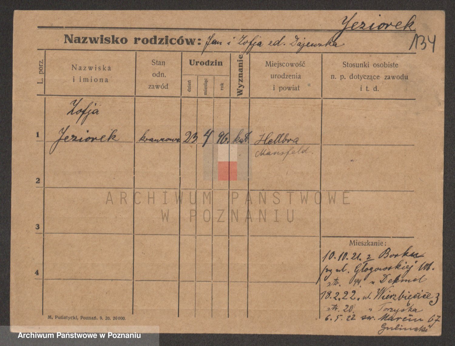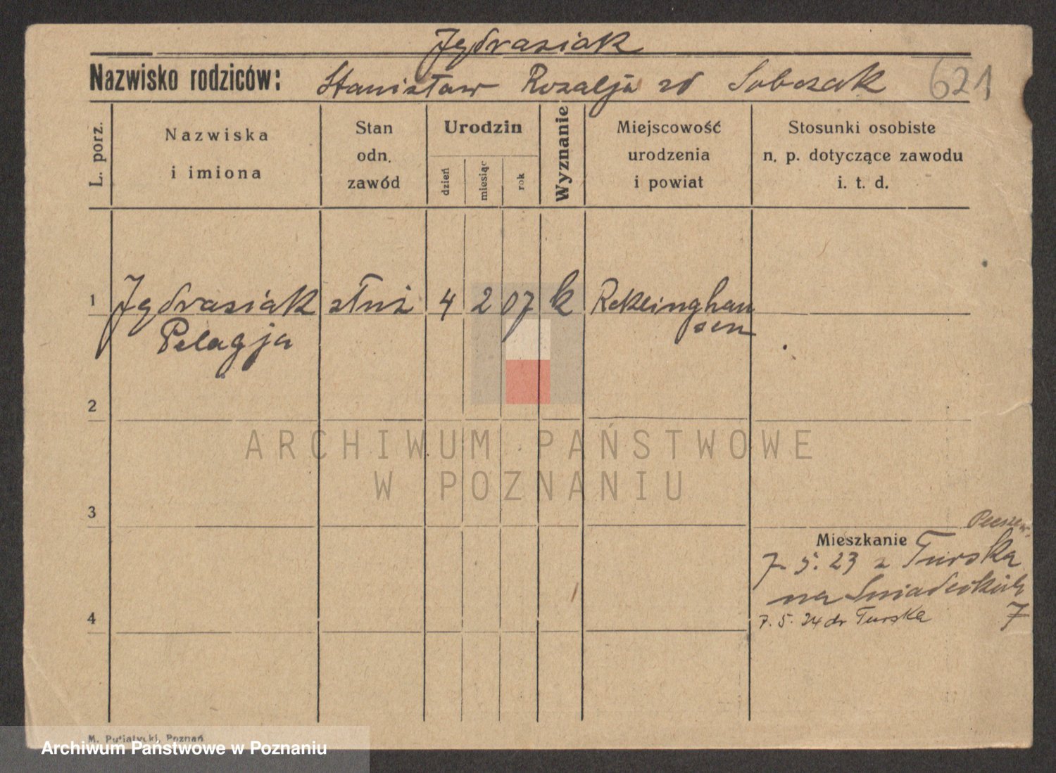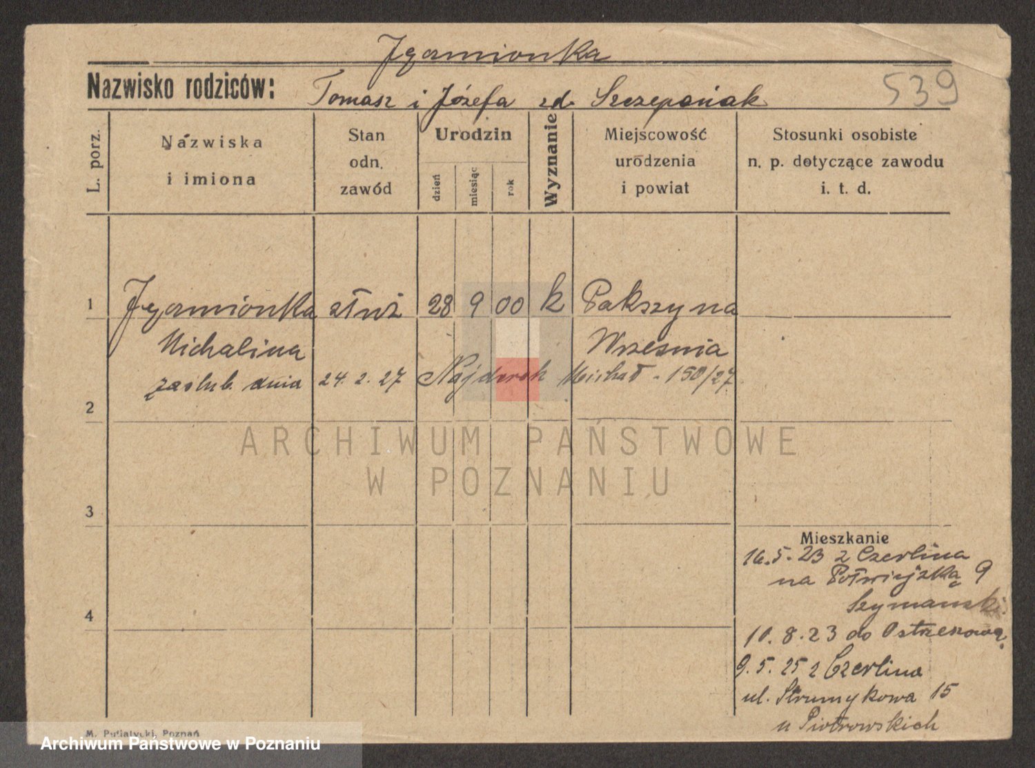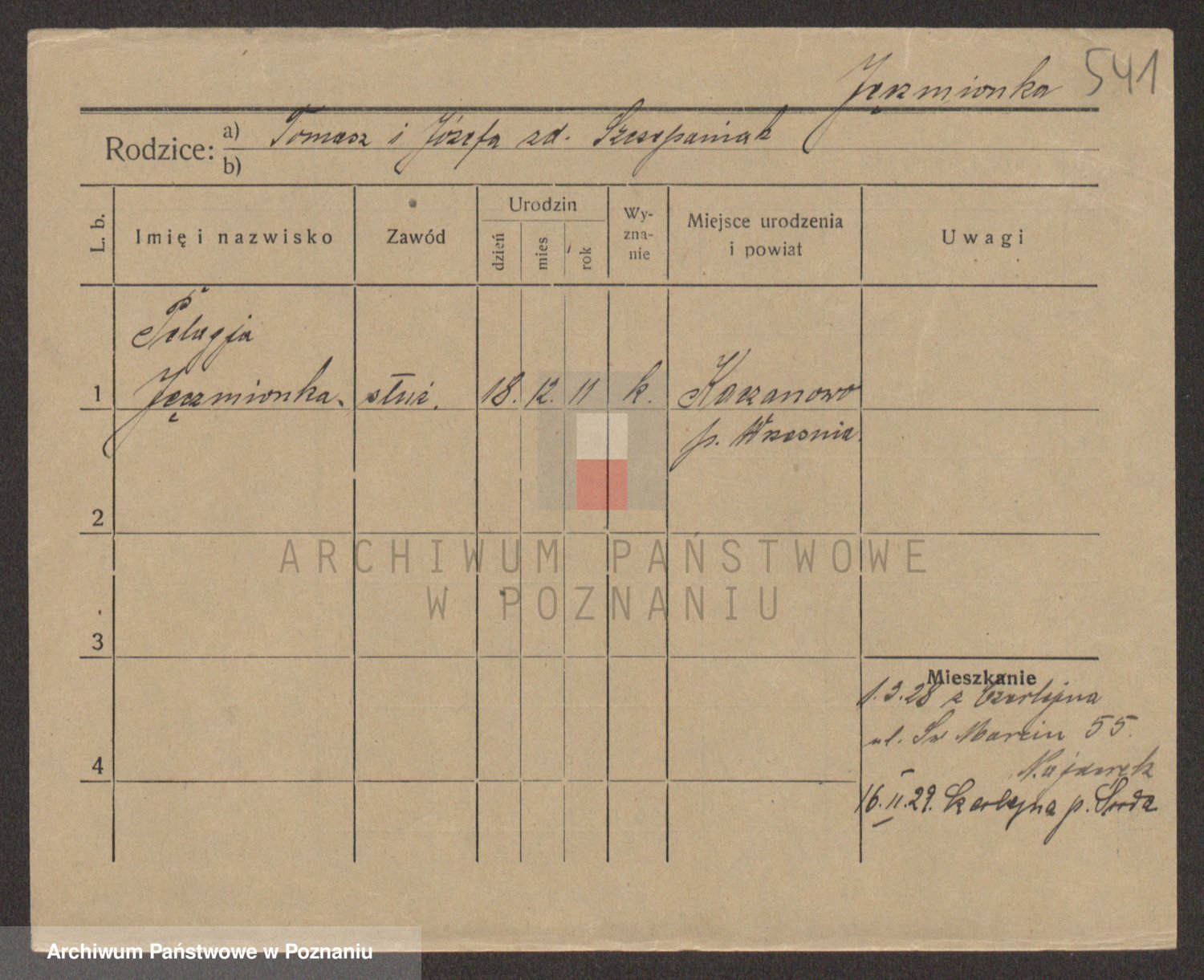 Podgląd karty osobowej dostępny jest po kliknięciu na nazwisko lub ikonkę karty. Można dokonywać powiększenia (ikony na górze) lub przechodzić między kolejnymi skanami (strzałki po bokach).