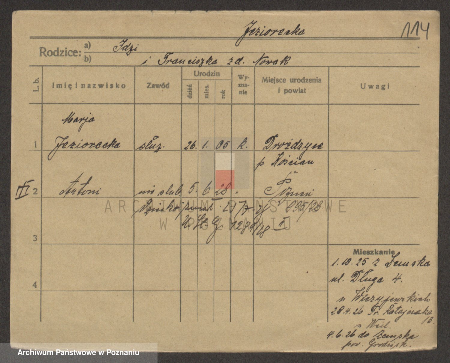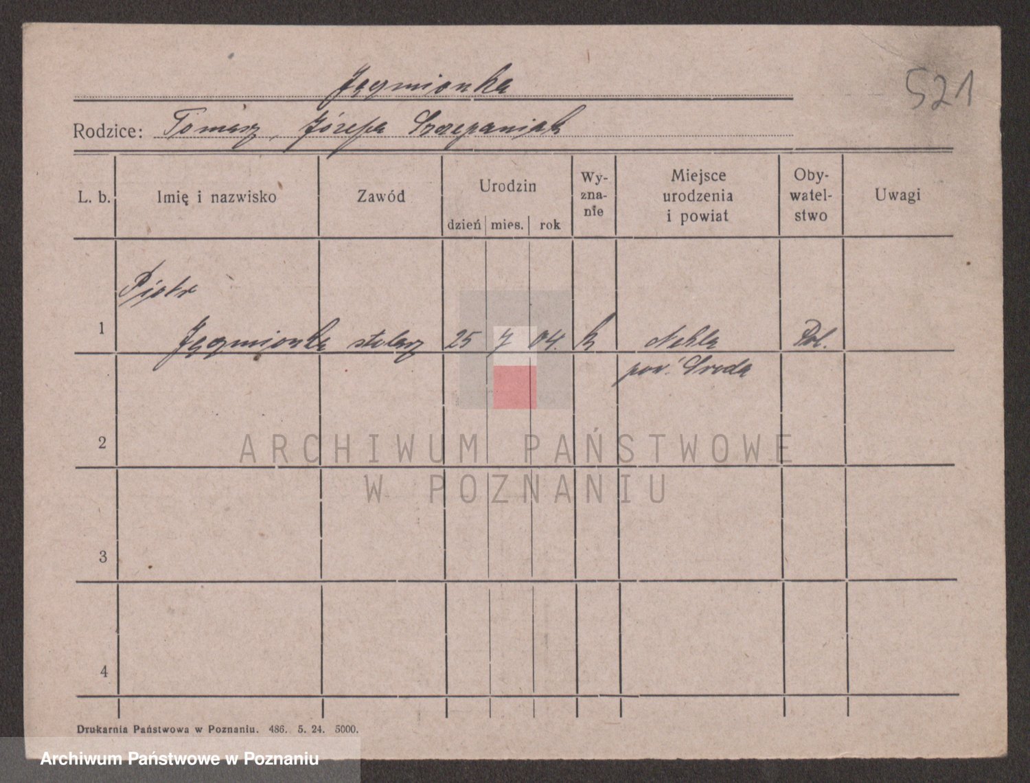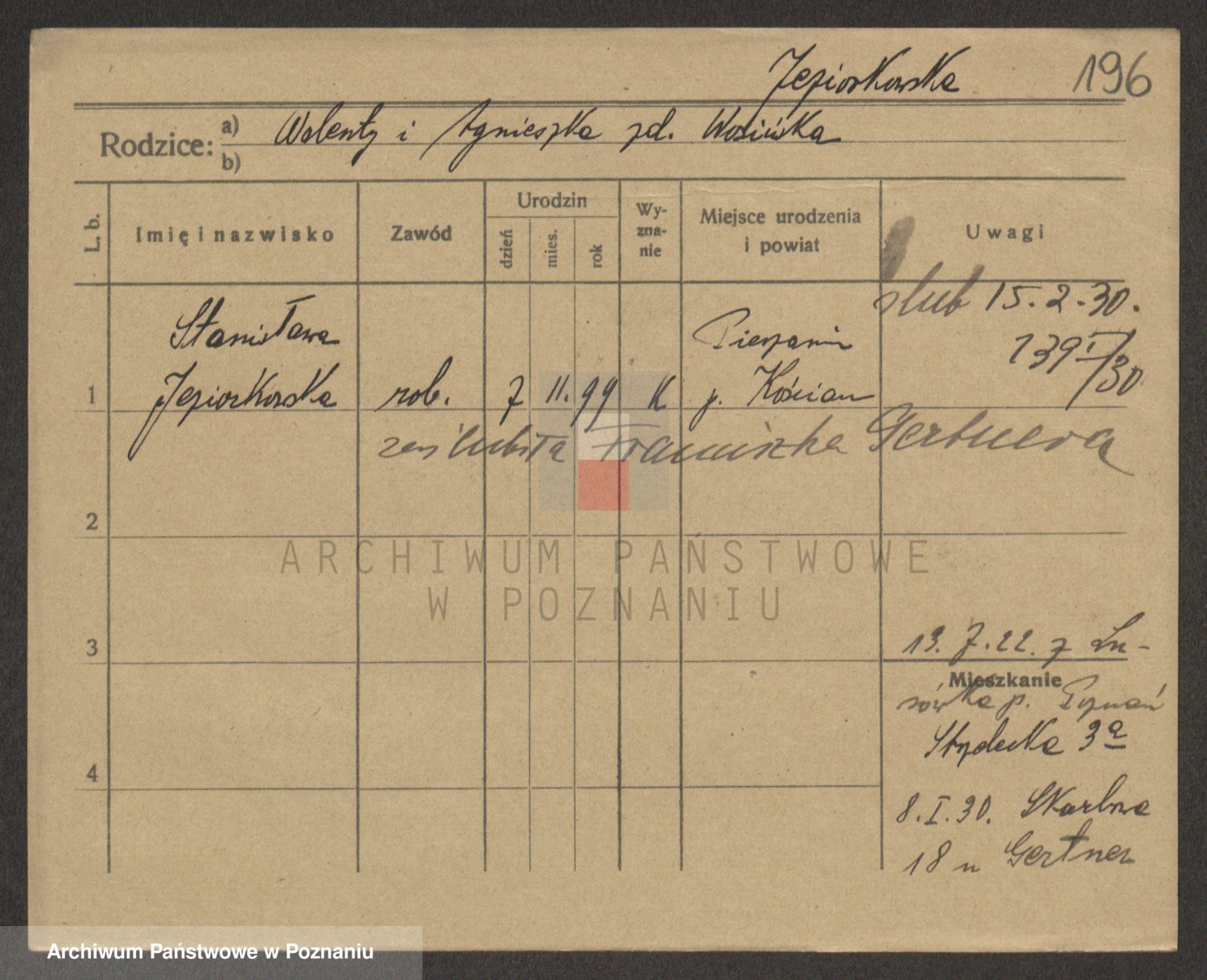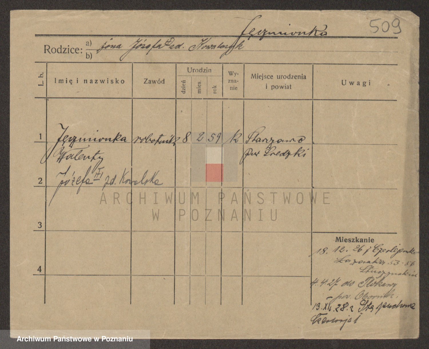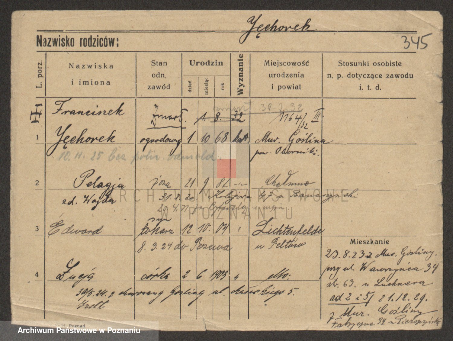 Podgląd karty osobowej dostępny jest po kliknięciu na nazwisko lub ikonkę karty. Można dokonywać powiększenia (ikony na górze) lub przechodzić między kolejnymi skanami (strzałki po bokach).