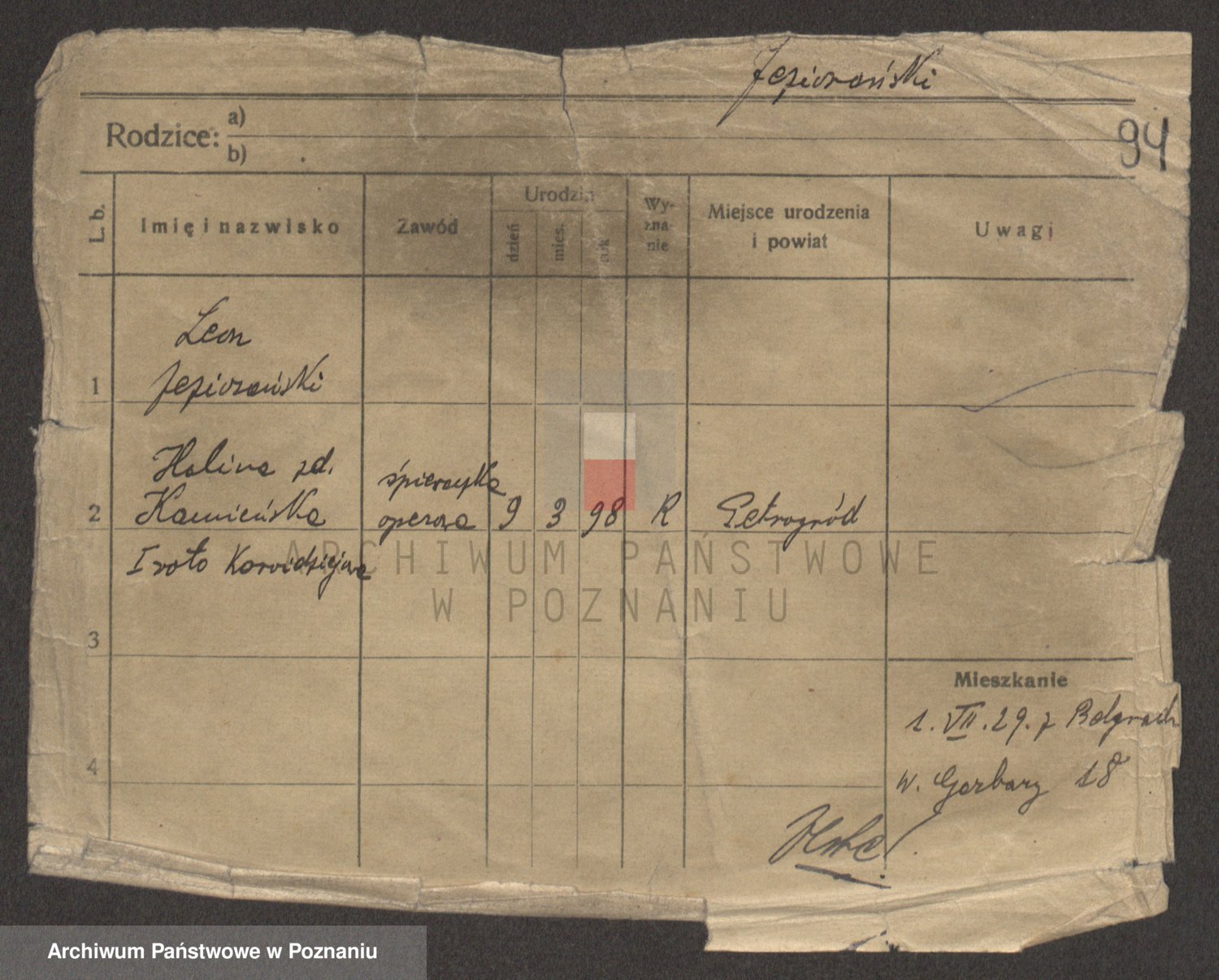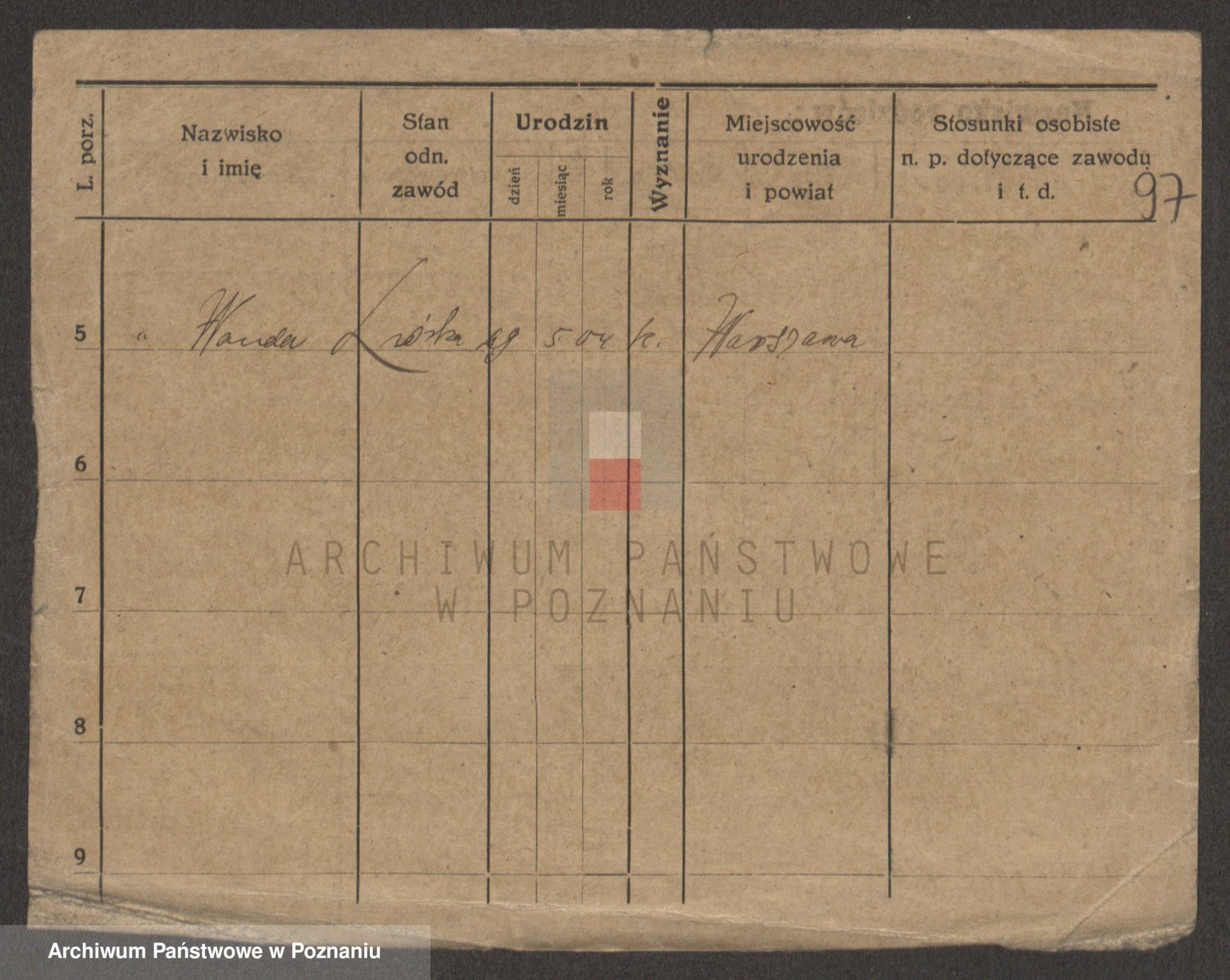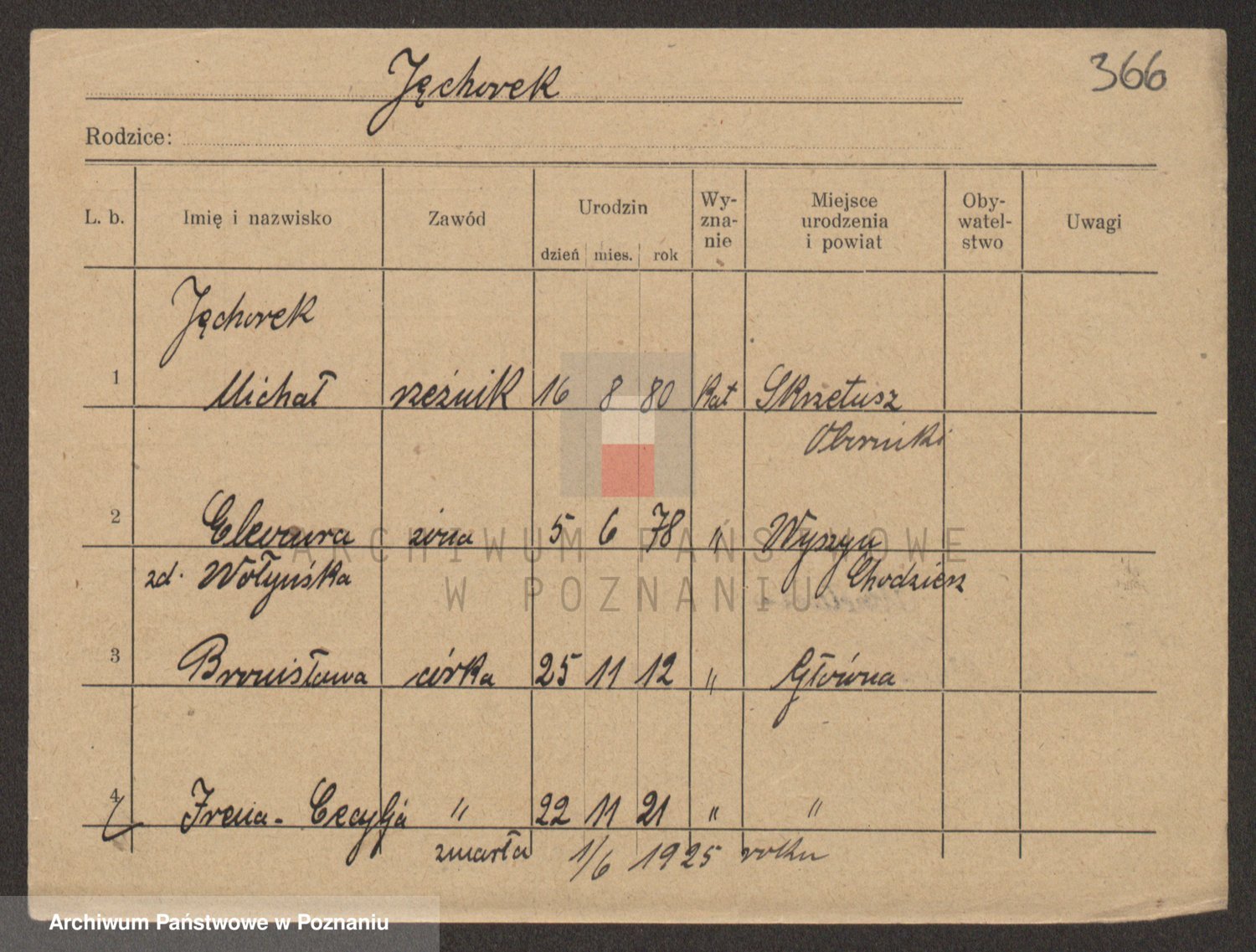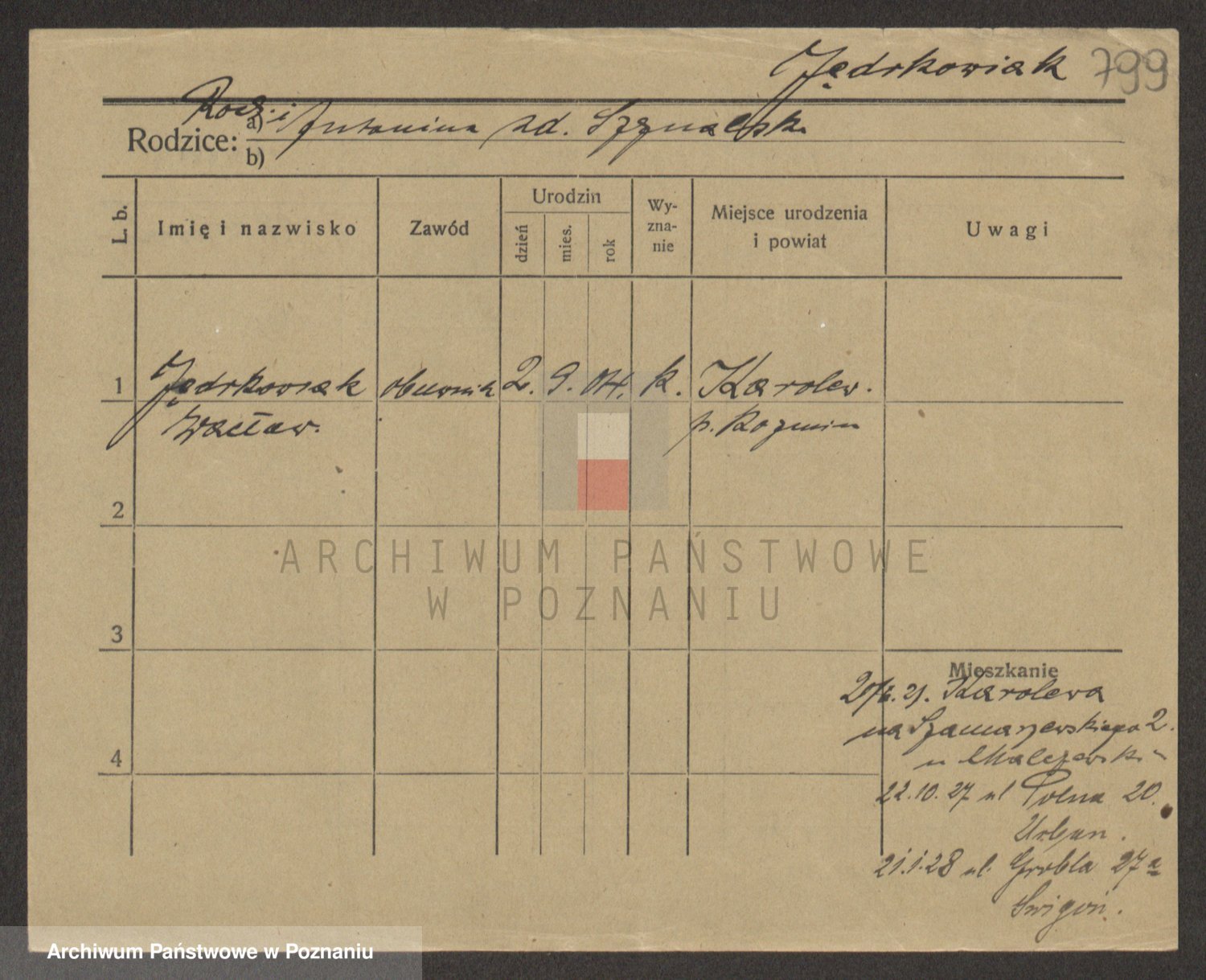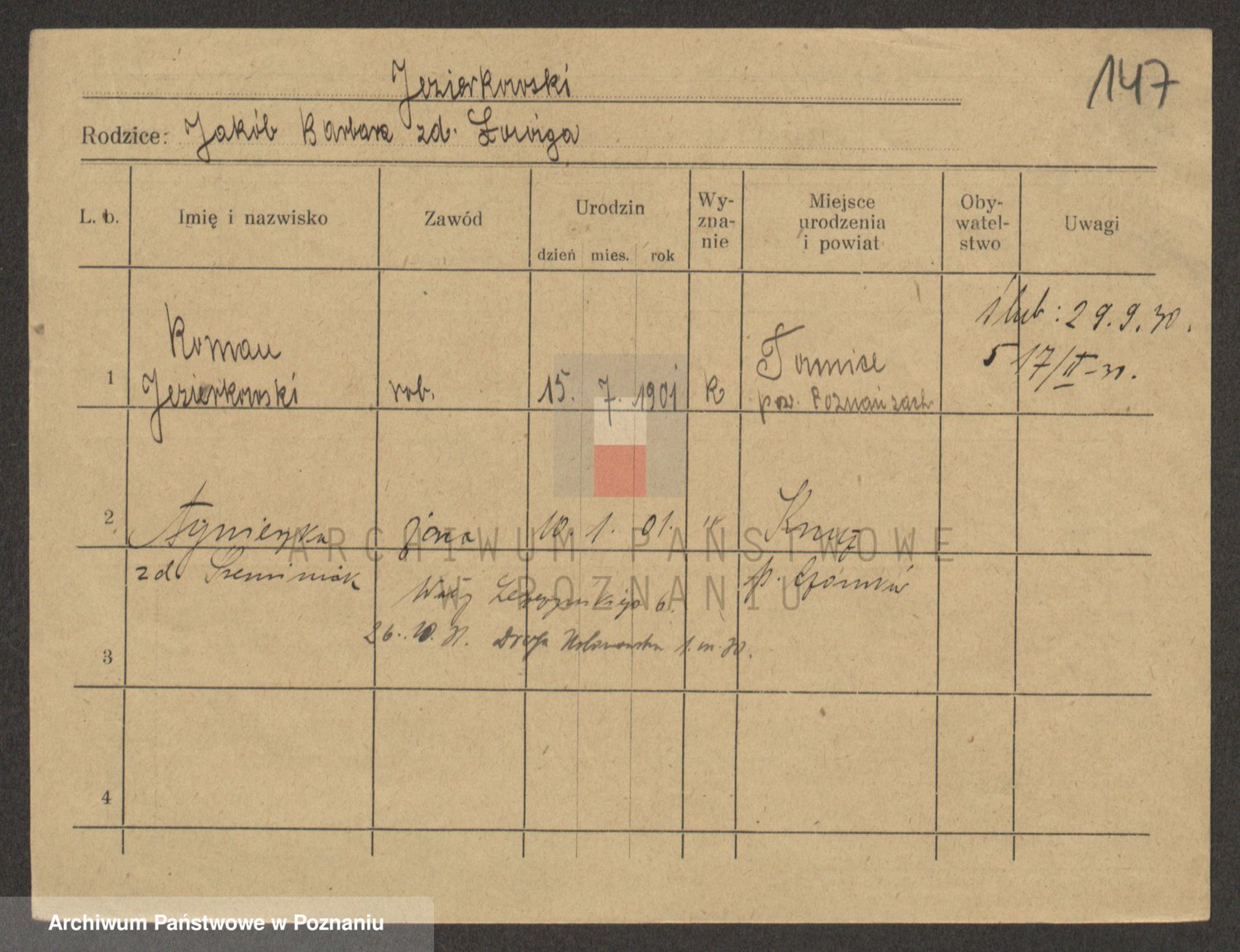 Podgląd karty osobowej dostępny jest po kliknięciu na nazwisko lub ikonkę karty. Można dokonywać powiększenia (ikony na górze) lub przechodzić między kolejnymi skanami (strzałki po bokach).