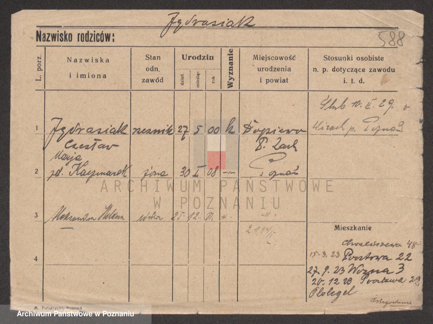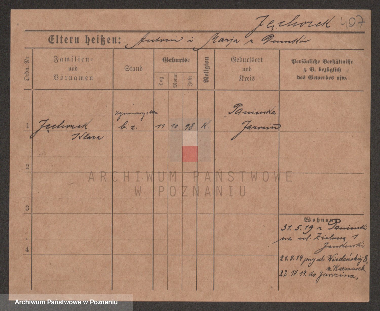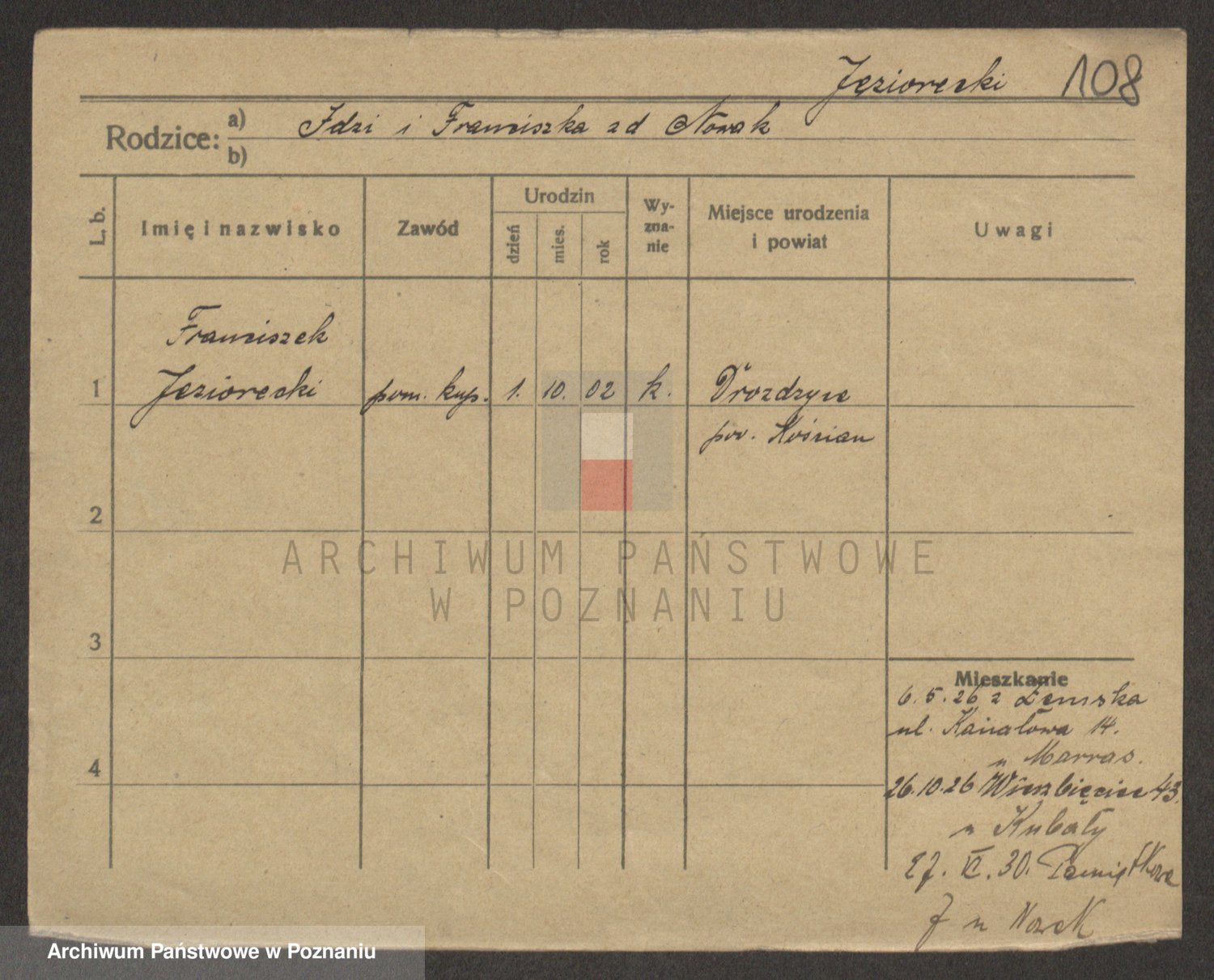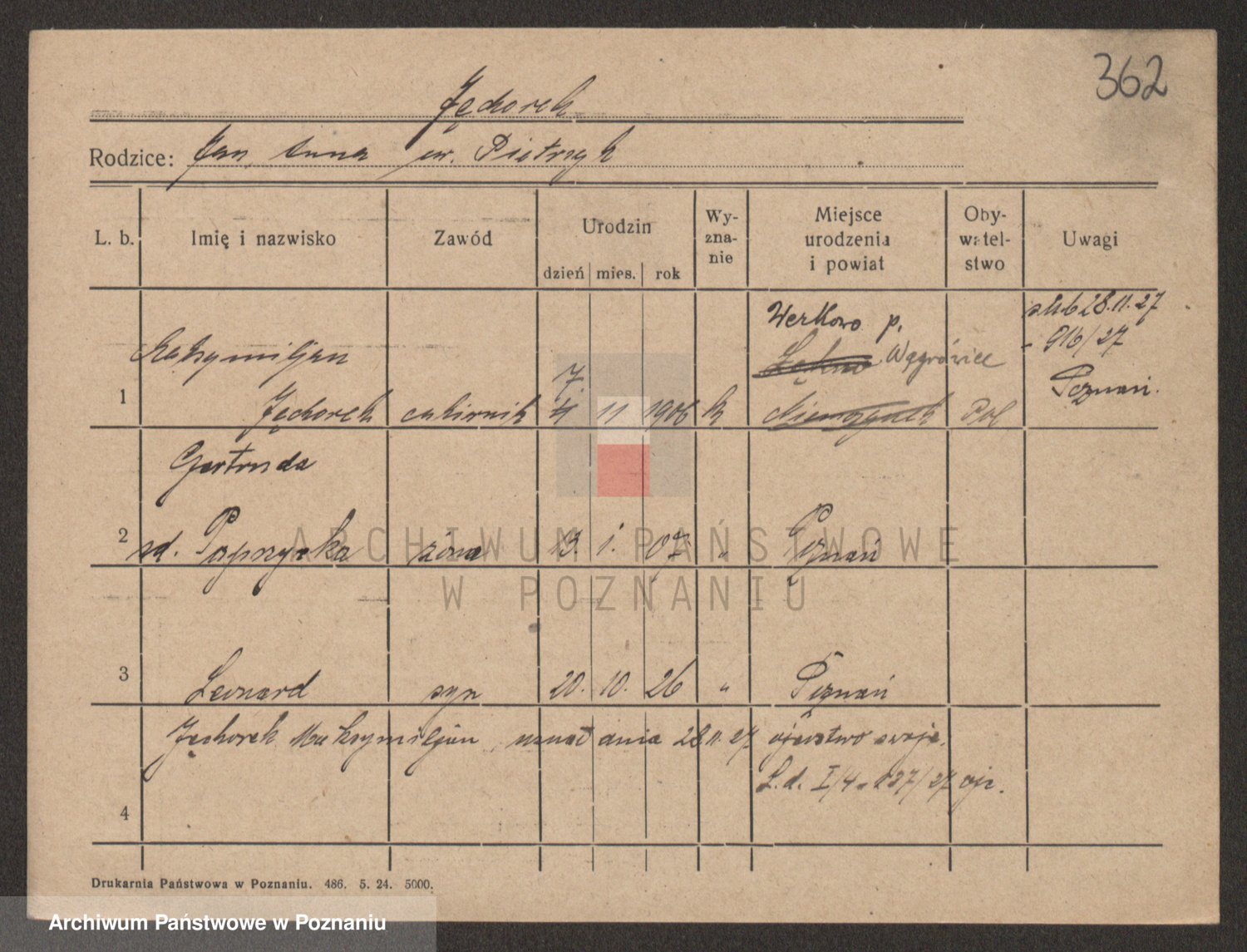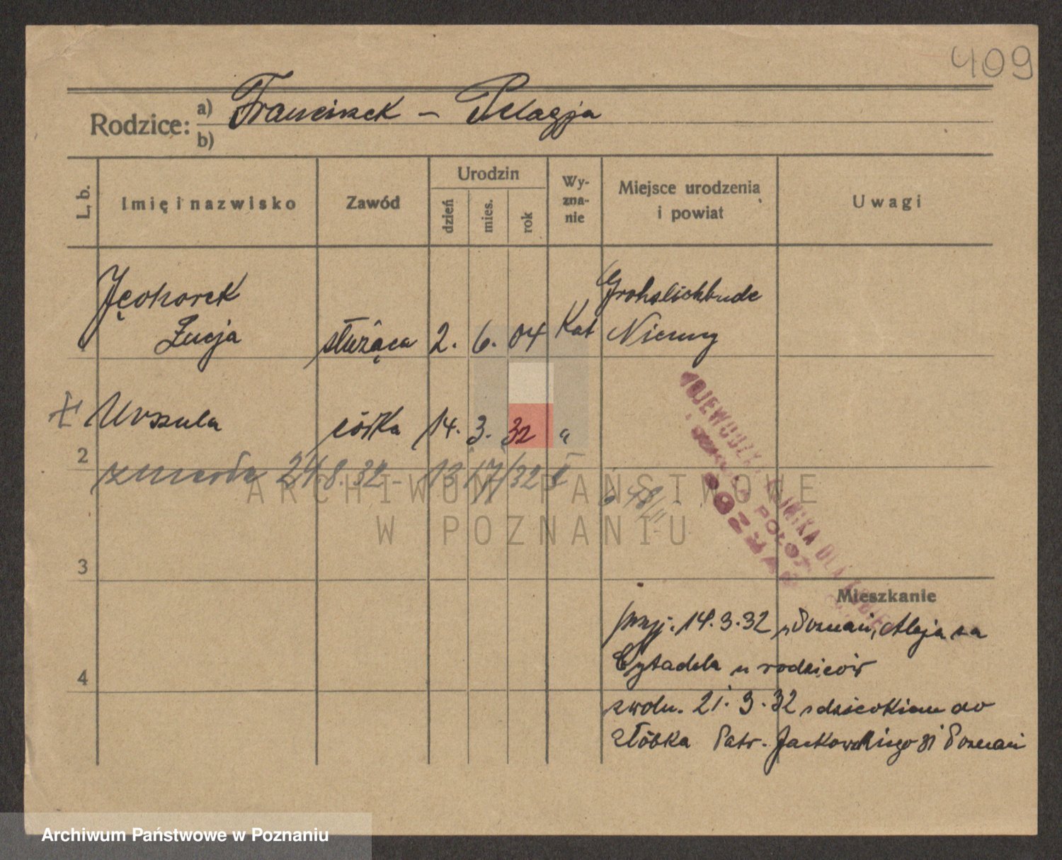 Podgląd karty osobowej dostępny jest po kliknięciu na nazwisko lub ikonkę karty. Można dokonywać powiększenia (ikony na górze) lub przechodzić między kolejnymi skanami (strzałki po bokach).