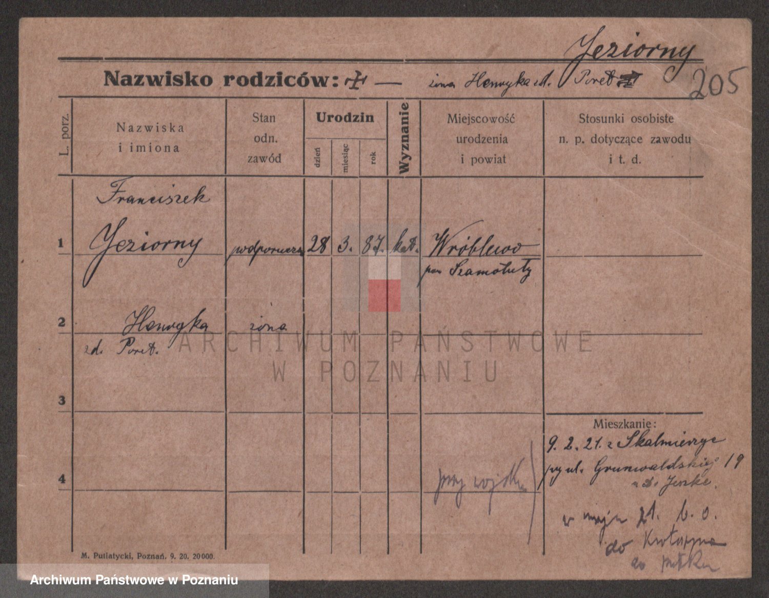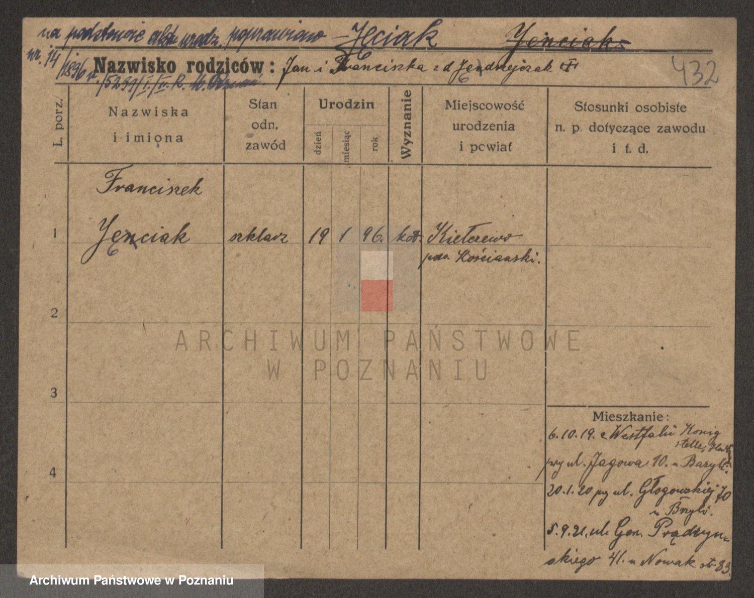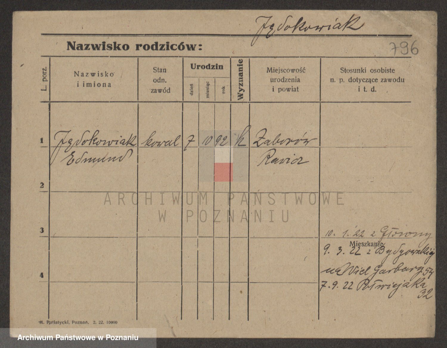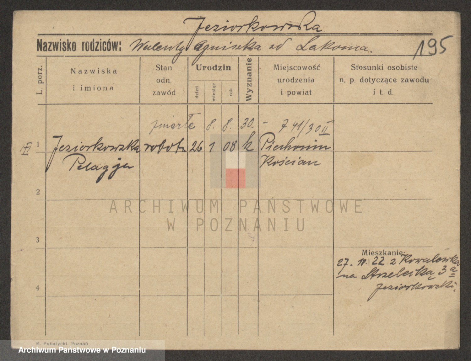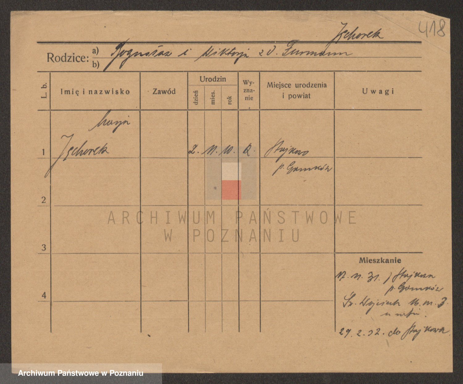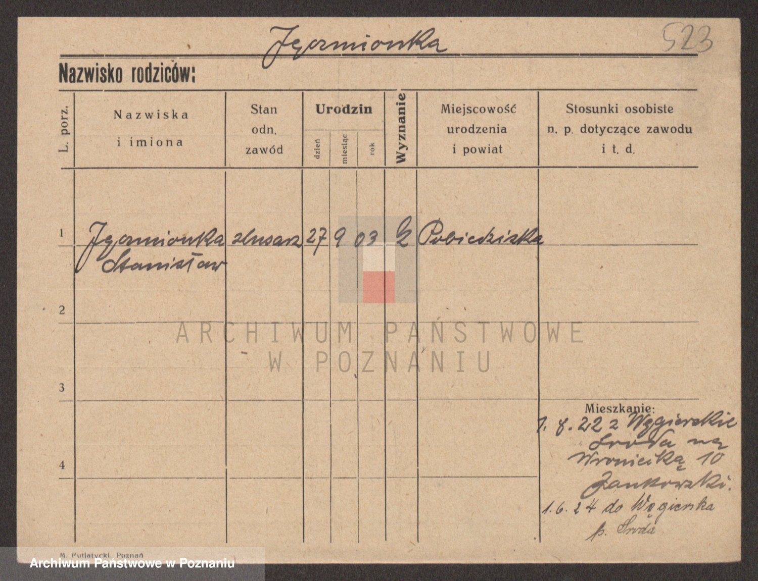 Podgląd karty osobowej dostępny jest po kliknięciu na nazwisko lub ikonkę karty. Można dokonywać powiększenia (ikony na górze) lub przechodzić między kolejnymi skanami (strzałki po bokach).