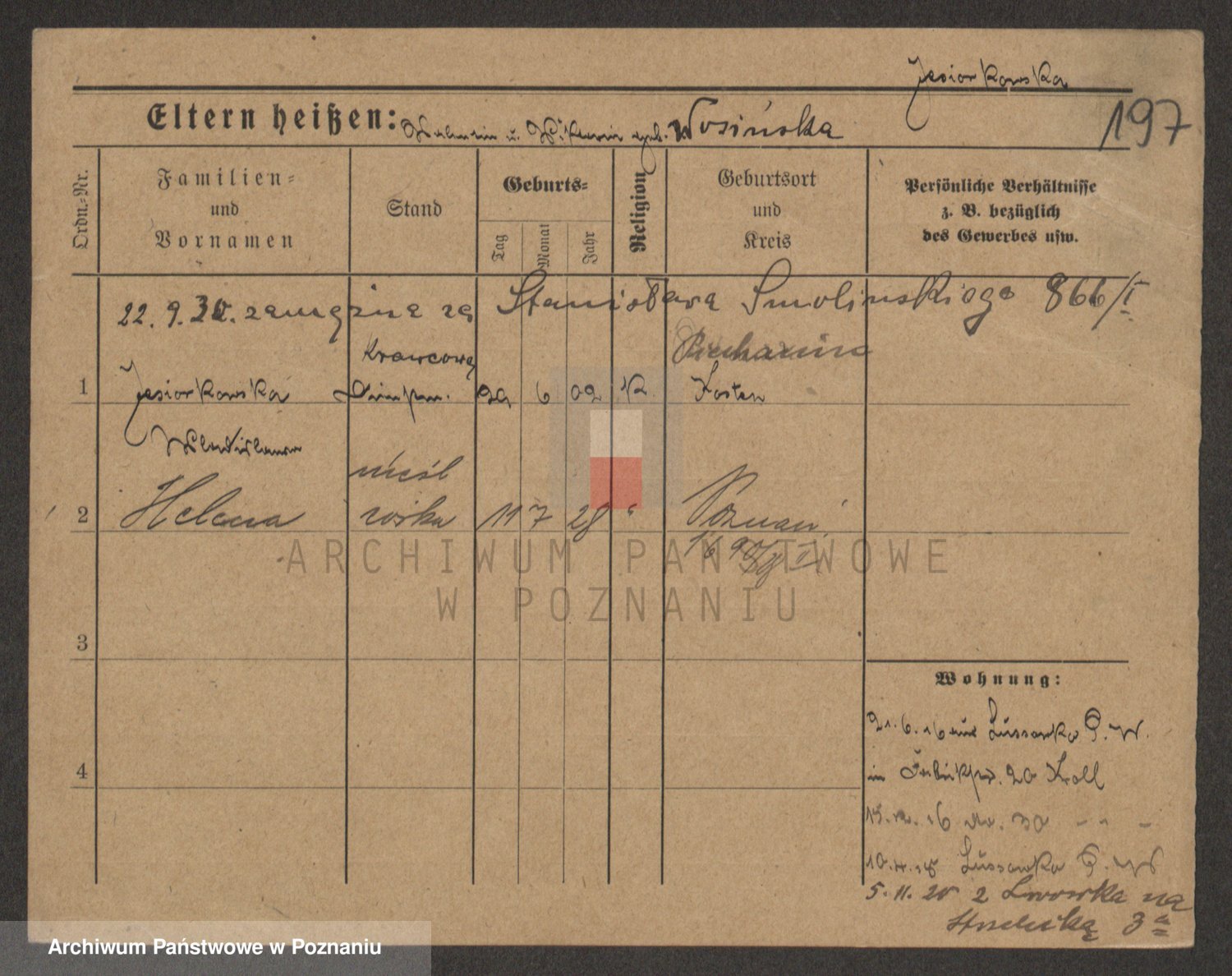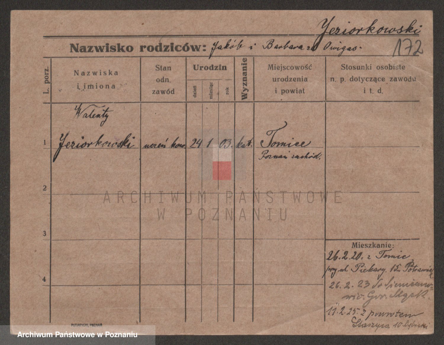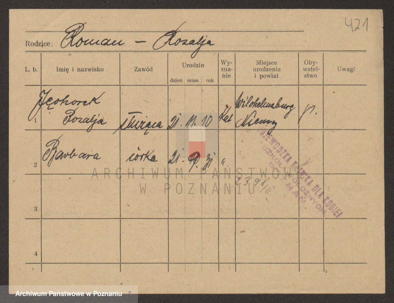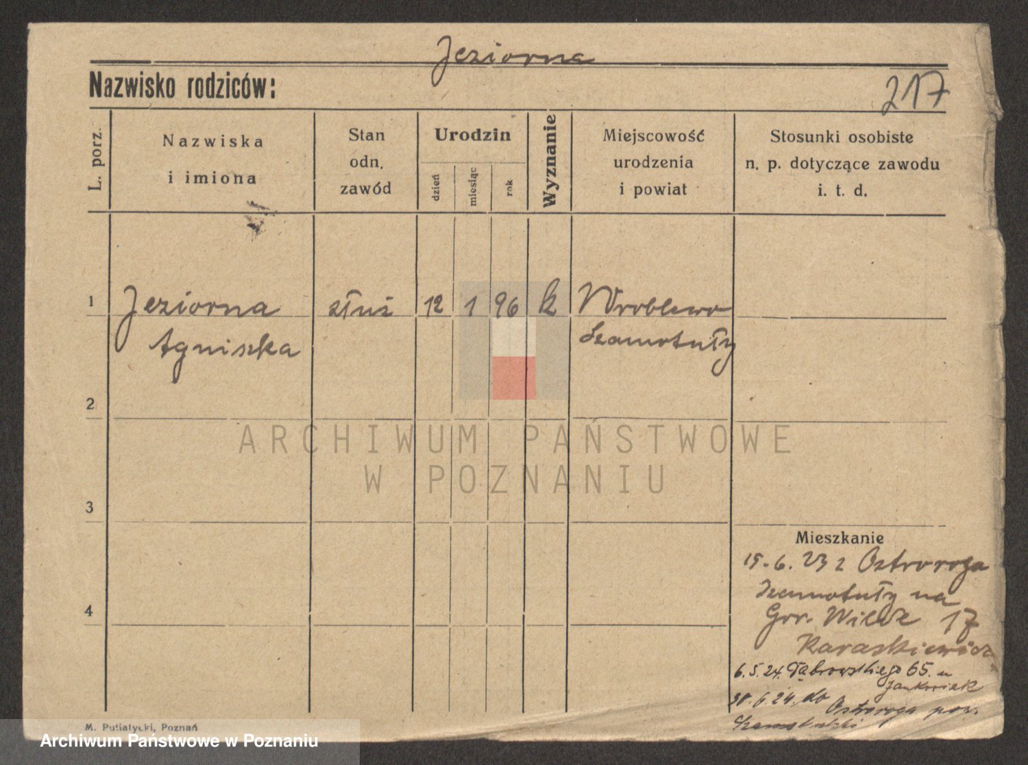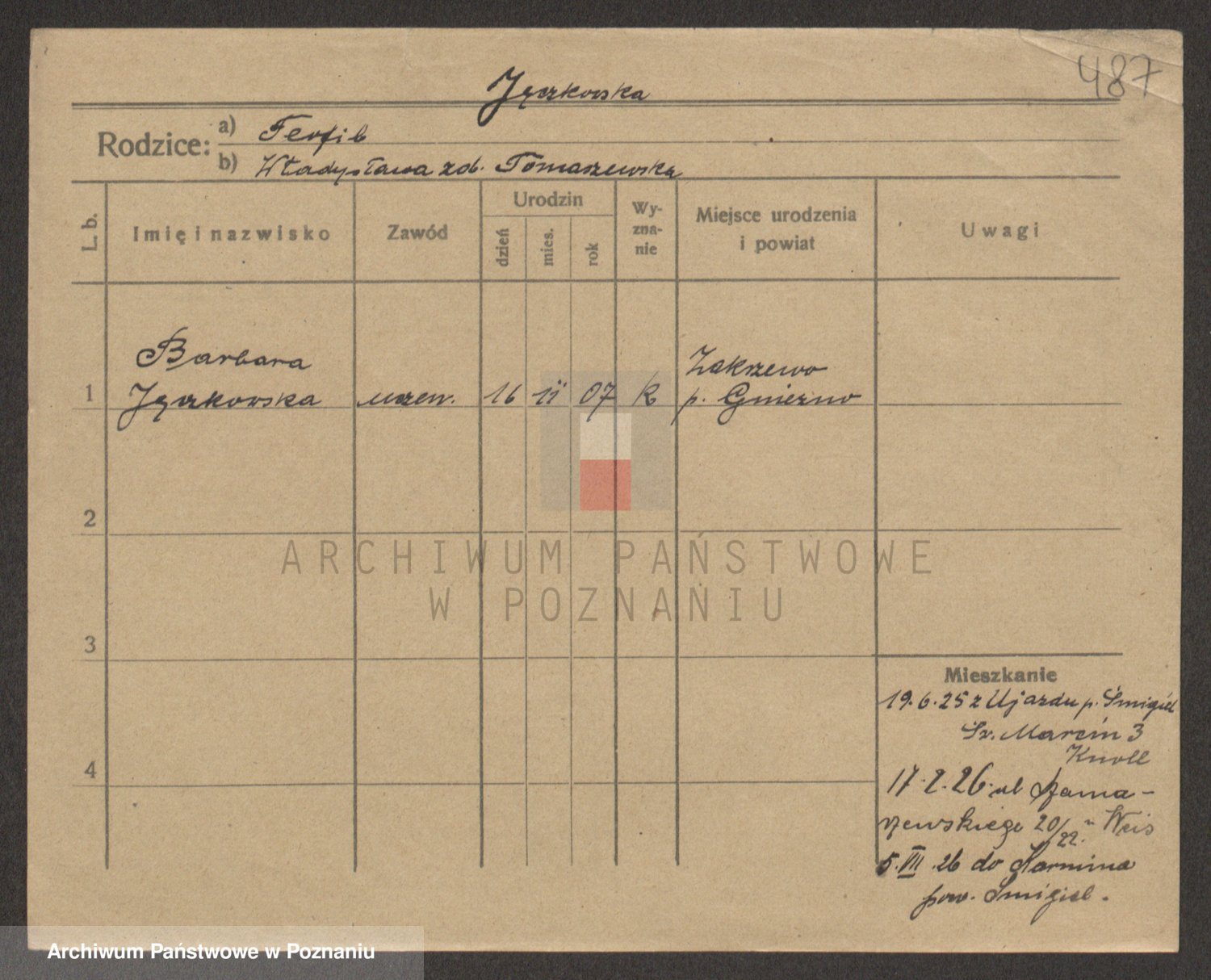 Podgląd karty osobowej dostępny jest po kliknięciu na nazwisko lub ikonkę karty. Można dokonywać powiększenia (ikony na górze) lub przechodzić między kolejnymi skanami (strzałki po bokach).