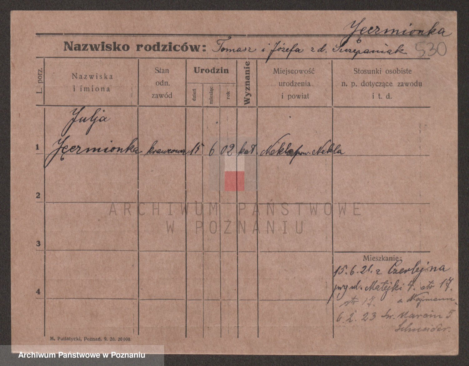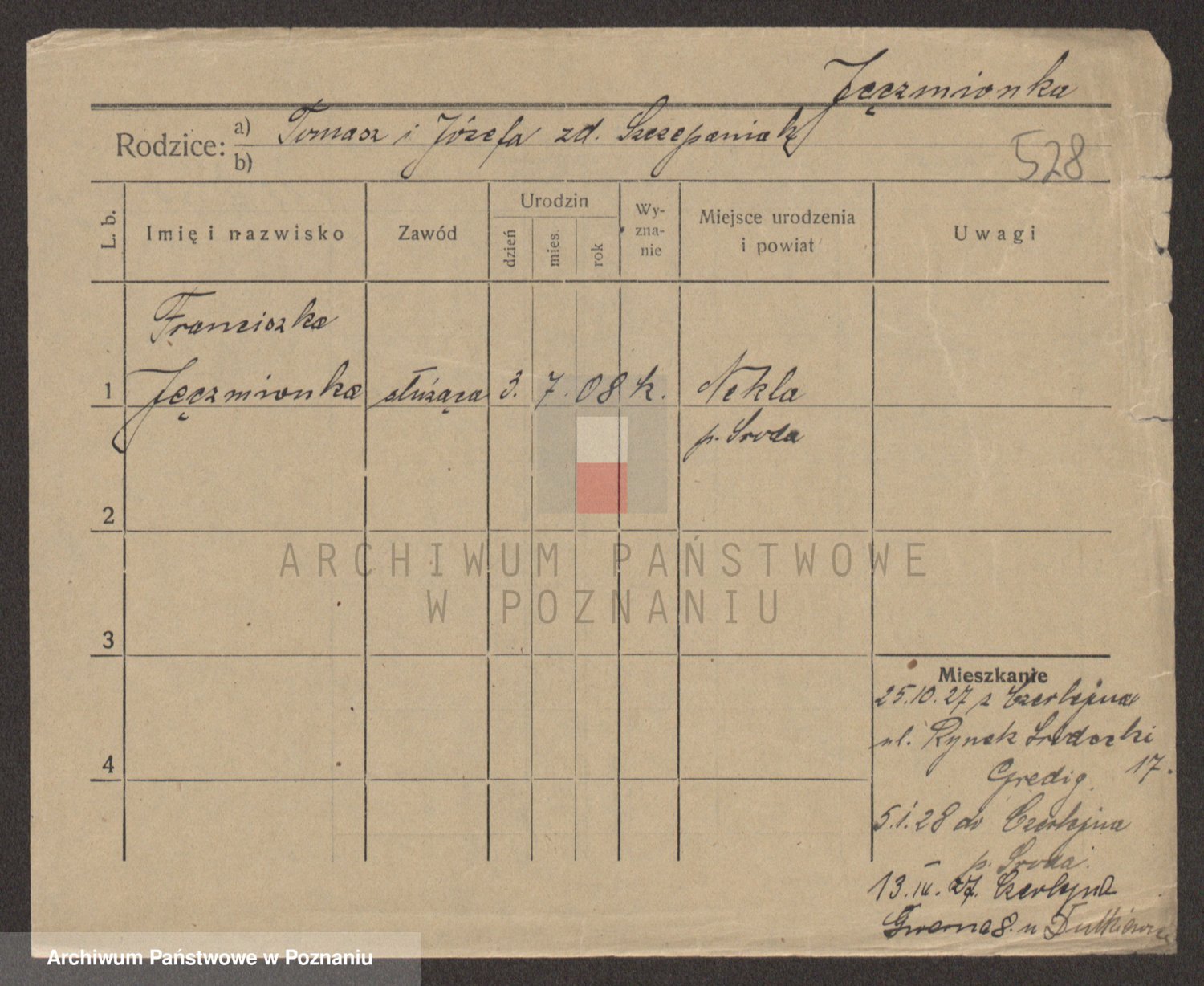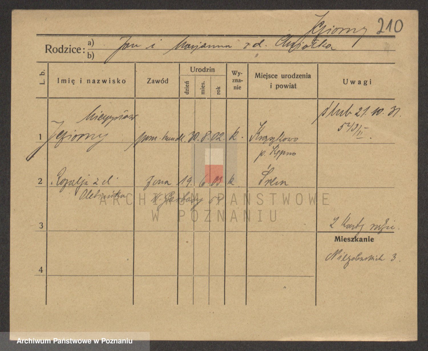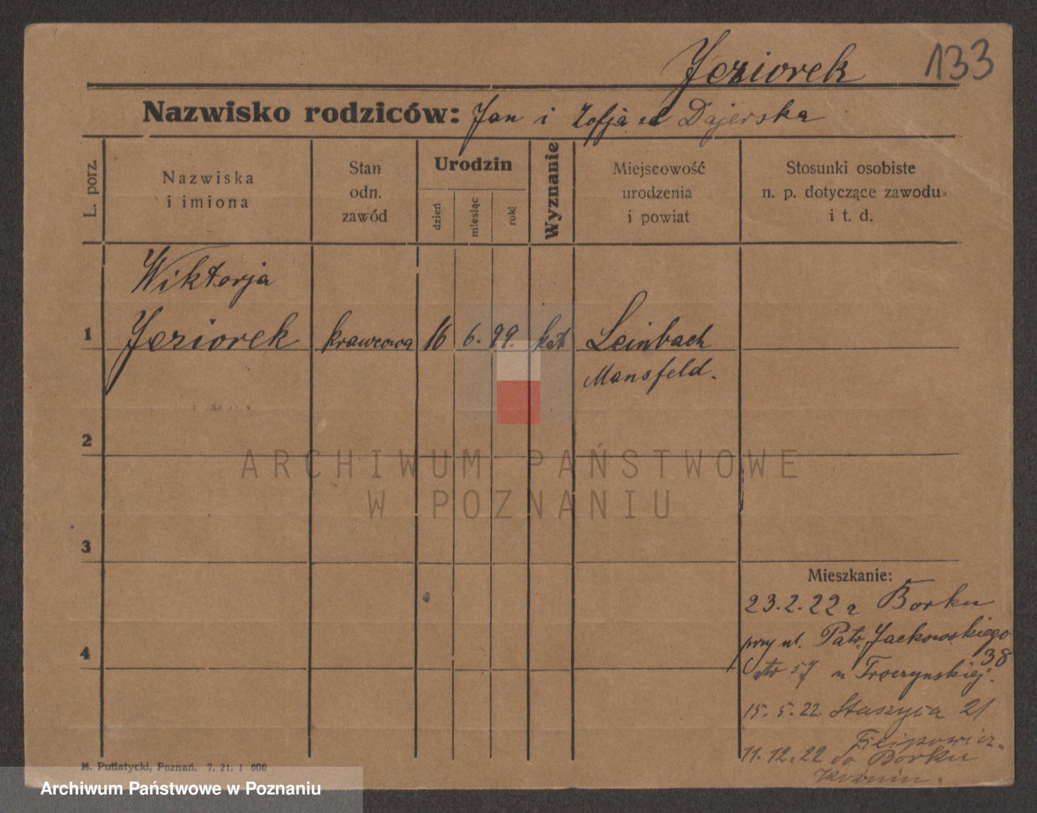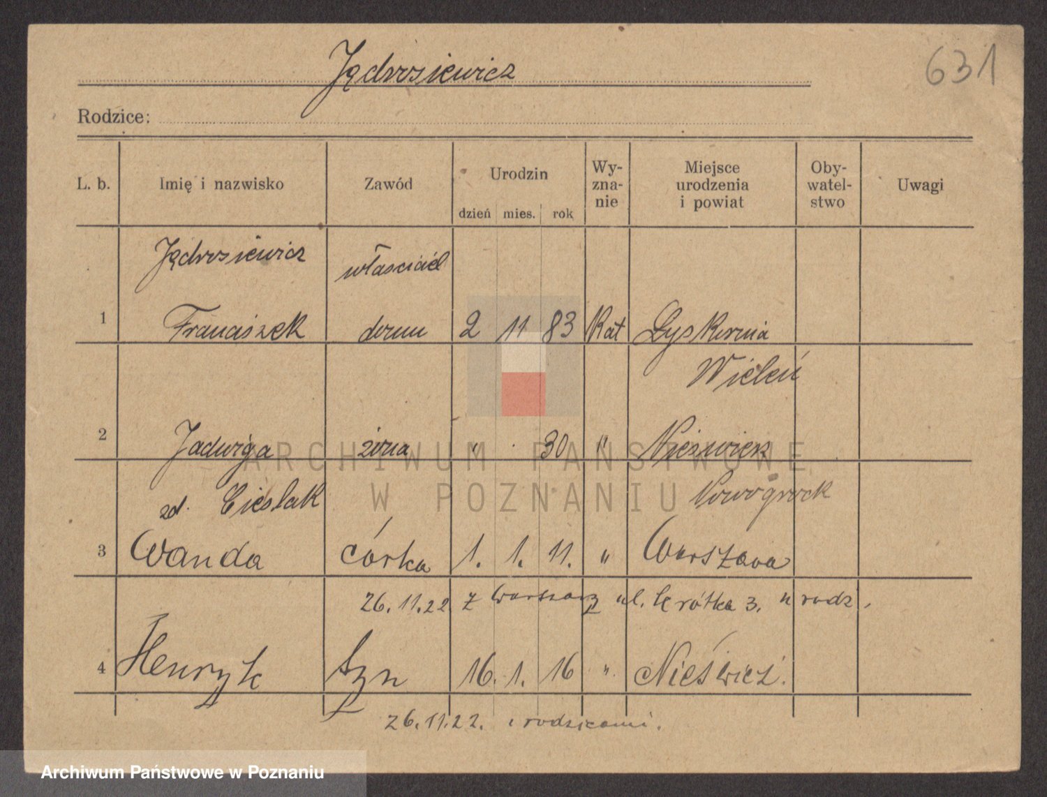 Podgląd karty osobowej dostępny jest po kliknięciu na nazwisko lub ikonkę karty. Można dokonywać powiększenia (ikony na górze) lub przechodzić między kolejnymi skanami (strzałki po bokach).