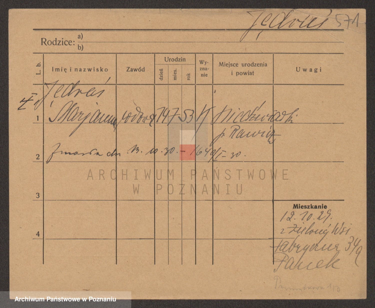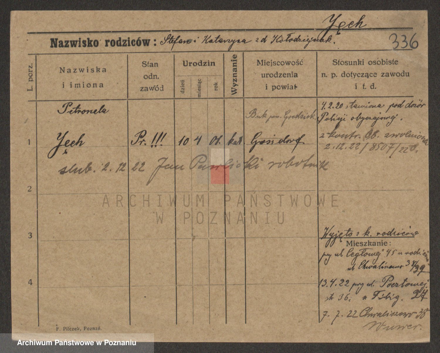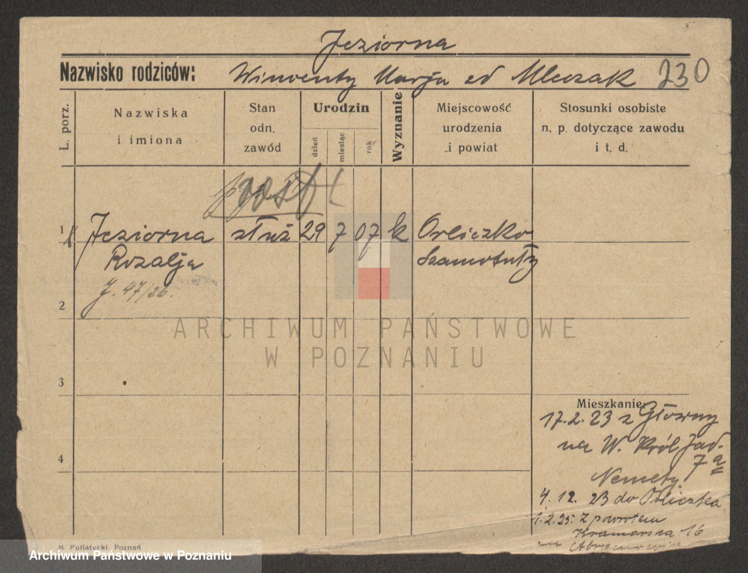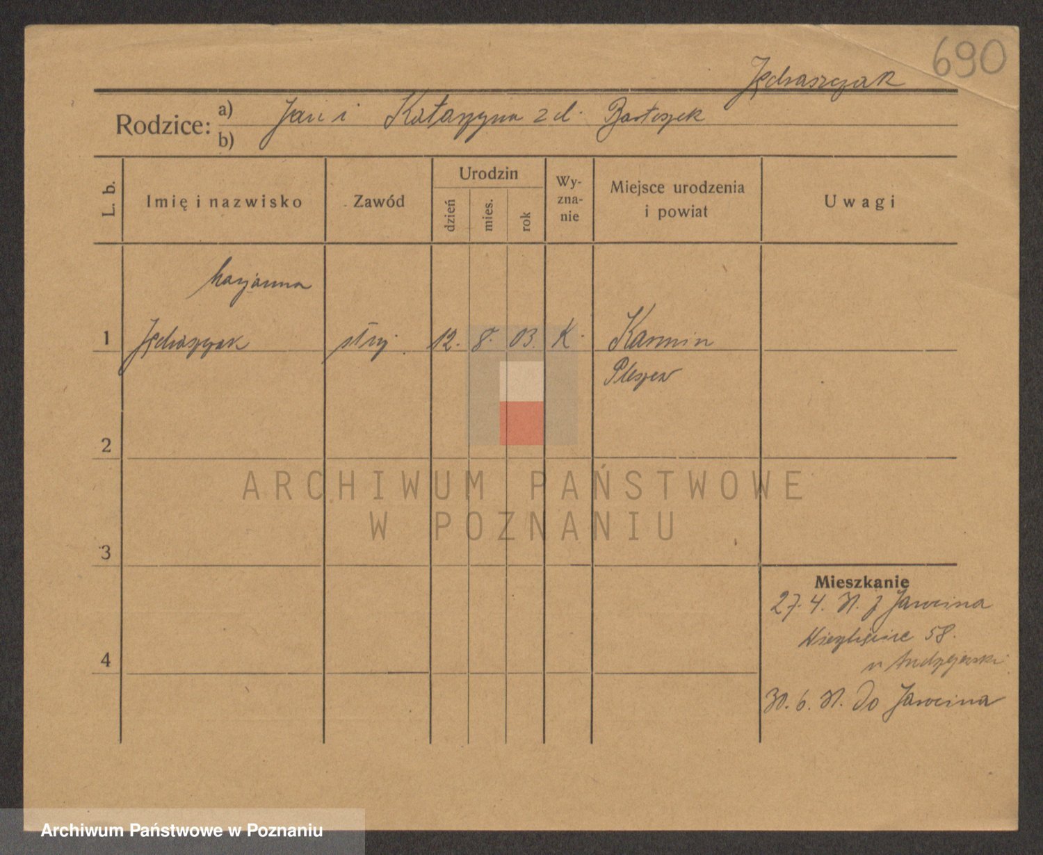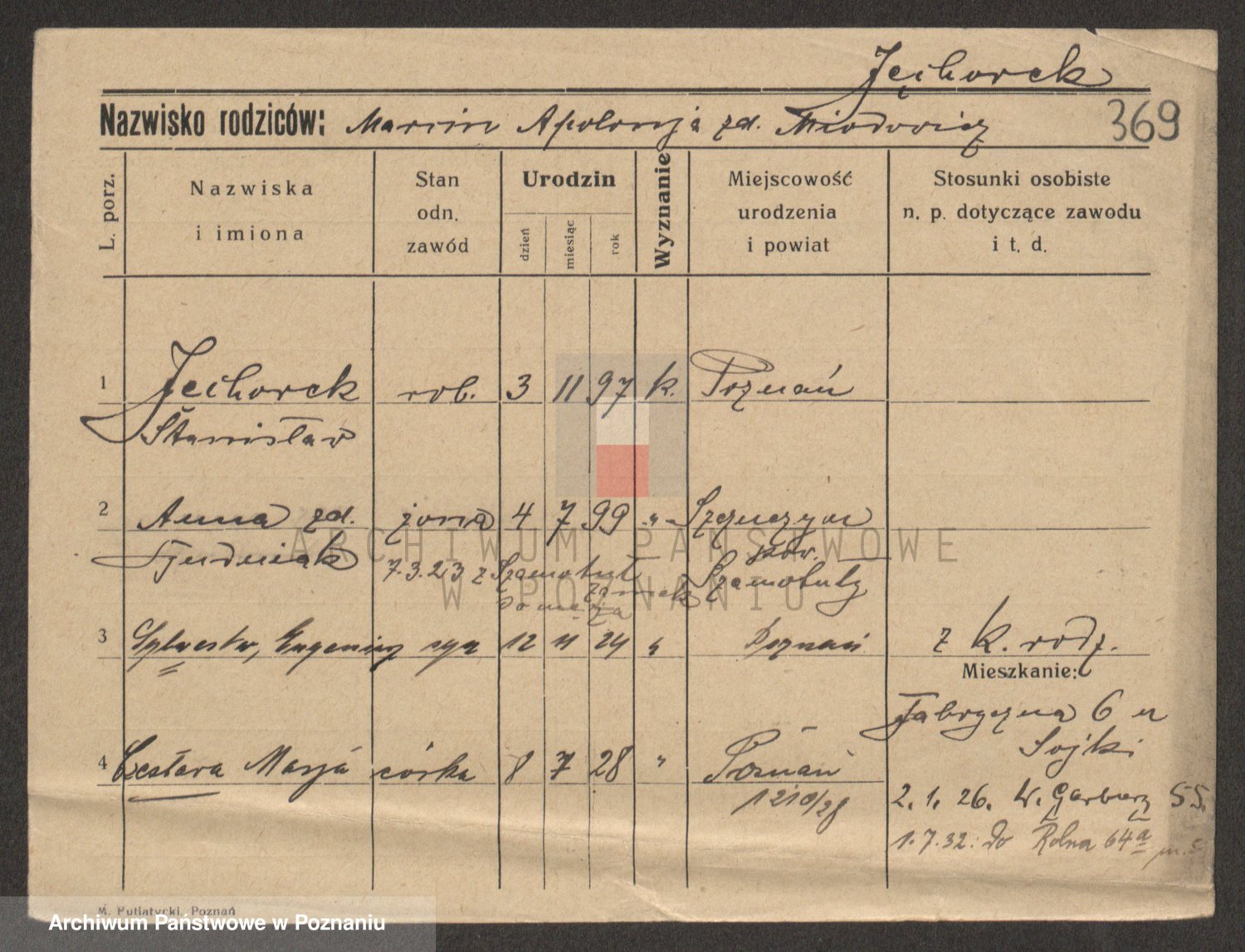 Podgląd karty osobowej dostępny jest po kliknięciu na nazwisko lub ikonkę karty. Można dokonywać powiększenia (ikony na górze) lub przechodzić między kolejnymi skanami (strzałki po bokach).