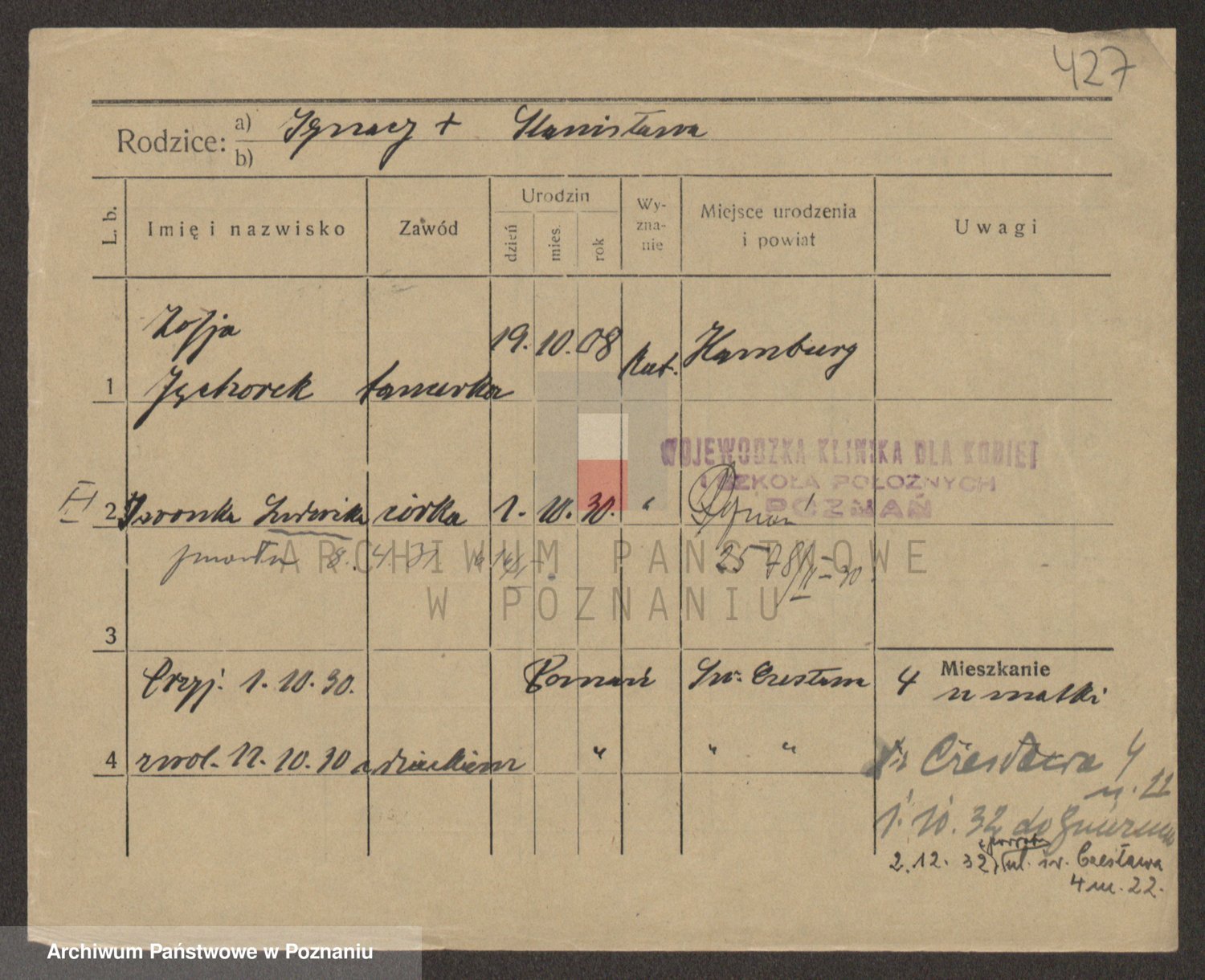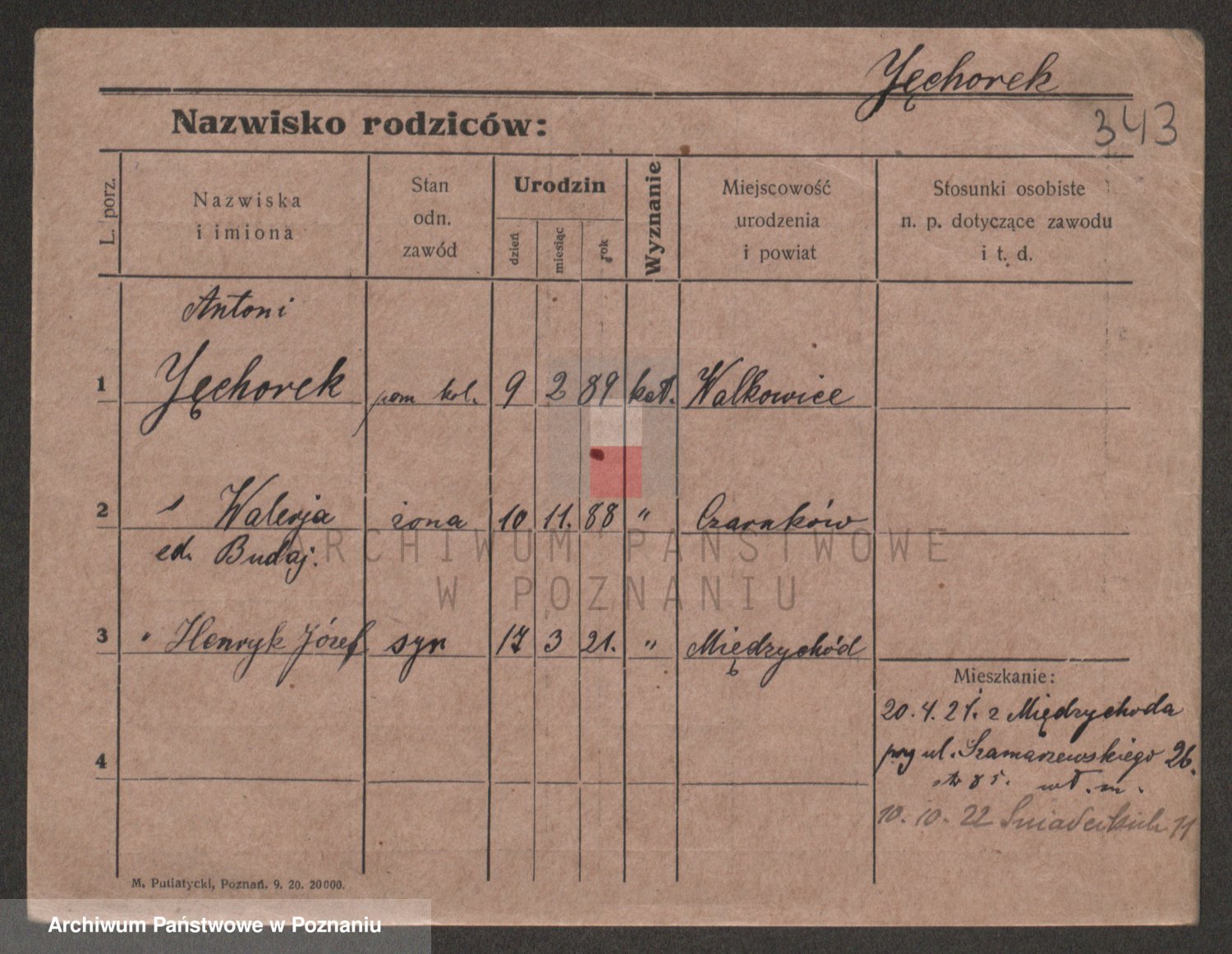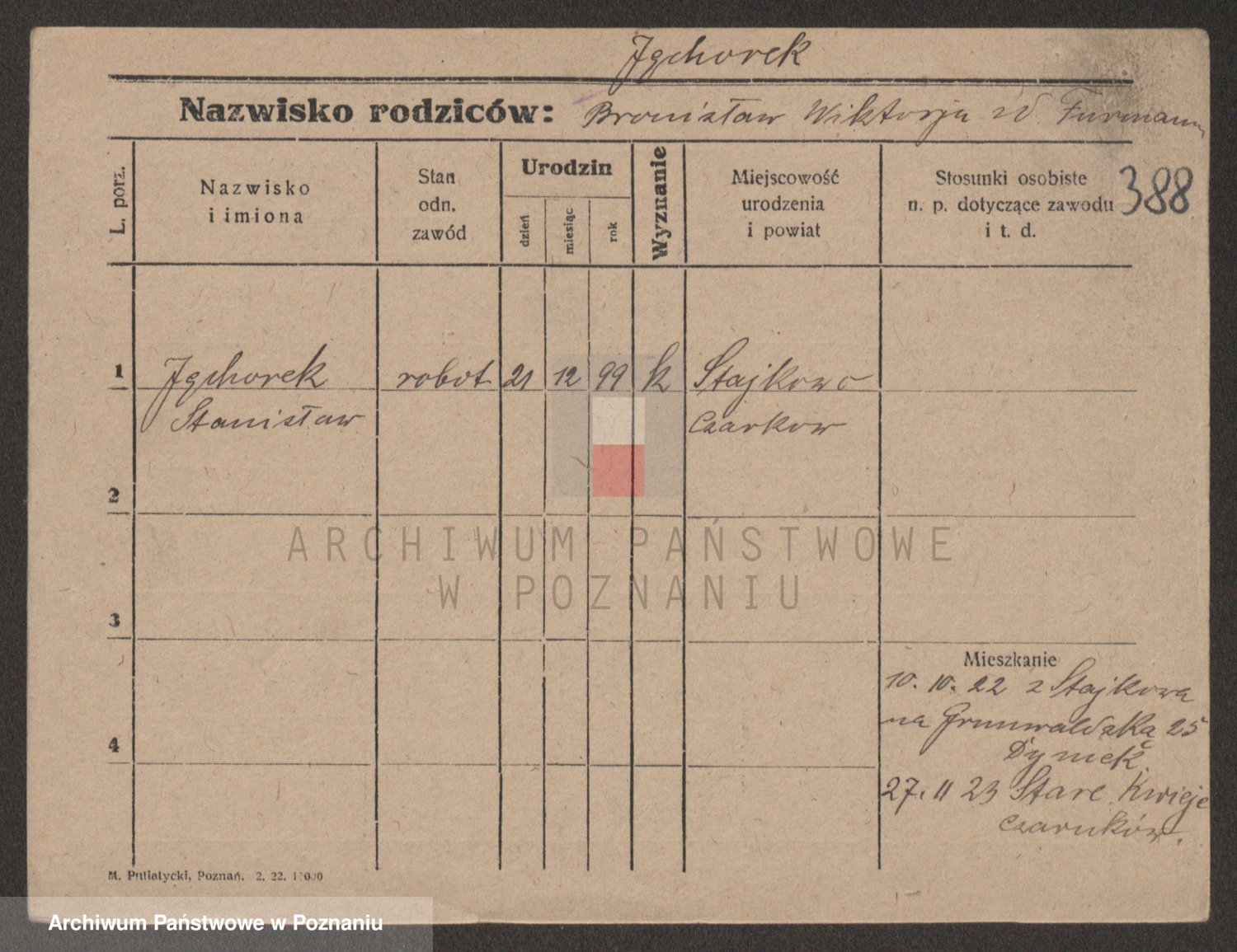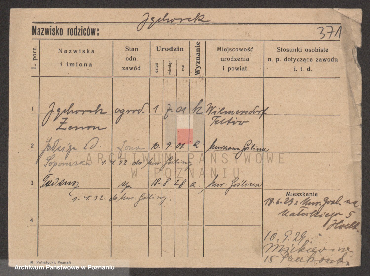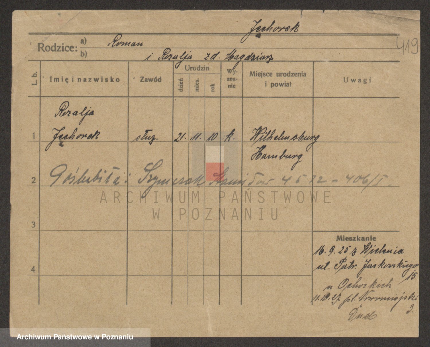 Podgląd karty osobowej dostępny jest po kliknięciu na nazwisko lub ikonkę karty. Można dokonywać powiększenia (ikony na górze) lub przechodzić między kolejnymi skanami (strzałki po bokach).