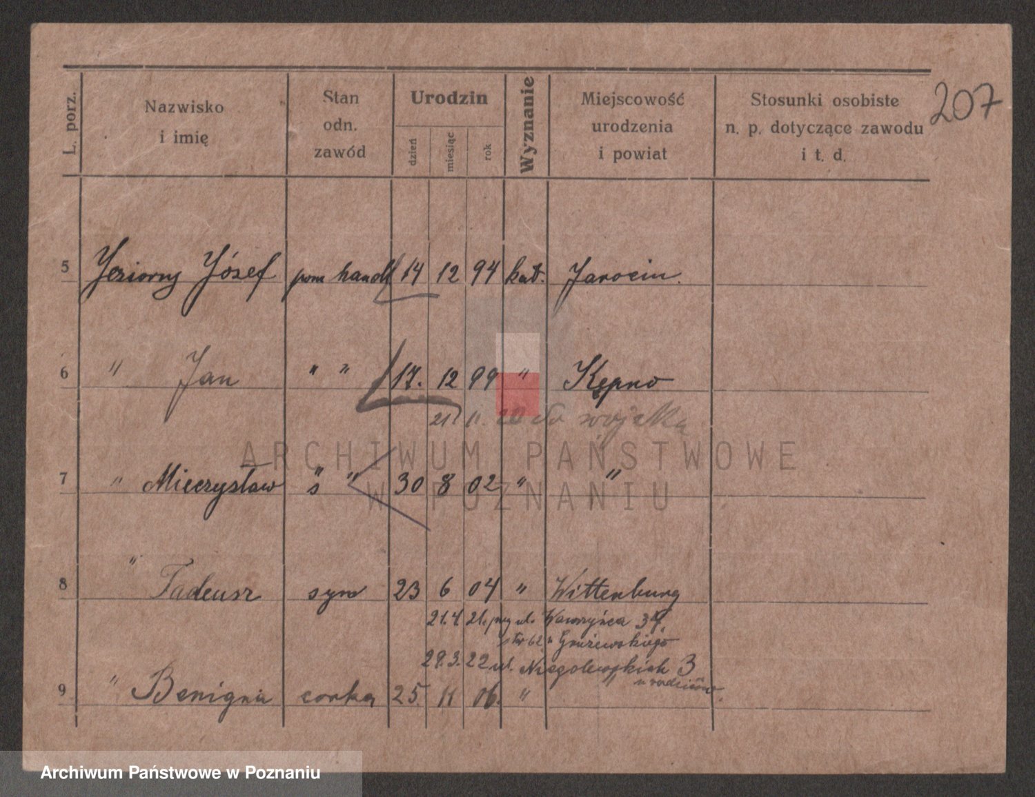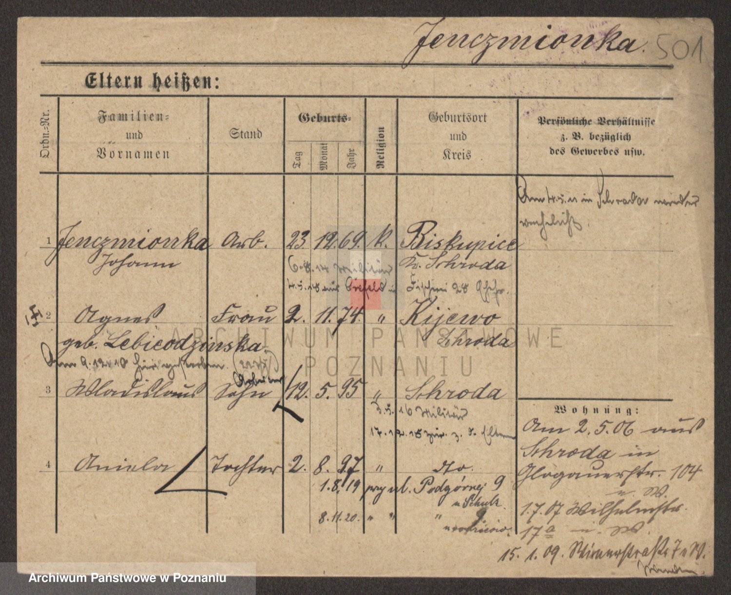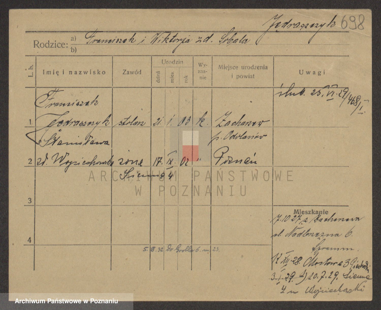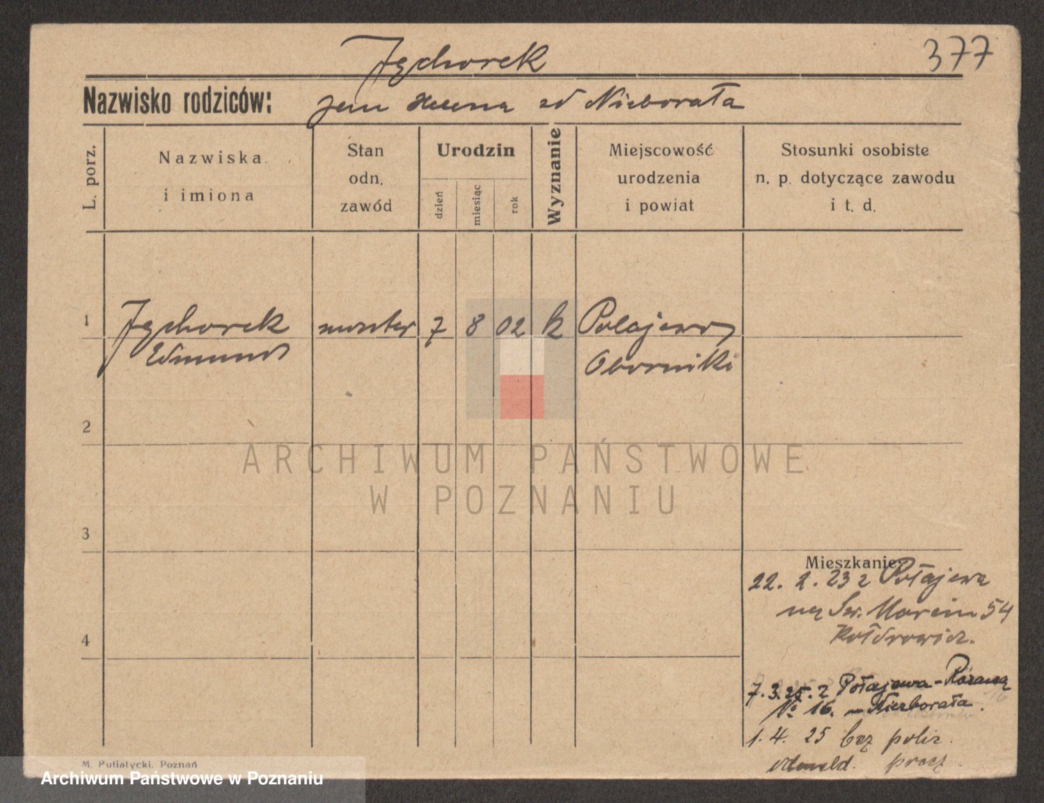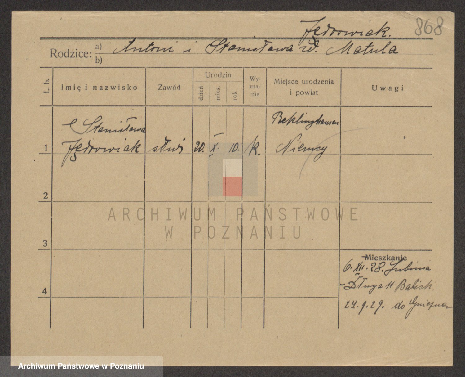 Podgląd karty osobowej dostępny jest po kliknięciu na nazwisko lub ikonkę karty. Można dokonywać powiększenia (ikony na górze) lub przechodzić między kolejnymi skanami (strzałki po bokach).