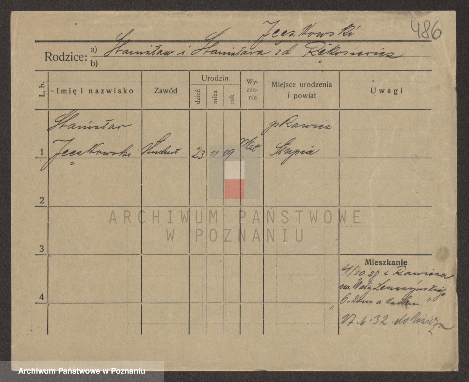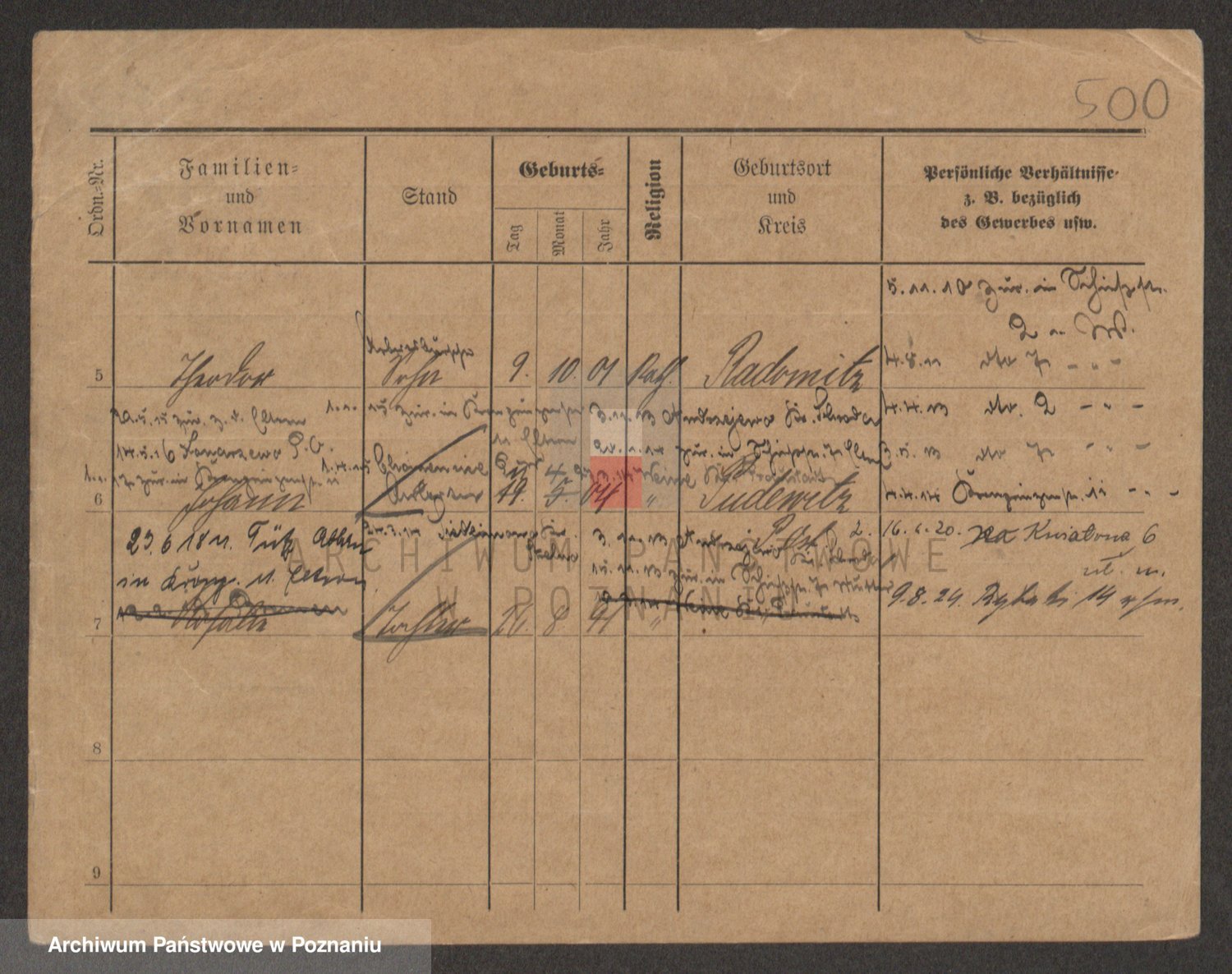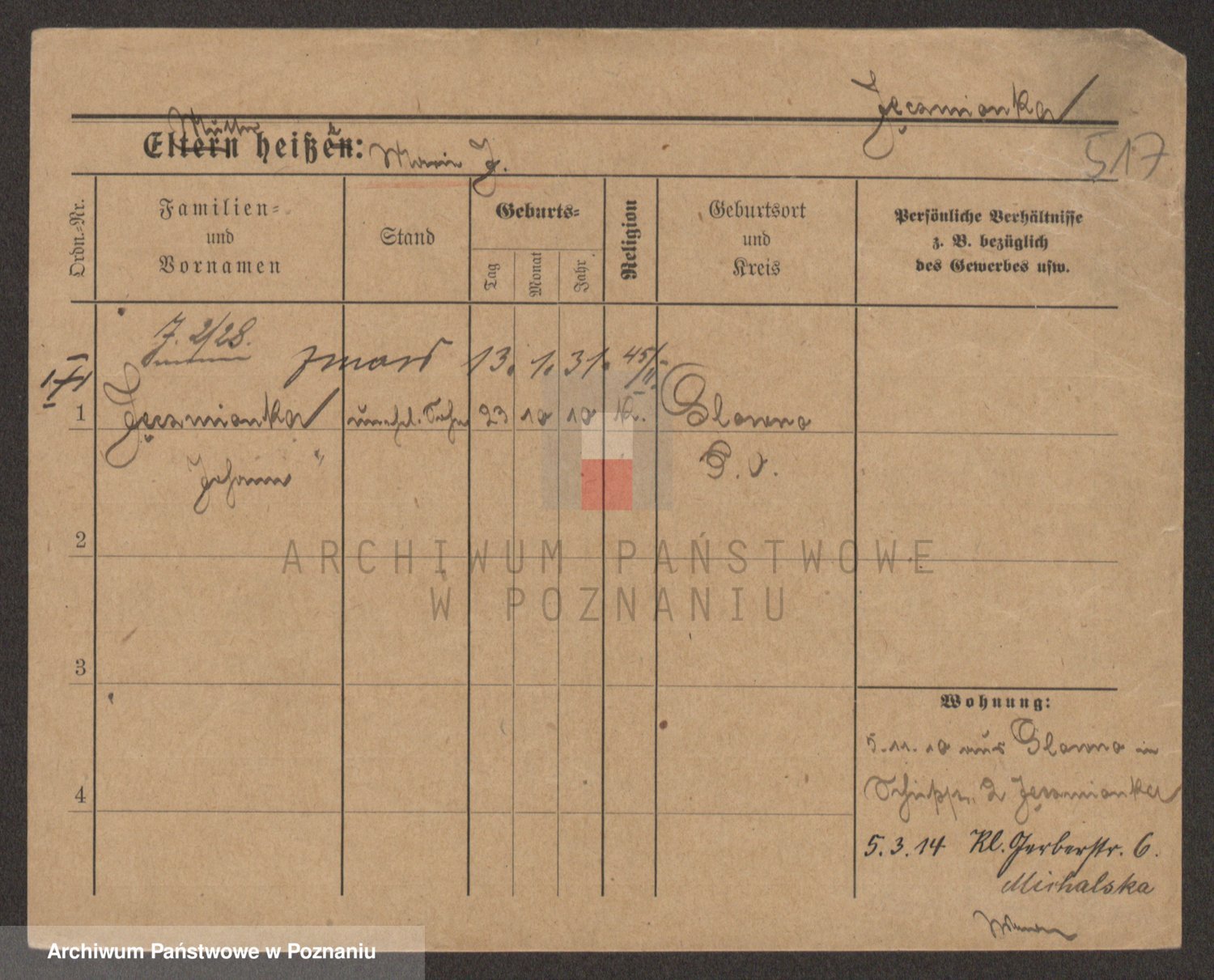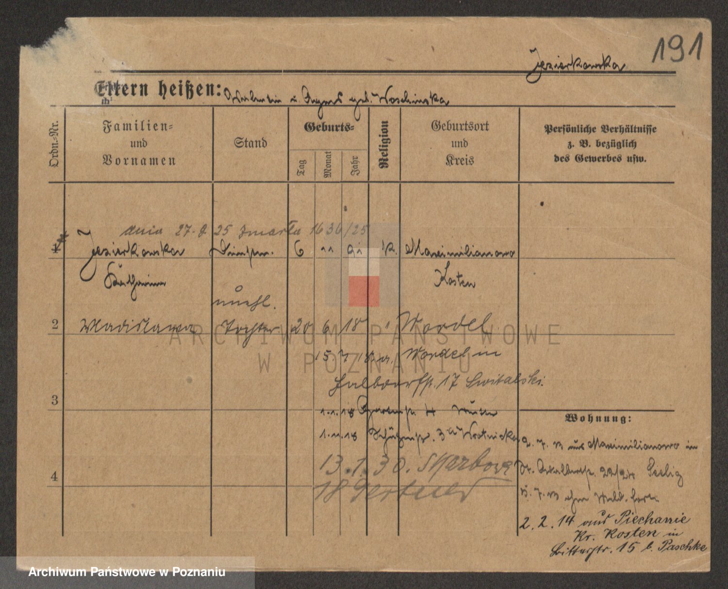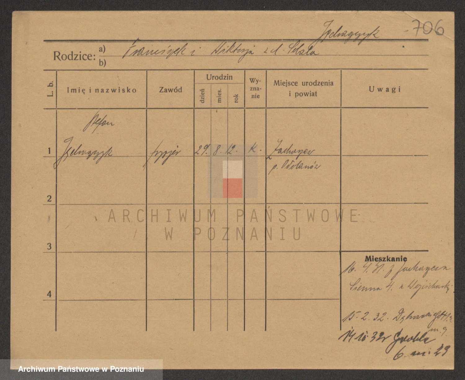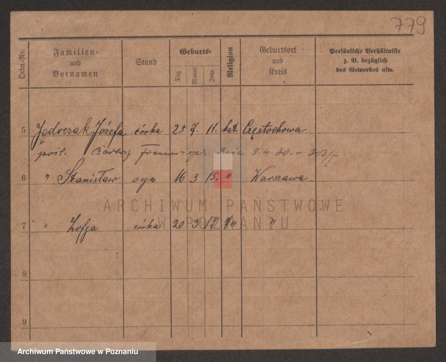 Podgląd karty osobowej dostępny jest po kliknięciu na nazwisko lub ikonkę karty. Można dokonywać powiększenia (ikony na górze) lub przechodzić między kolejnymi skanami (strzałki po bokach).