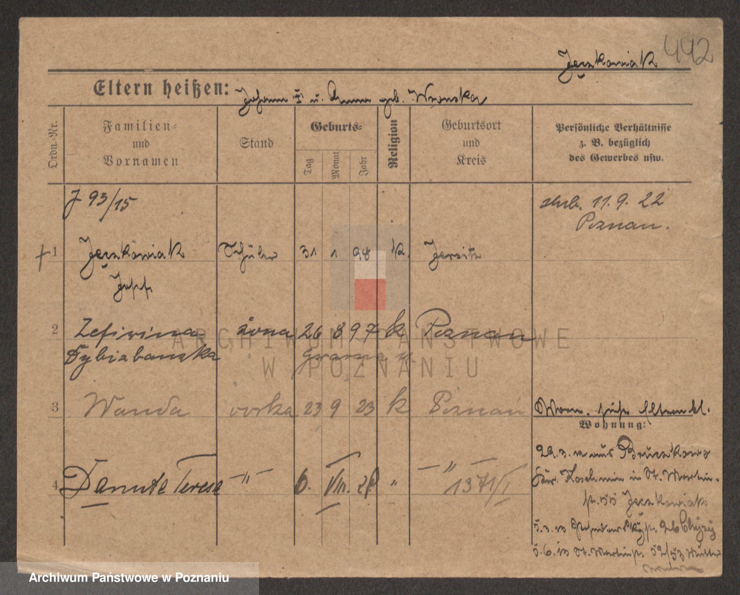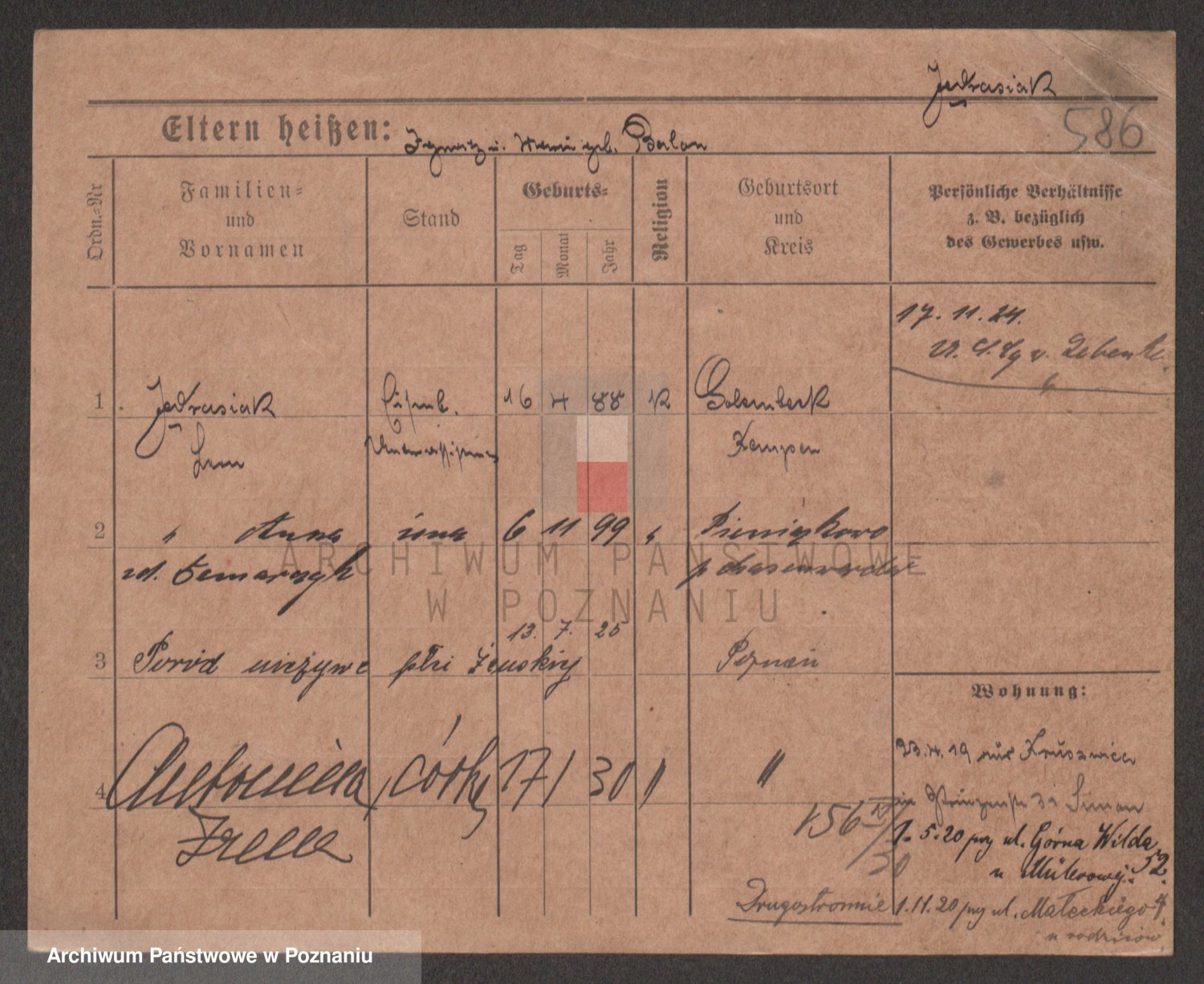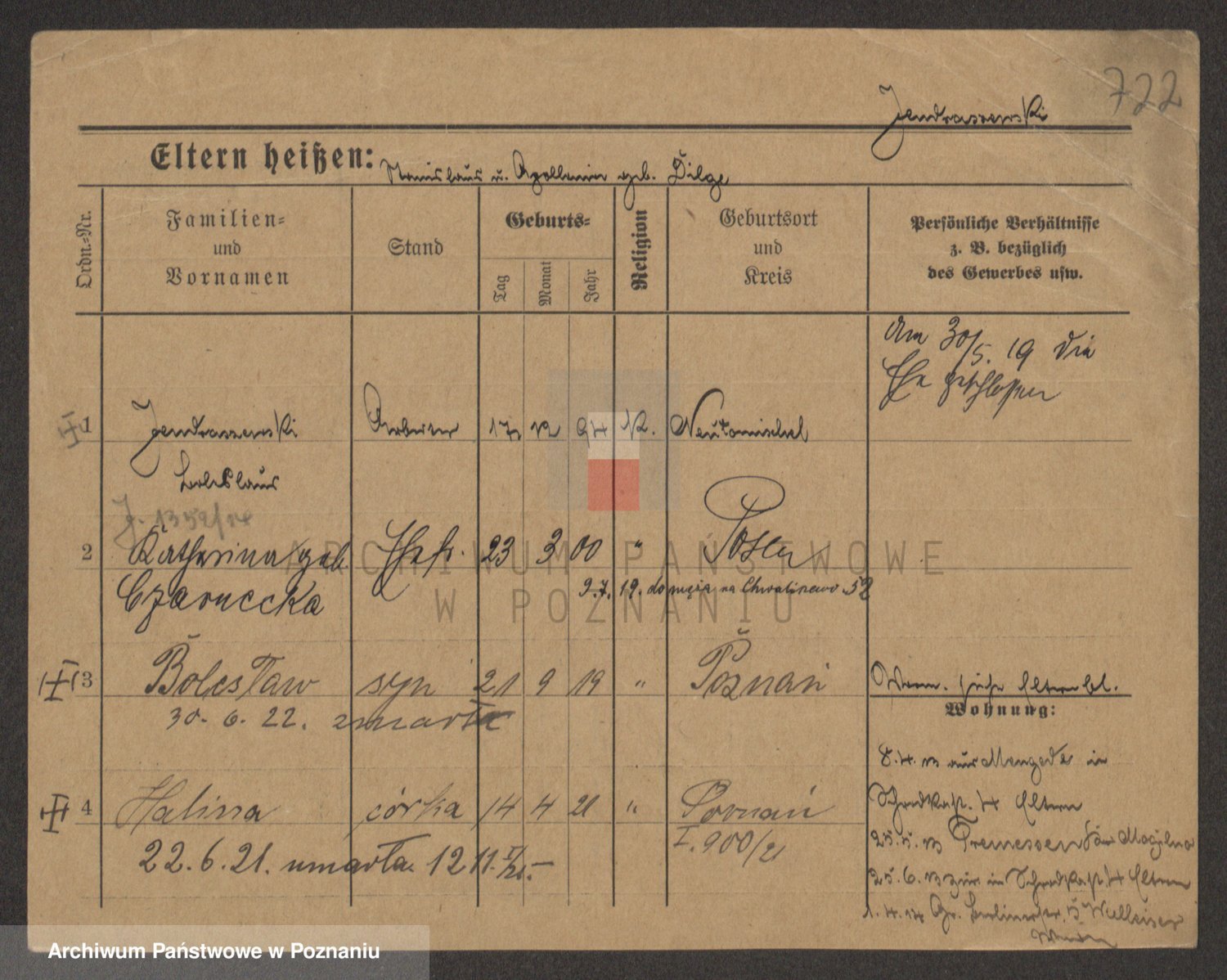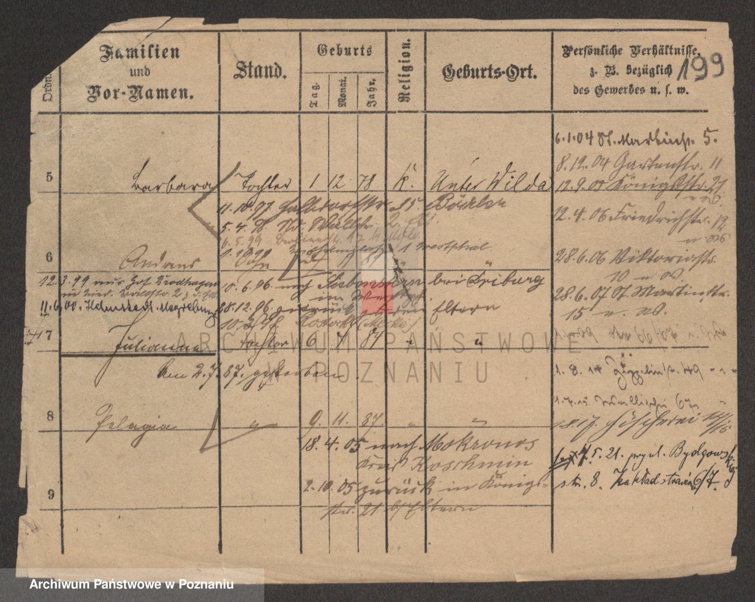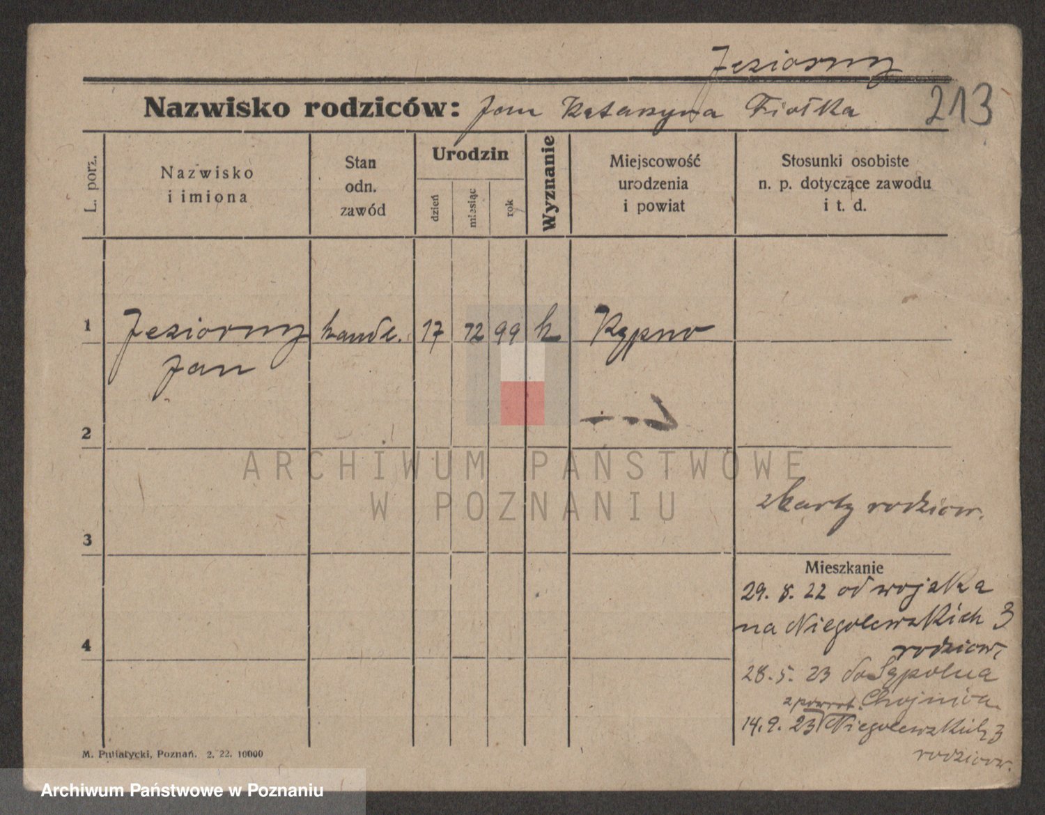 Podgląd karty osobowej dostępny jest po kliknięciu na nazwisko lub ikonkę karty. Można dokonywać powiększenia (ikony na górze) lub przechodzić między kolejnymi skanami (strzałki po bokach).