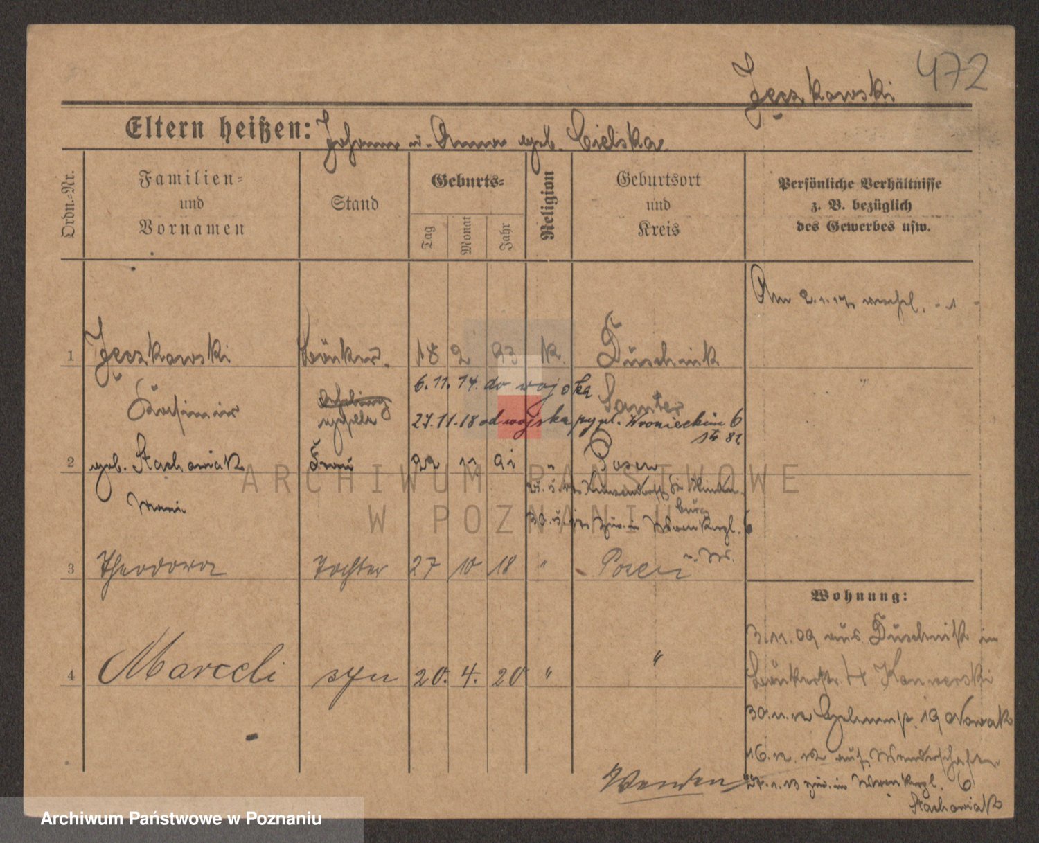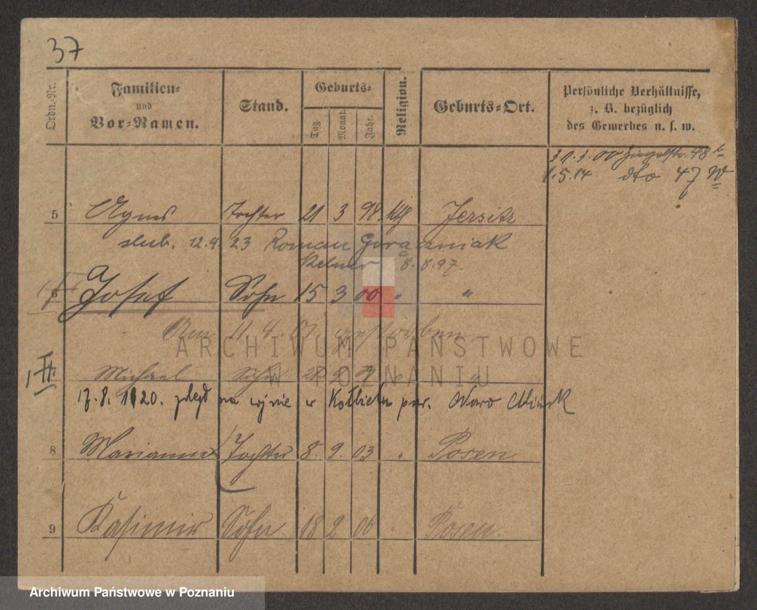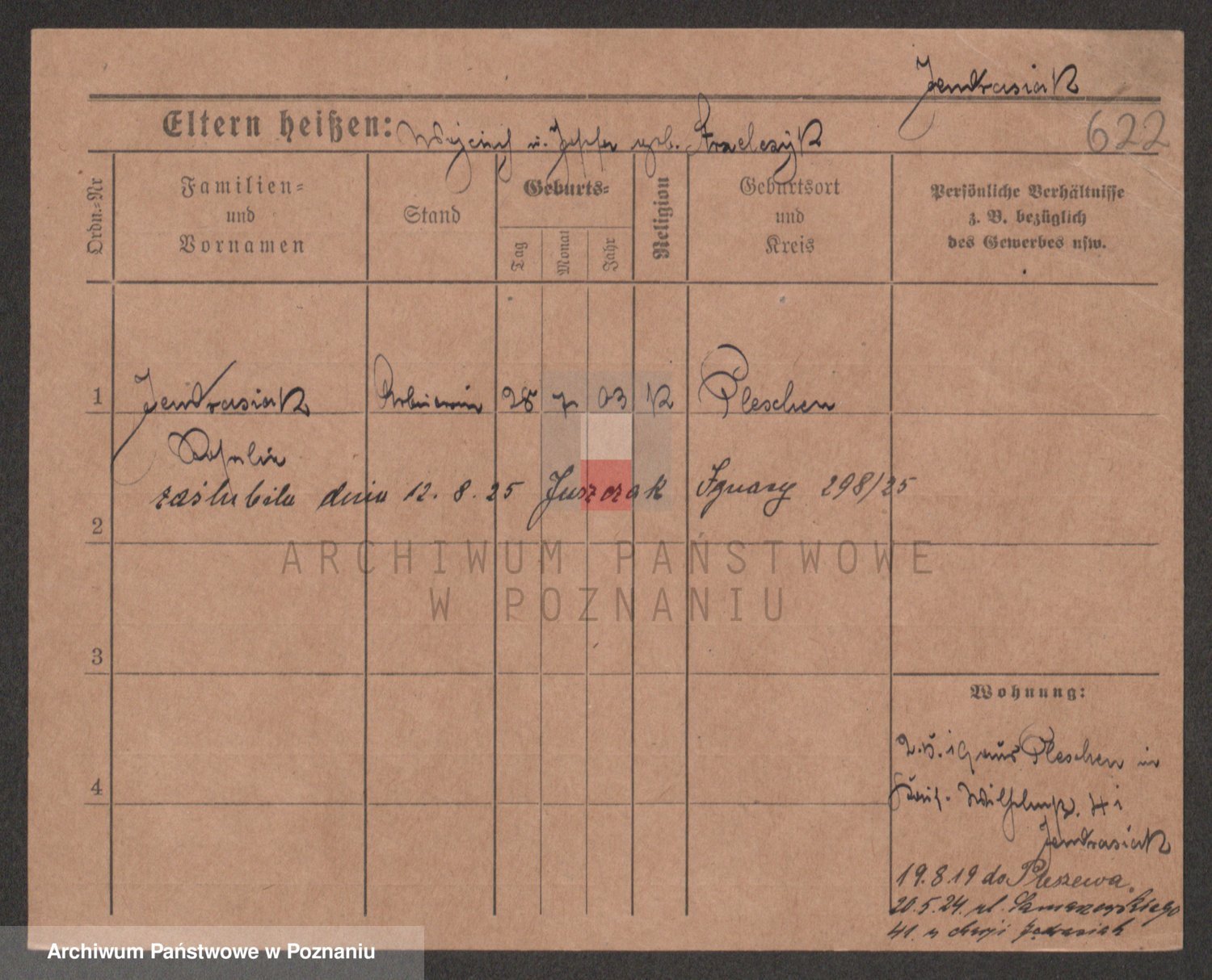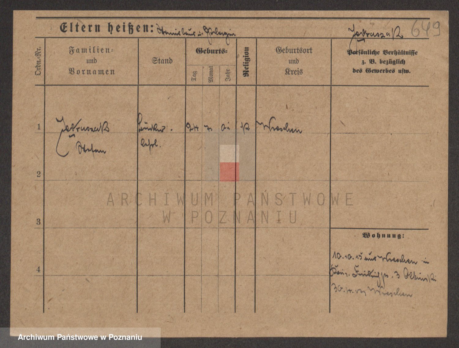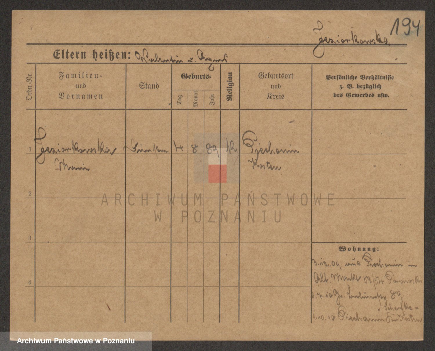 Podgląd karty osobowej dostępny jest po kliknięciu na nazwisko lub ikonkę karty. Można dokonywać powiększenia (ikony na górze) lub przechodzić między kolejnymi skanami (strzałki po bokach).