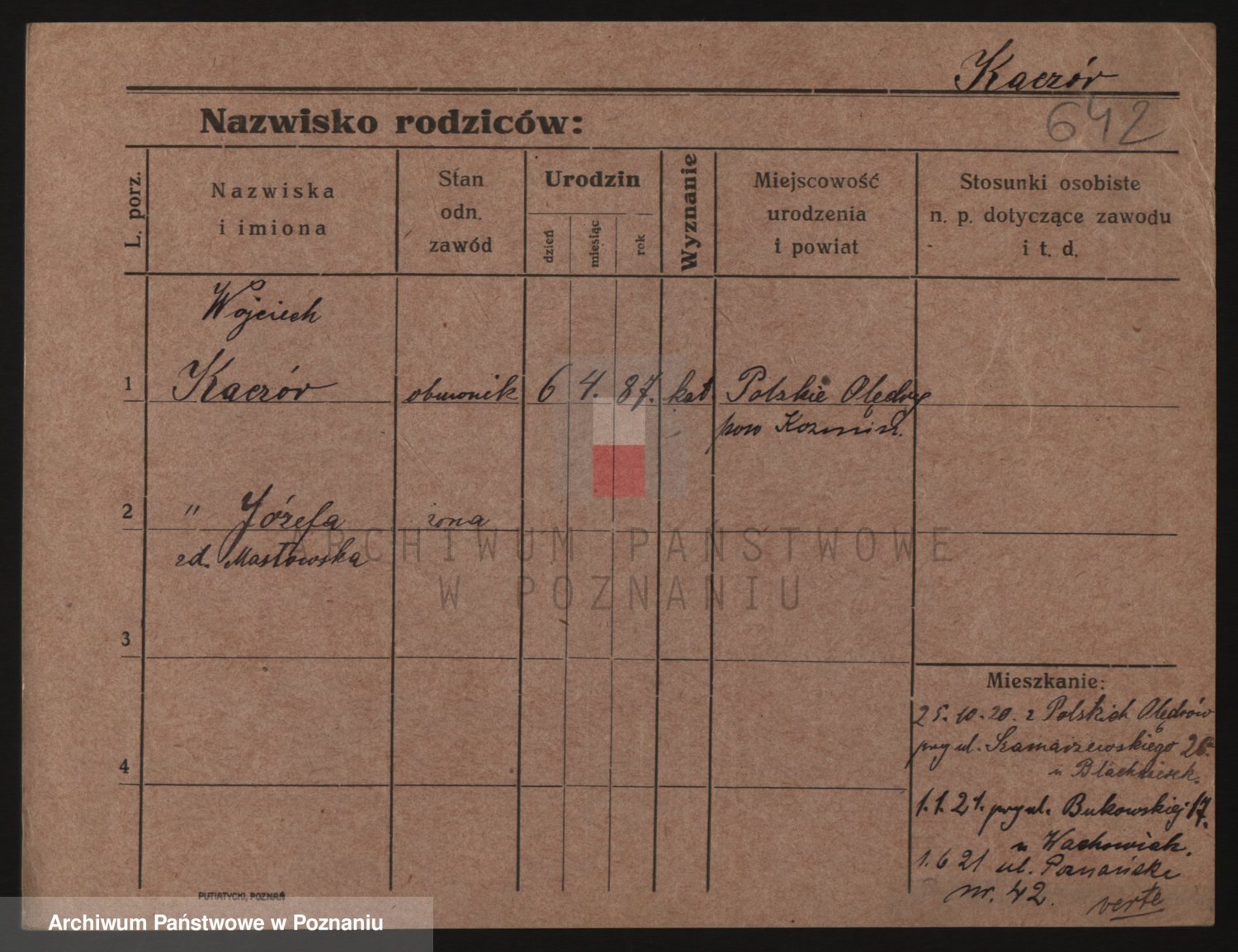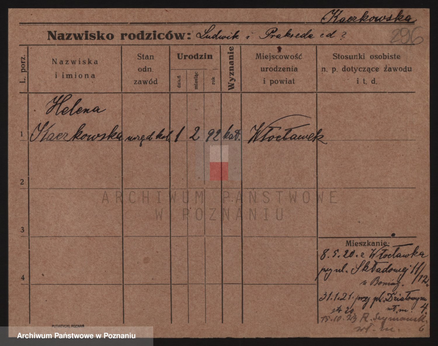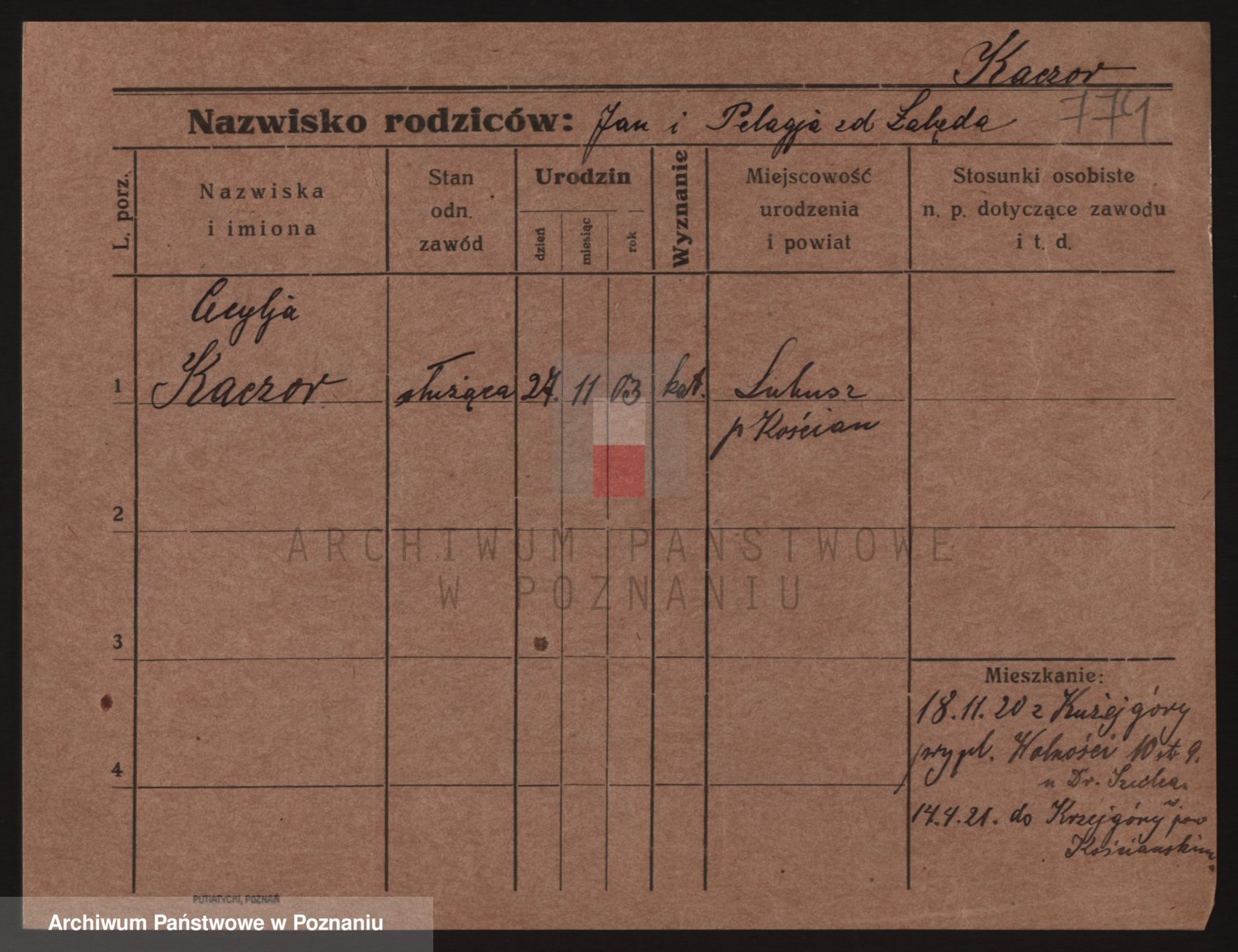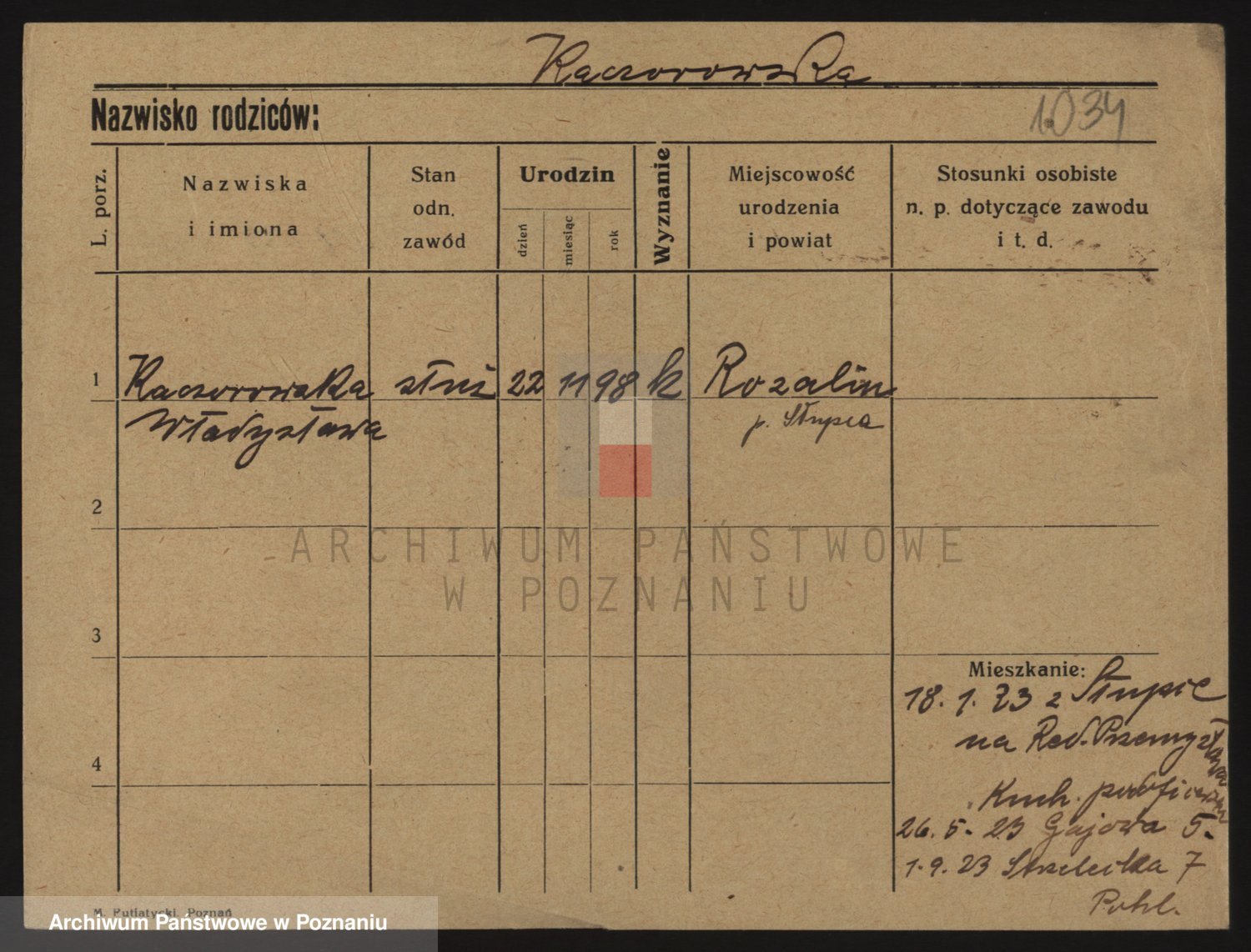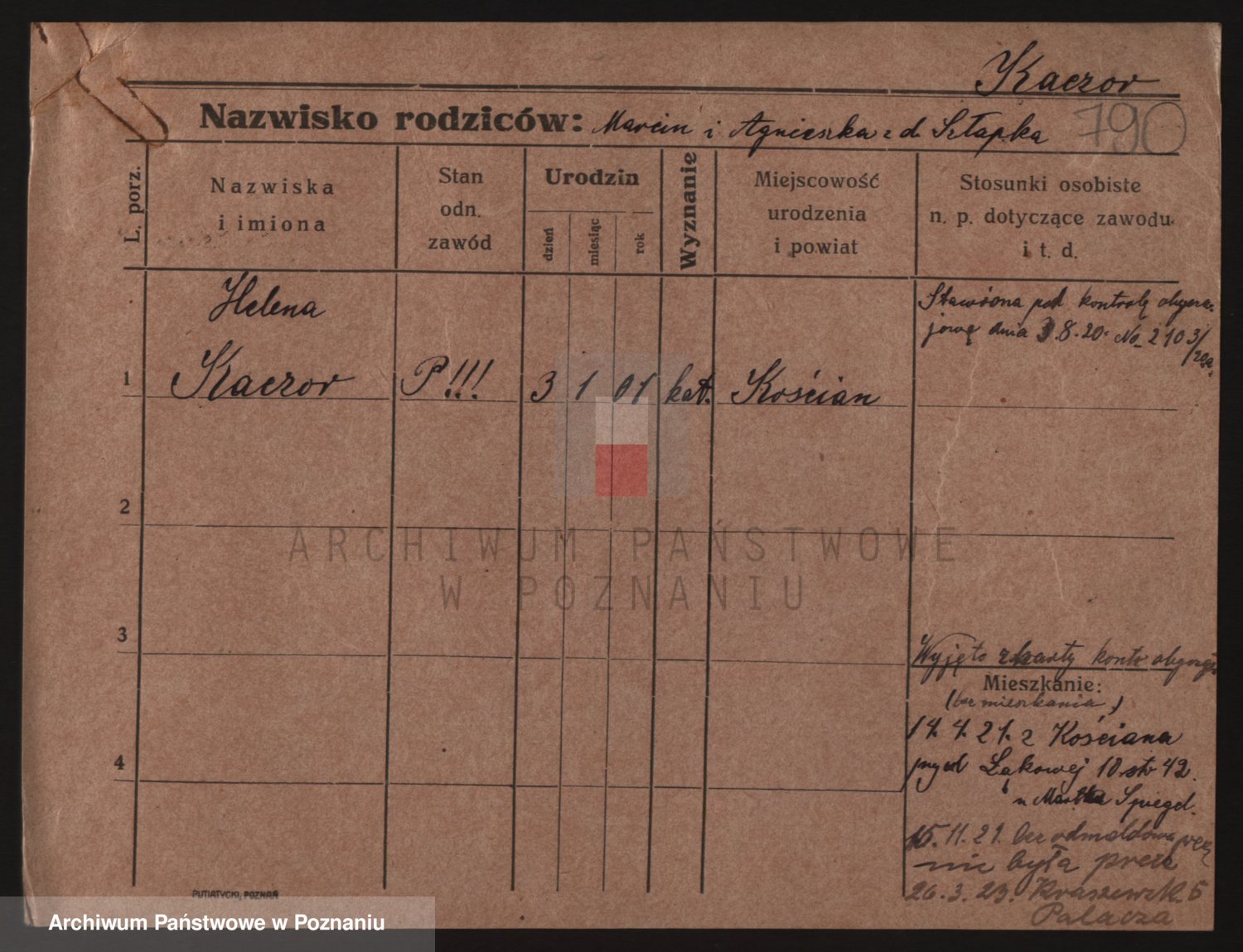 Podgląd karty osobowej dostępny jest po kliknięciu na nazwisko lub ikonkę karty. Można dokonywać powiększenia (ikony na górze) lub przechodzić między kolejnymi skanami (strzałki po bokach).