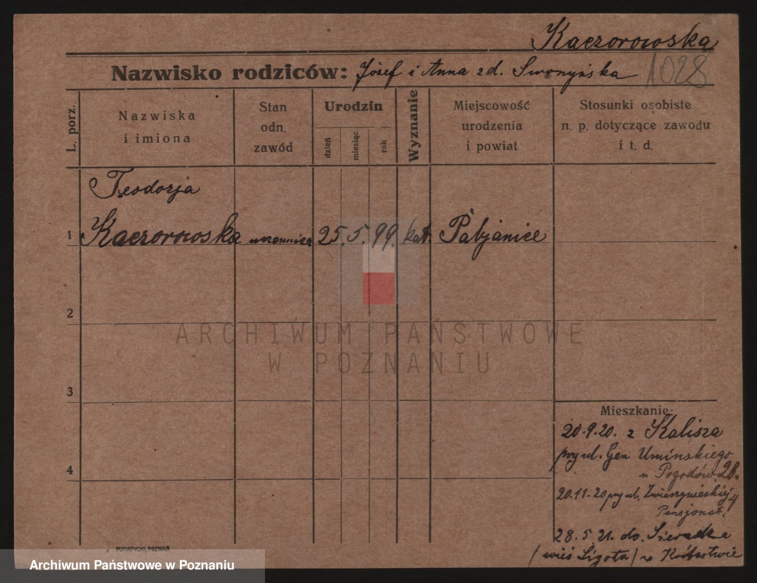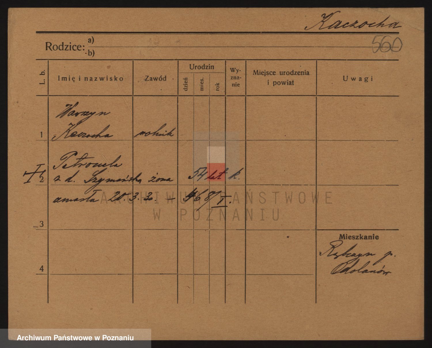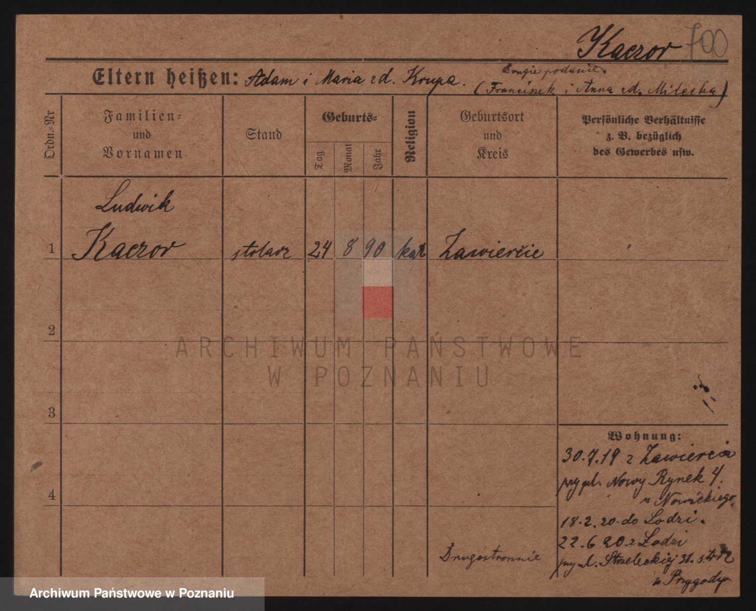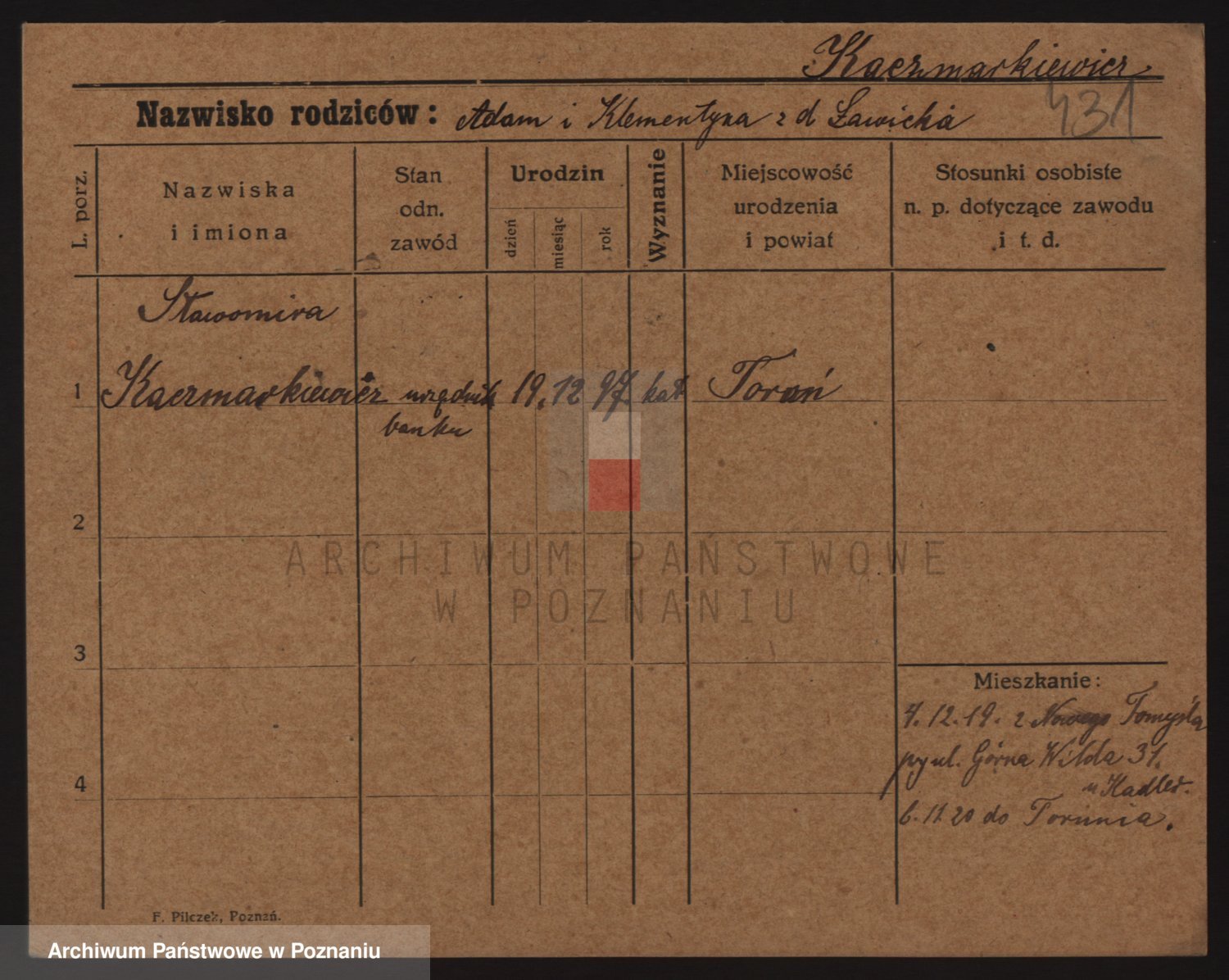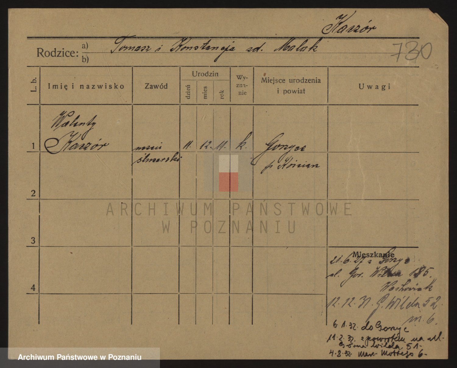 Podgląd karty osobowej dostępny jest po kliknięciu na nazwisko lub ikonkę karty. Można dokonywać powiększenia (ikony na górze) lub przechodzić między kolejnymi skanami (strzałki po bokach).