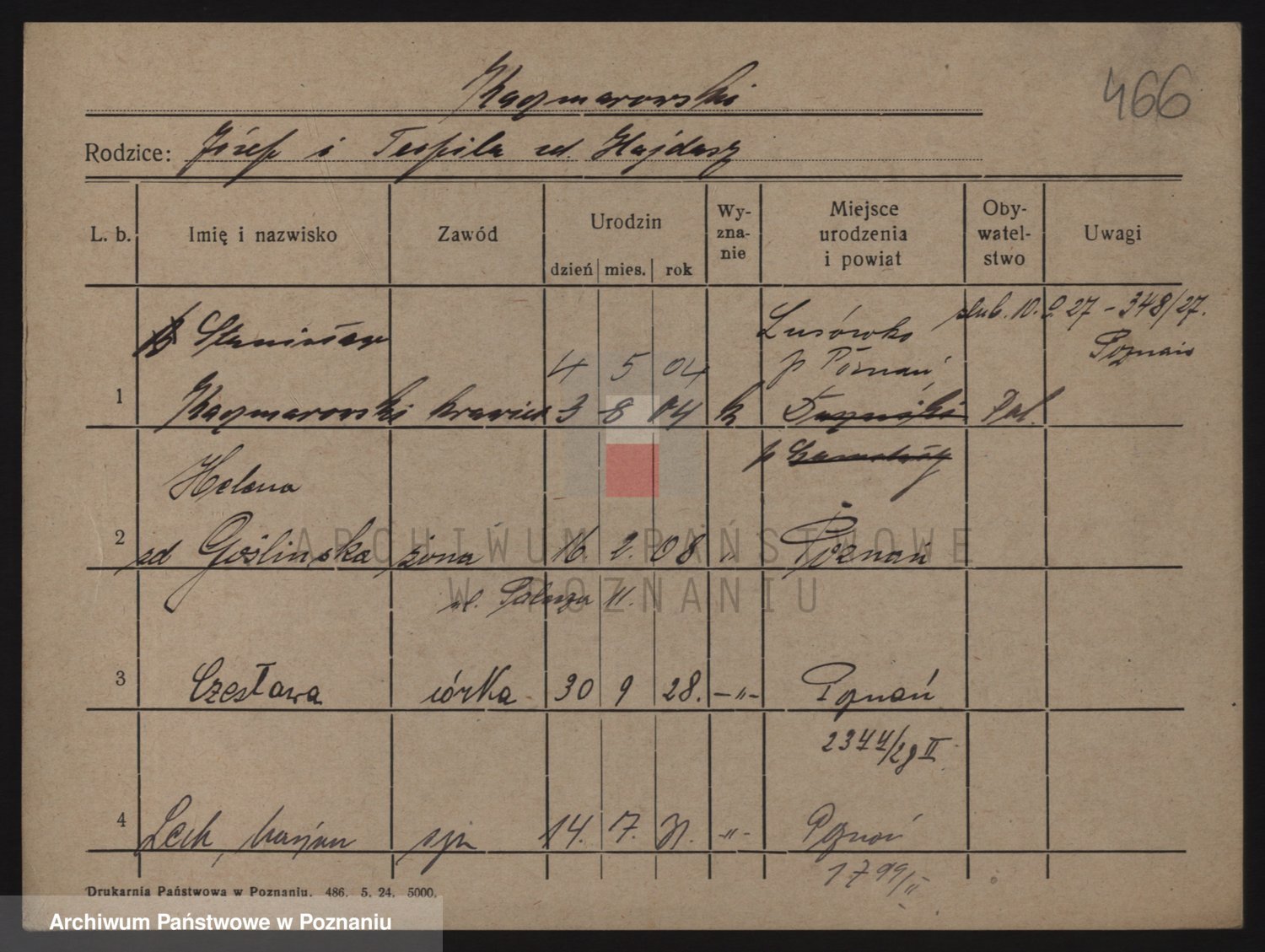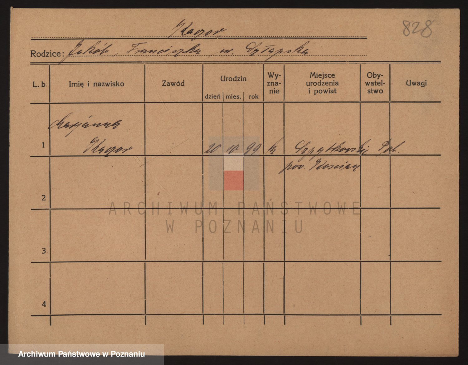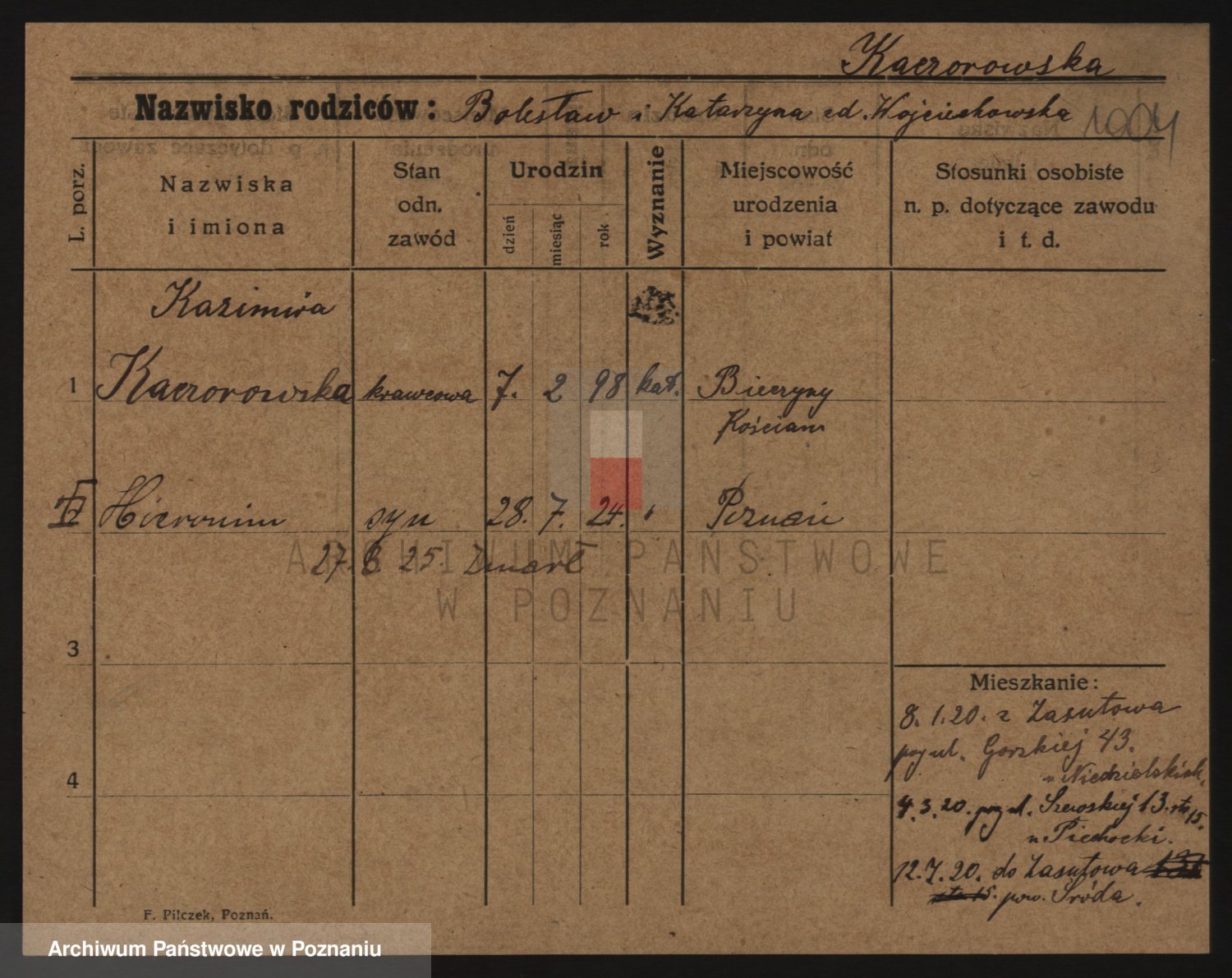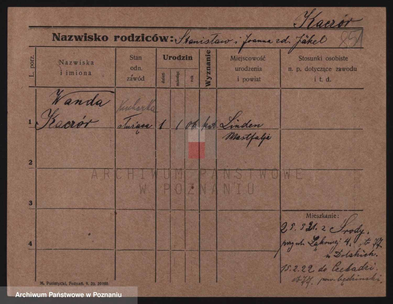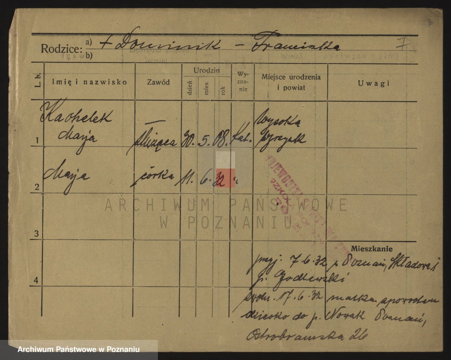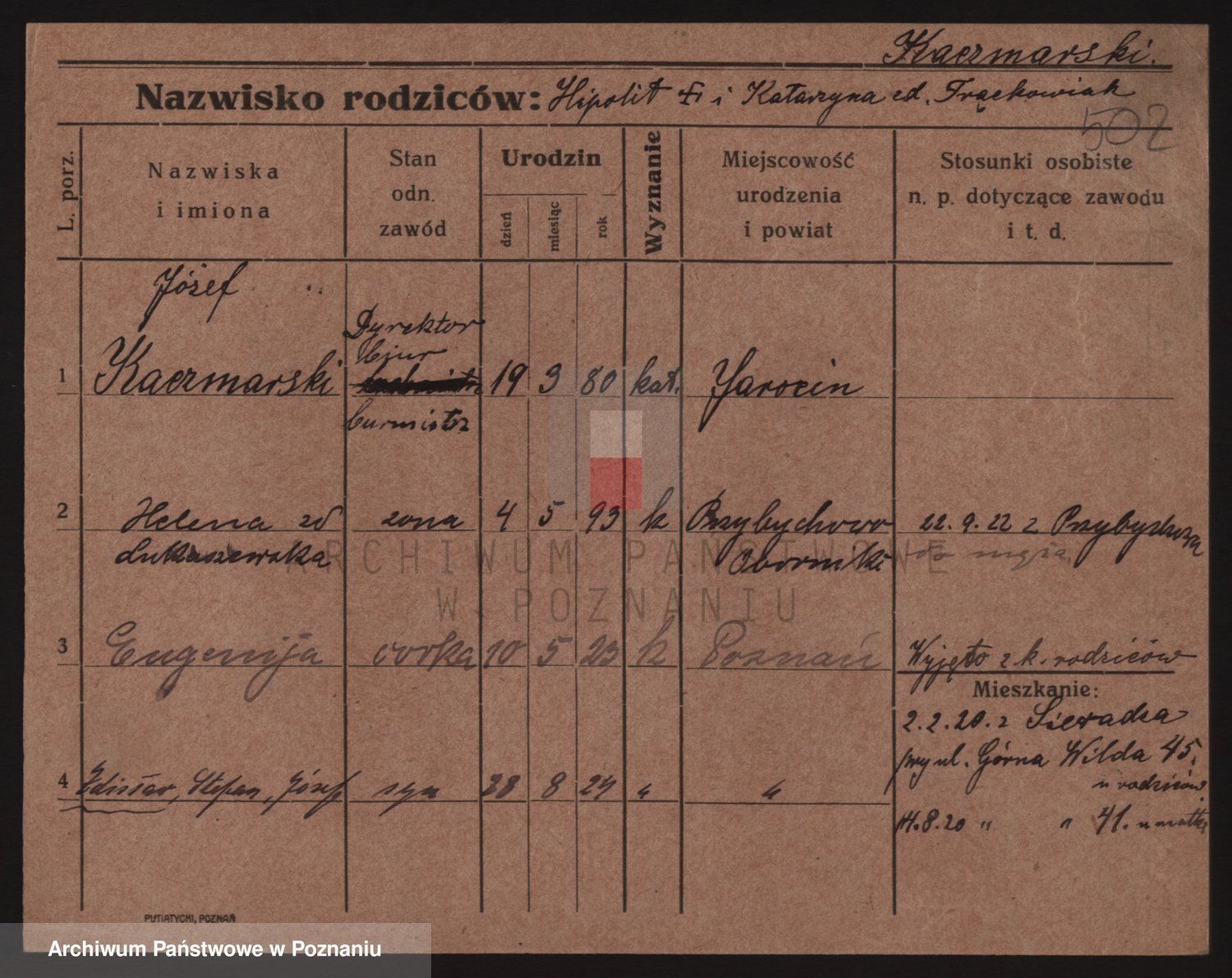 Podgląd karty osobowej dostępny jest po kliknięciu na nazwisko lub ikonkę karty. Można dokonywać powiększenia (ikony na górze) lub przechodzić między kolejnymi skanami (strzałki po bokach).