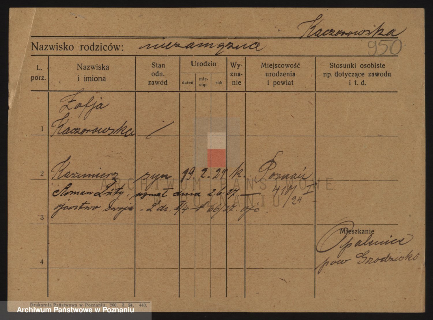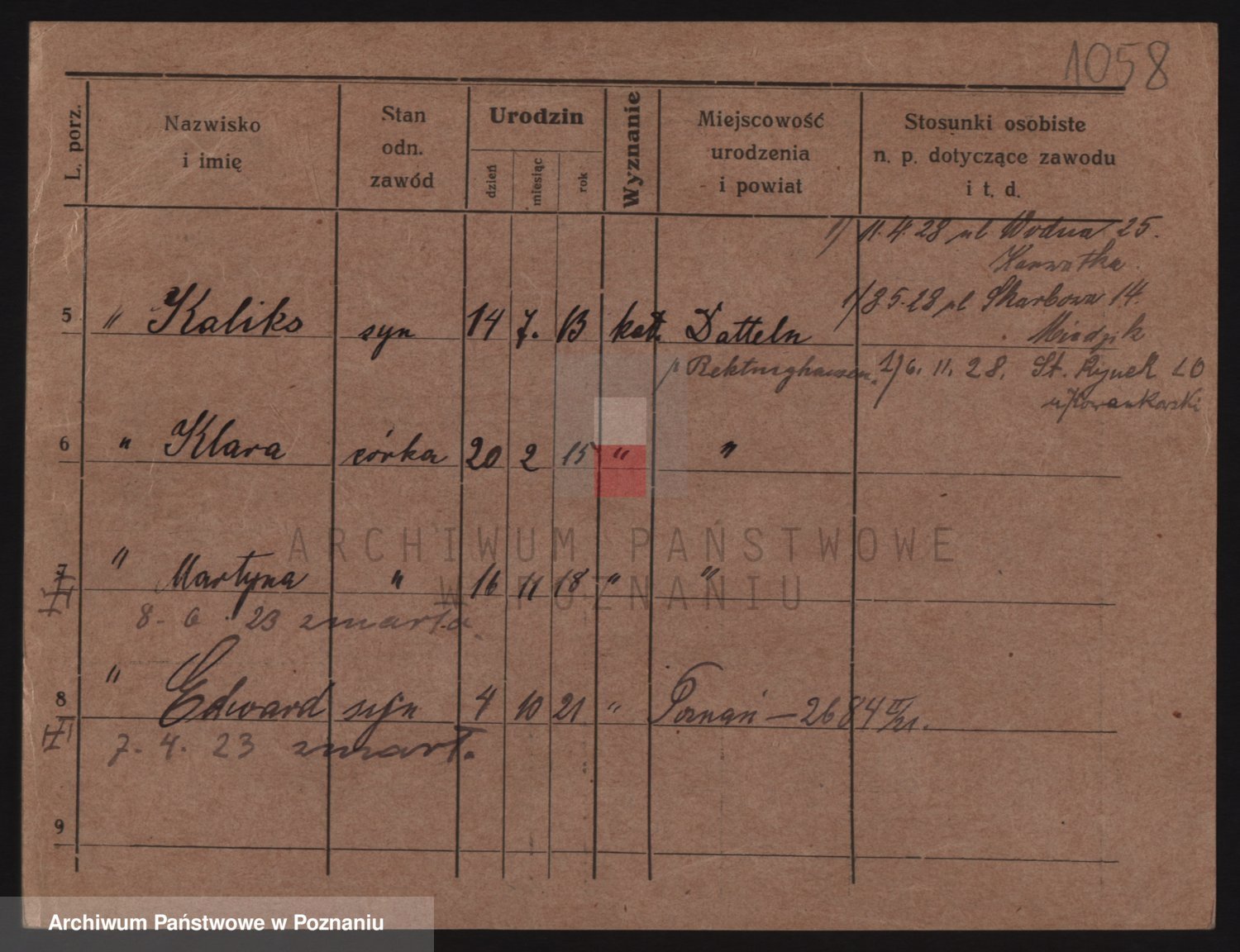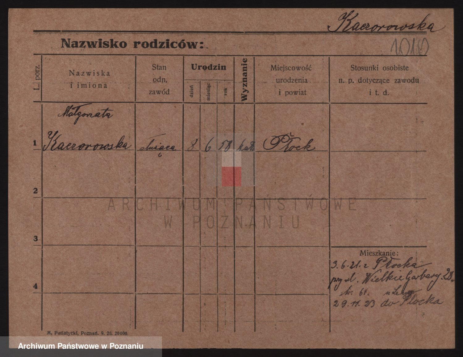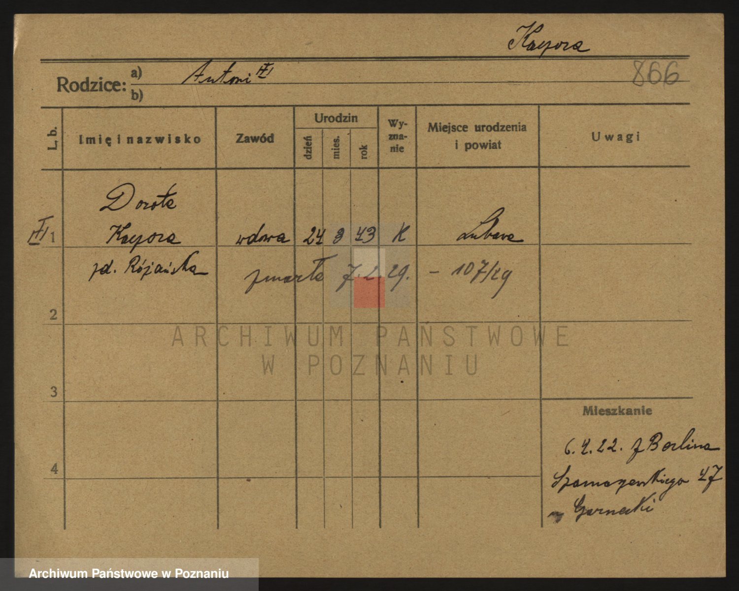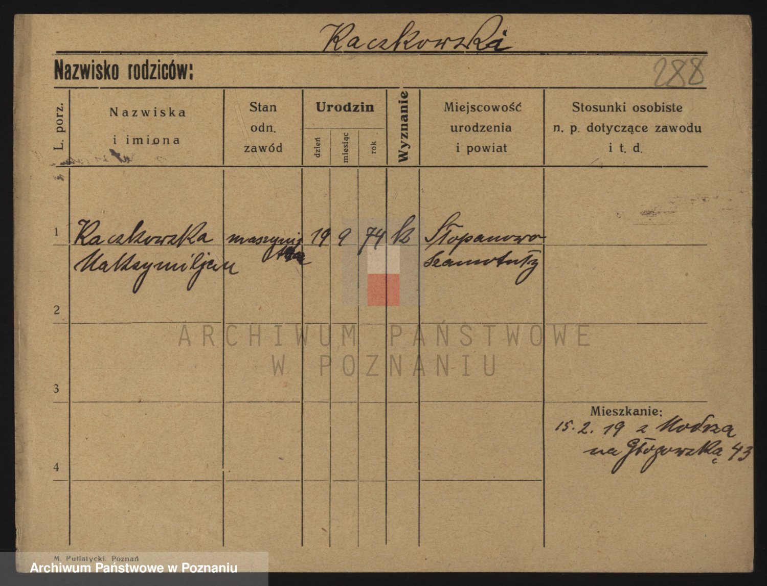 Podgląd karty osobowej dostępny jest po kliknięciu na nazwisko lub ikonkę karty. Można dokonywać powiększenia (ikony na górze) lub przechodzić między kolejnymi skanami (strzałki po bokach).