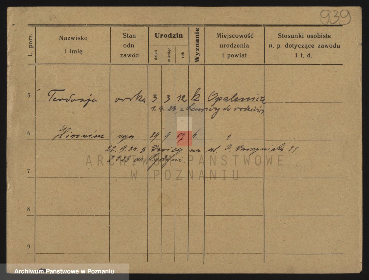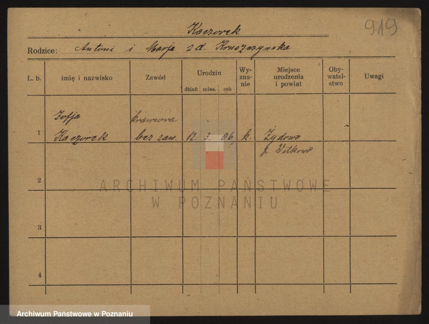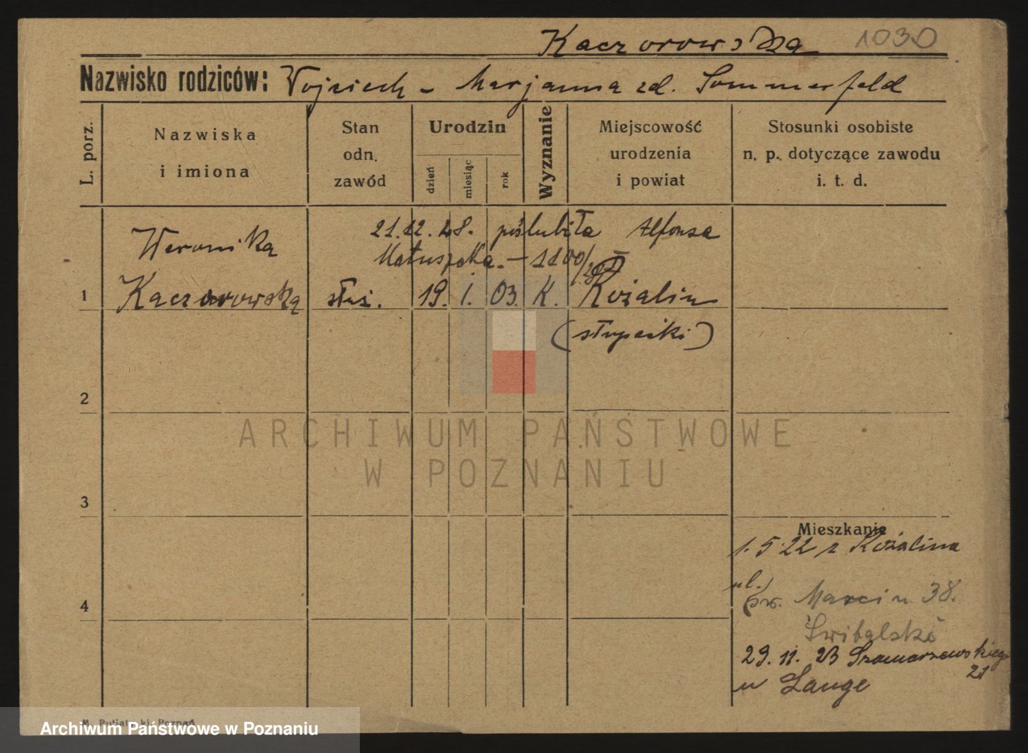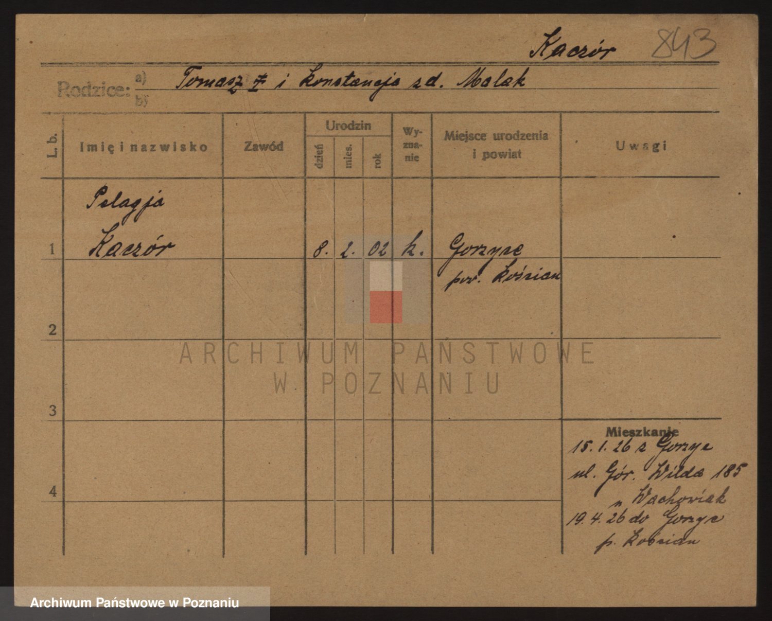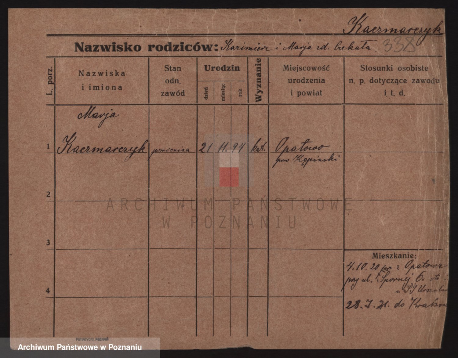 Podgląd karty osobowej dostępny jest po kliknięciu na nazwisko lub ikonkę karty. Można dokonywać powiększenia (ikony na górze) lub przechodzić między kolejnymi skanami (strzałki po bokach).