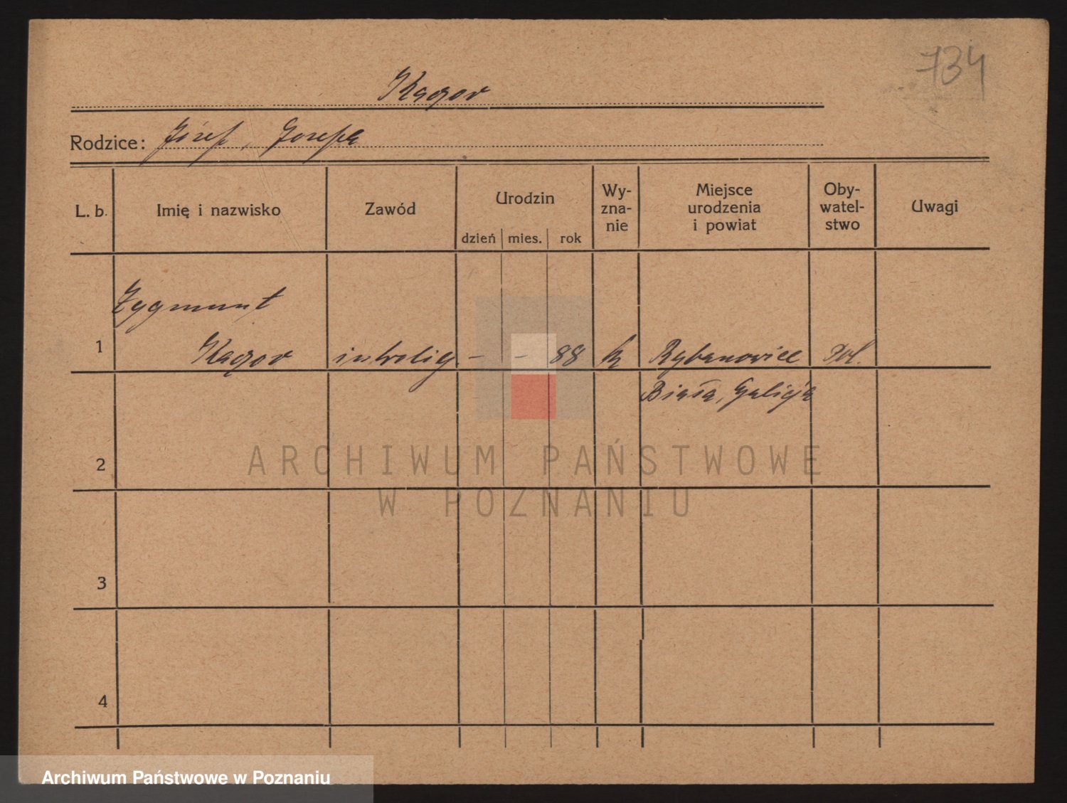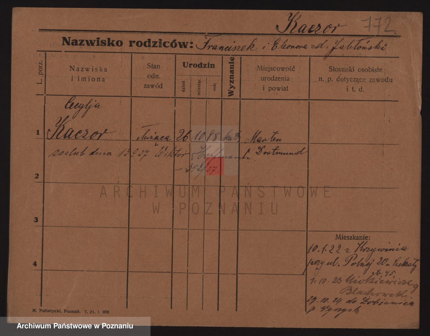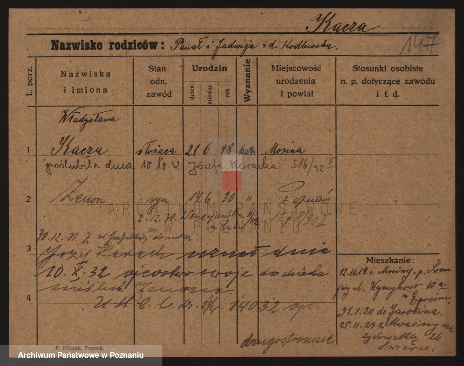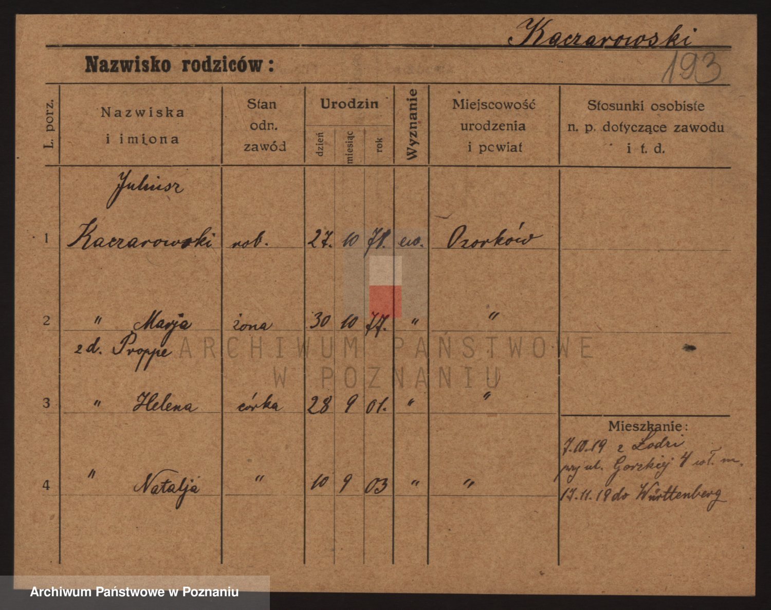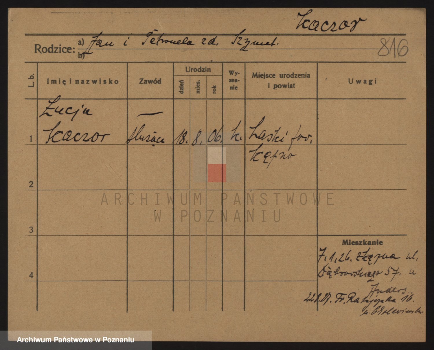 Podgląd karty osobowej dostępny jest po kliknięciu na nazwisko lub ikonkę karty. Można dokonywać powiększenia (ikony na górze) lub przechodzić między kolejnymi skanami (strzałki po bokach).