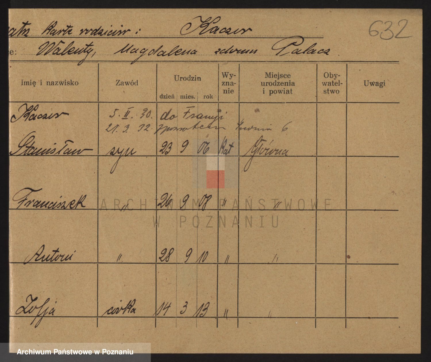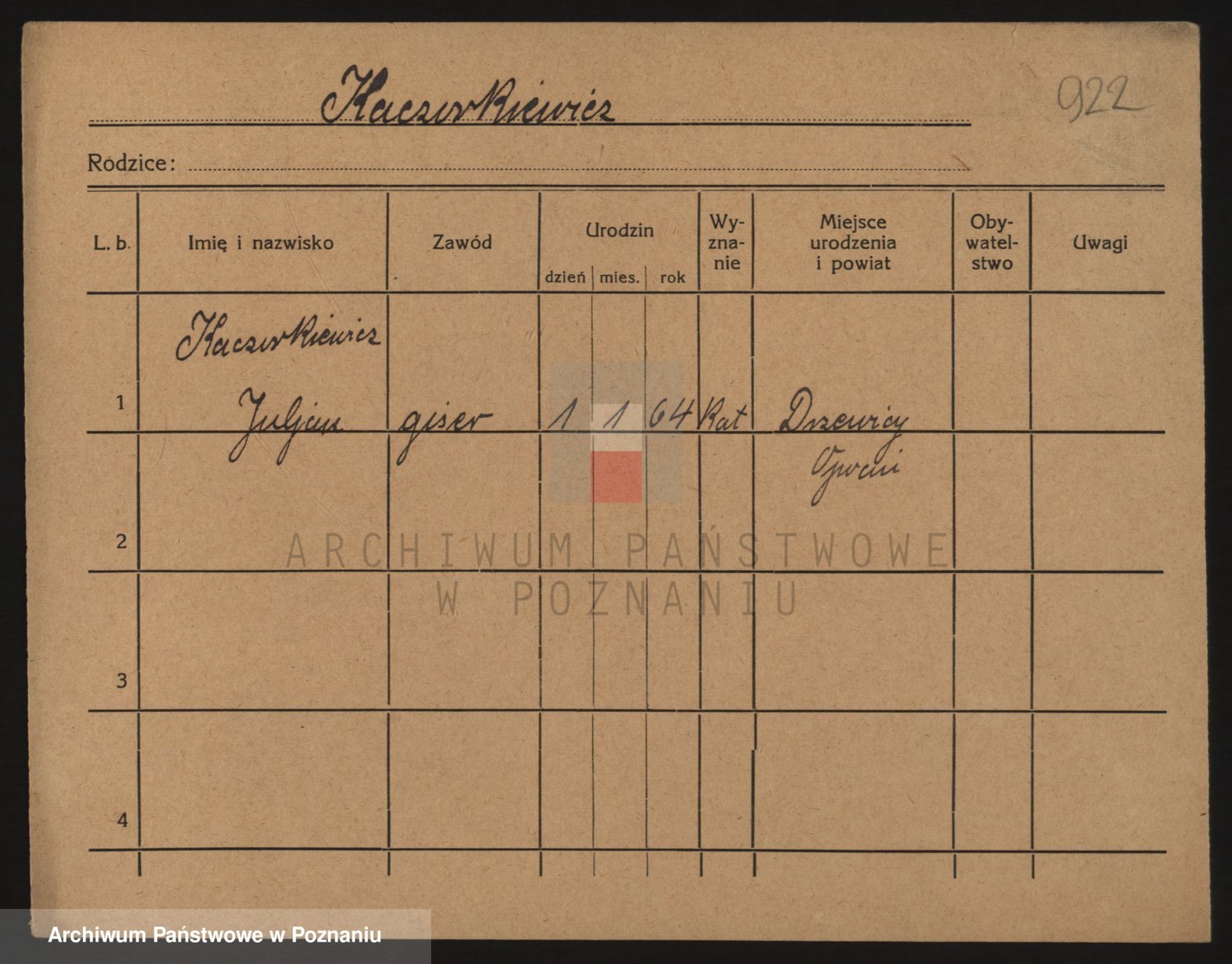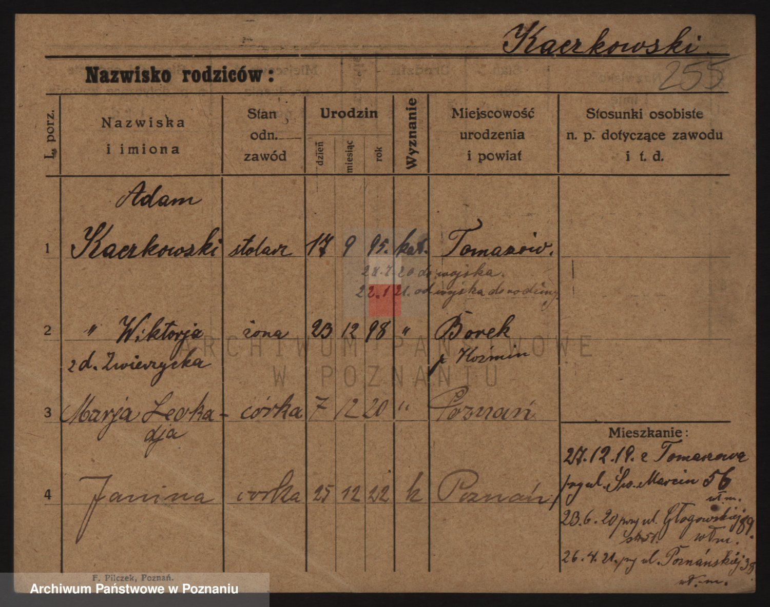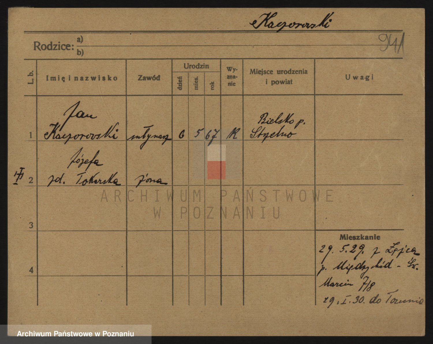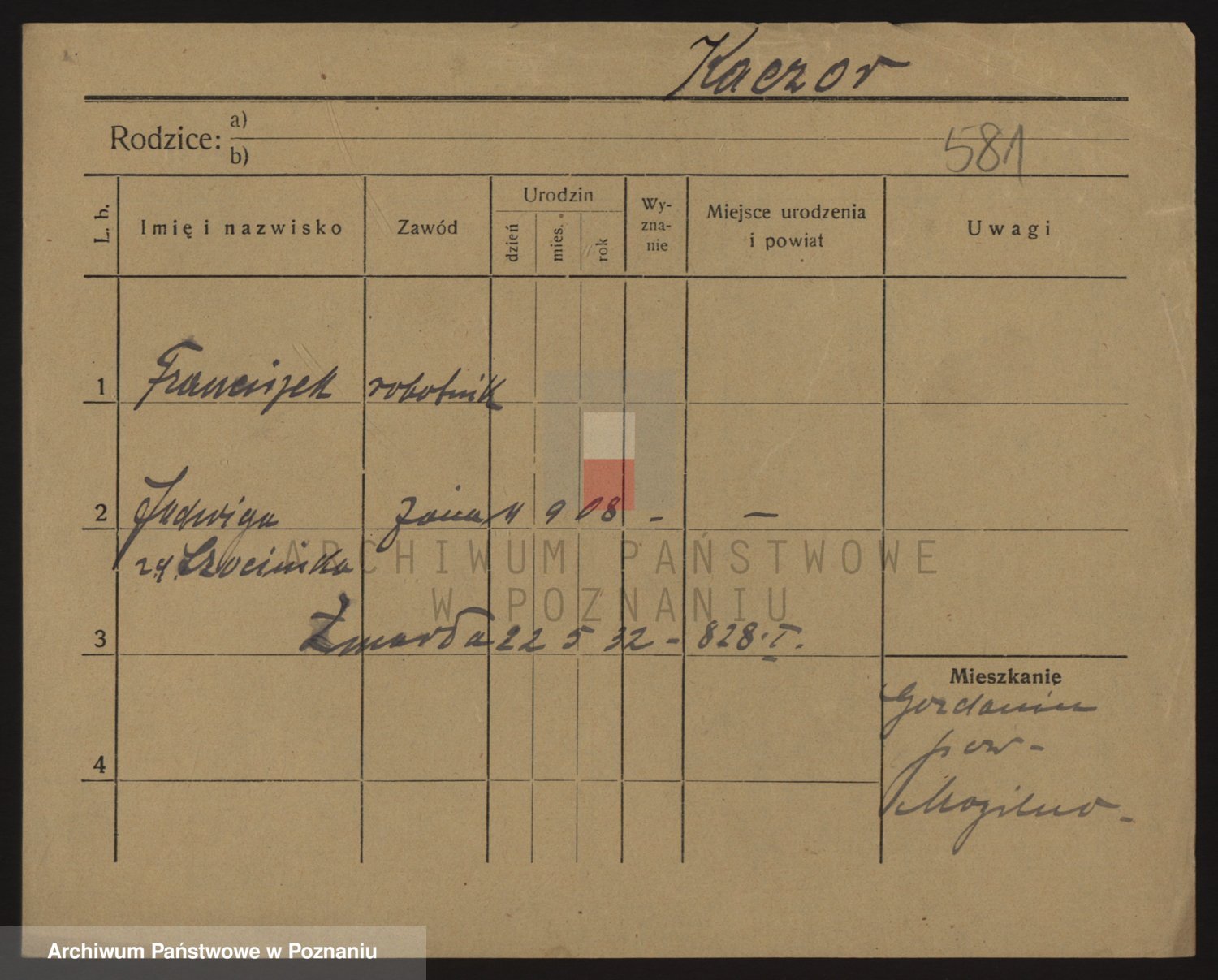 Podgląd karty osobowej dostępny jest po kliknięciu na nazwisko lub ikonkę karty. Można dokonywać powiększenia (ikony na górze) lub przechodzić między kolejnymi skanami (strzałki po bokach).