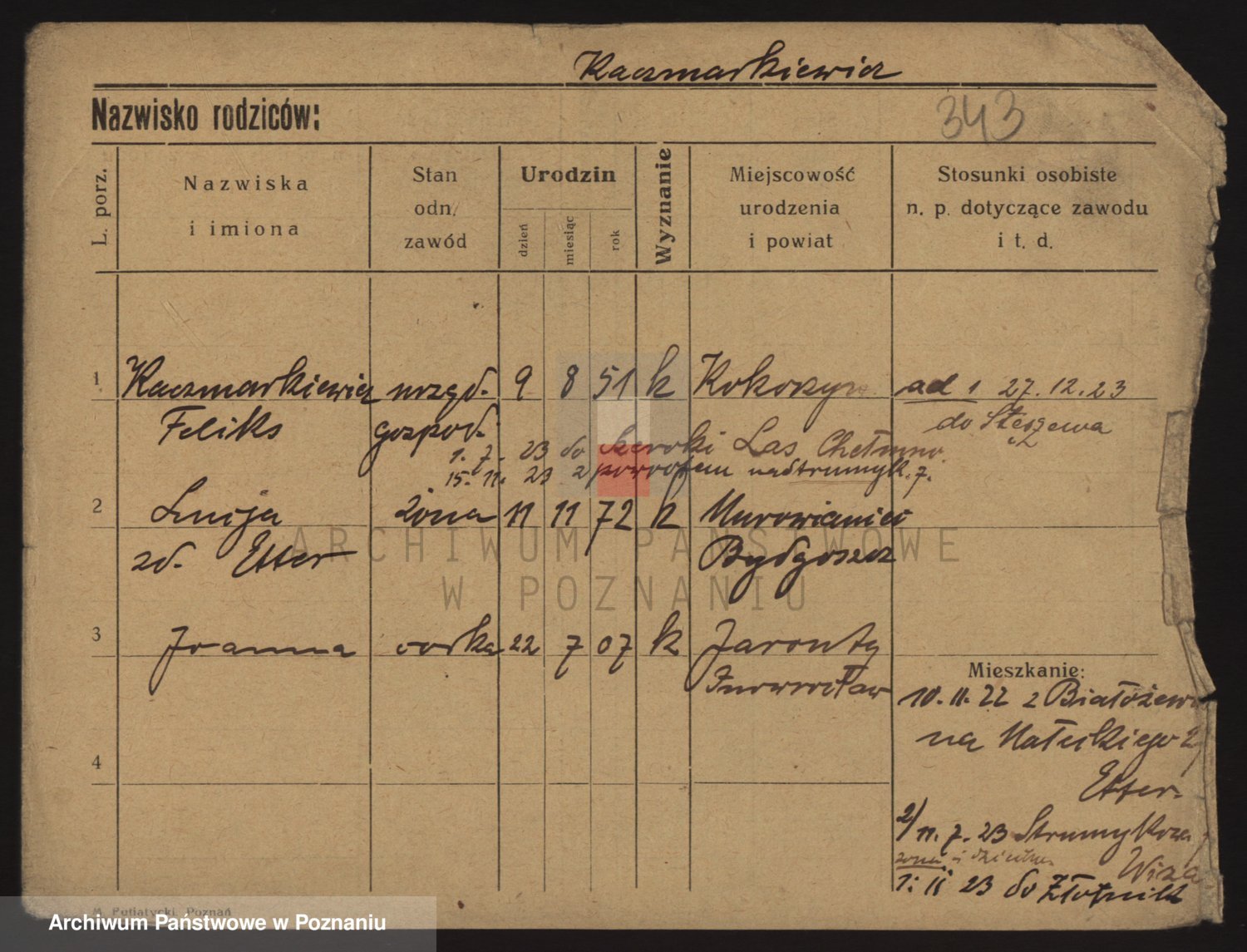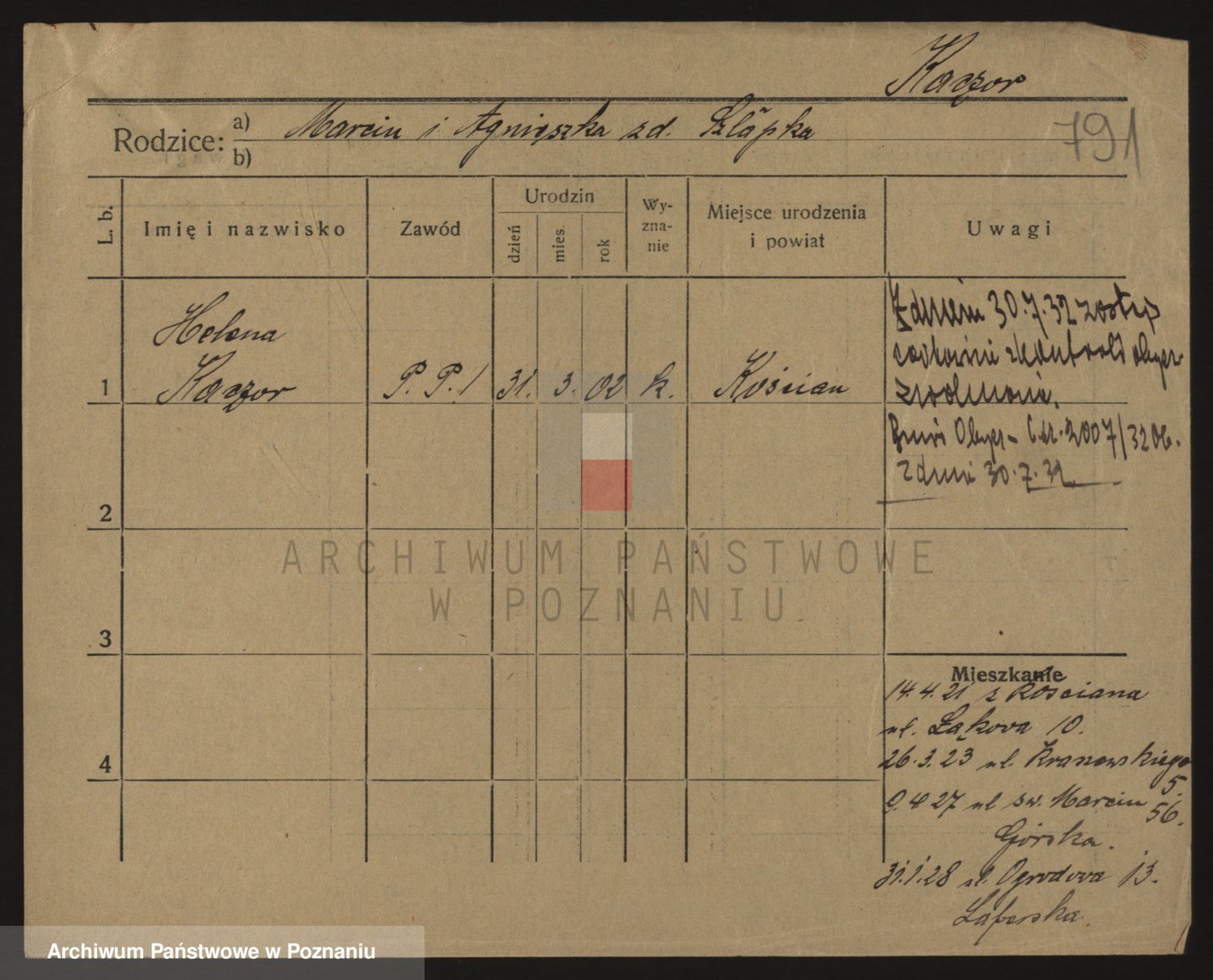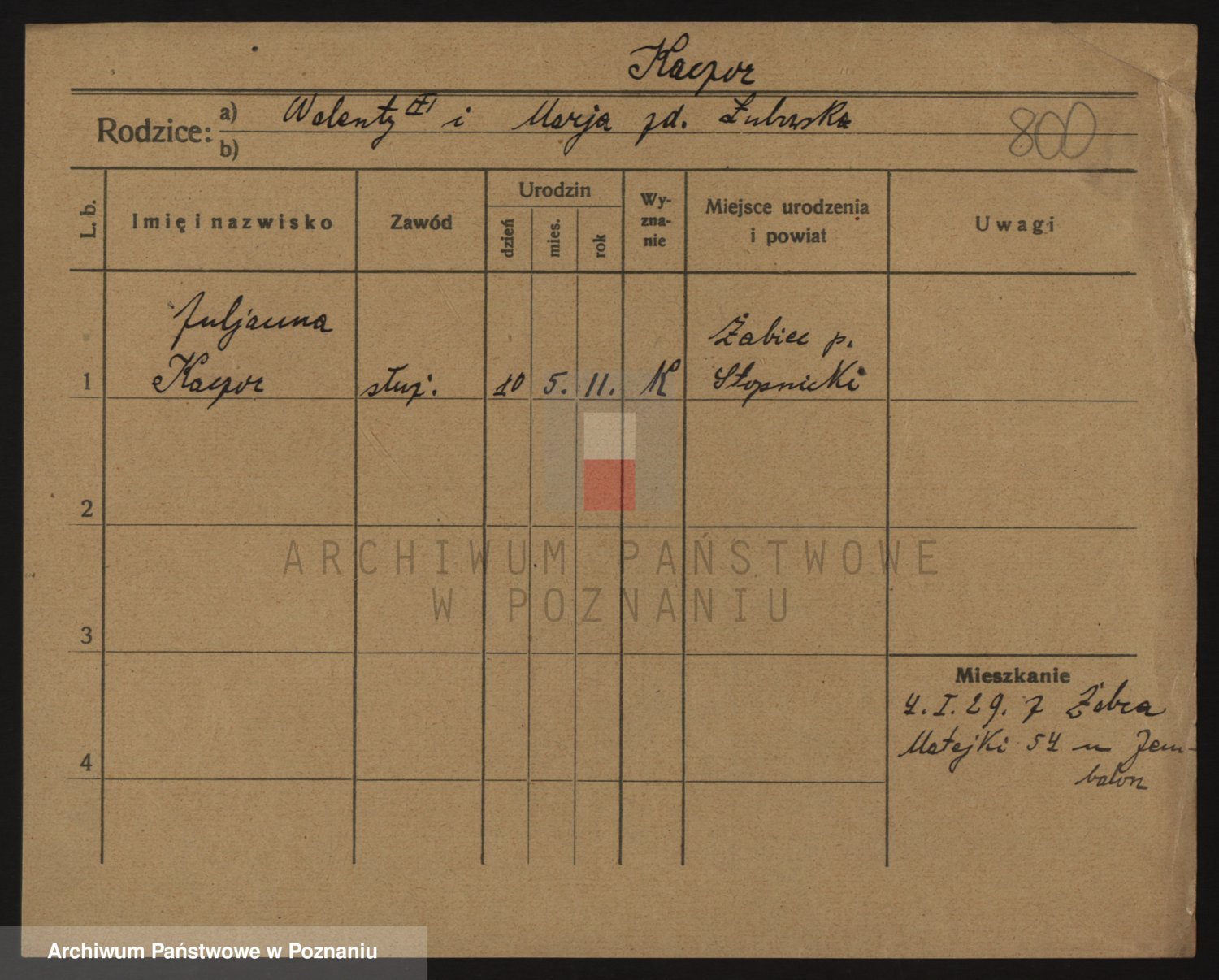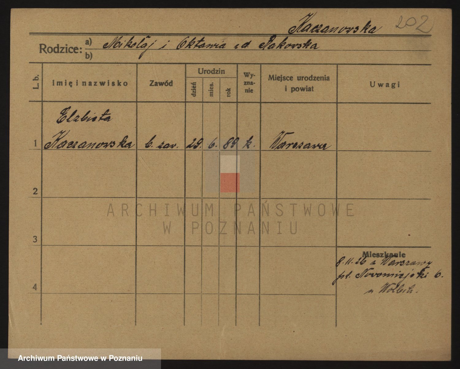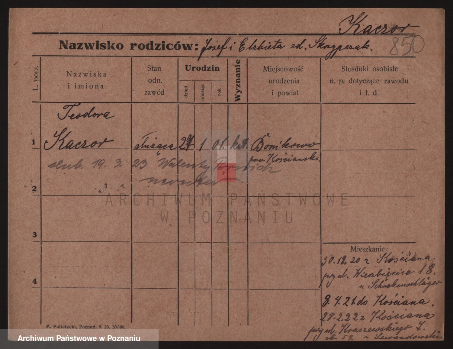 Podgląd karty osobowej dostępny jest po kliknięciu na nazwisko lub ikonkę karty. Można dokonywać powiększenia (ikony na górze) lub przechodzić między kolejnymi skanami (strzałki po bokach).