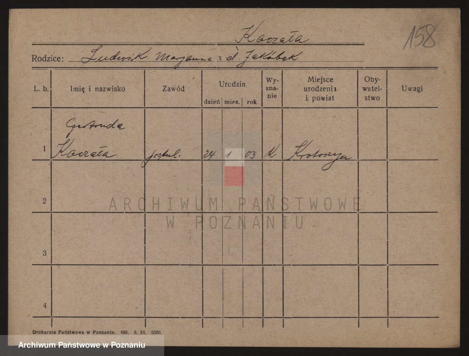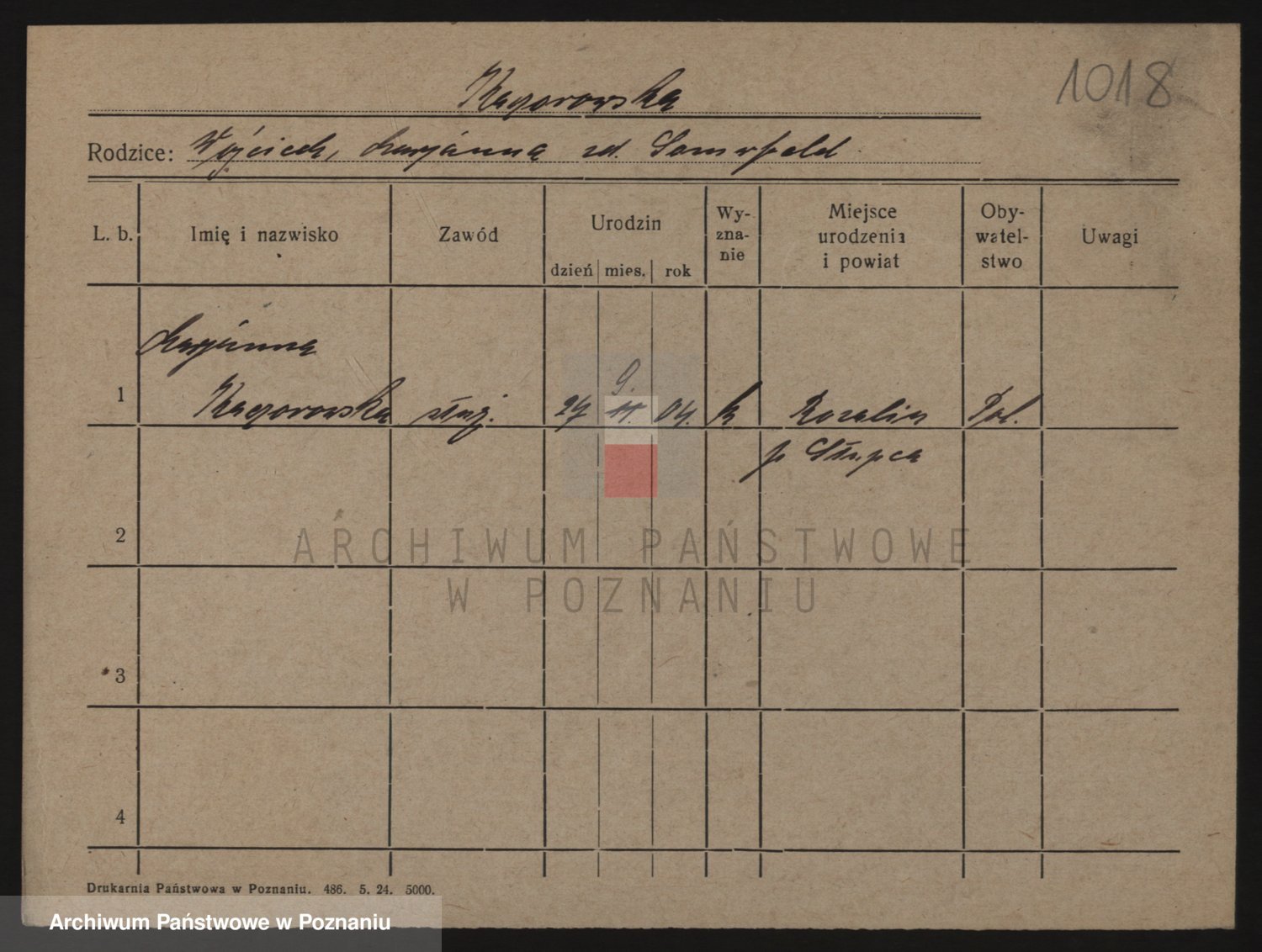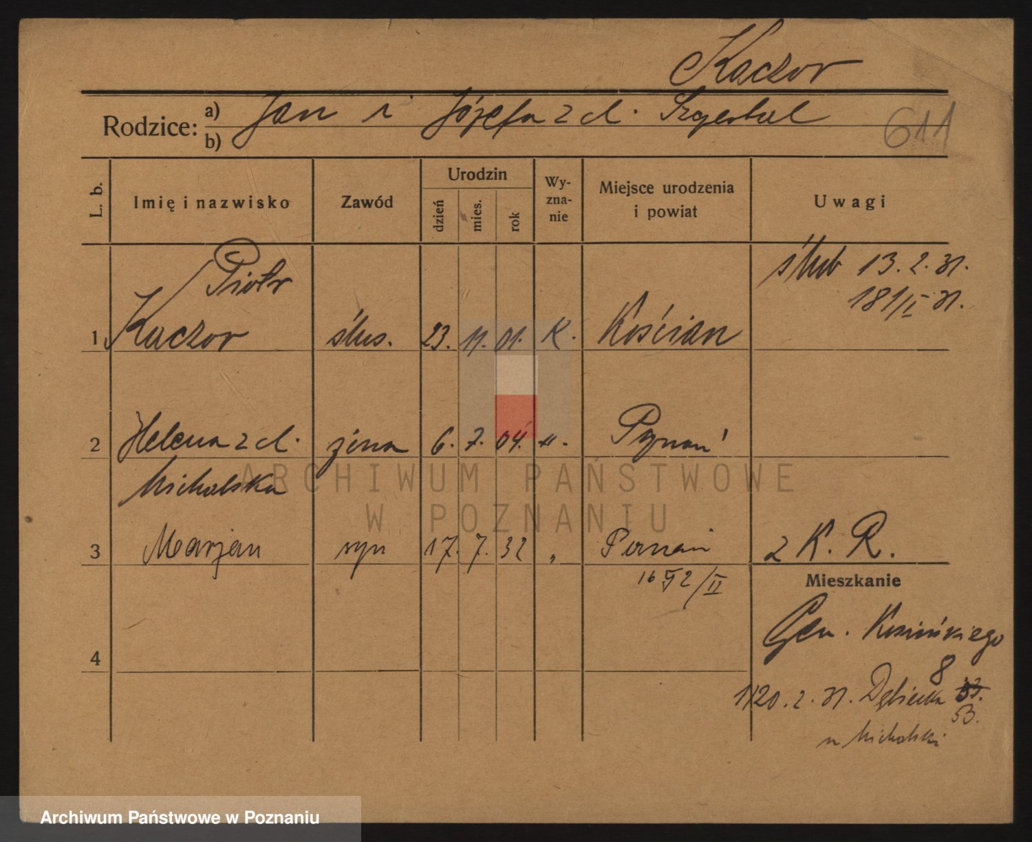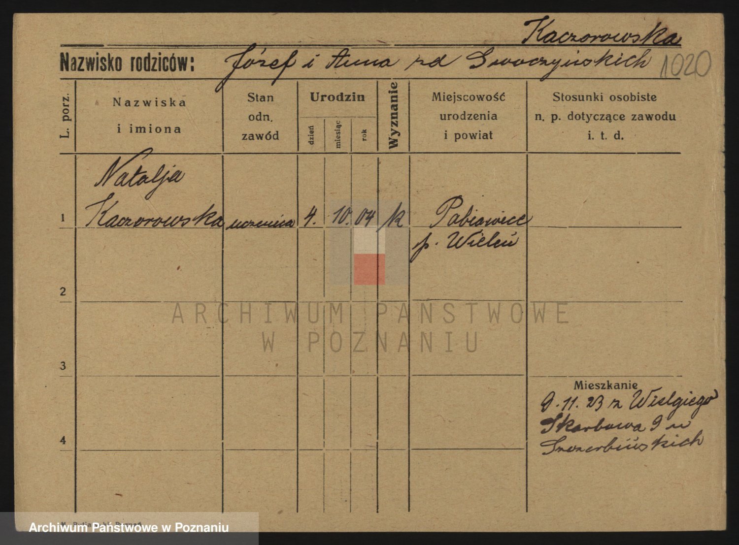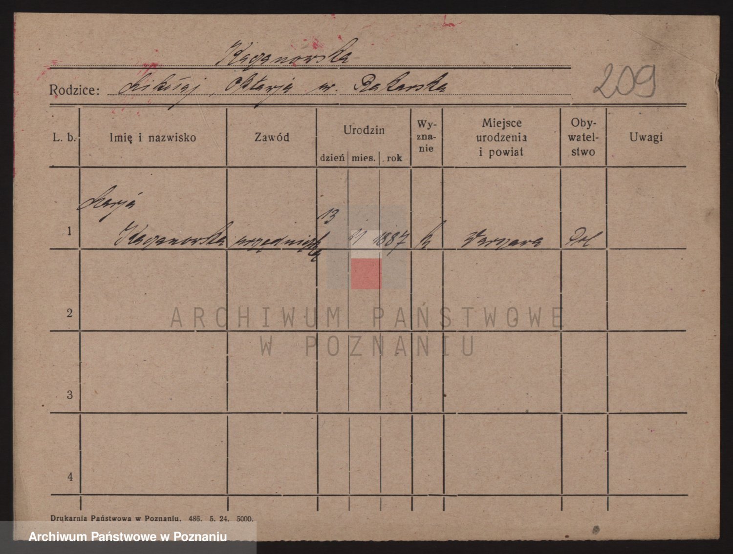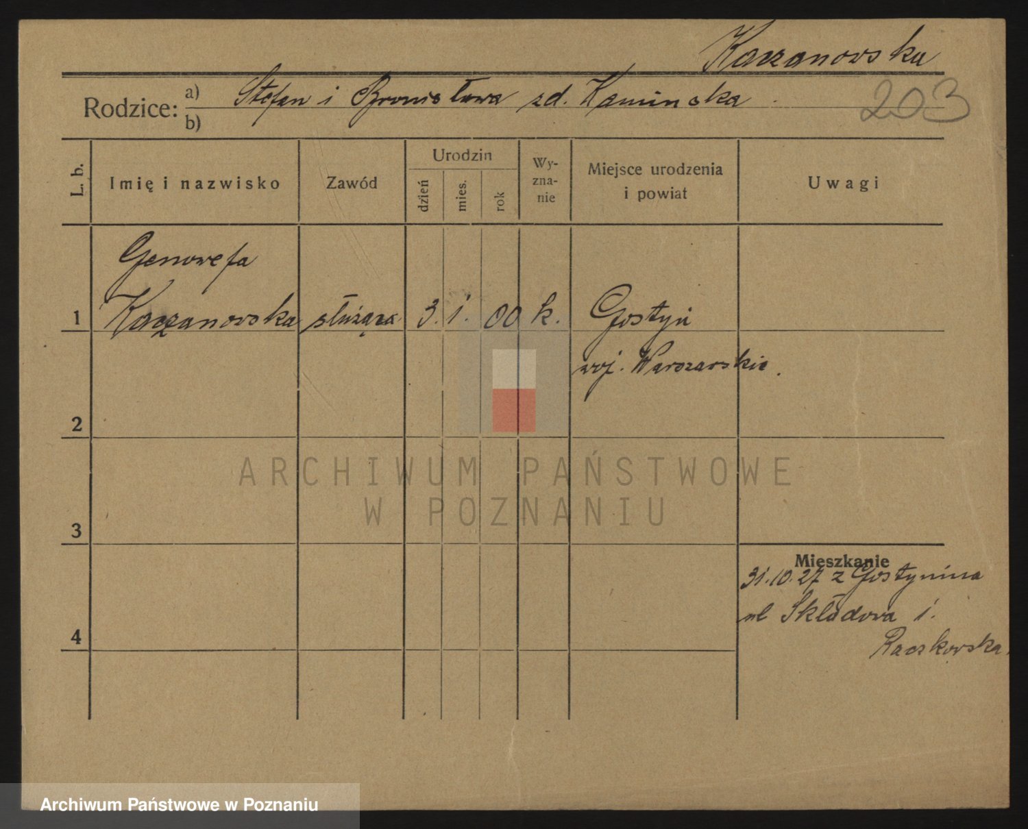 Podgląd karty osobowej dostępny jest po kliknięciu na nazwisko lub ikonkę karty. Można dokonywać powiększenia (ikony na górze) lub przechodzić między kolejnymi skanami (strzałki po bokach).