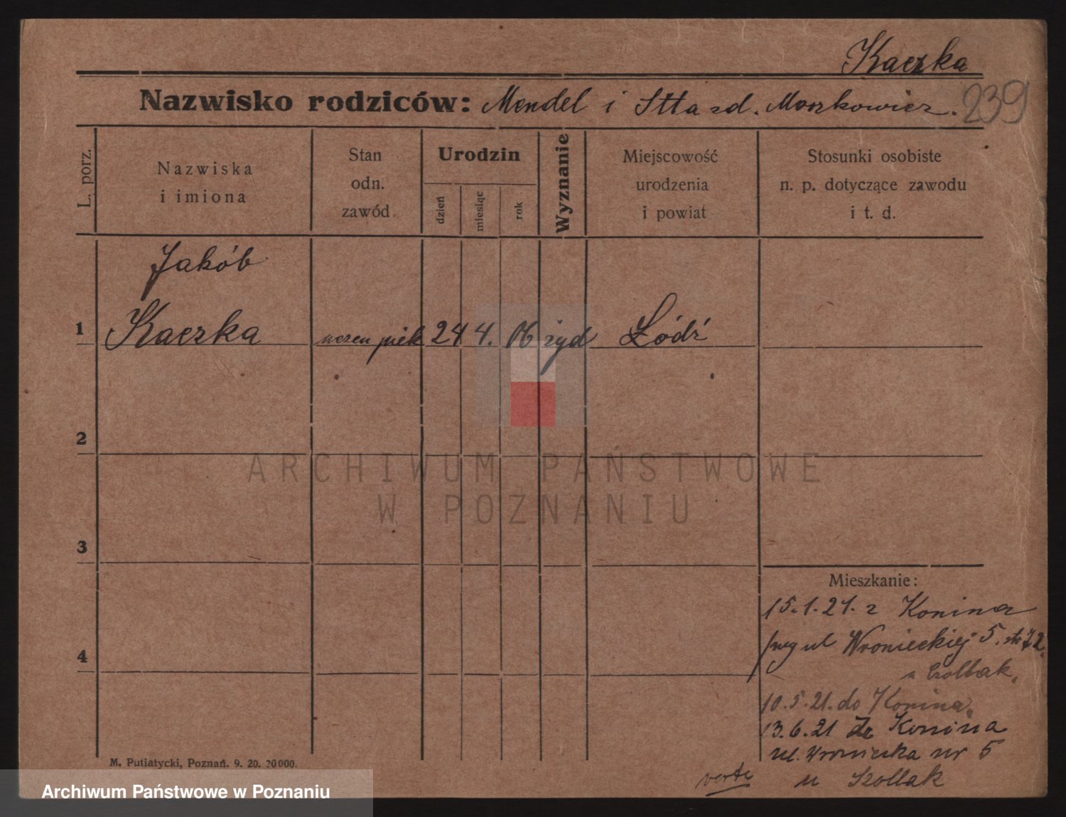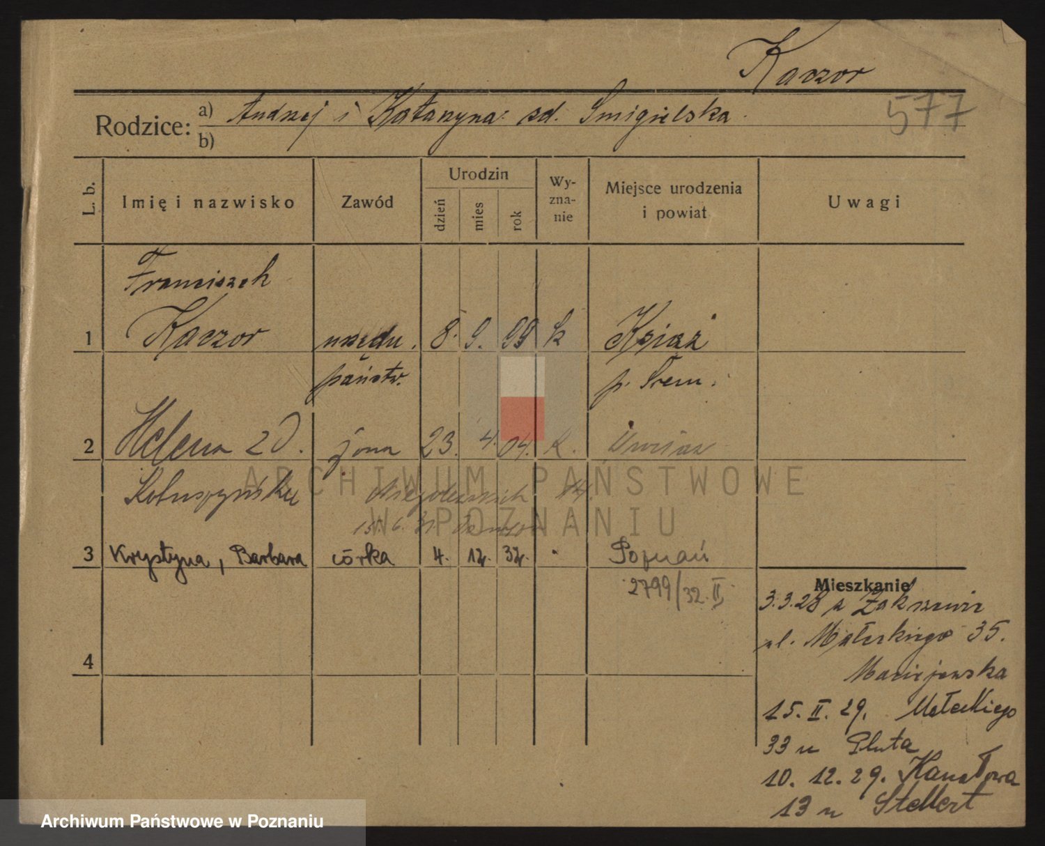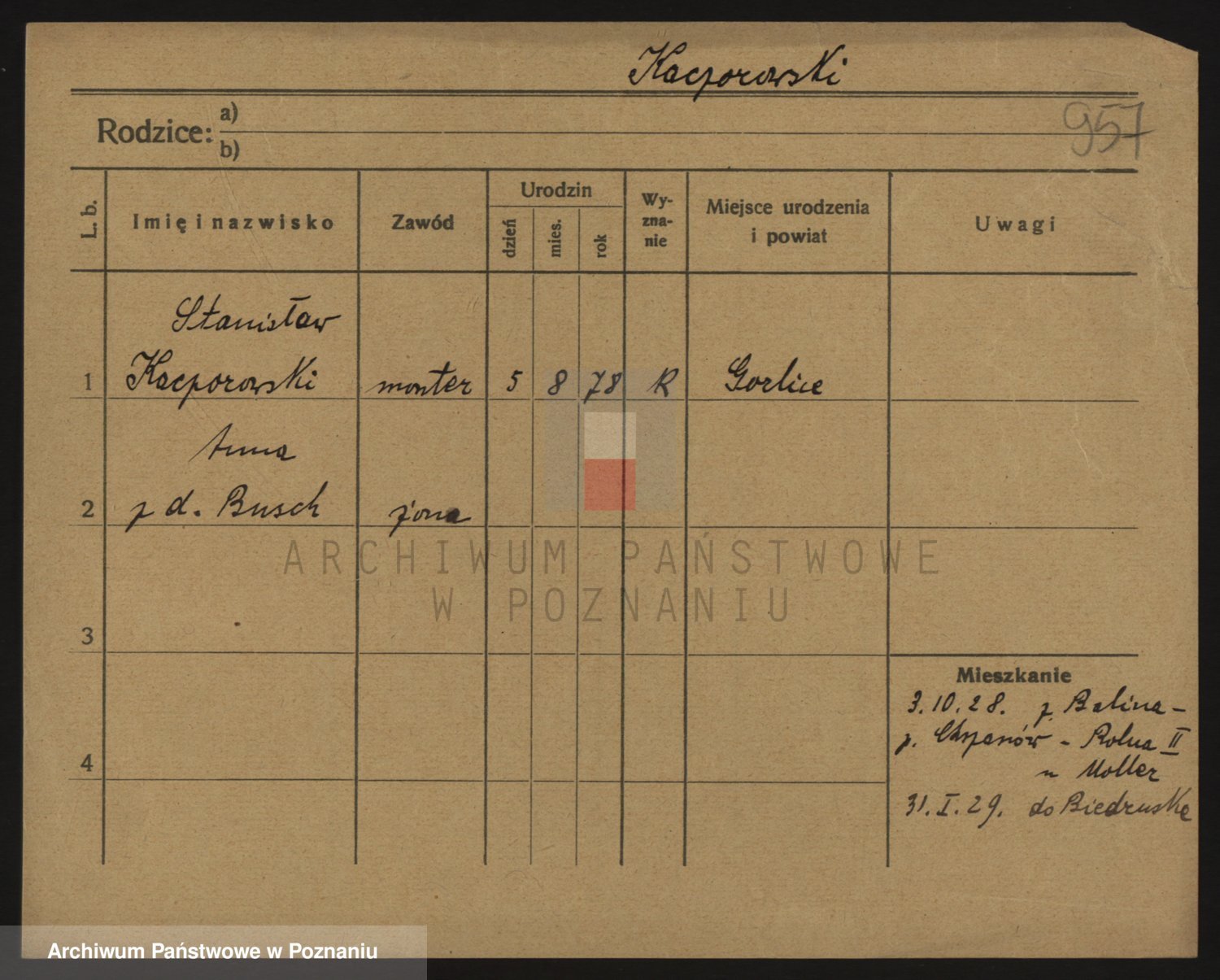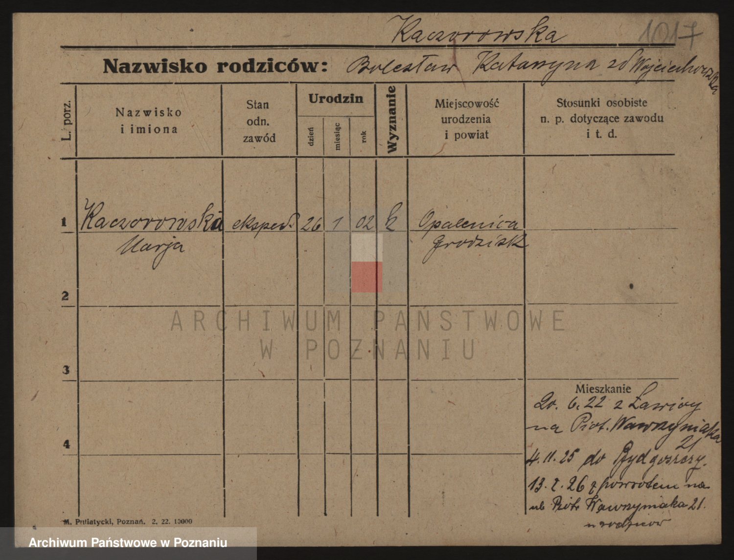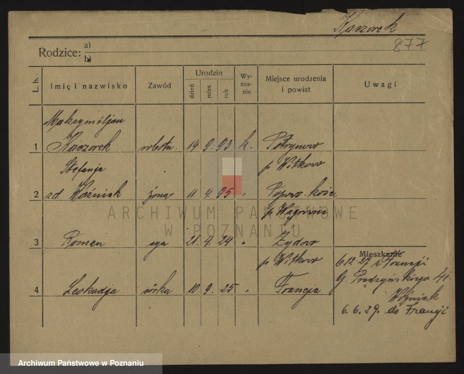 Podgląd karty osobowej dostępny jest po kliknięciu na nazwisko lub ikonkę karty. Można dokonywać powiększenia (ikony na górze) lub przechodzić między kolejnymi skanami (strzałki po bokach).