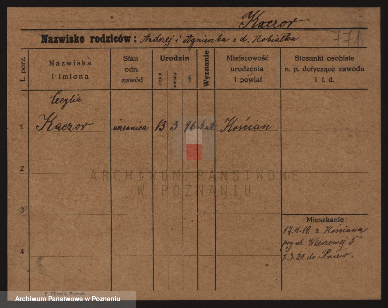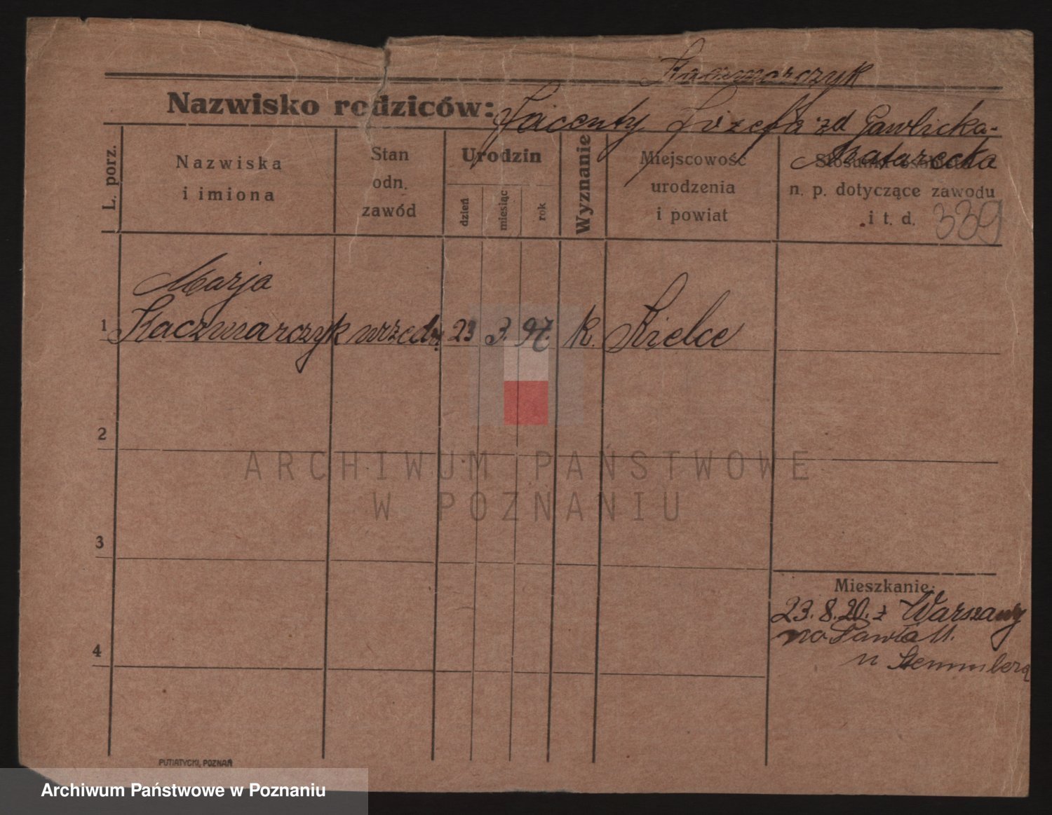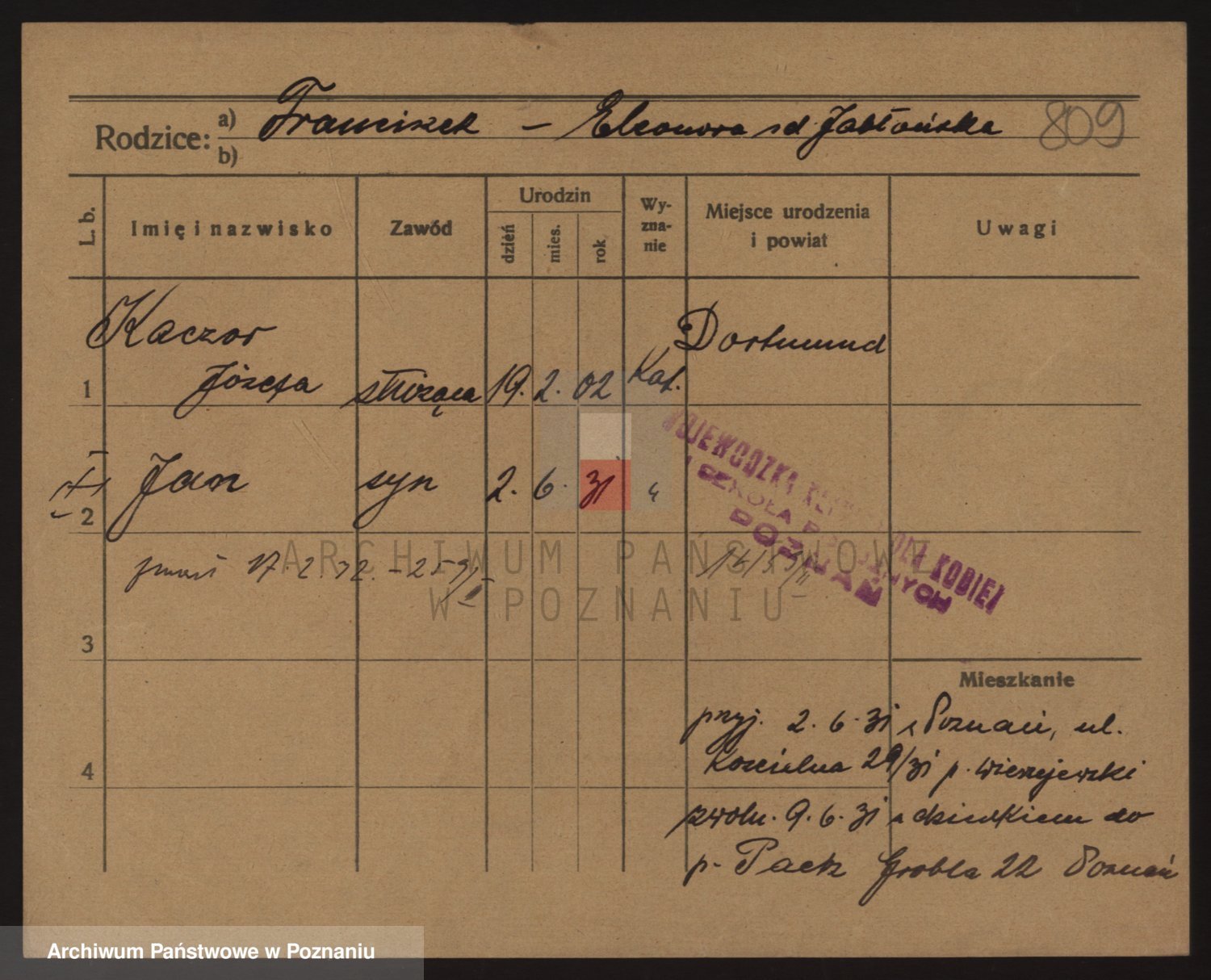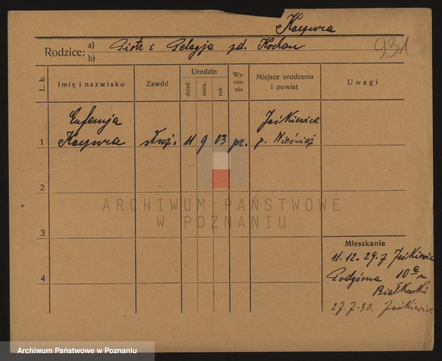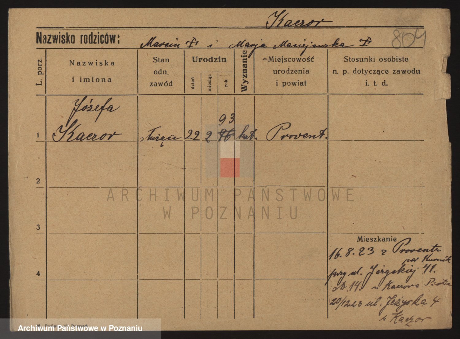 Podgląd karty osobowej dostępny jest po kliknięciu na nazwisko lub ikonkę karty. Można dokonywać powiększenia (ikony na górze) lub przechodzić między kolejnymi skanami (strzałki po bokach).