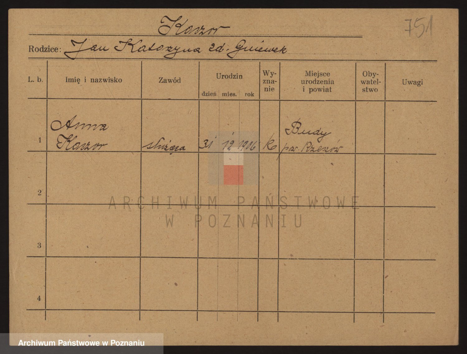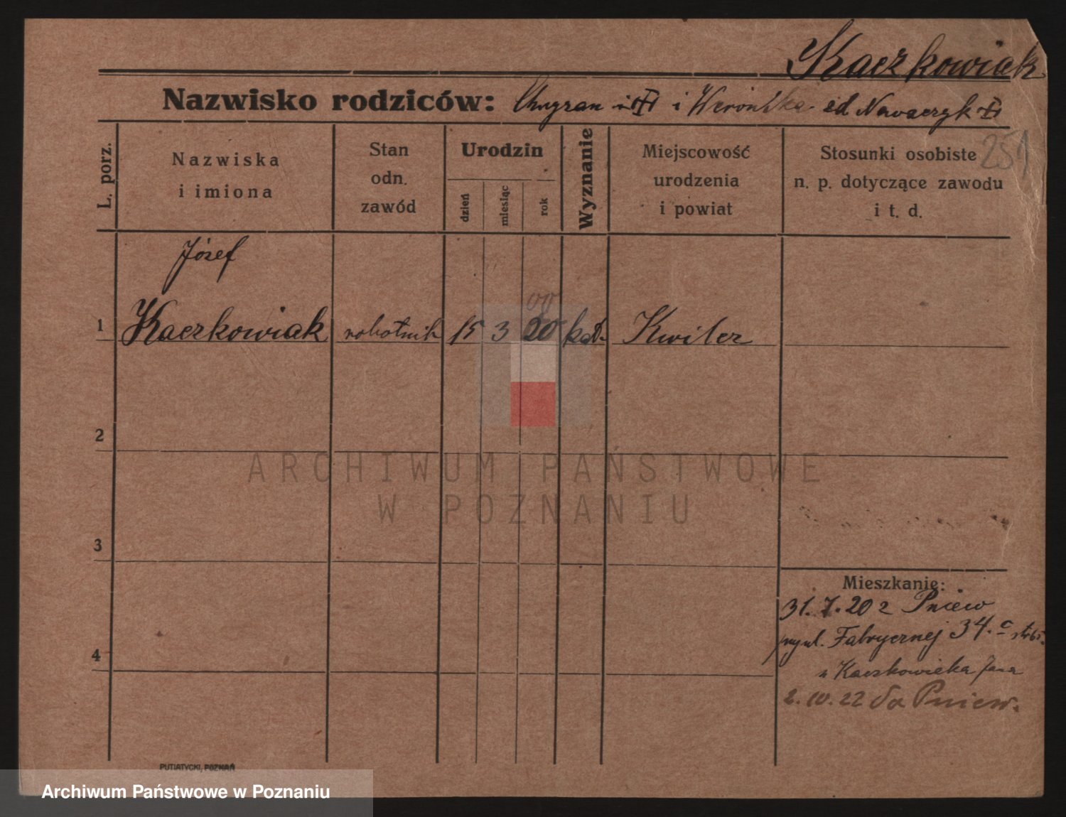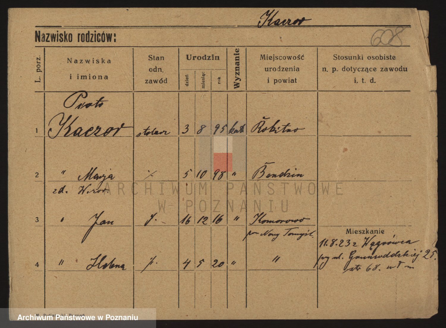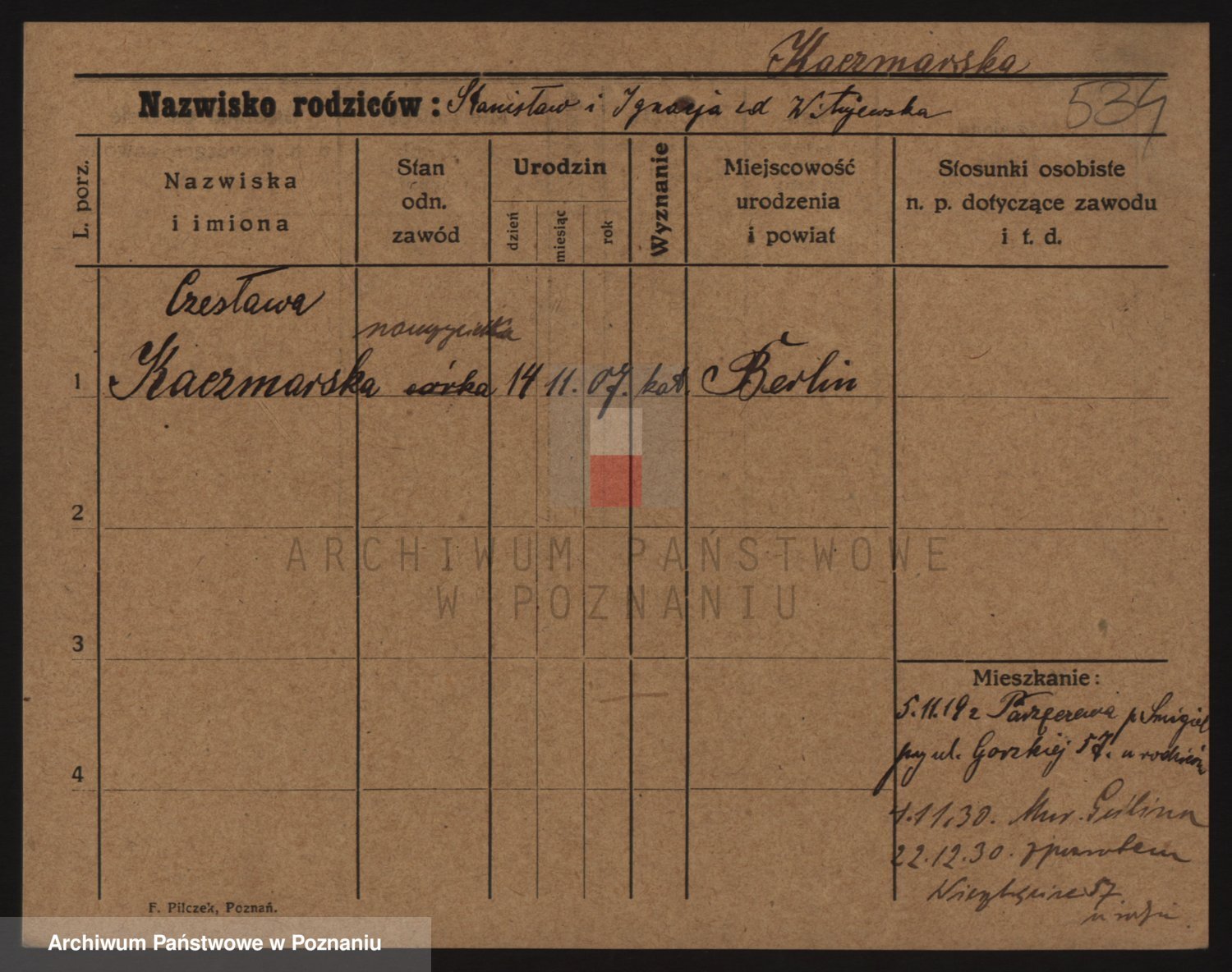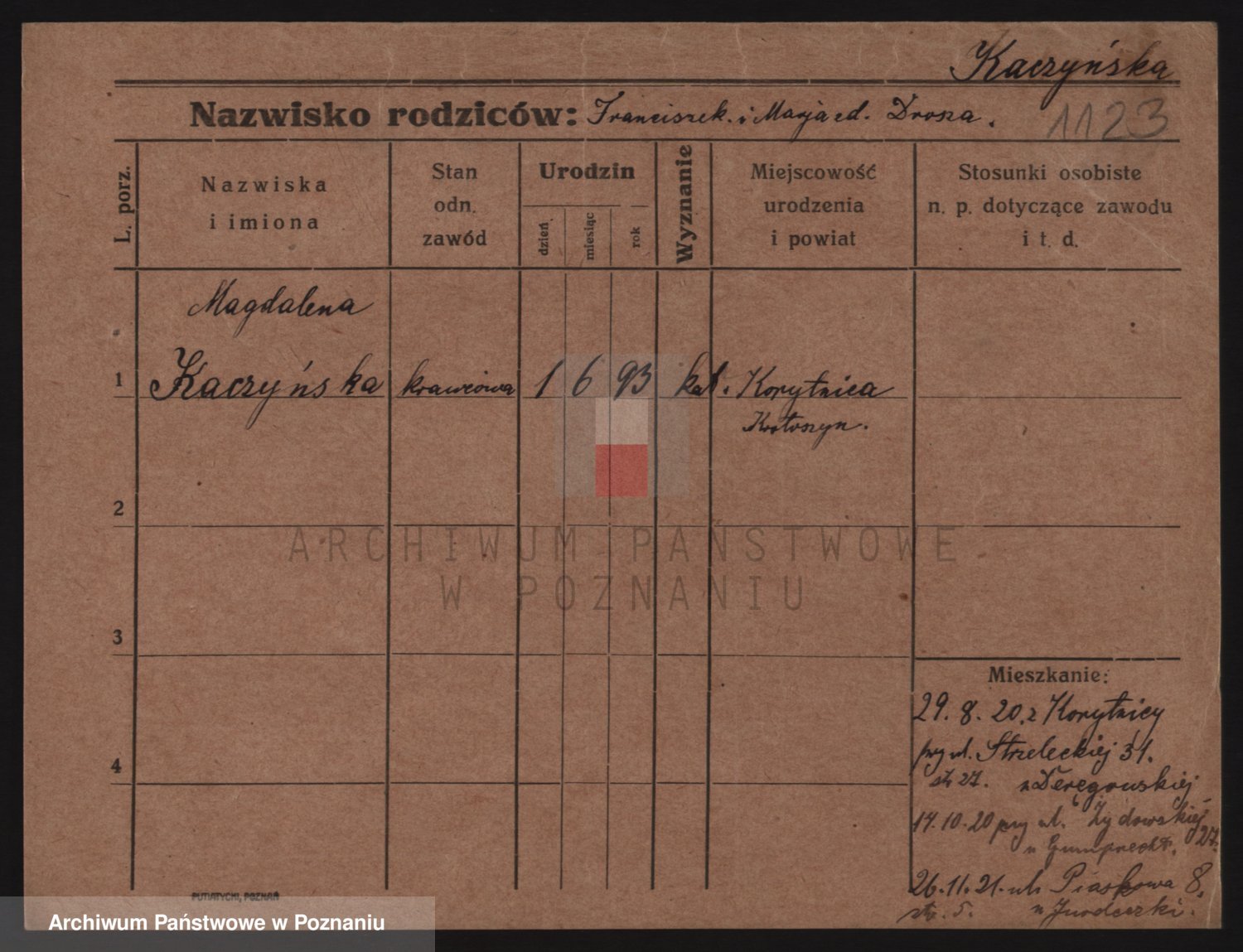 Podgląd karty osobowej dostępny jest po kliknięciu na nazwisko lub ikonkę karty. Można dokonywać powiększenia (ikony na górze) lub przechodzić między kolejnymi skanami (strzałki po bokach).