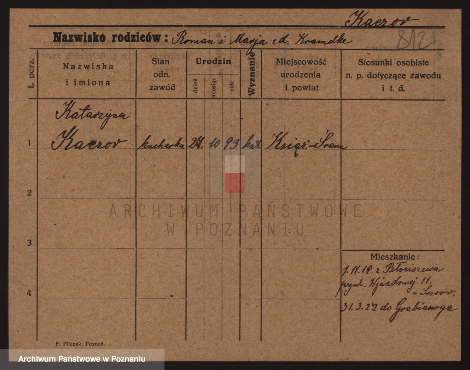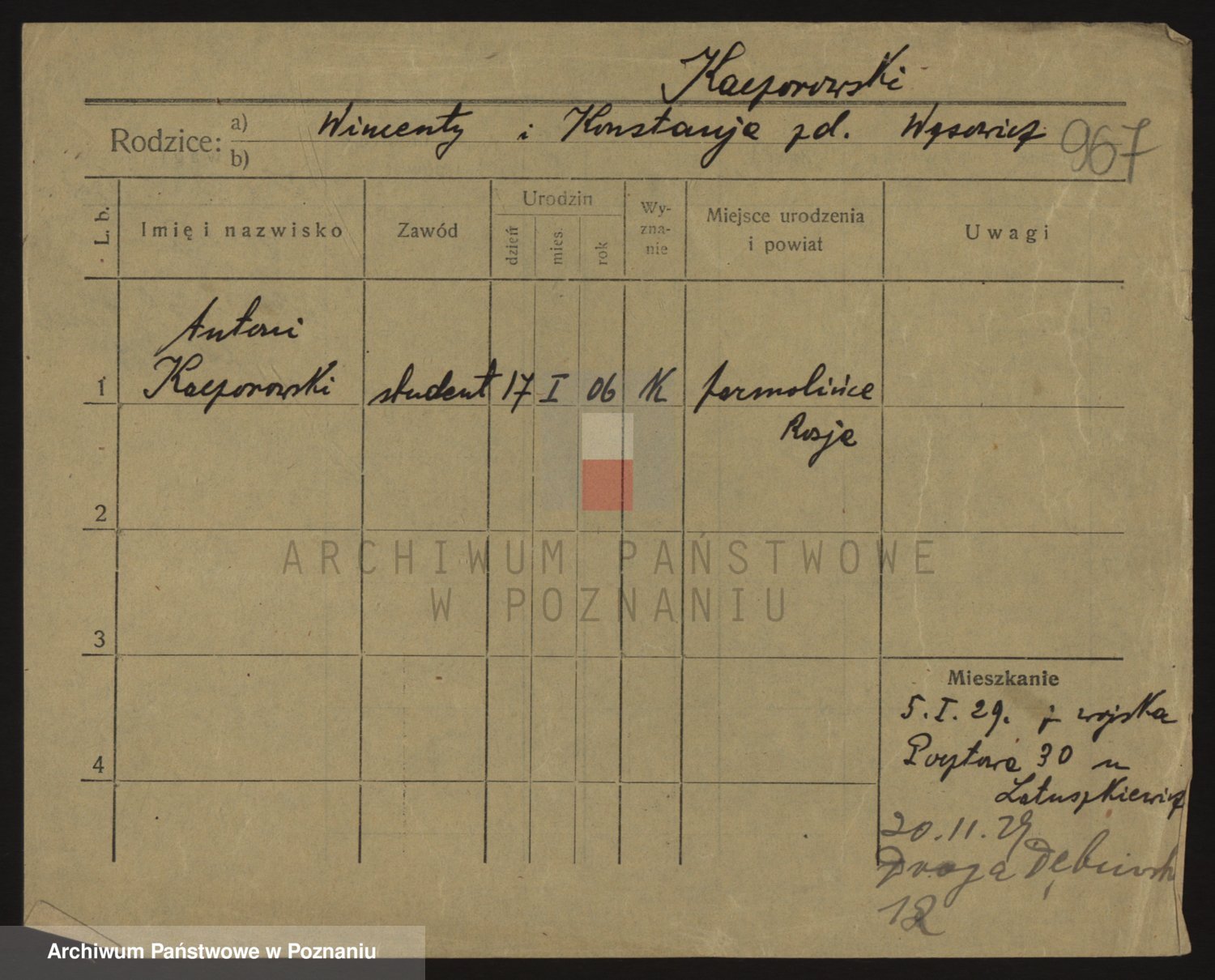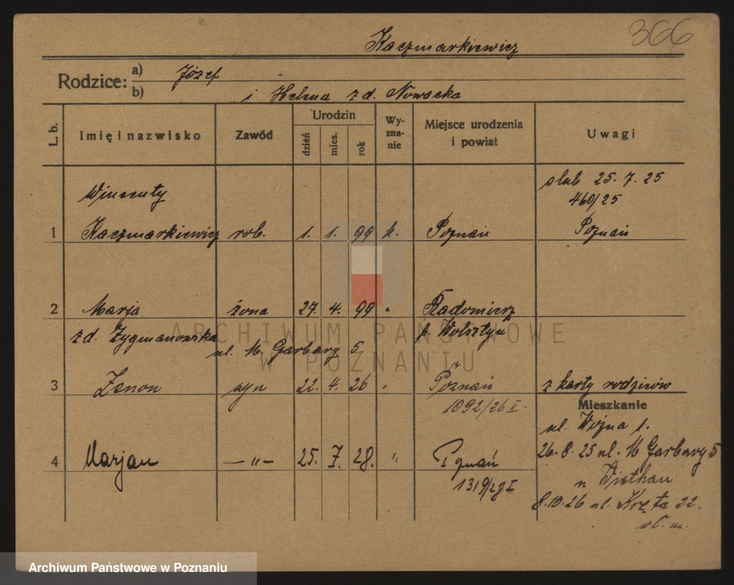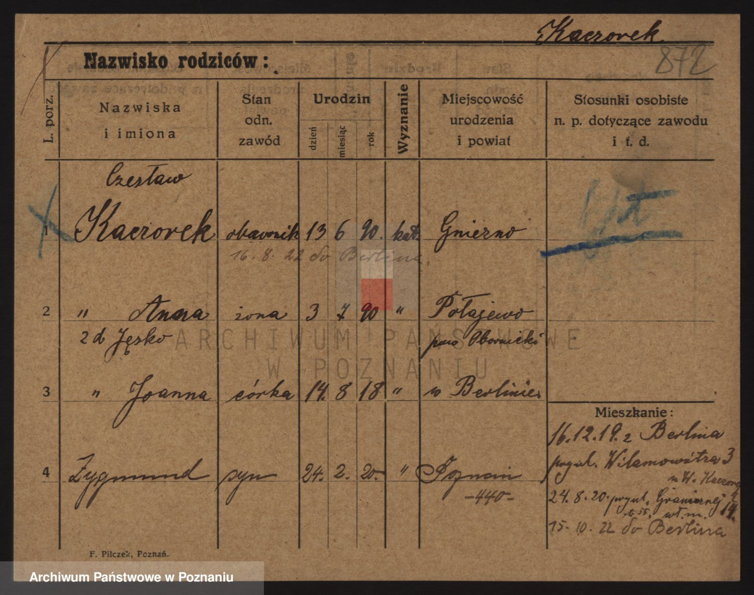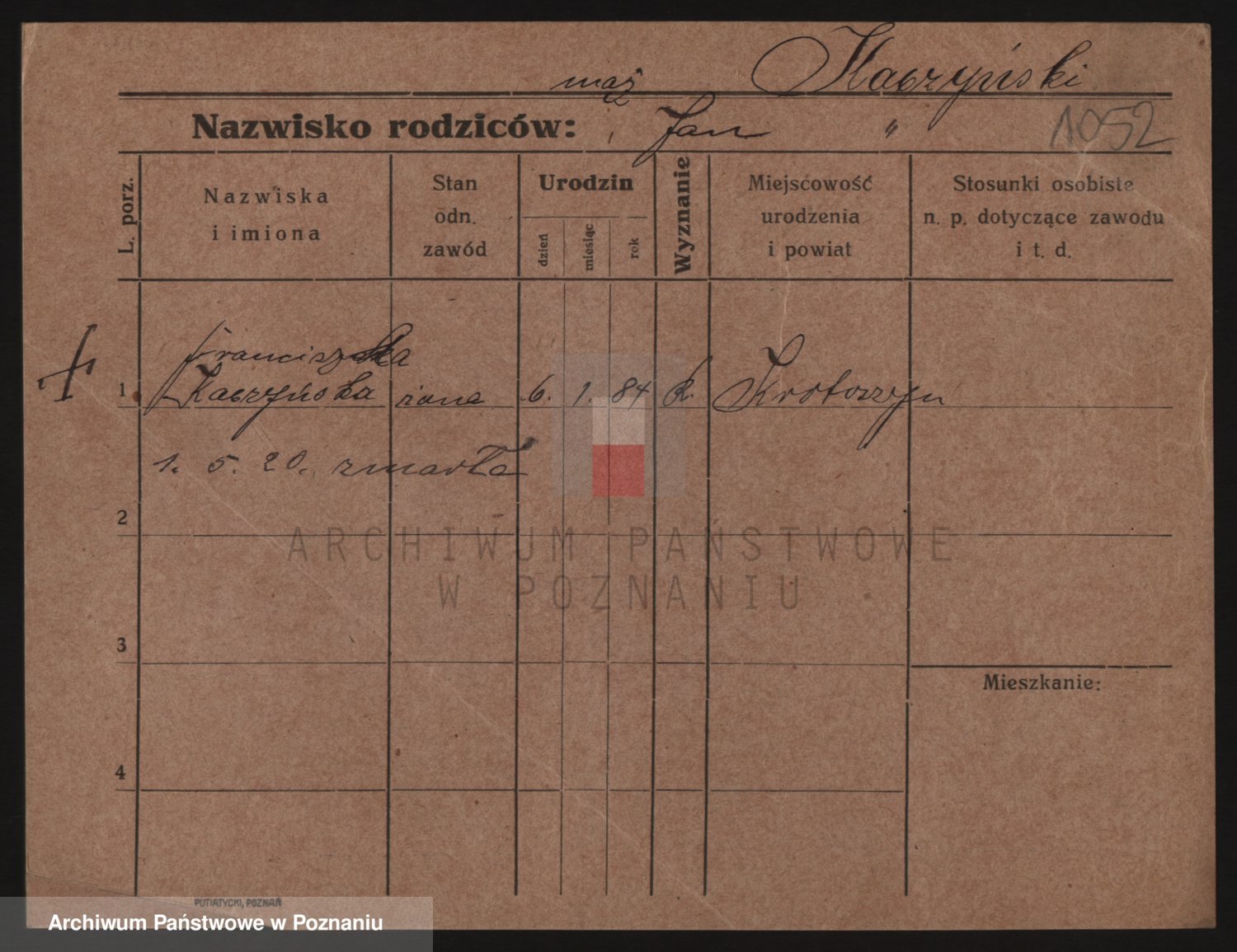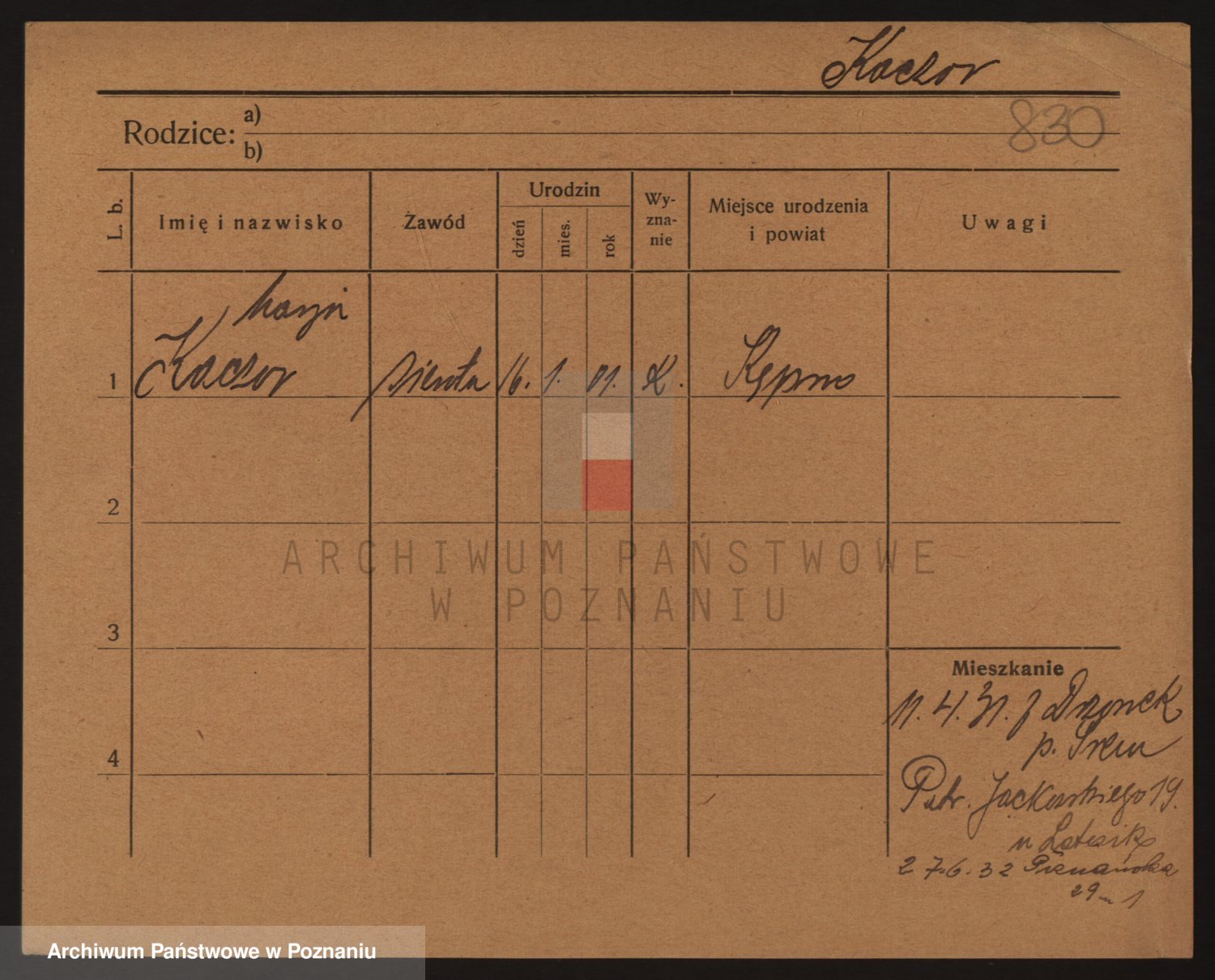 Podgląd karty osobowej dostępny jest po kliknięciu na nazwisko lub ikonkę karty. Można dokonywać powiększenia (ikony na górze) lub przechodzić między kolejnymi skanami (strzałki po bokach).