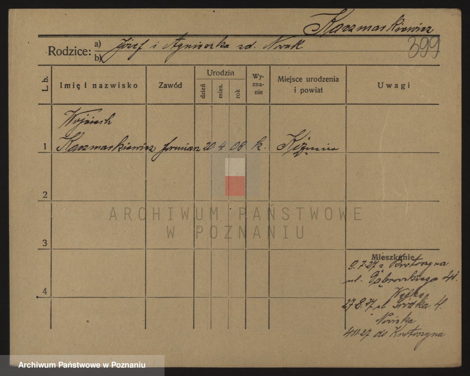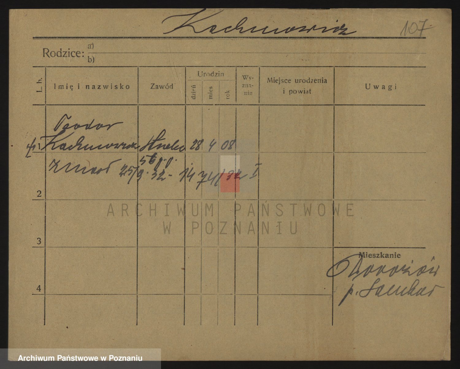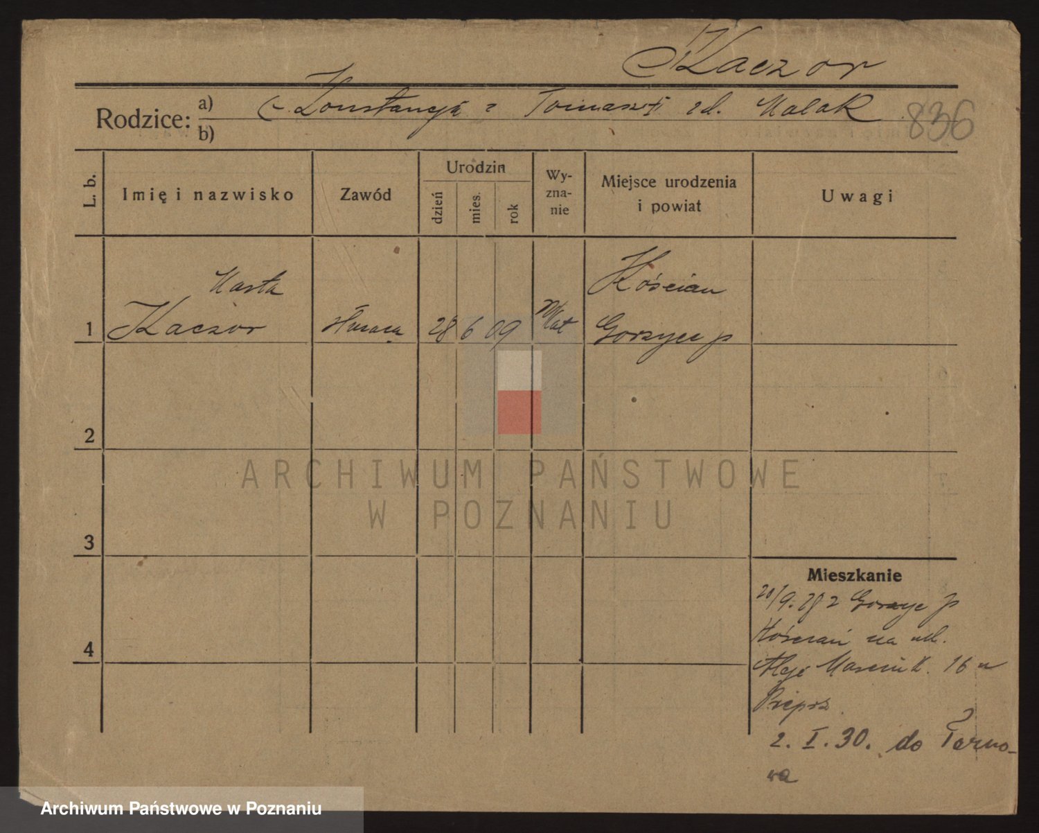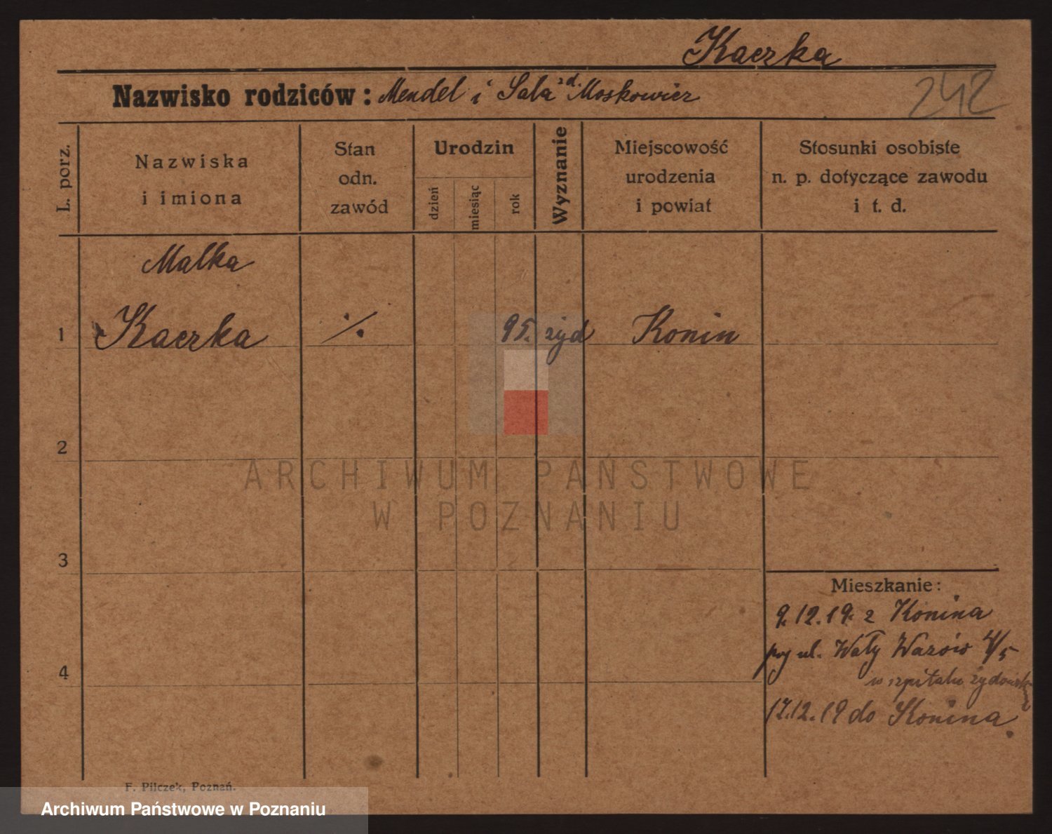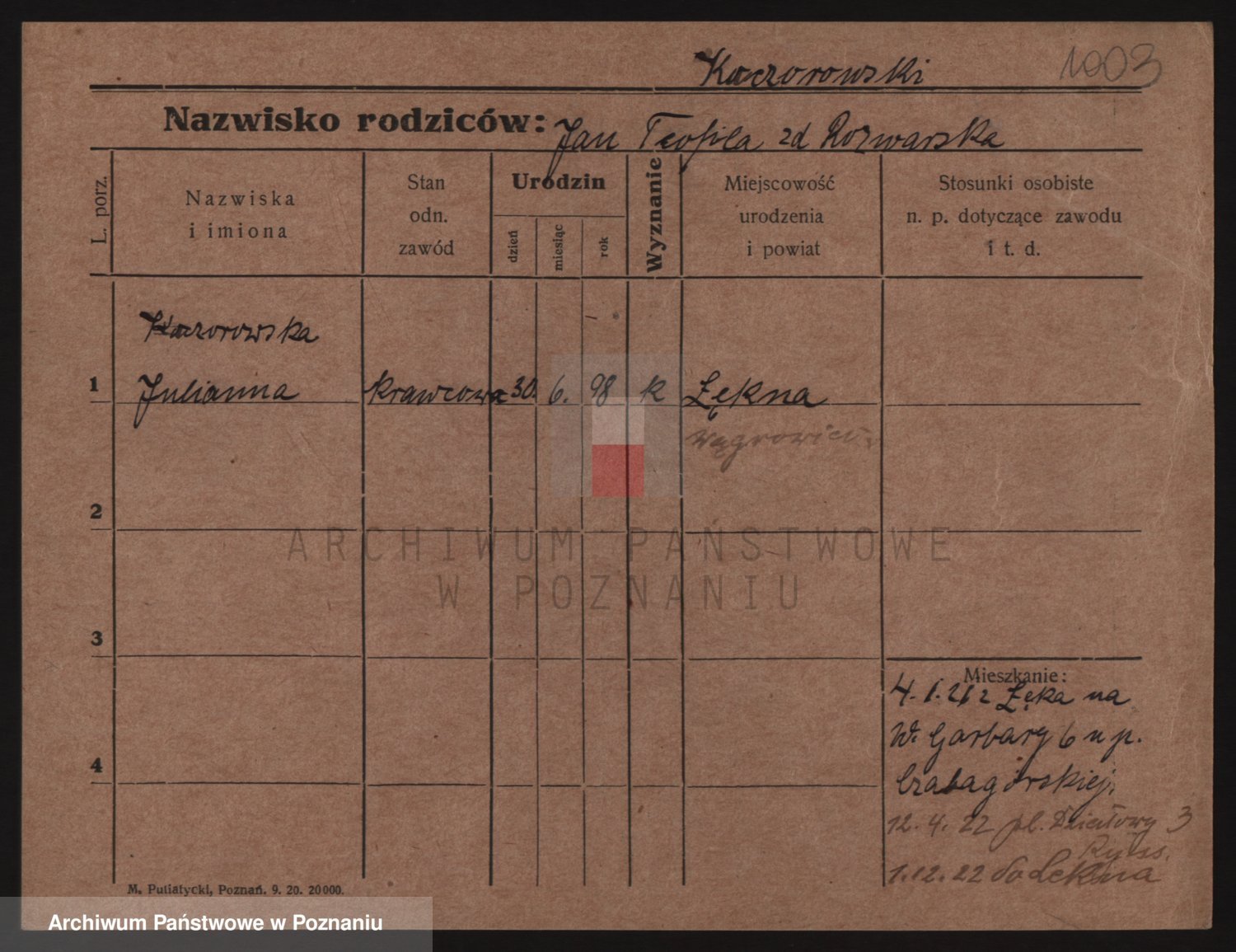 Podgląd karty osobowej dostępny jest po kliknięciu na nazwisko lub ikonkę karty. Można dokonywać powiększenia (ikony na górze) lub przechodzić między kolejnymi skanami (strzałki po bokach).
