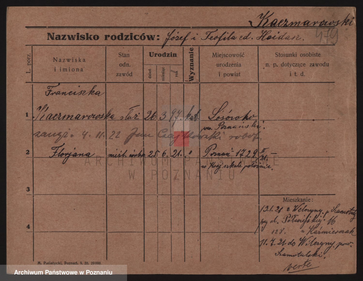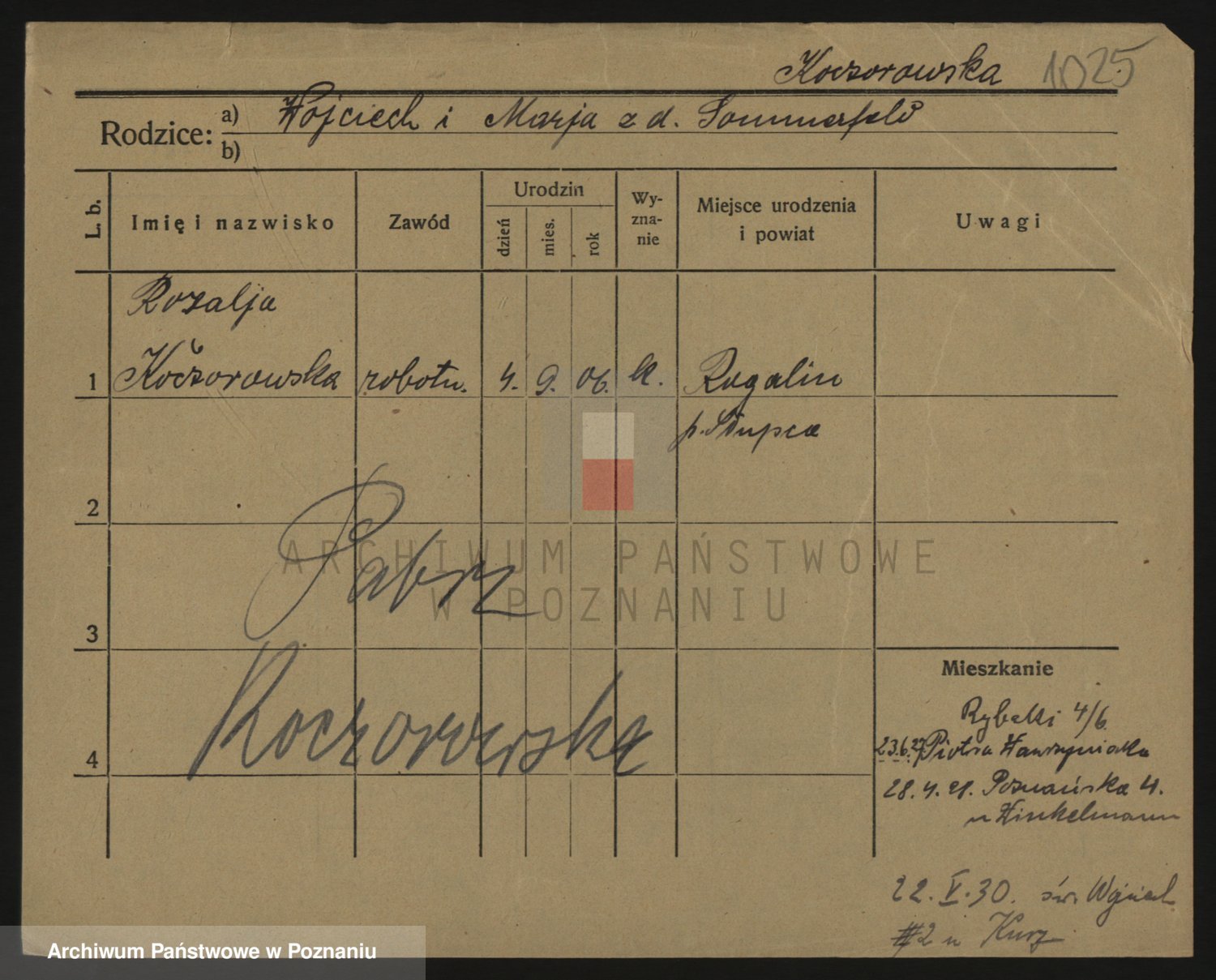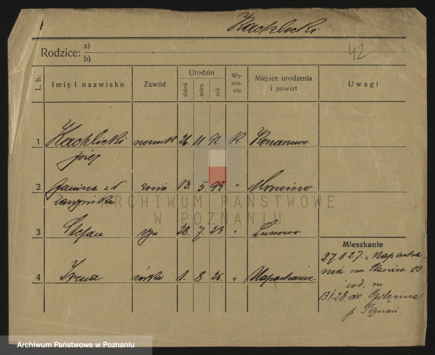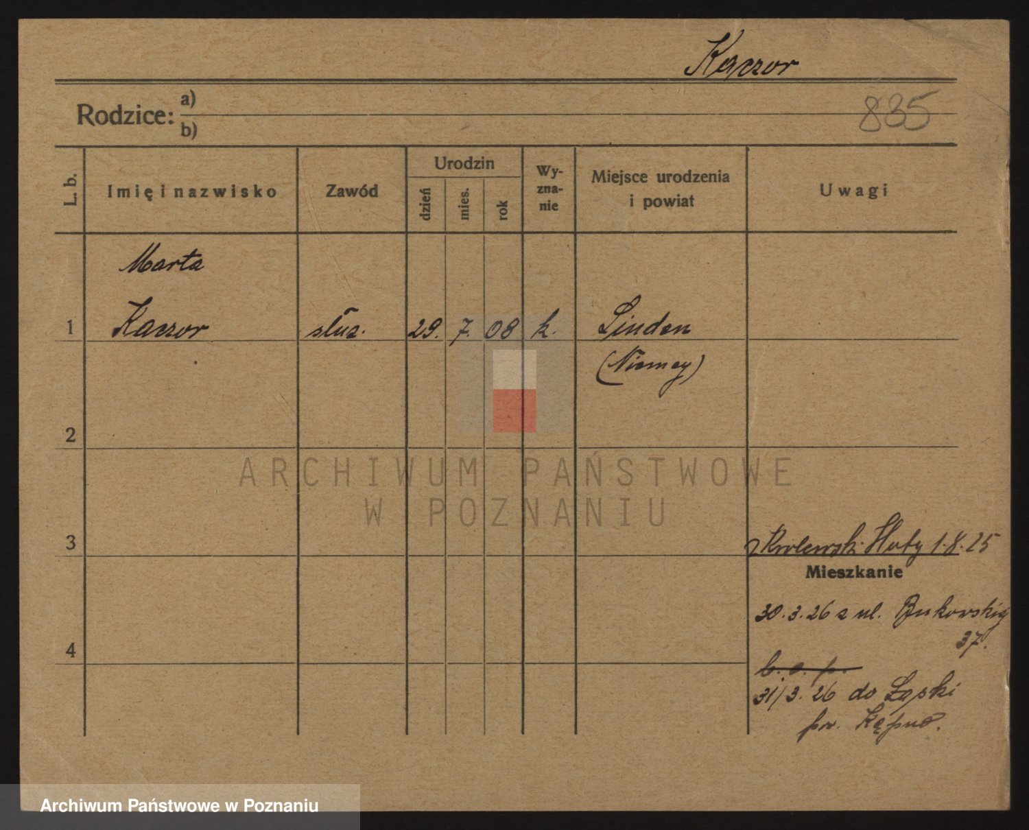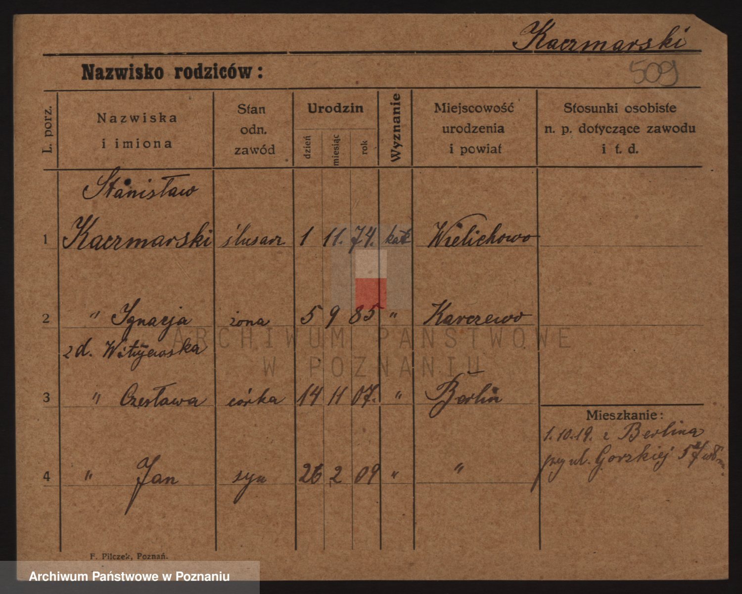 Podgląd karty osobowej dostępny jest po kliknięciu na nazwisko lub ikonkę karty. Można dokonywać powiększenia (ikony na górze) lub przechodzić między kolejnymi skanami (strzałki po bokach).
