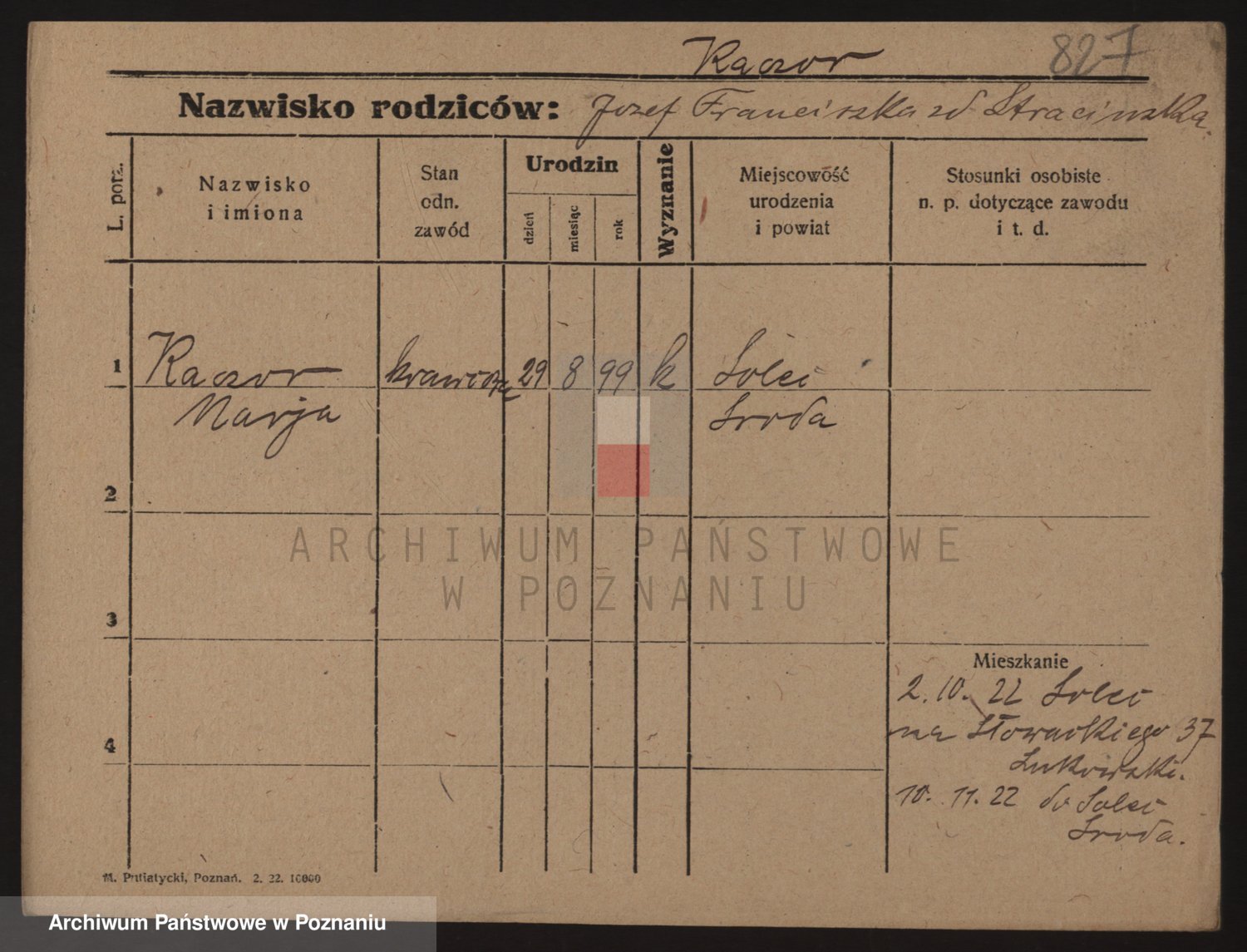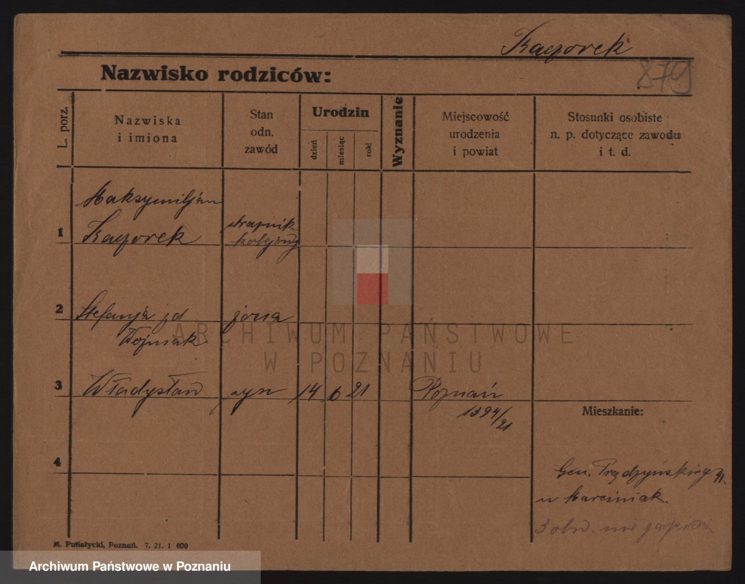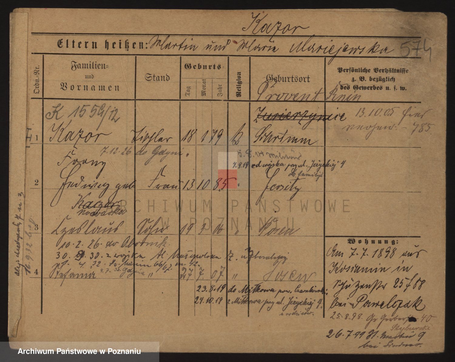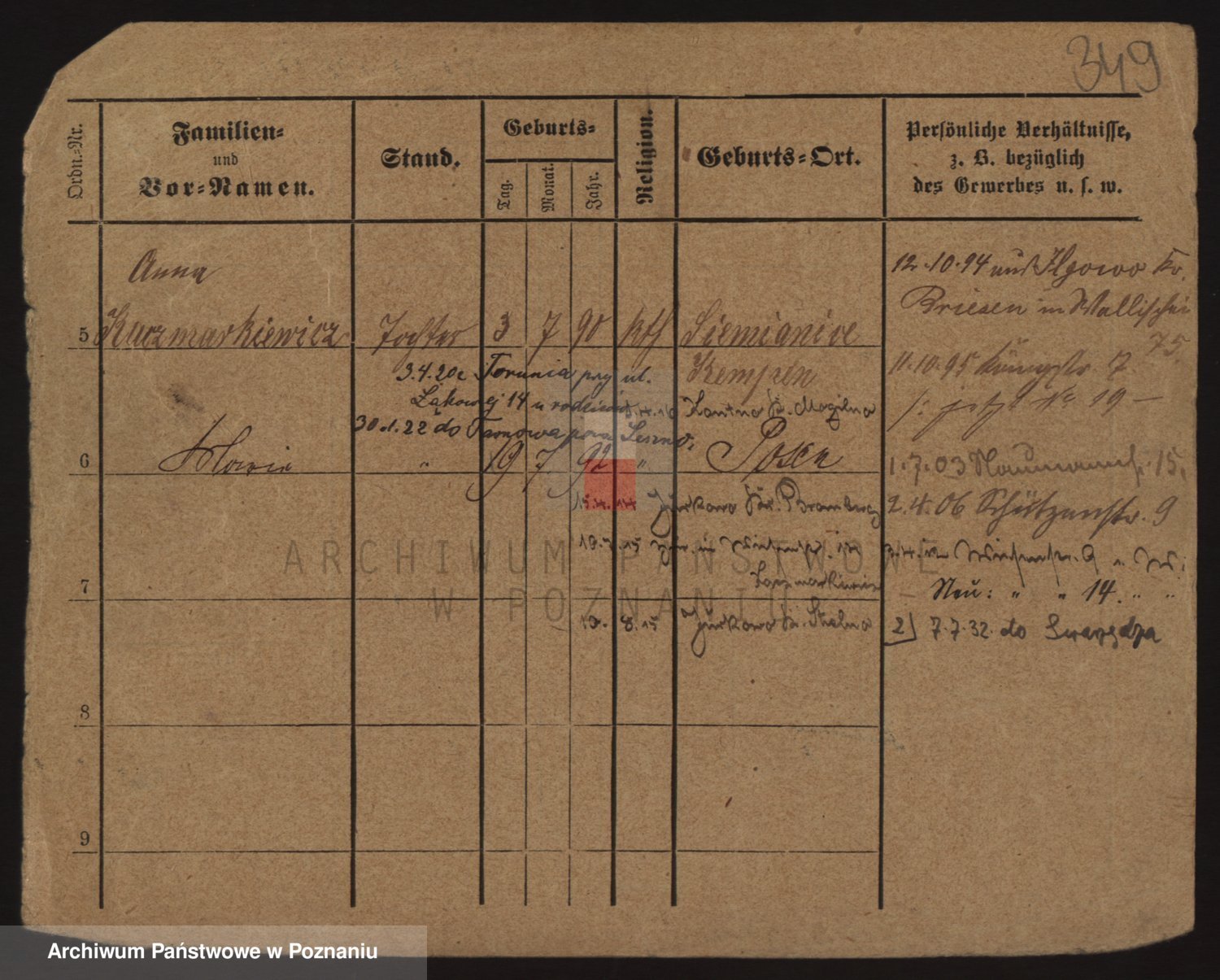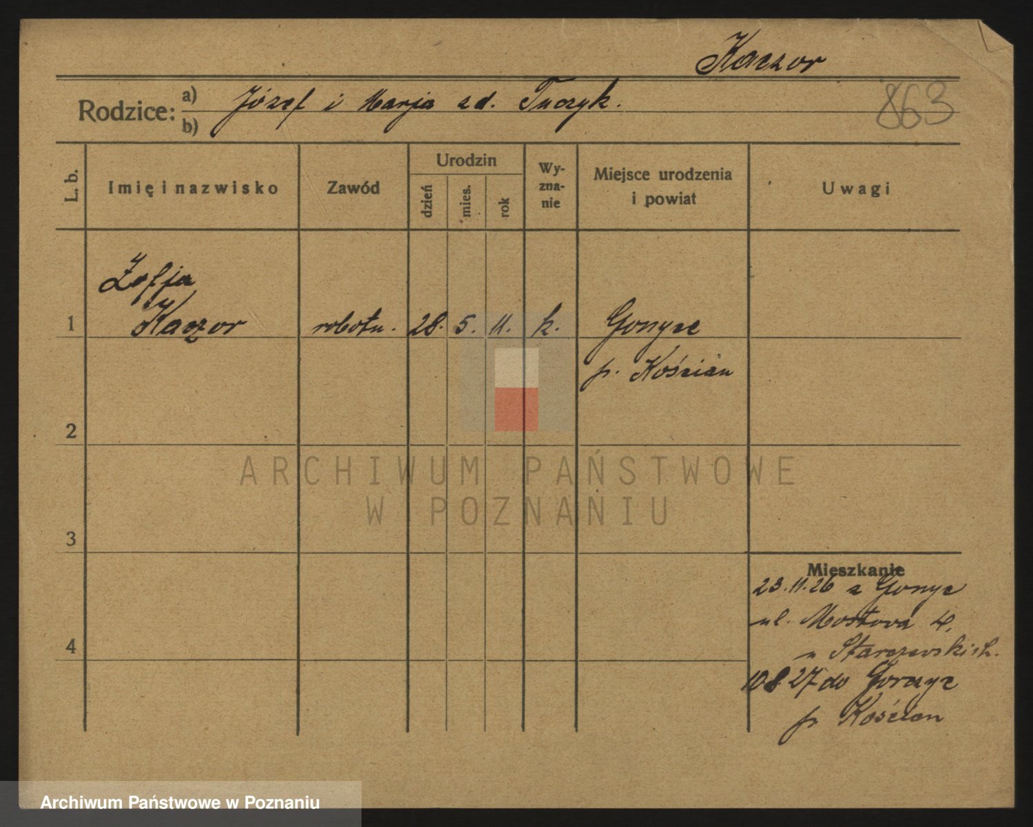 Podgląd karty osobowej dostępny jest po kliknięciu na nazwisko lub ikonkę karty. Można dokonywać powiększenia (ikony na górze) lub przechodzić między kolejnymi skanami (strzałki po bokach).
