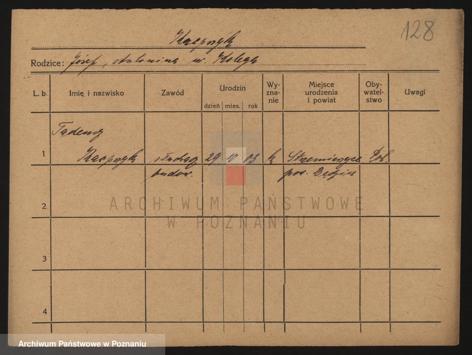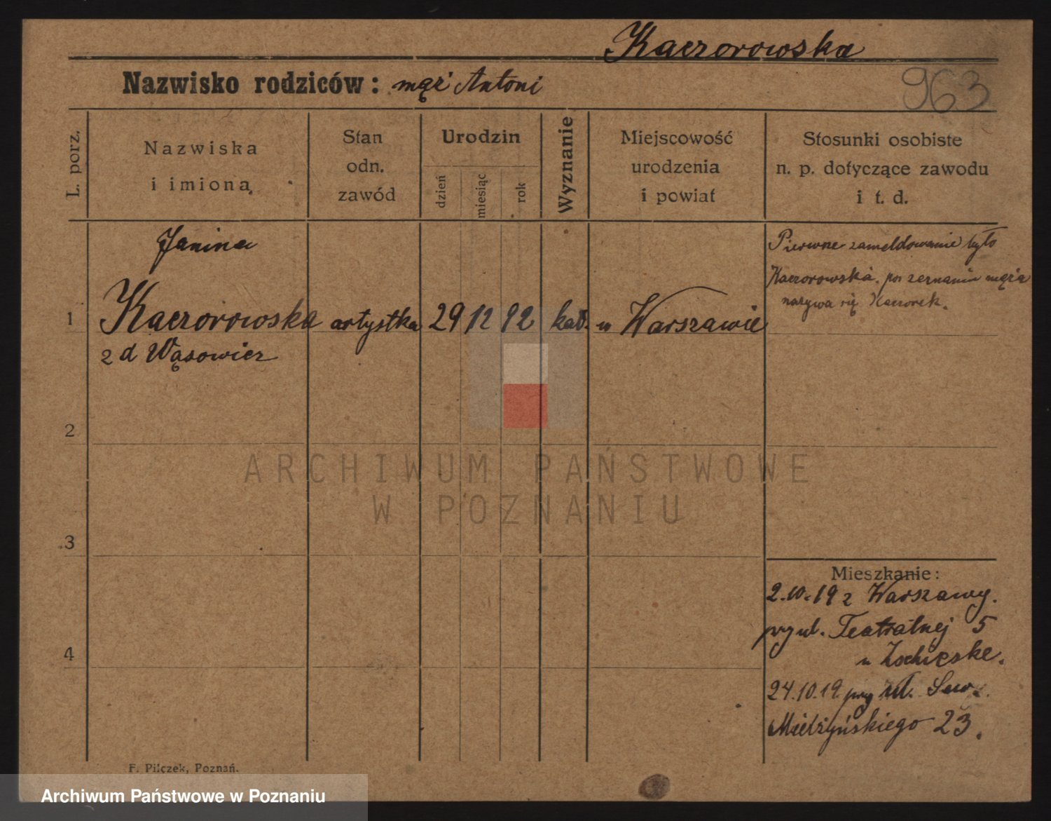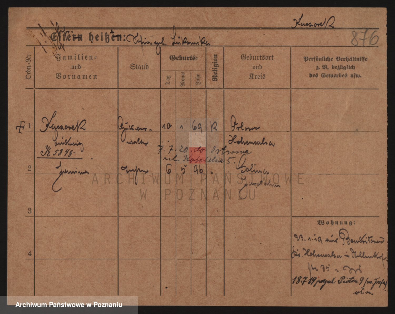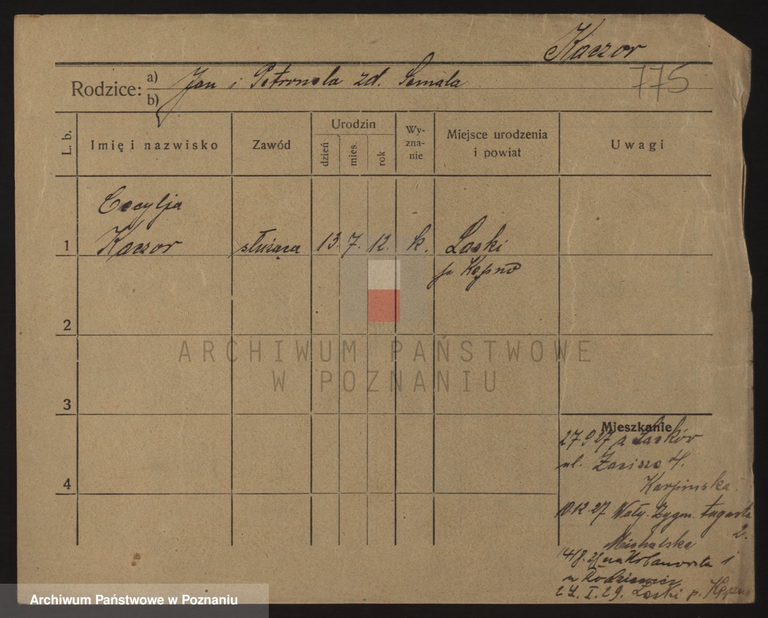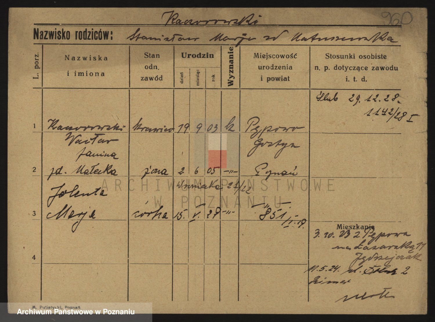 Podgląd karty osobowej dostępny jest po kliknięciu na nazwisko lub ikonkę karty. Można dokonywać powiększenia (ikony na górze) lub przechodzić między kolejnymi skanami (strzałki po bokach).