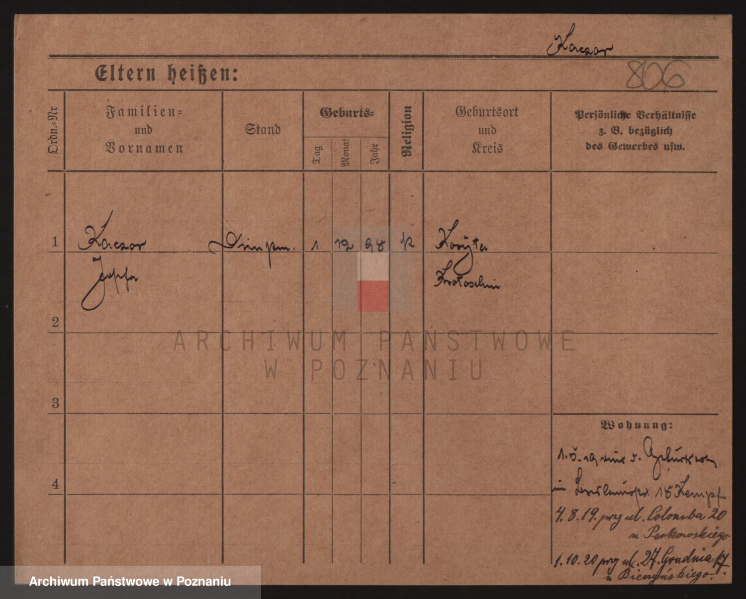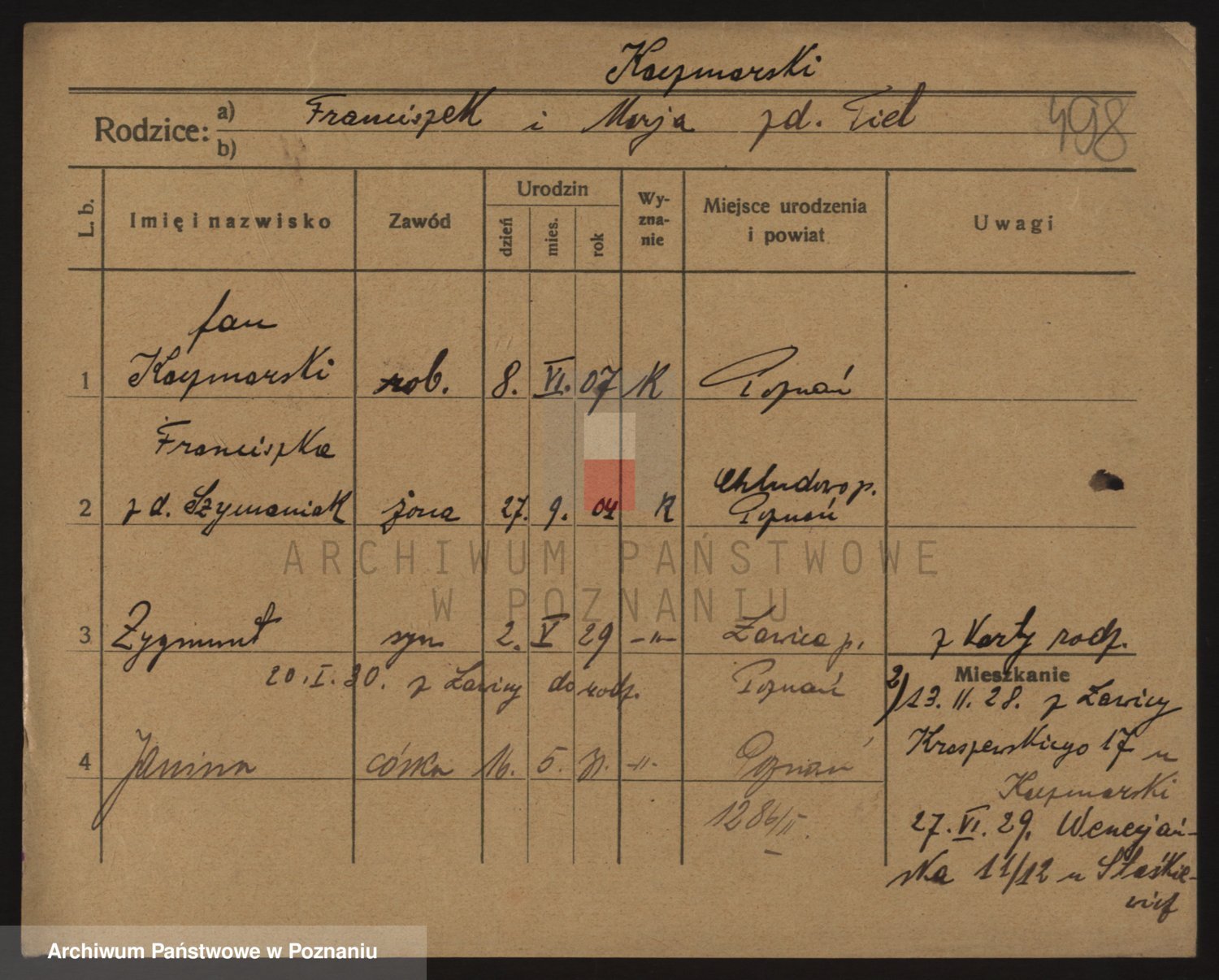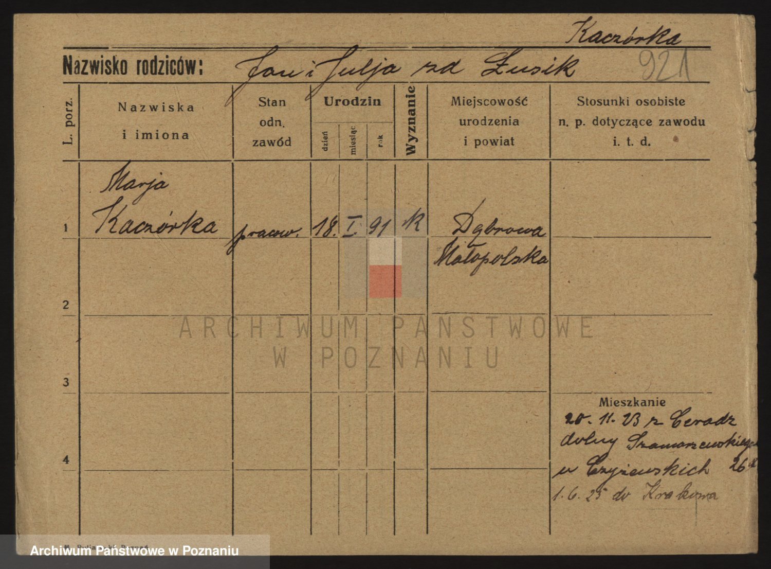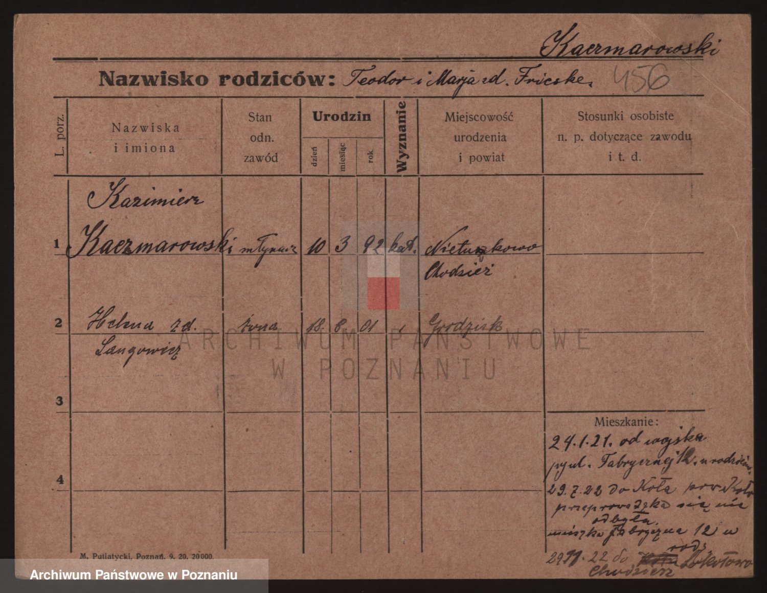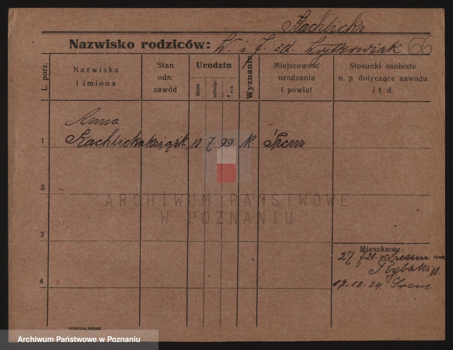 Podgląd karty osobowej dostępny jest po kliknięciu na nazwisko lub ikonkę karty. Można dokonywać powiększenia (ikony na górze) lub przechodzić między kolejnymi skanami (strzałki po bokach).