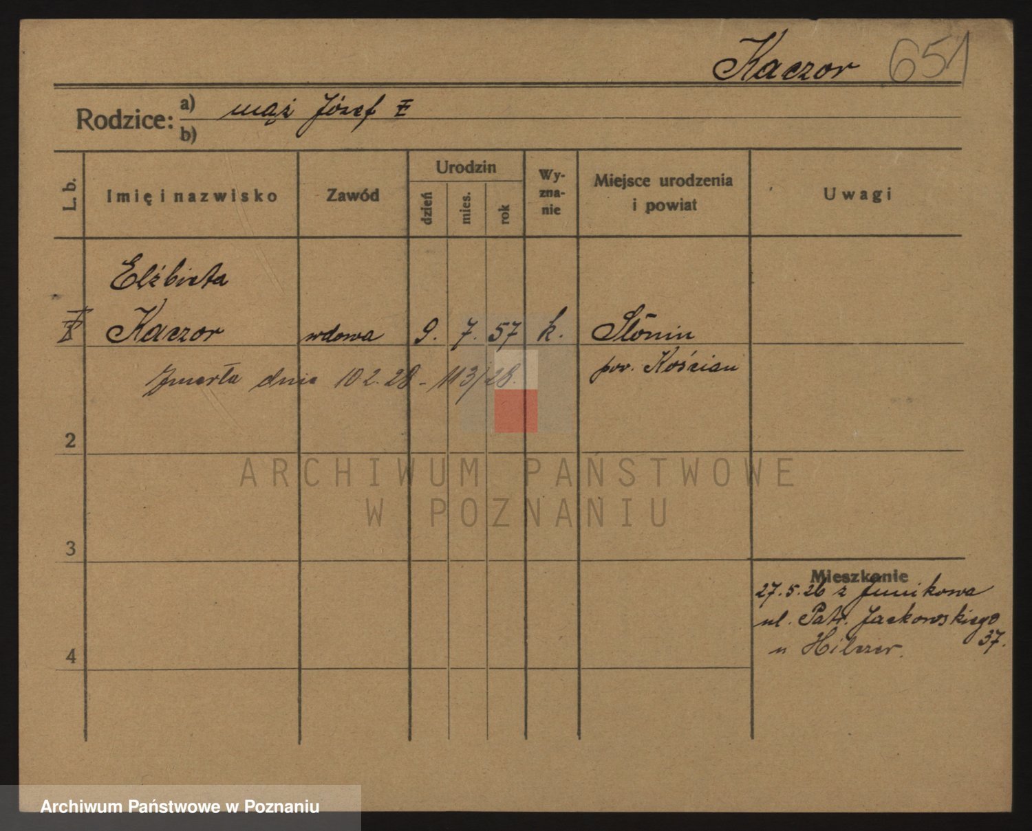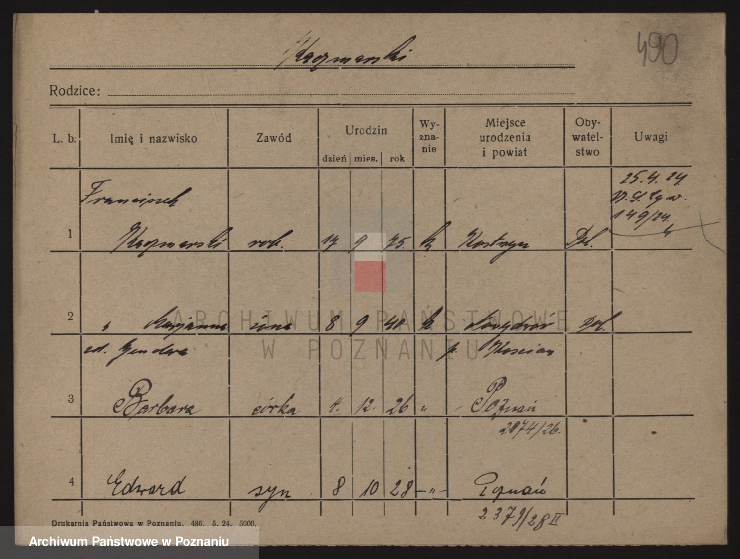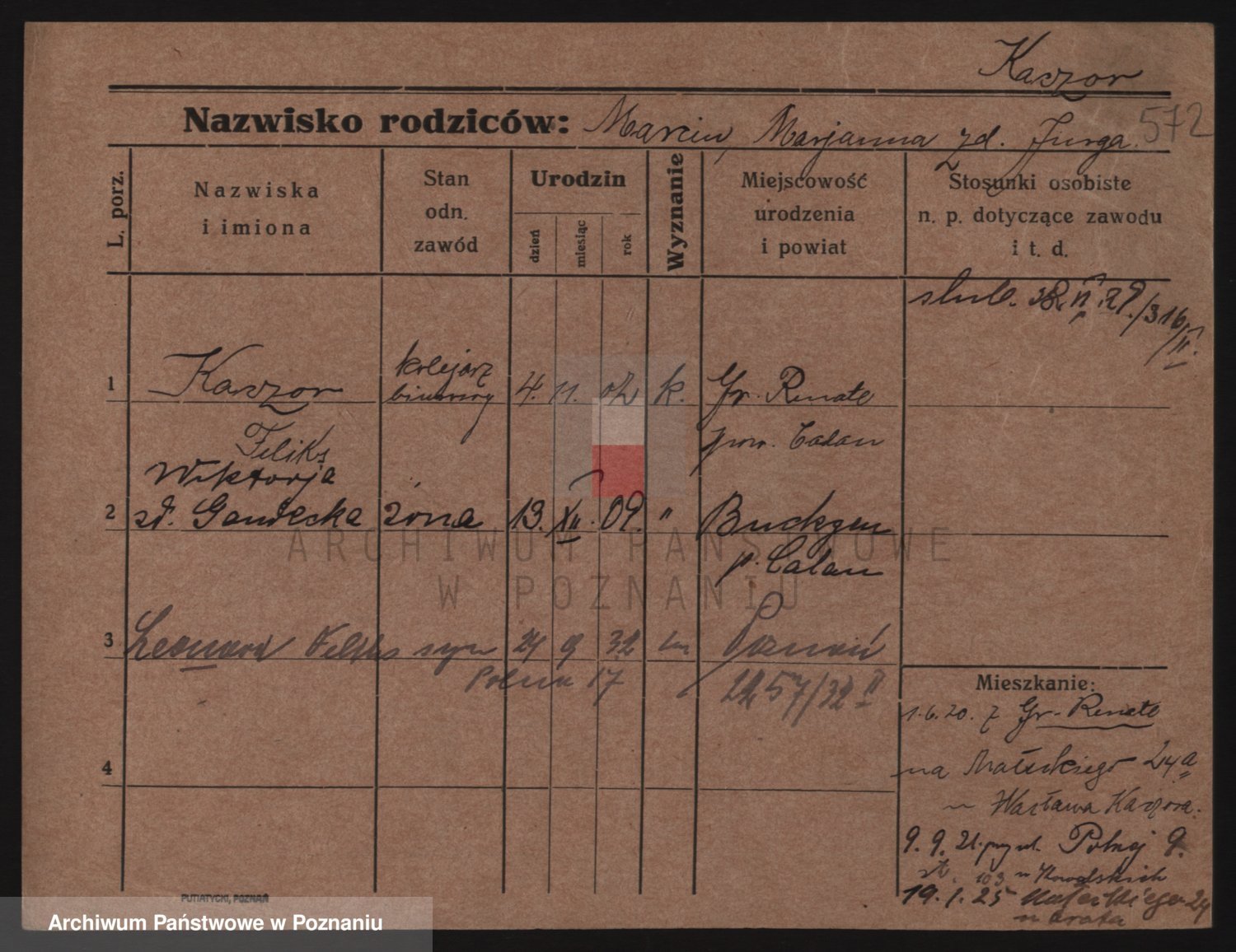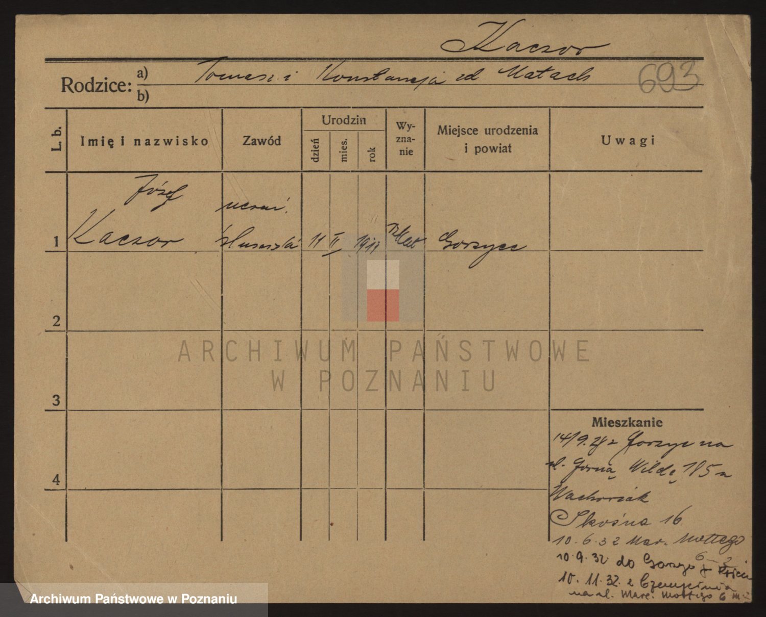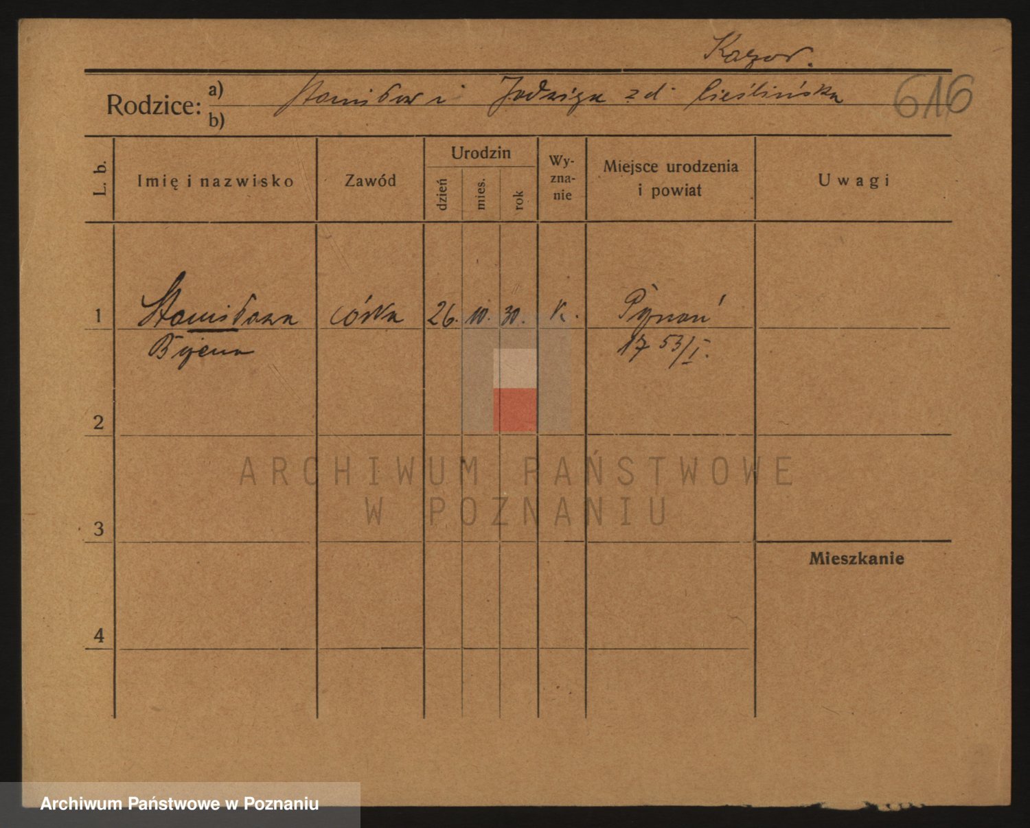 Podgląd karty osobowej dostępny jest po kliknięciu na nazwisko lub ikonkę karty. Można dokonywać powiększenia (ikony na górze) lub przechodzić między kolejnymi skanami (strzałki po bokach).