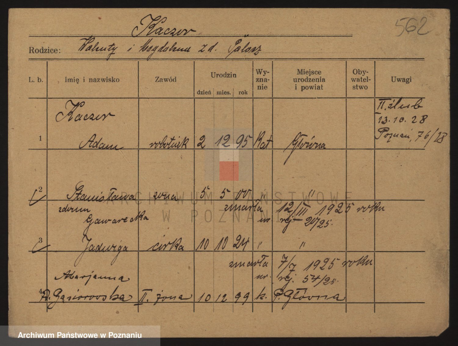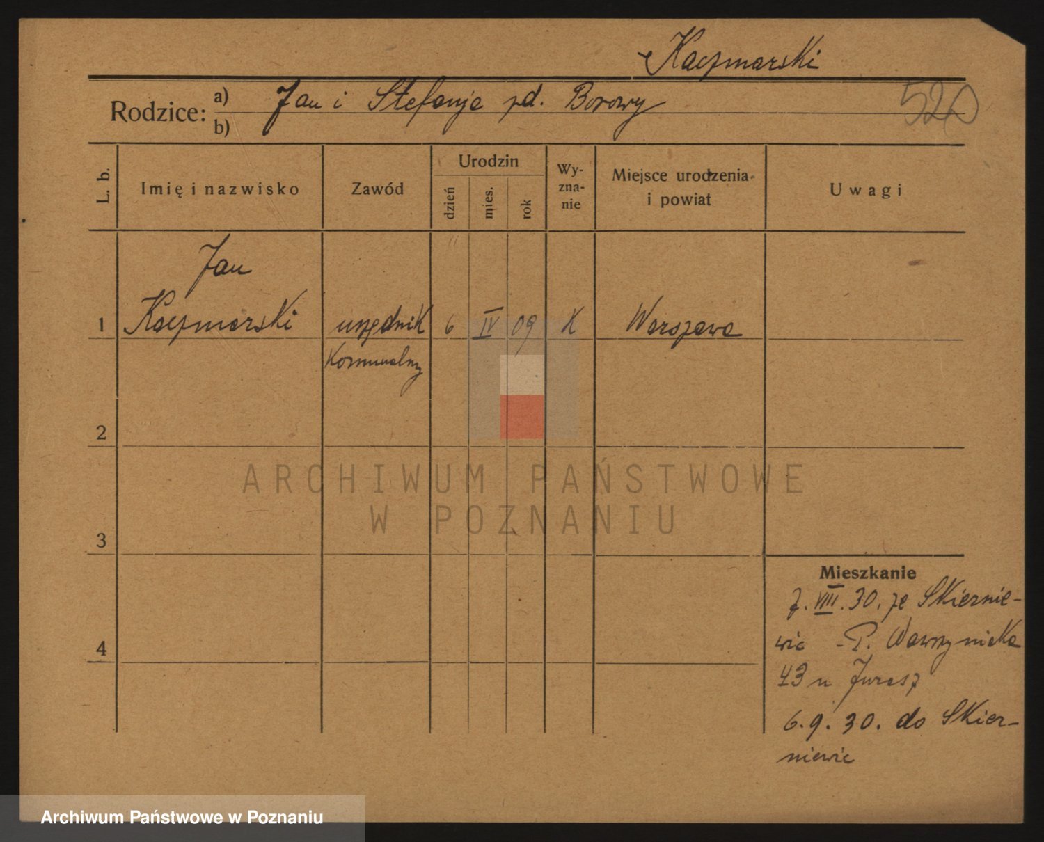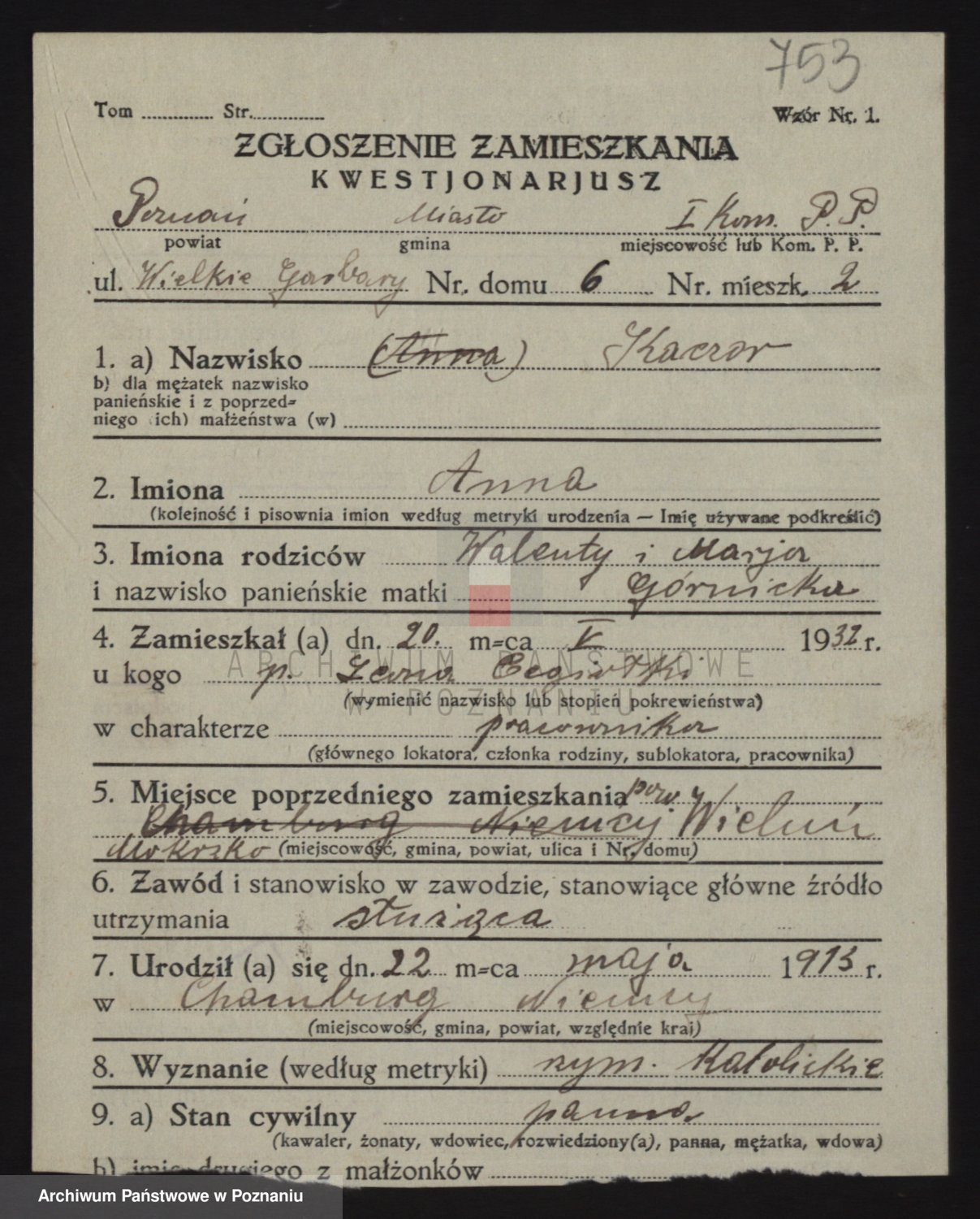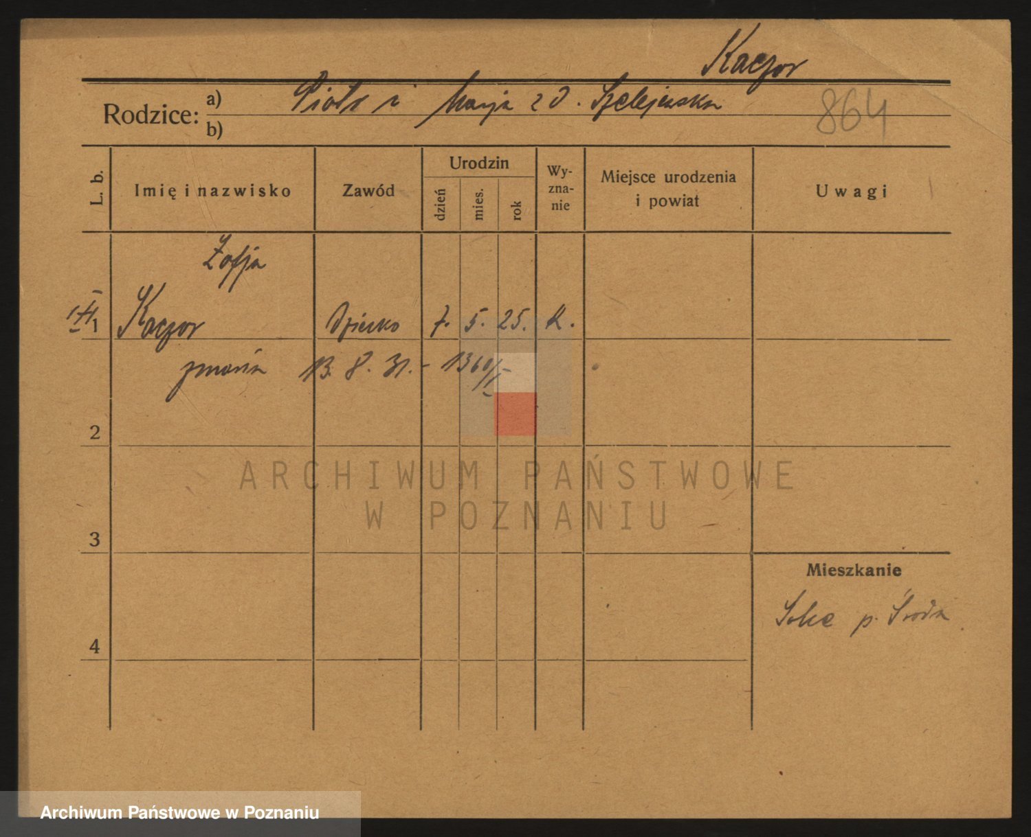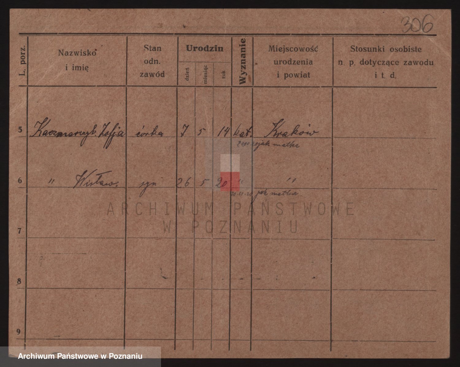 Podgląd karty osobowej dostępny jest po kliknięciu na nazwisko lub ikonkę karty. Można dokonywać powiększenia (ikony na górze) lub przechodzić między kolejnymi skanami (strzałki po bokach).