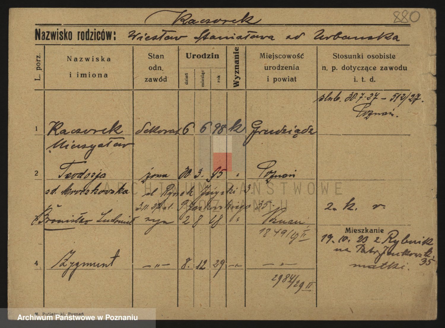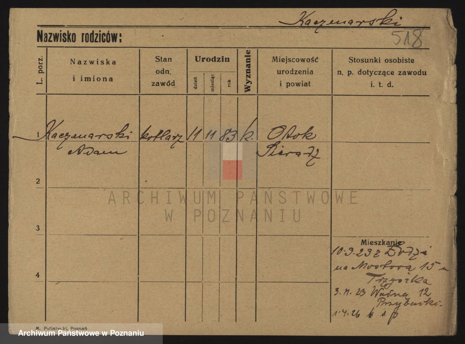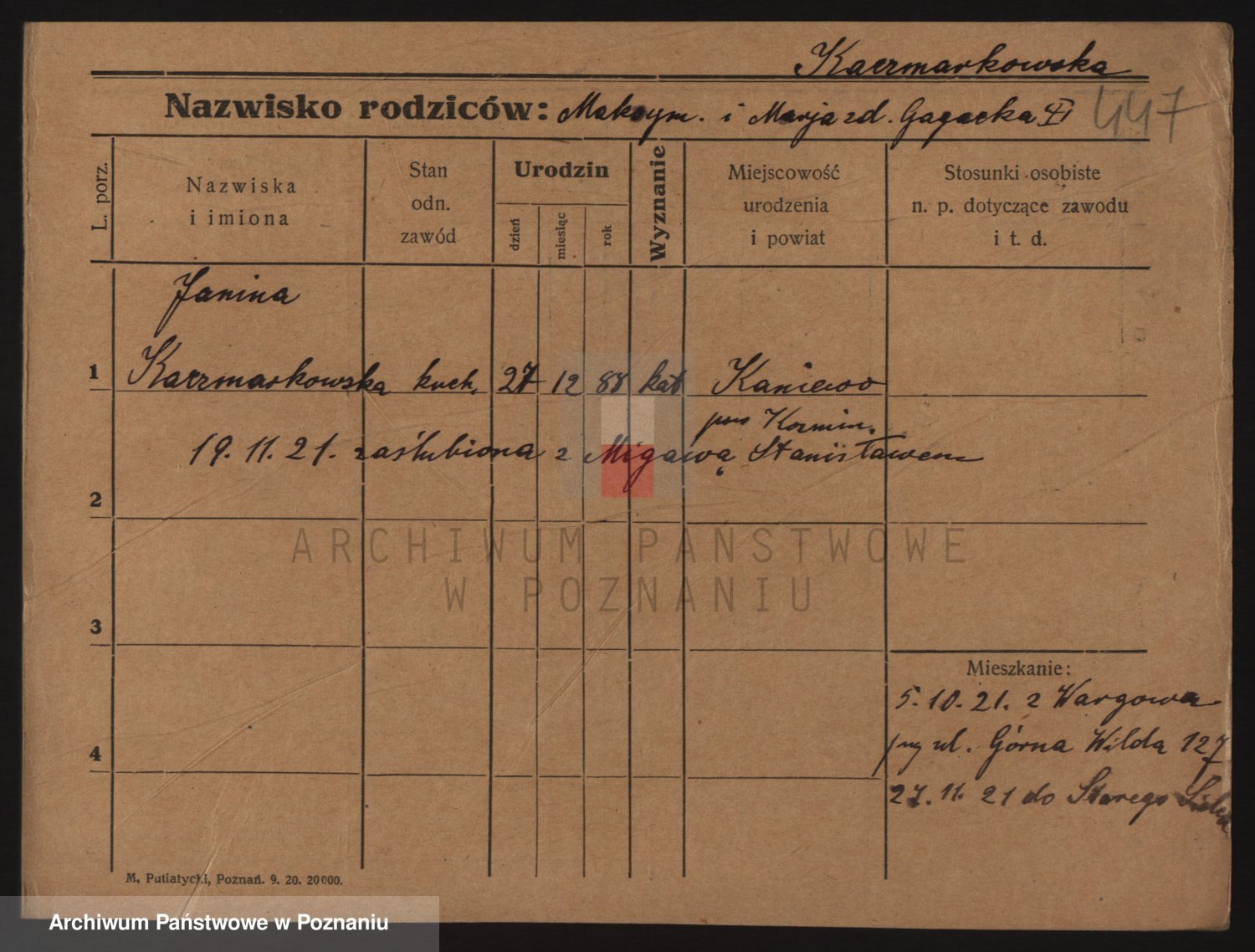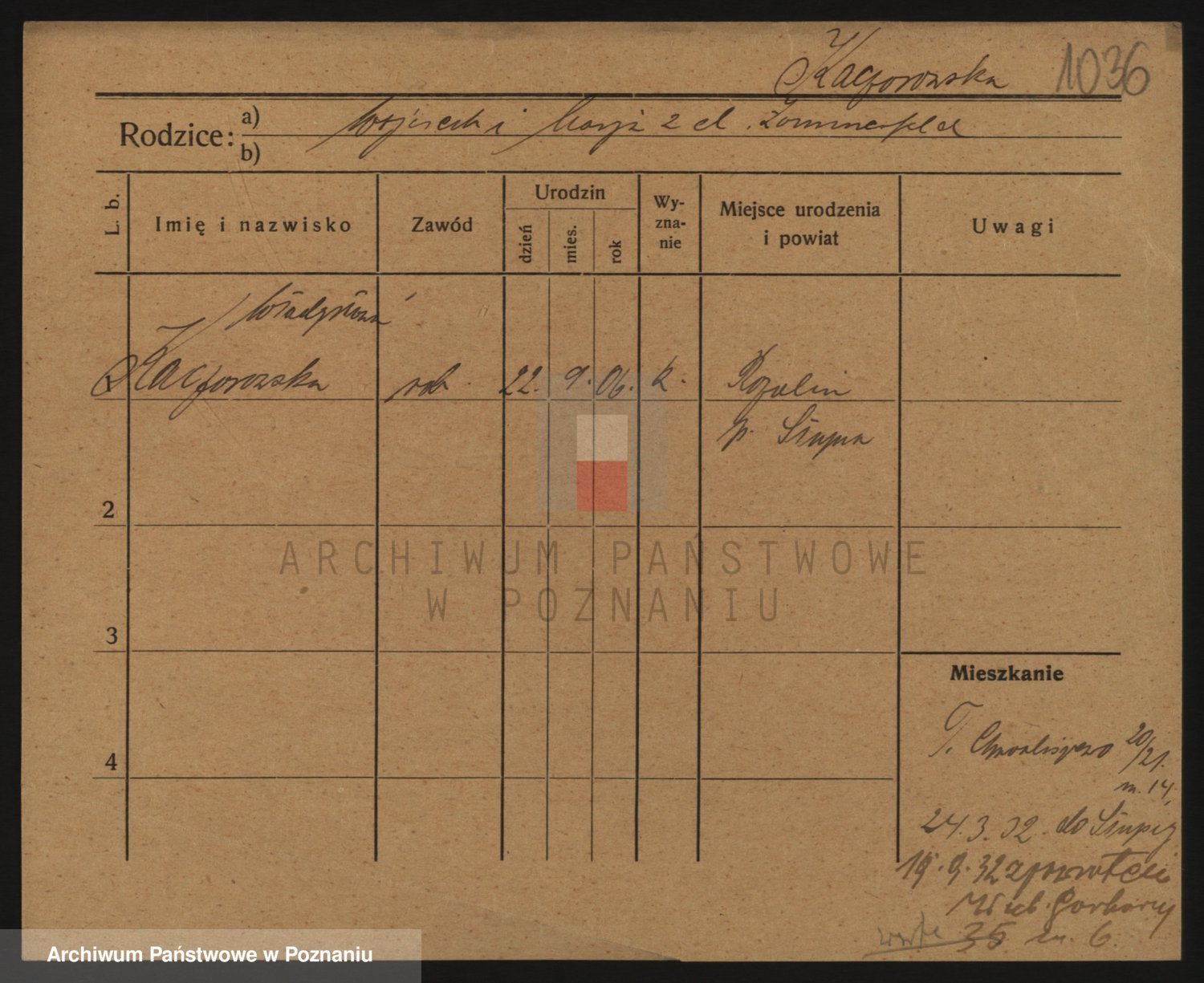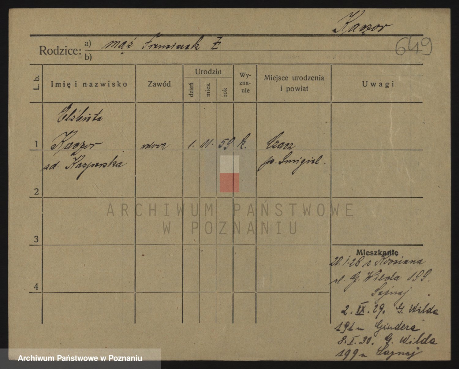 Podgląd karty osobowej dostępny jest po kliknięciu na nazwisko lub ikonkę karty. Można dokonywać powiększenia (ikony na górze) lub przechodzić między kolejnymi skanami (strzałki po bokach).
