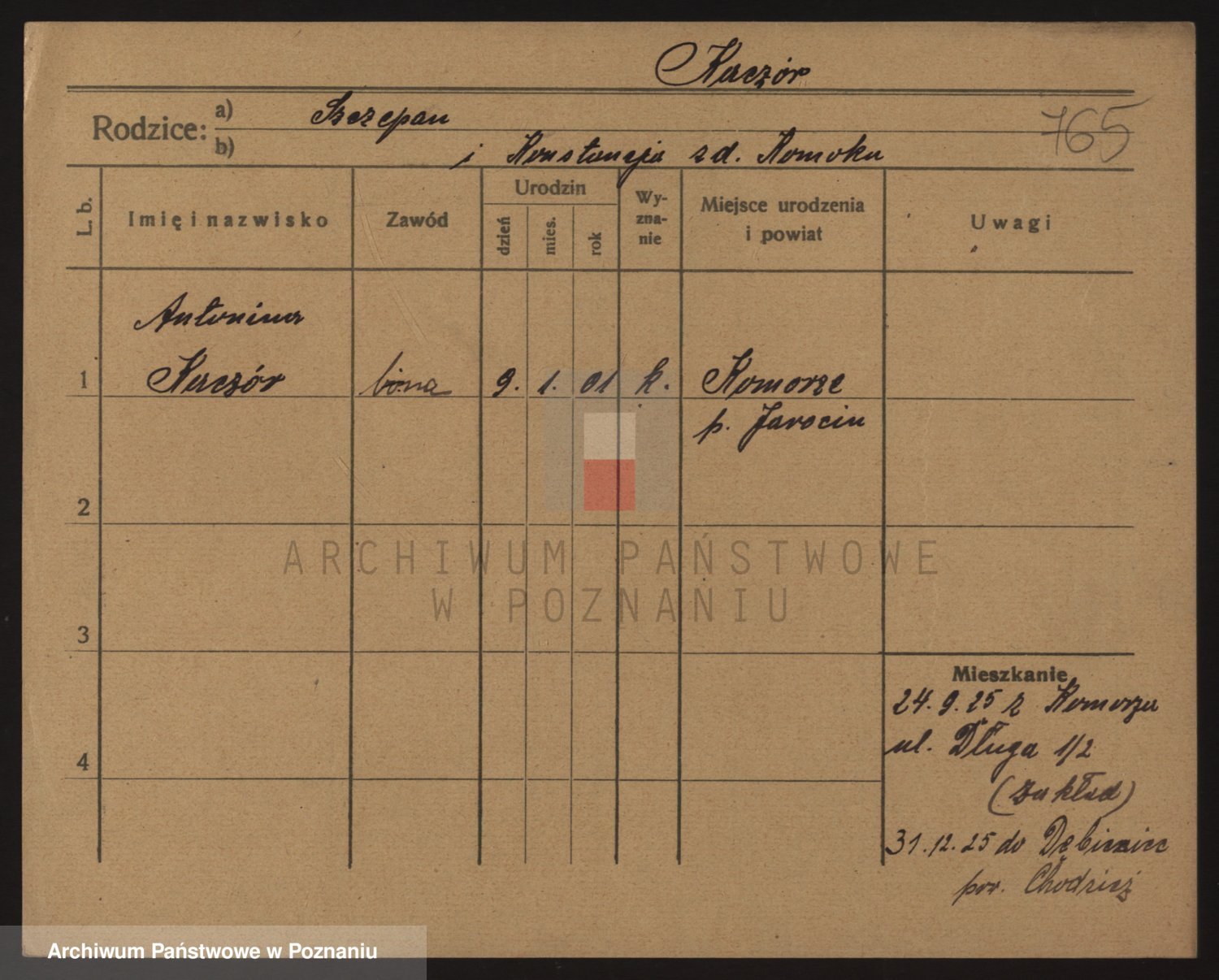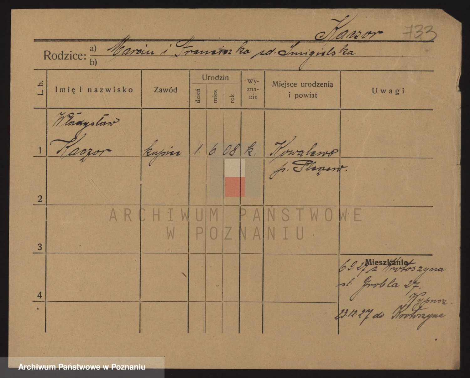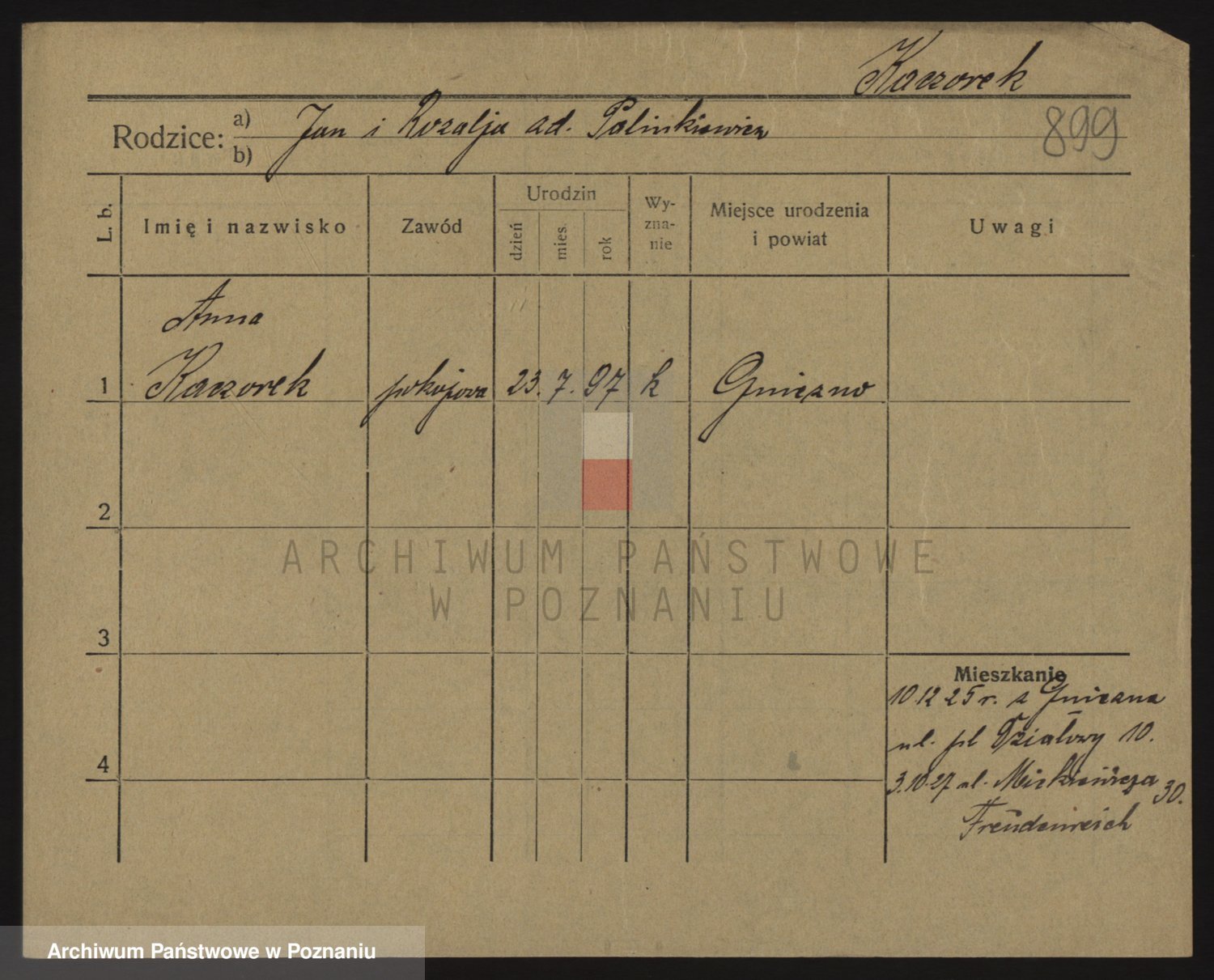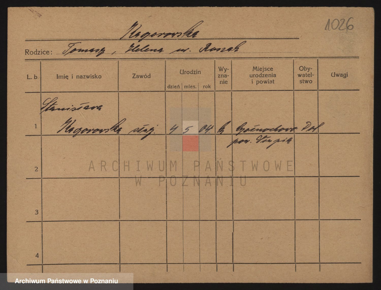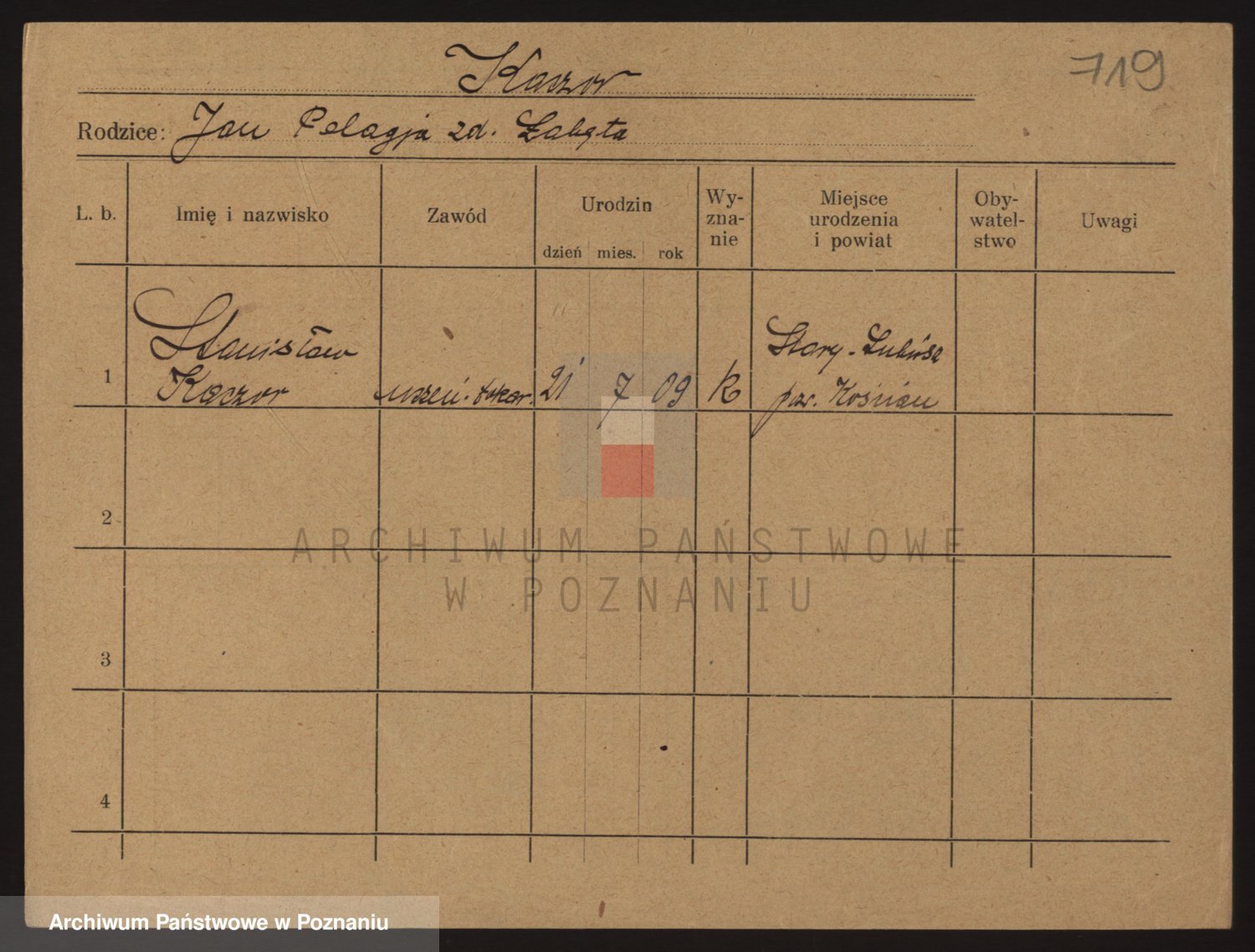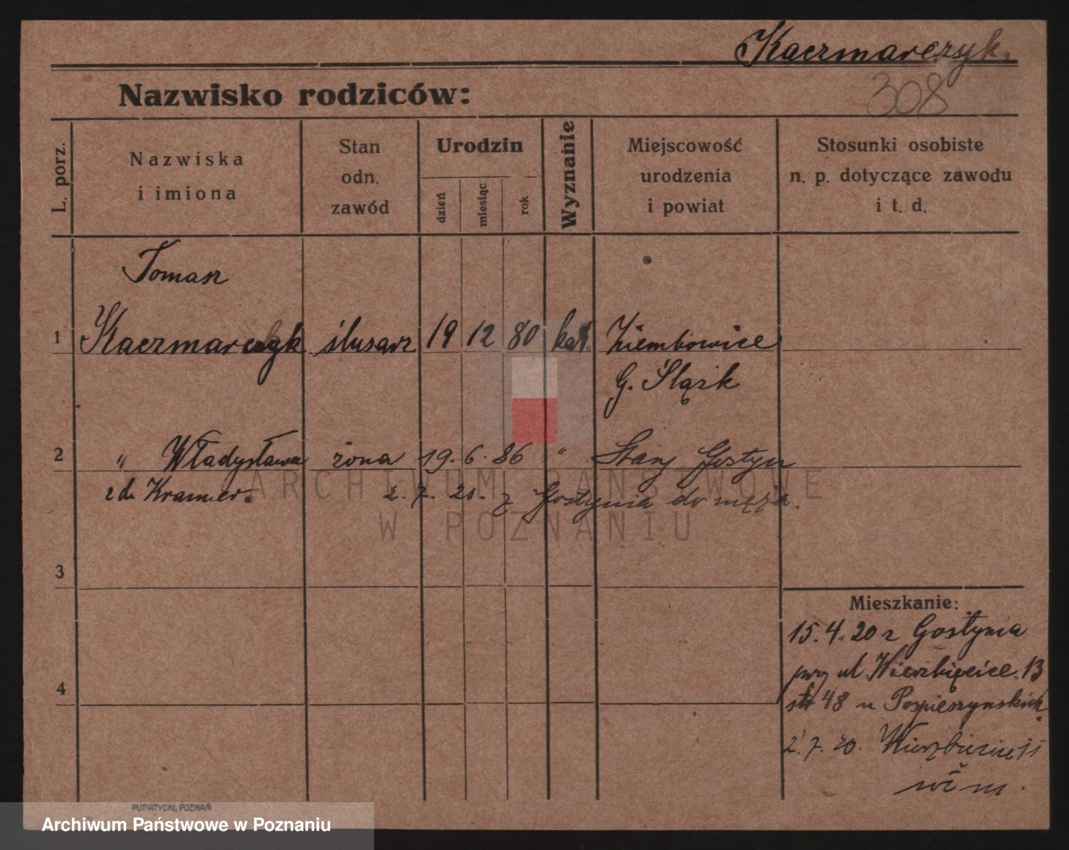 Podgląd karty osobowej dostępny jest po kliknięciu na nazwisko lub ikonkę karty. Można dokonywać powiększenia (ikony na górze) lub przechodzić między kolejnymi skanami (strzałki po bokach).