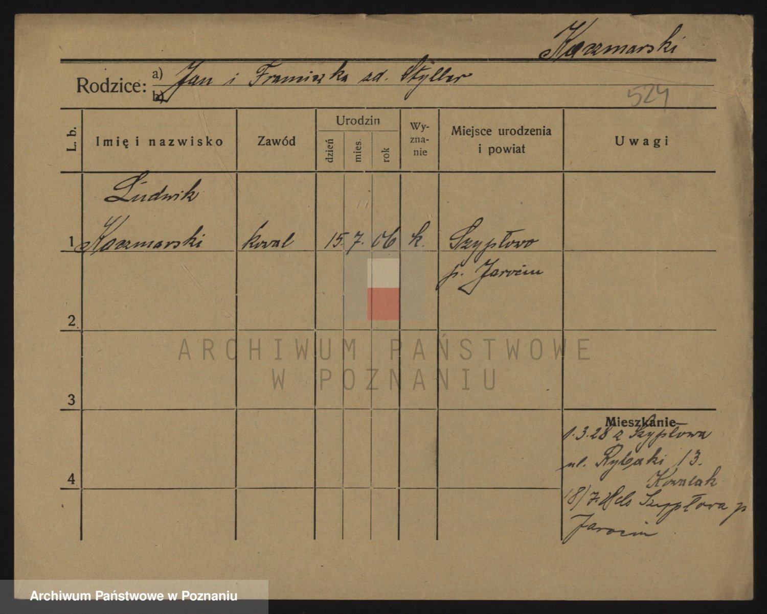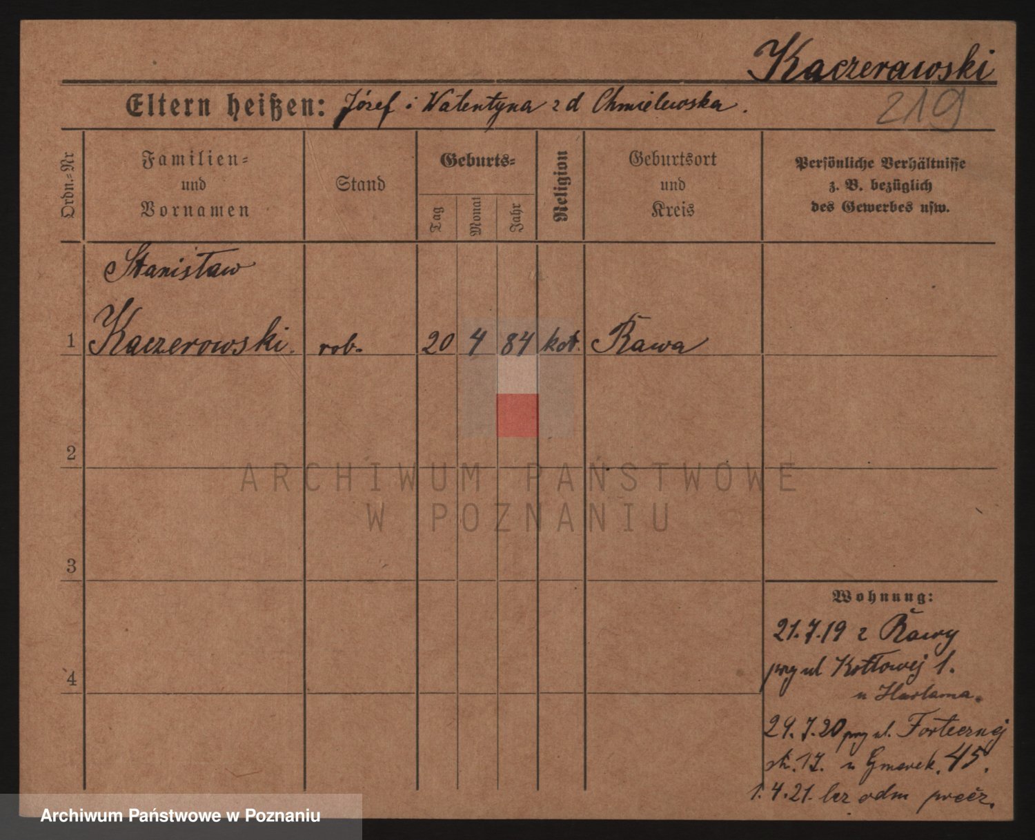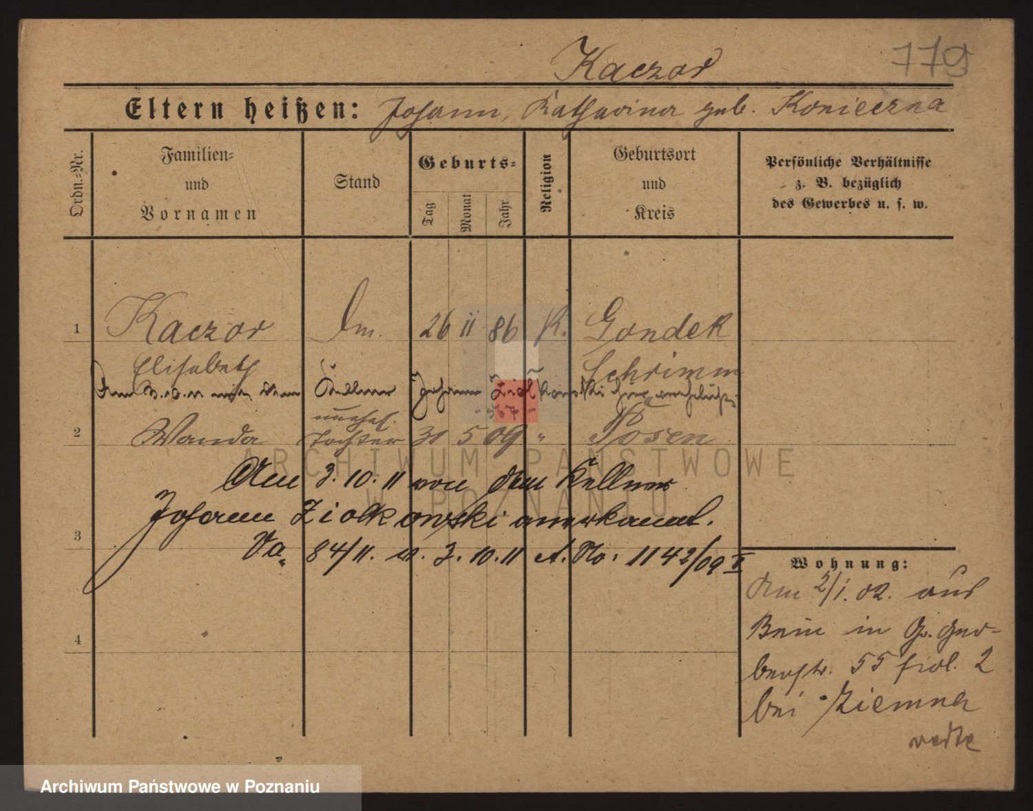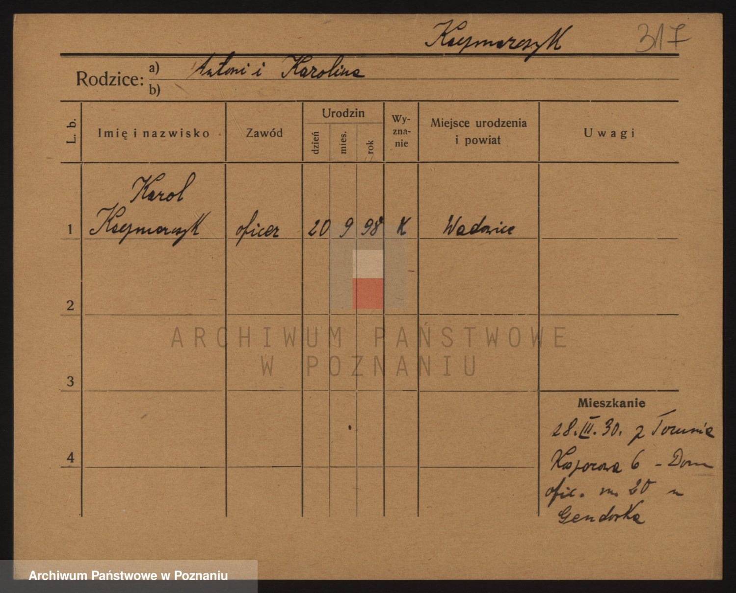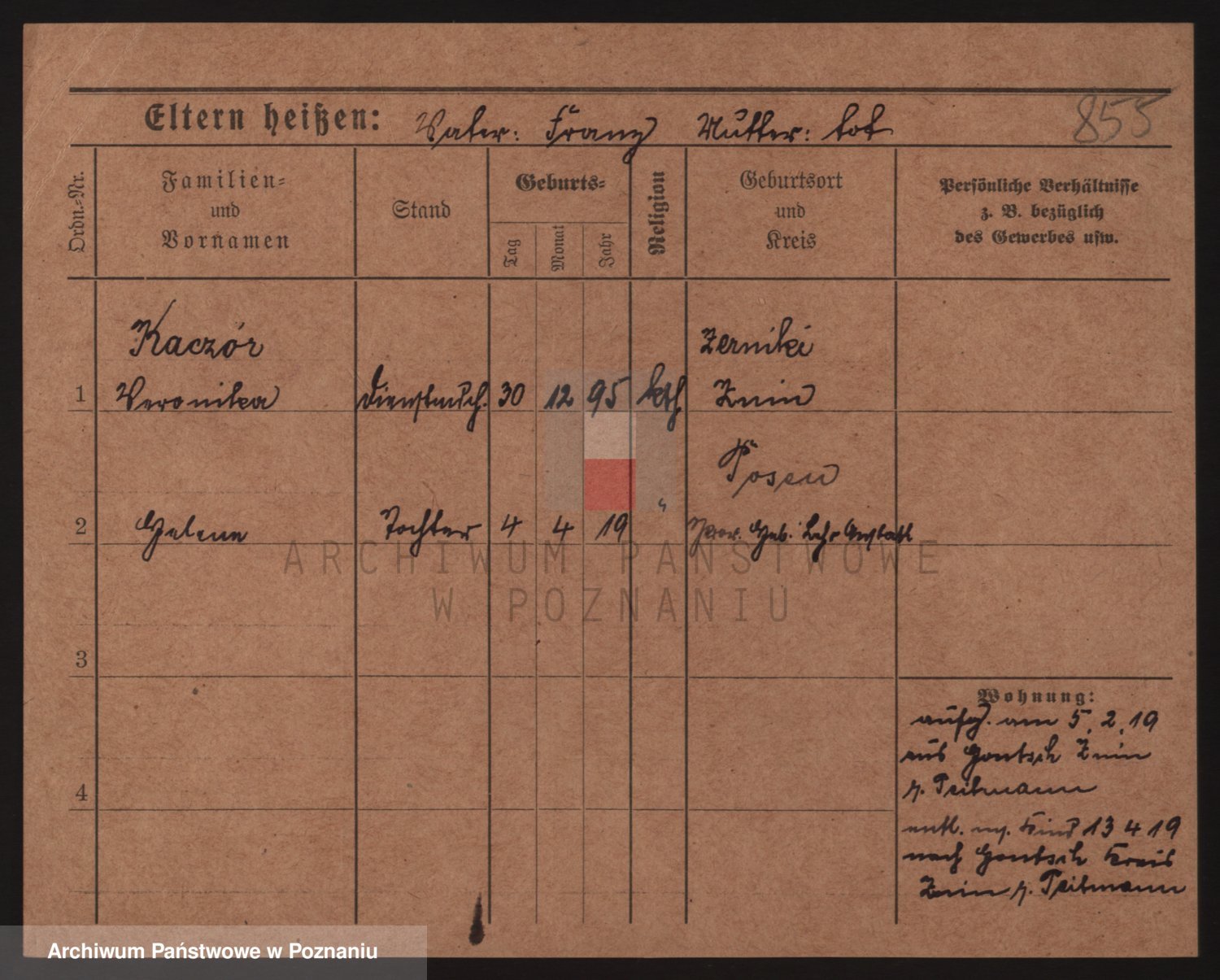 Podgląd karty osobowej dostępny jest po kliknięciu na nazwisko lub ikonkę karty. Można dokonywać powiększenia (ikony na górze) lub przechodzić między kolejnymi skanami (strzałki po bokach).