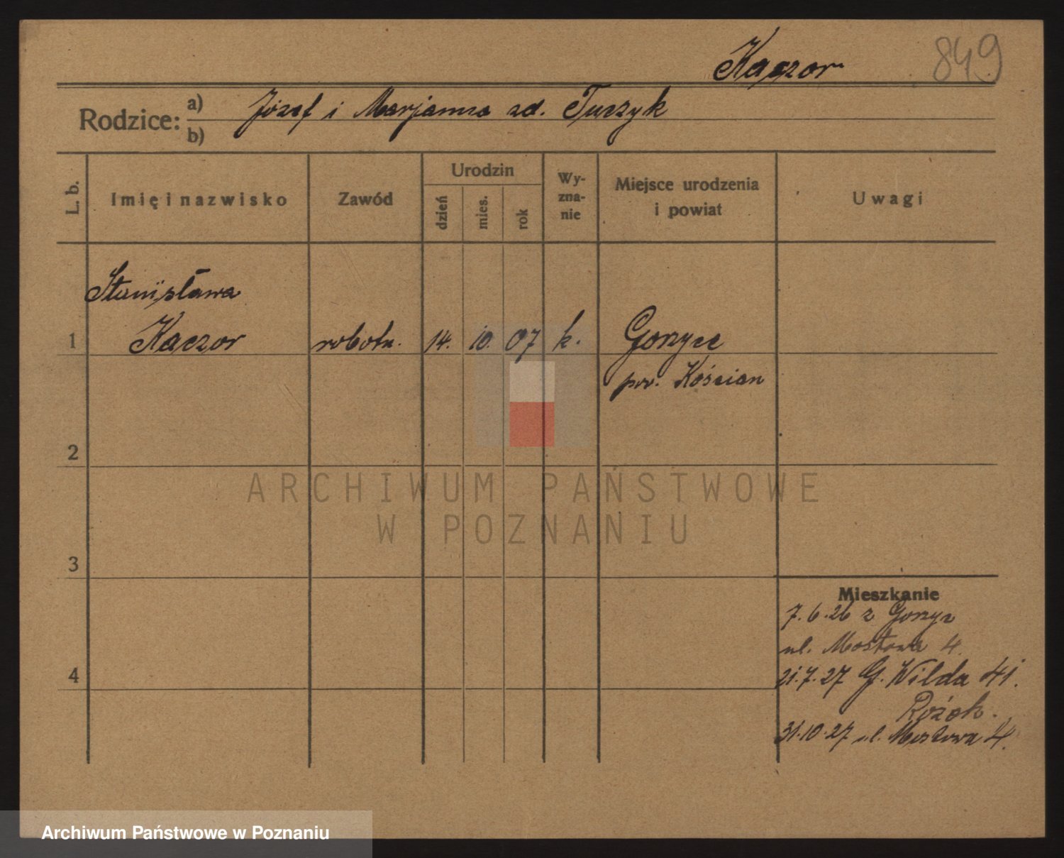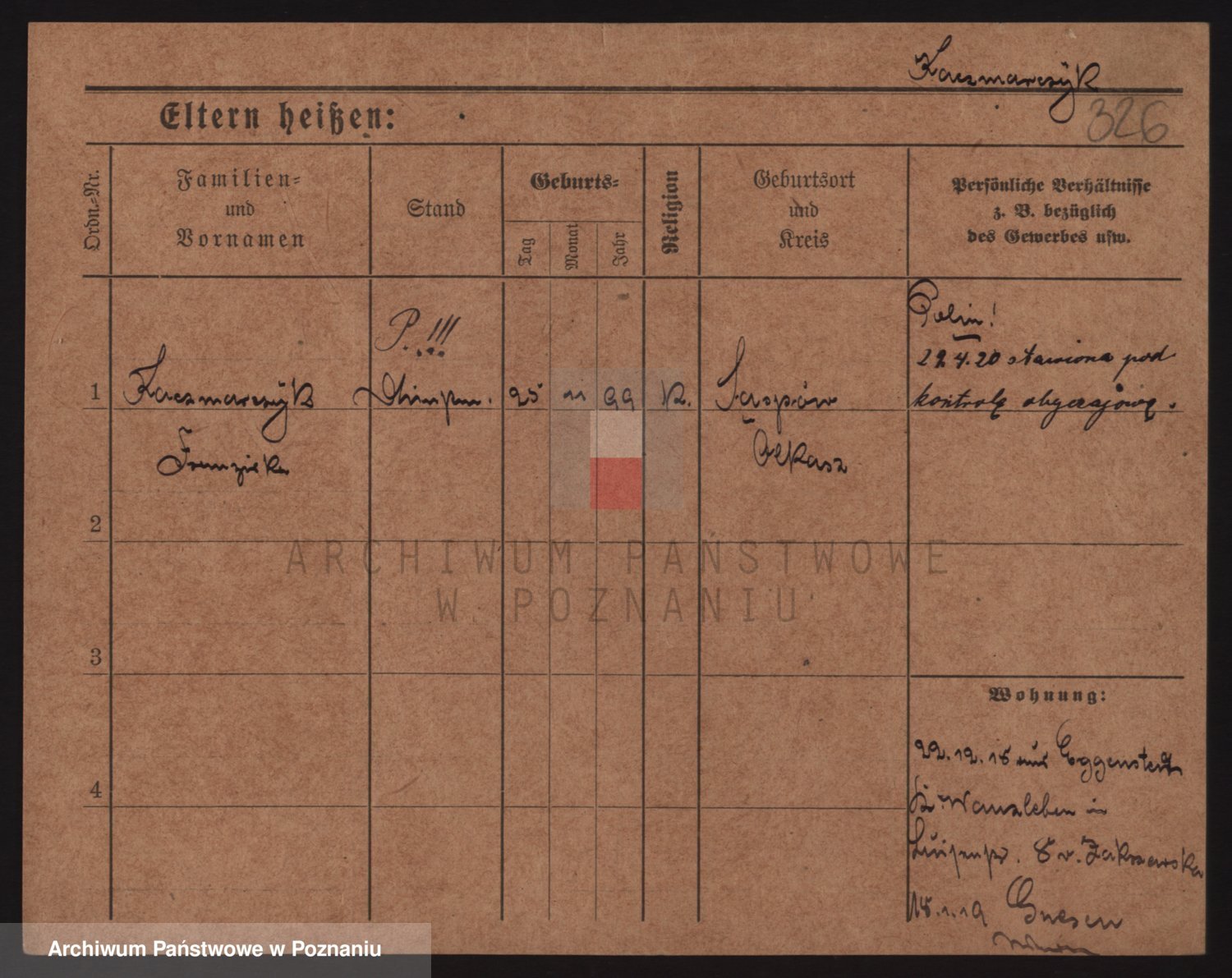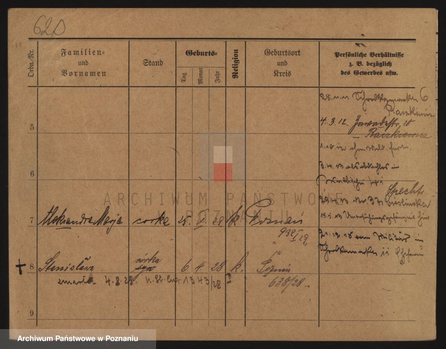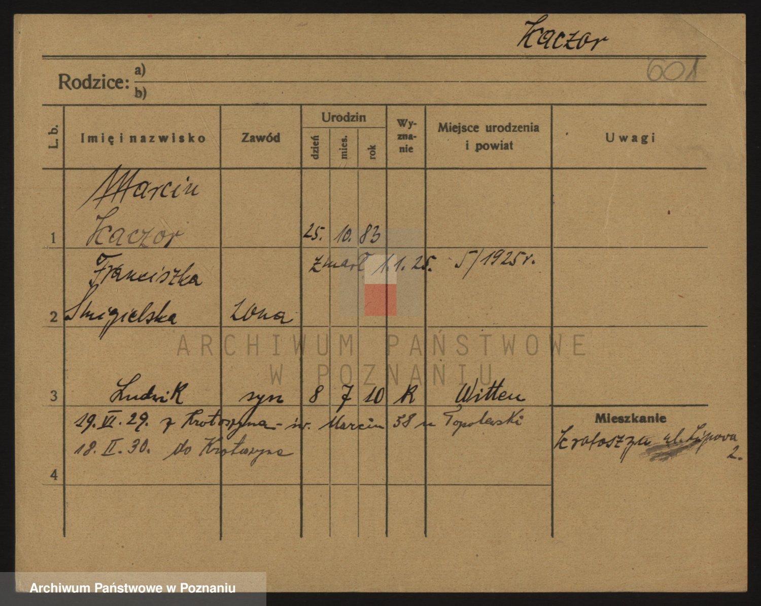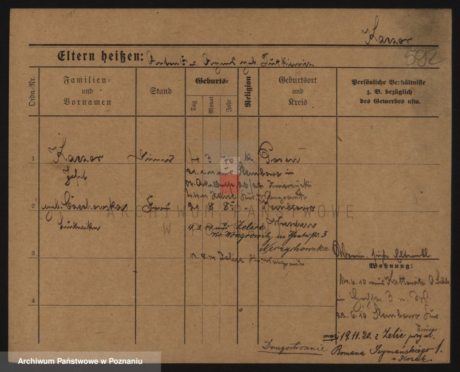 Podgląd karty osobowej dostępny jest po kliknięciu na nazwisko lub ikonkę karty. Można dokonywać powiększenia (ikony na górze) lub przechodzić między kolejnymi skanami (strzałki po bokach).